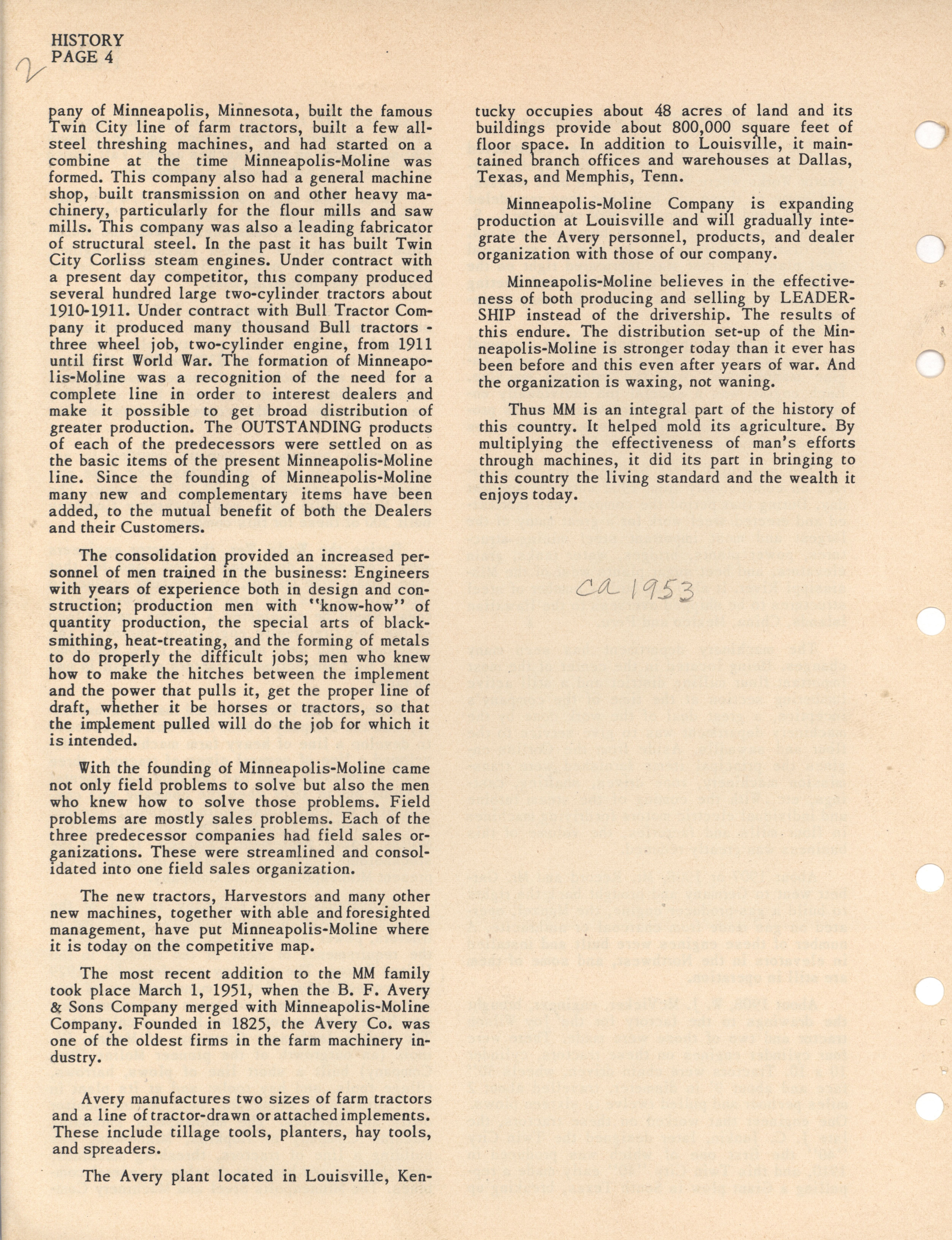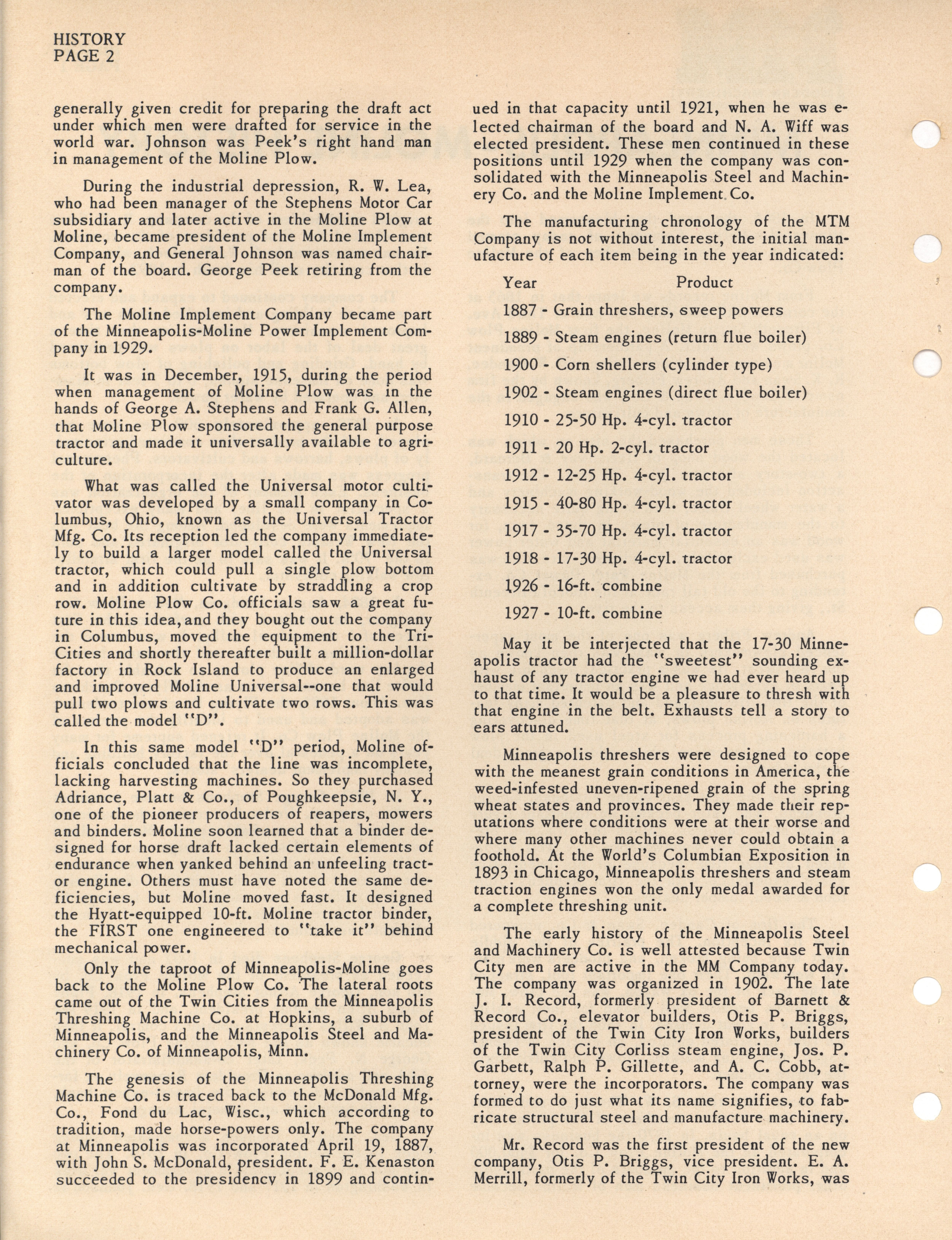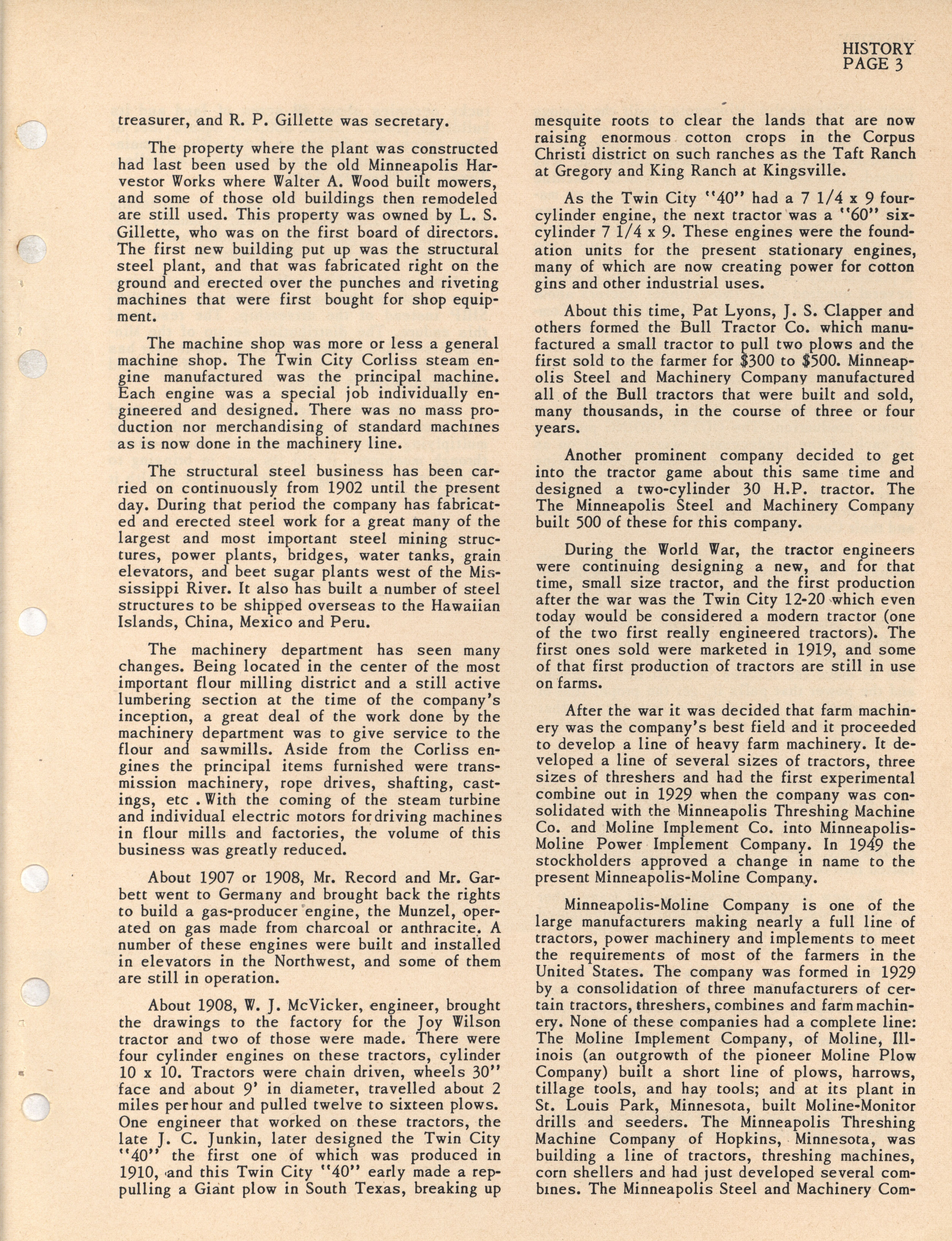 - Document describing the history of the Minneapolis Moline Modern Machinery company.
