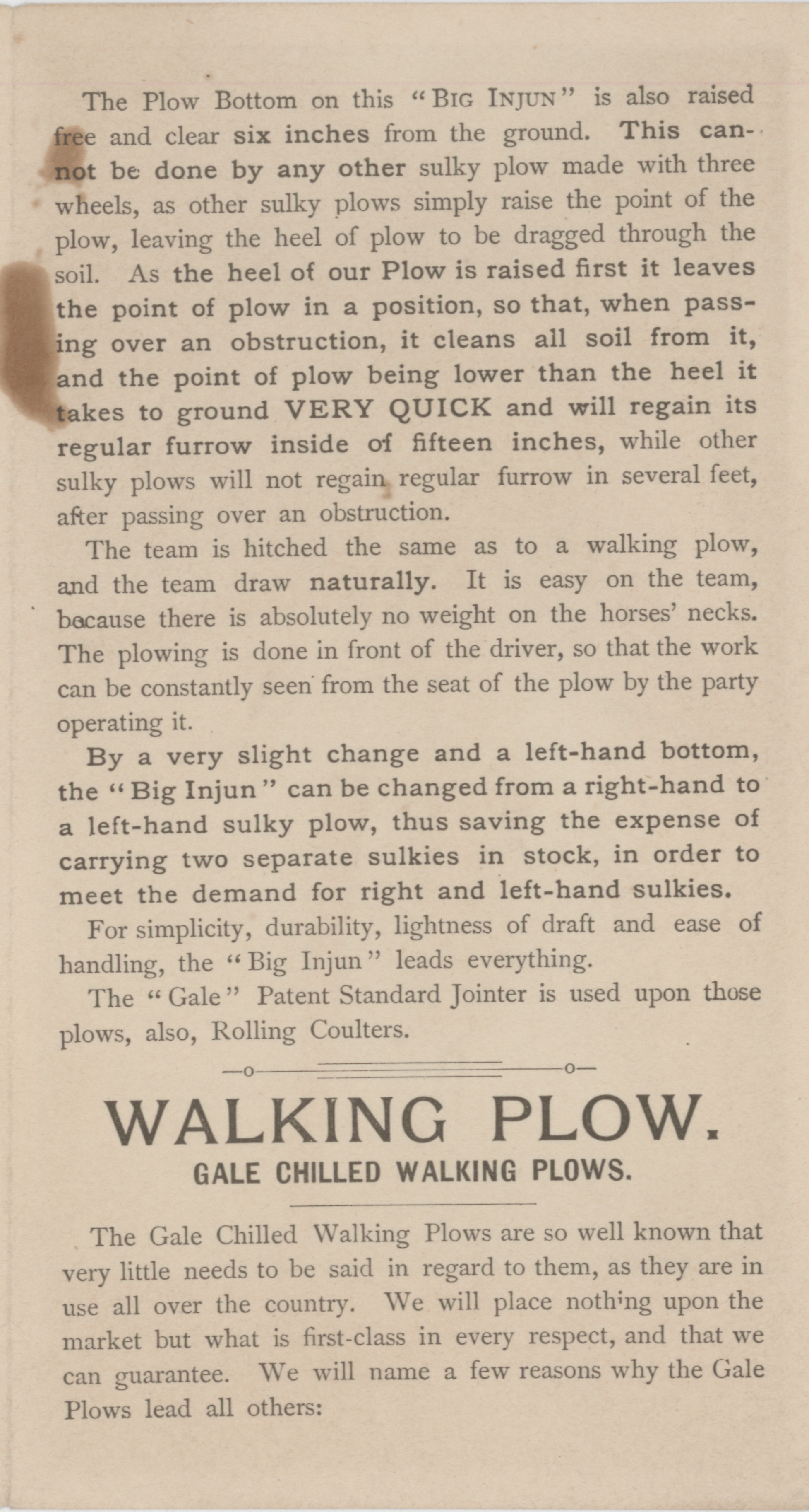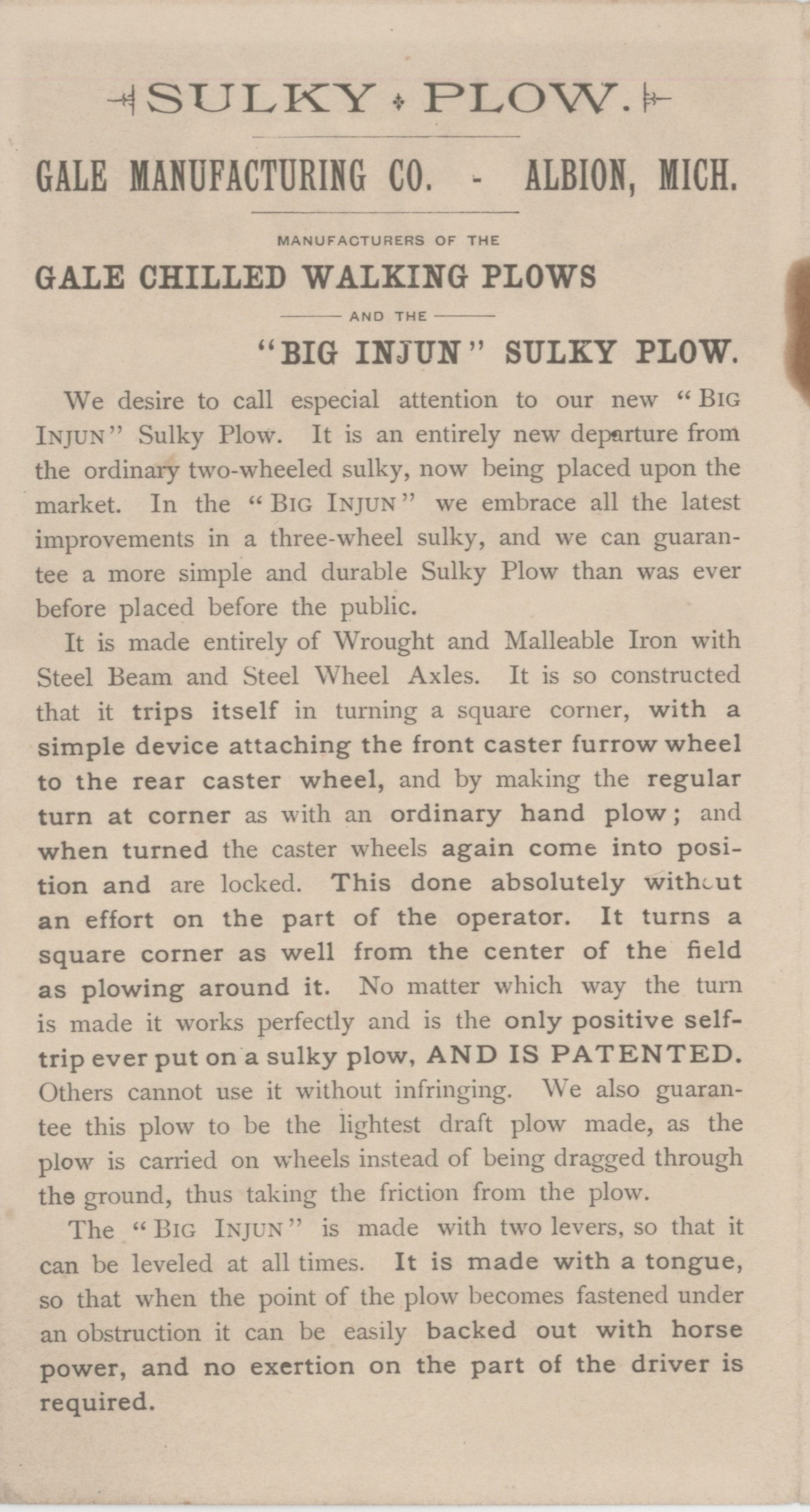 - "Gale Manufacturing Company Big Injun Sulky Plows advertisement", Agricultural Machinery Literature Collection, Iowa State University Library Digital Collections