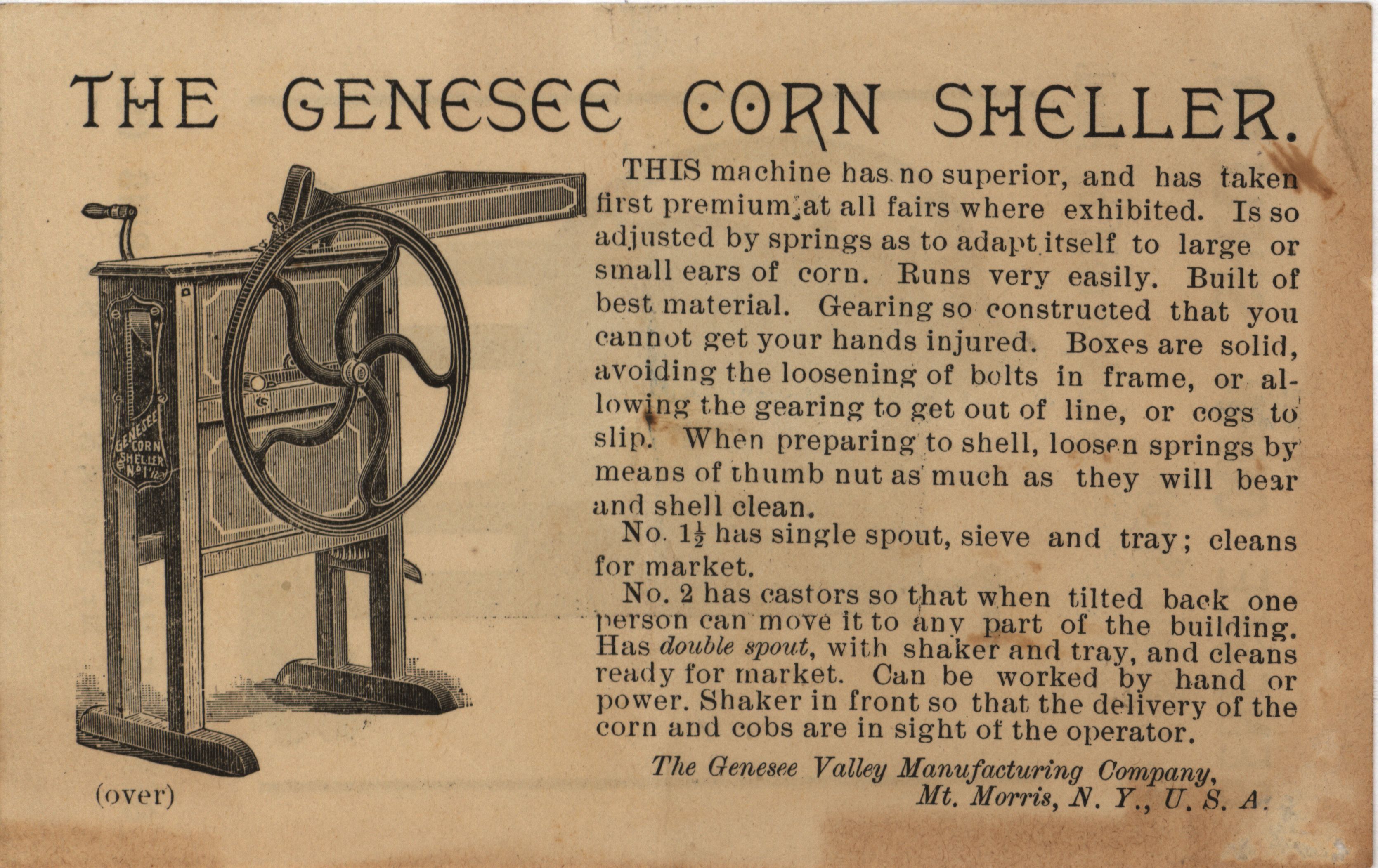 - "Genesee Valley Manufacturing Company Corn Sheller advertisement", Agricultural Machinery Literature Collection, Iowa State University Library Digital Collections