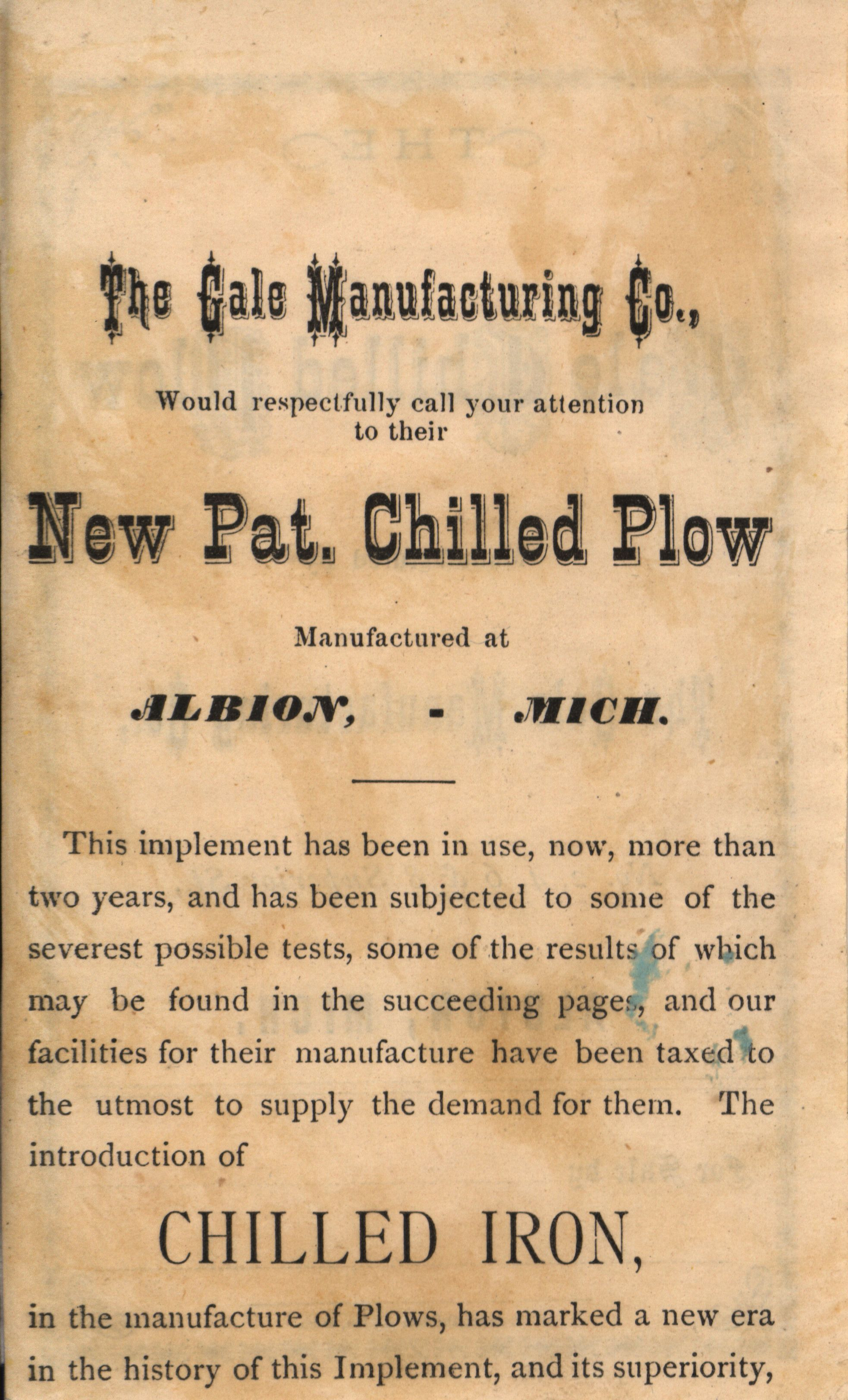 - A Catalog describing the Gale Chilled Plow offered by The Gale Manufacturing Company.
