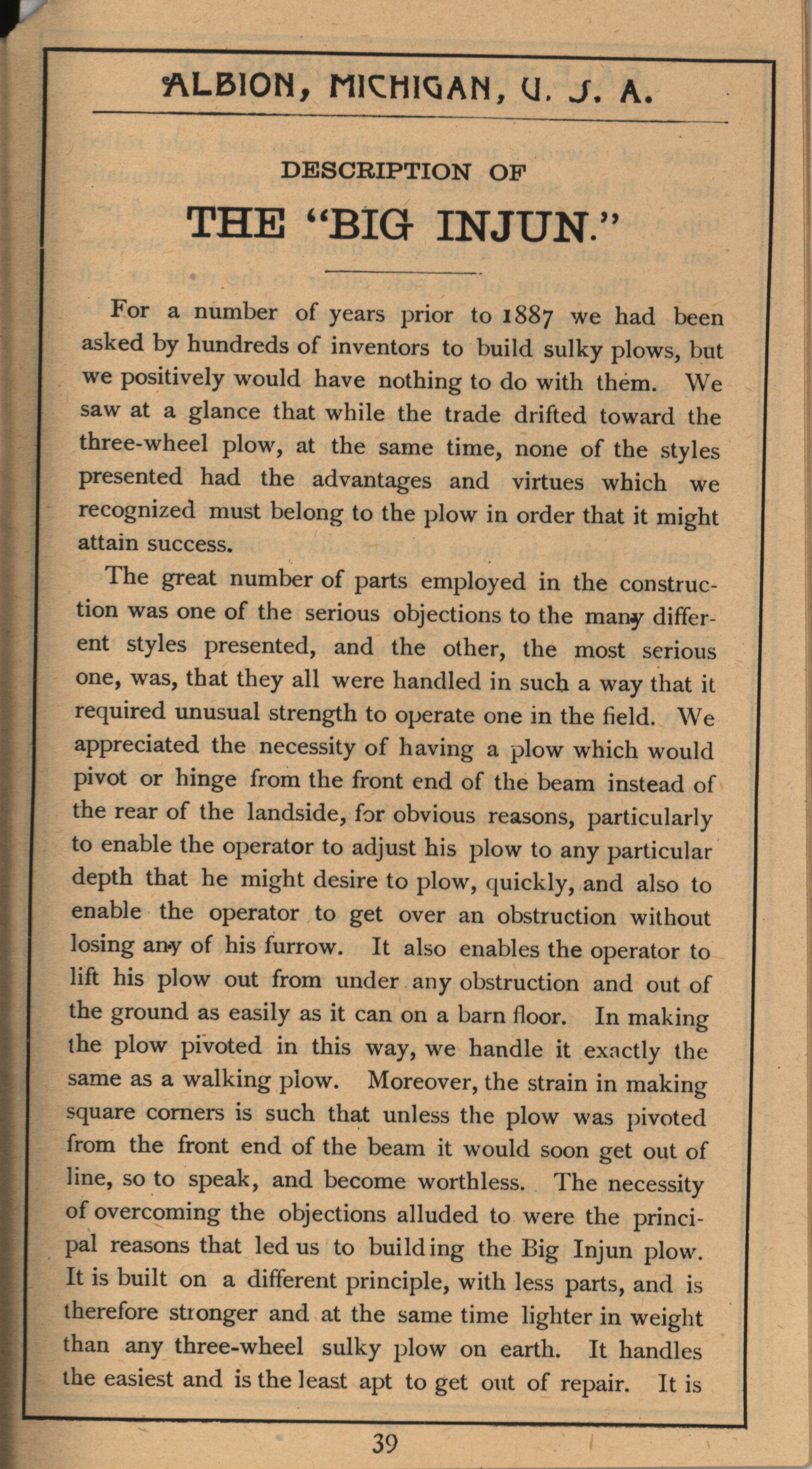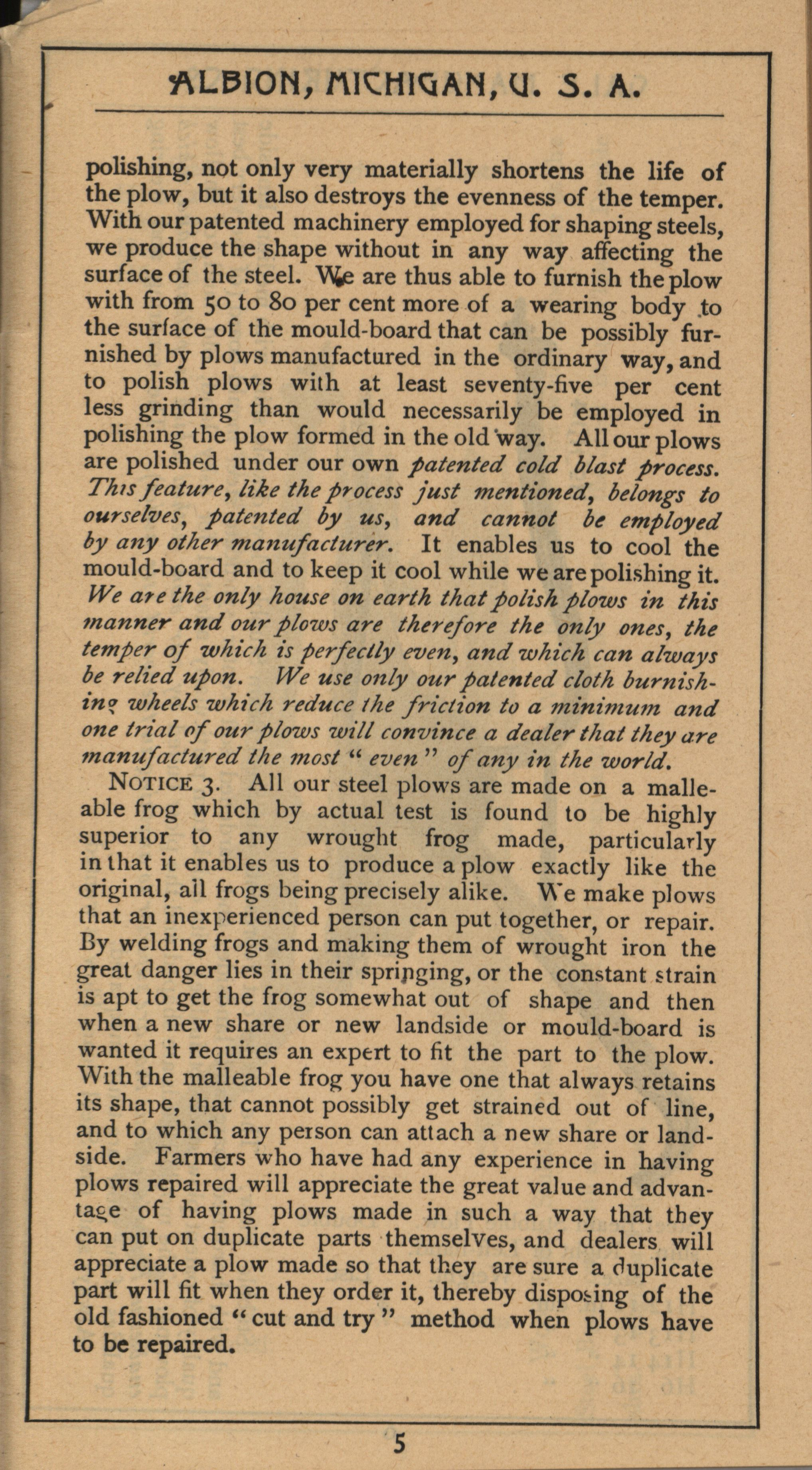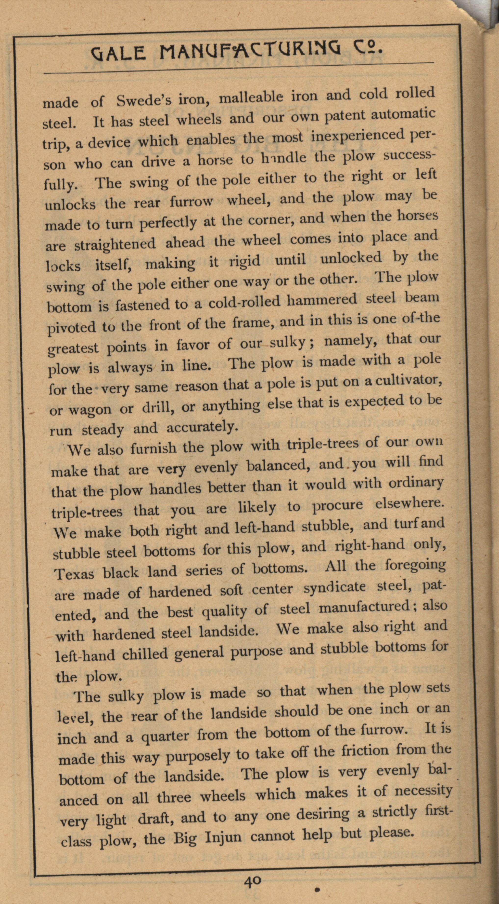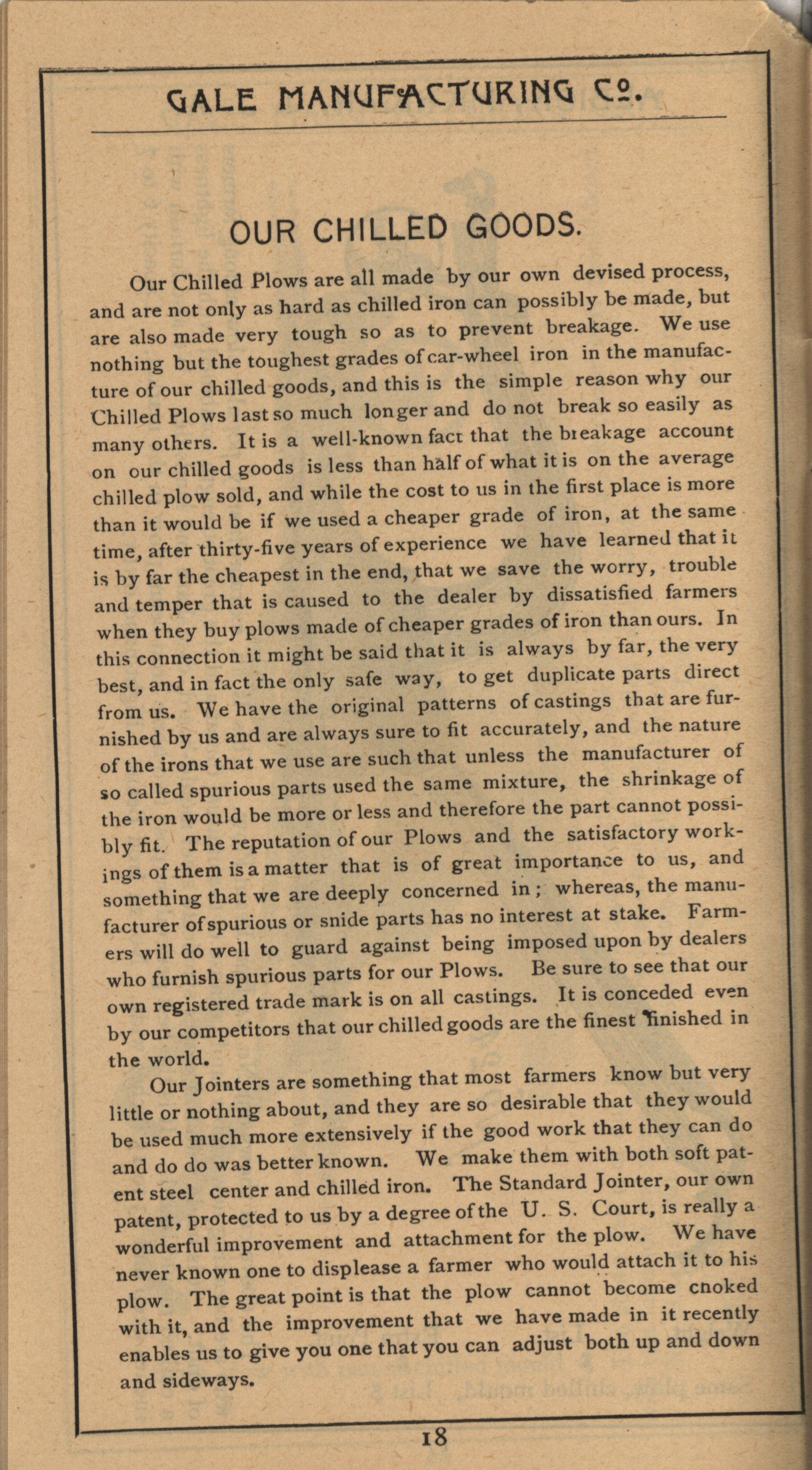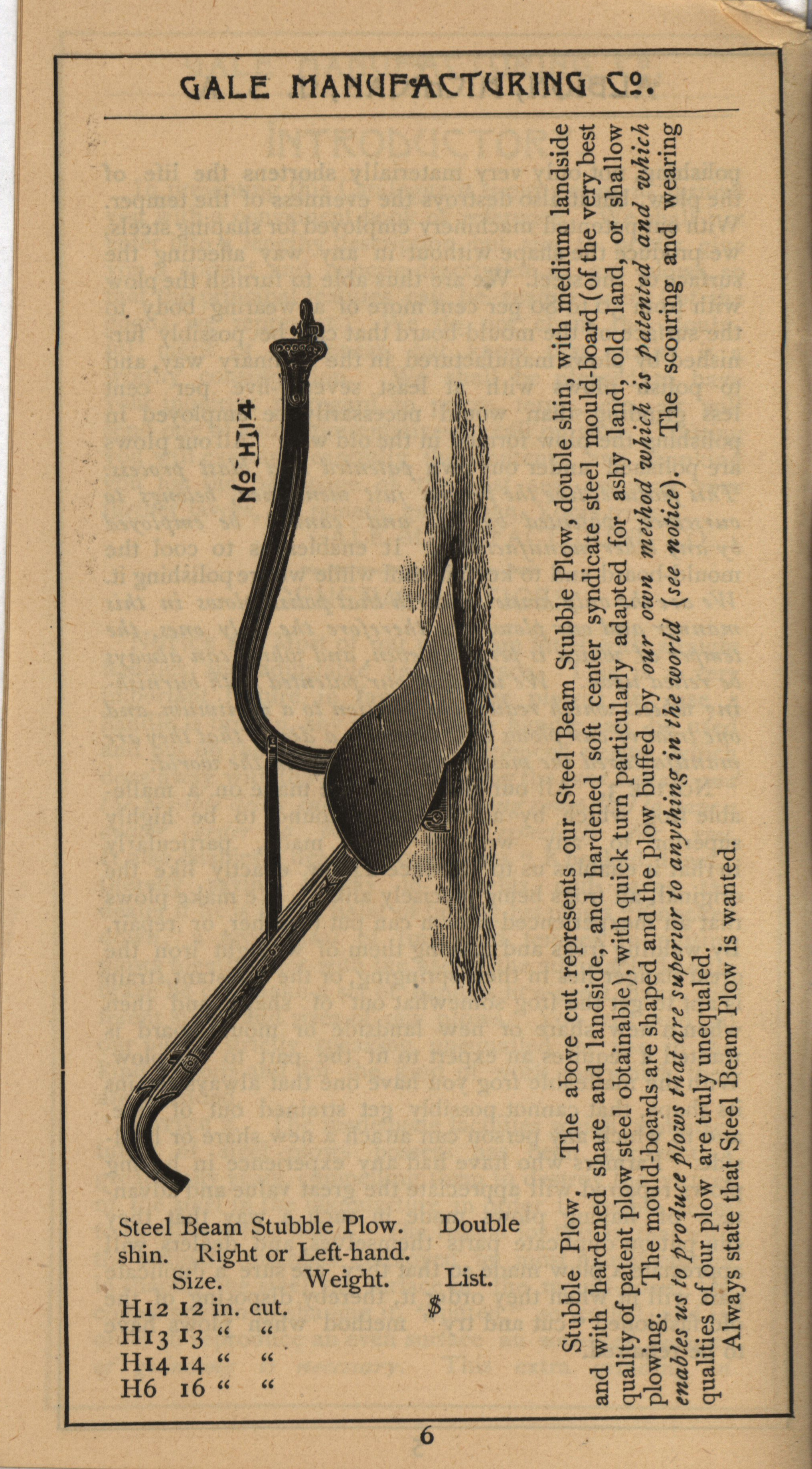 - Illustrated catalog describing the plows offered by the Gale Manufacturing Company.