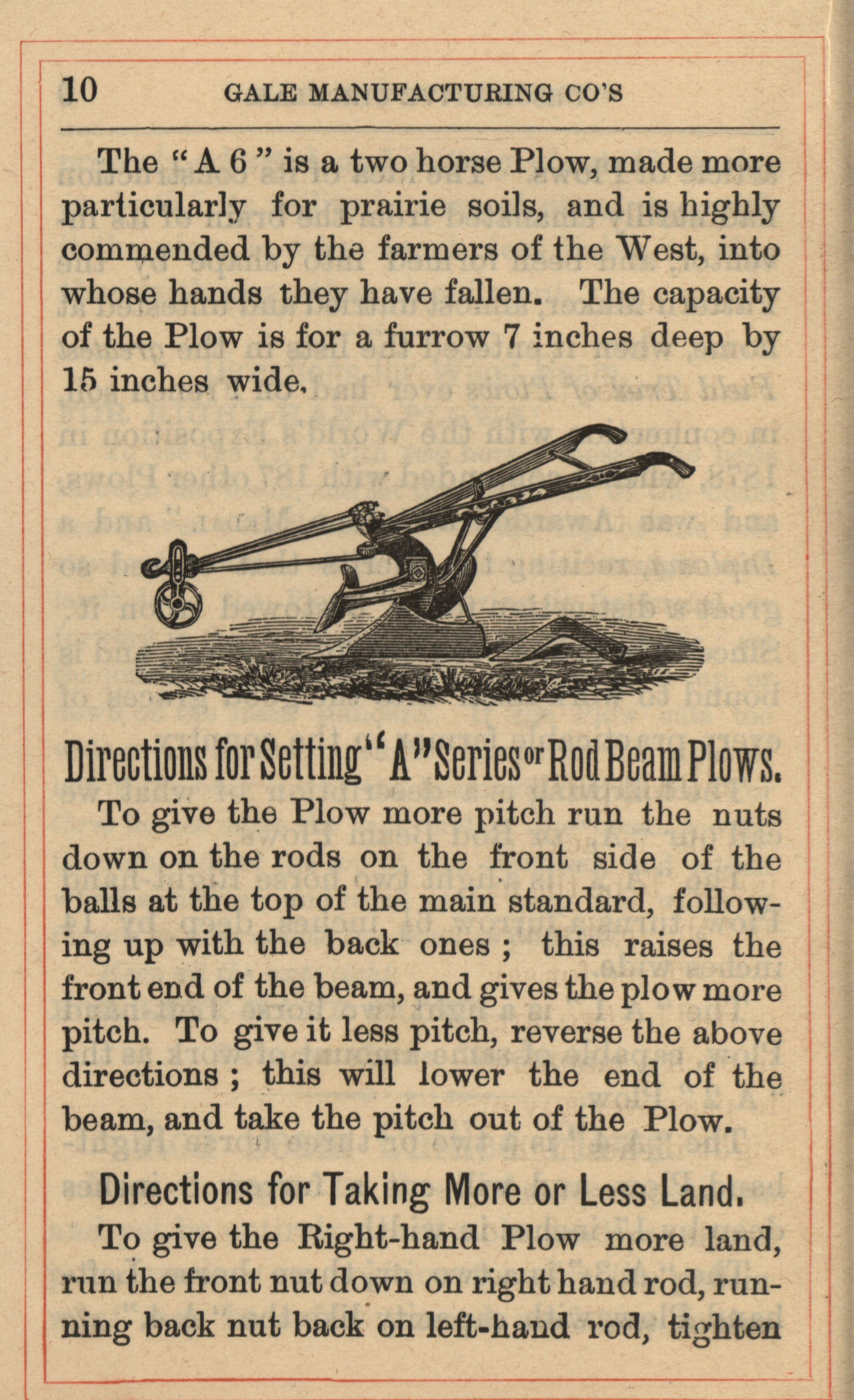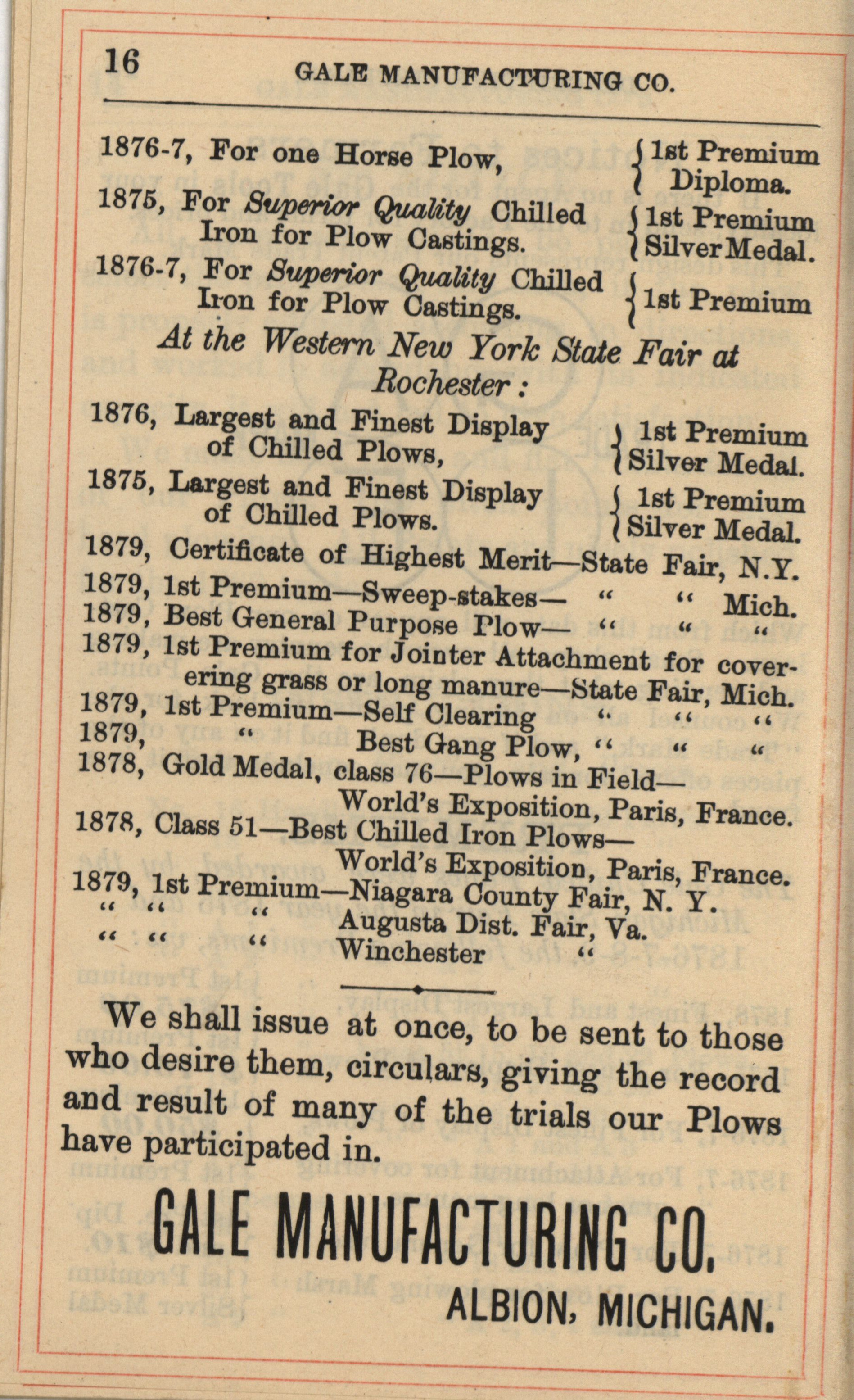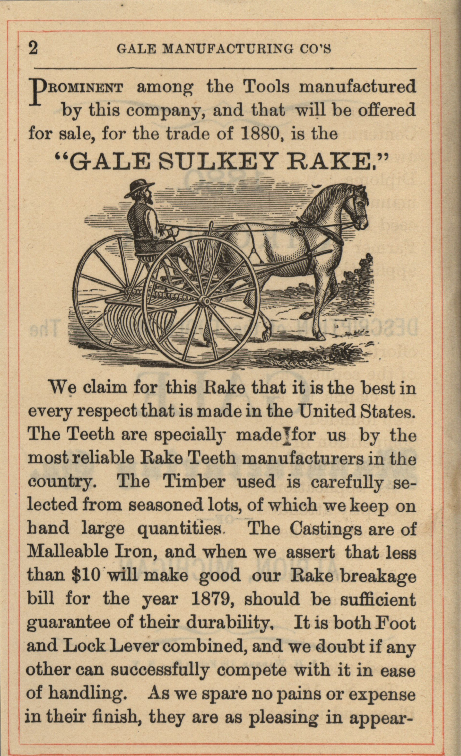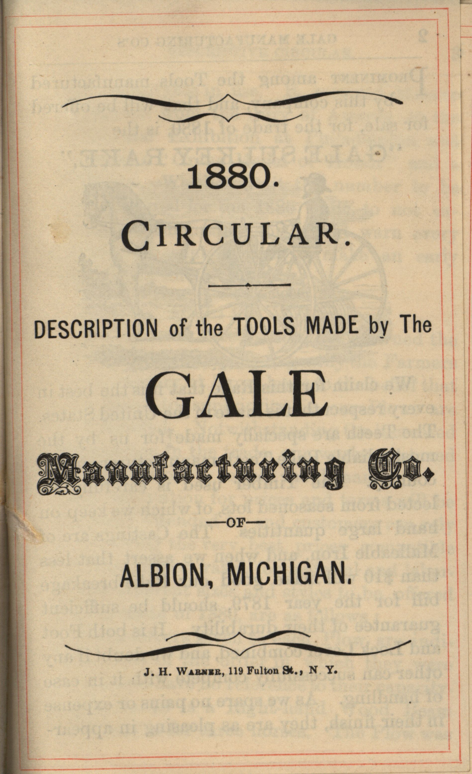 - Illustrated catalog describing the agricultural implements offered by the Gale Manufacturing Company in 1880.