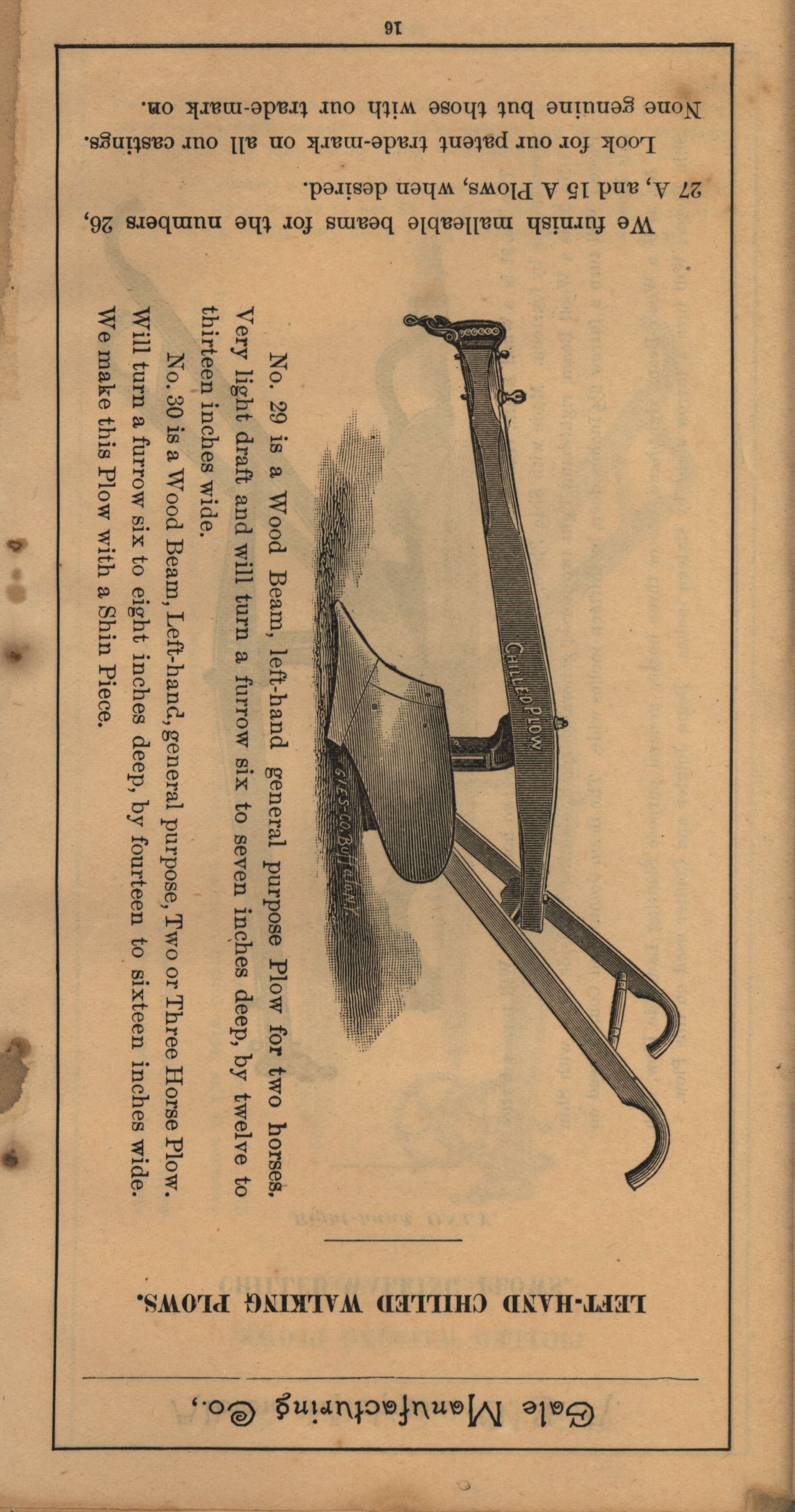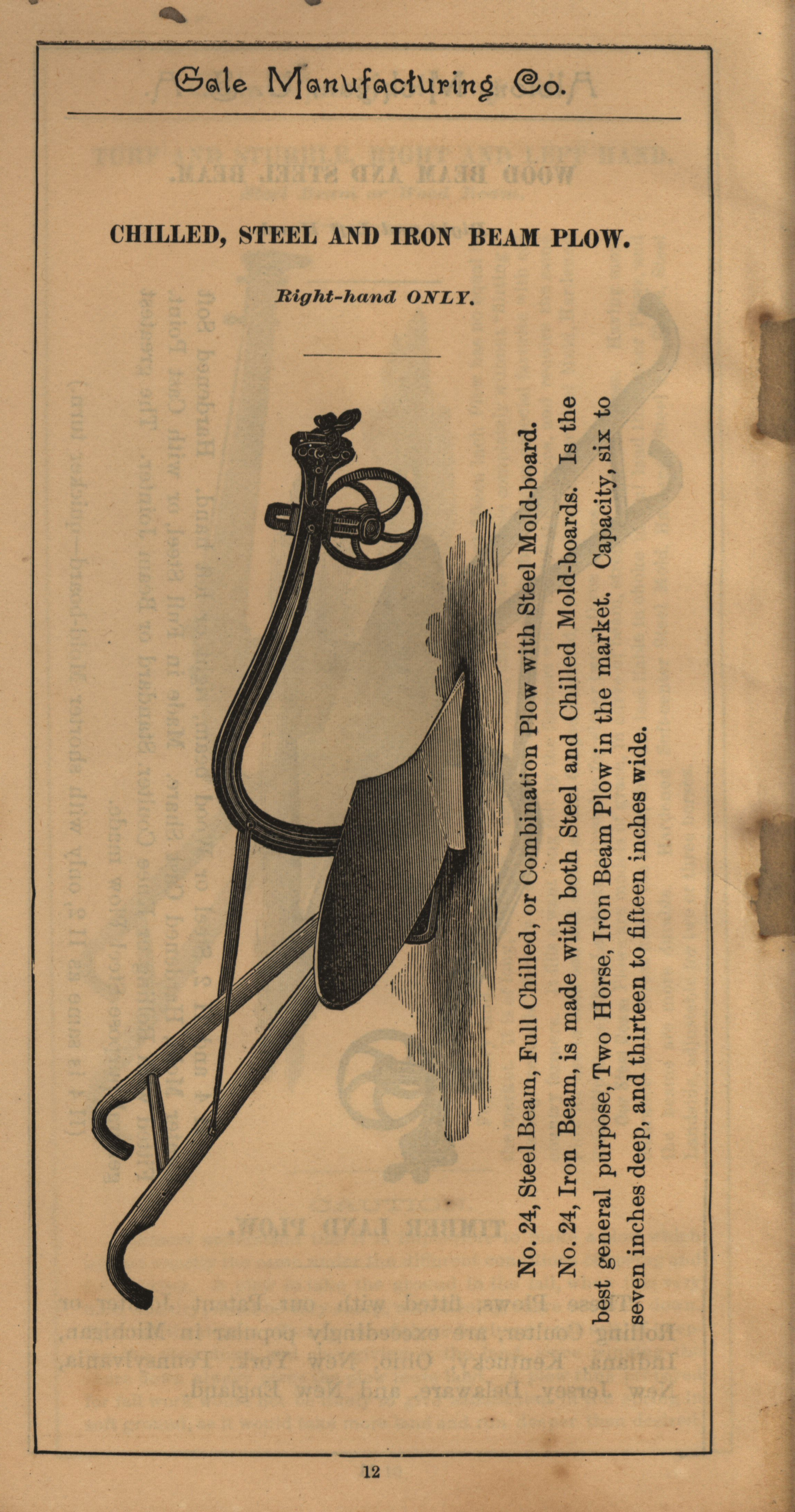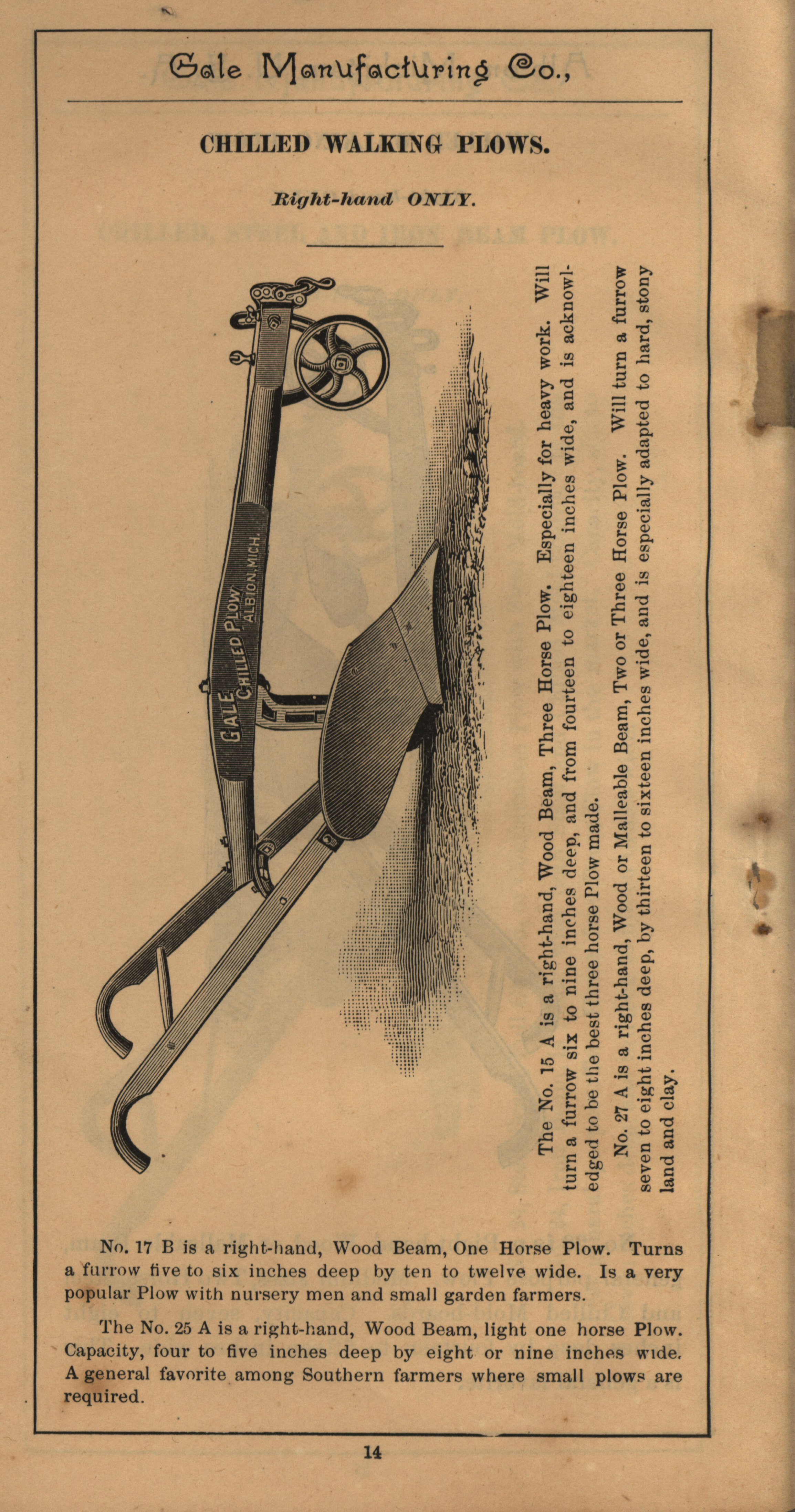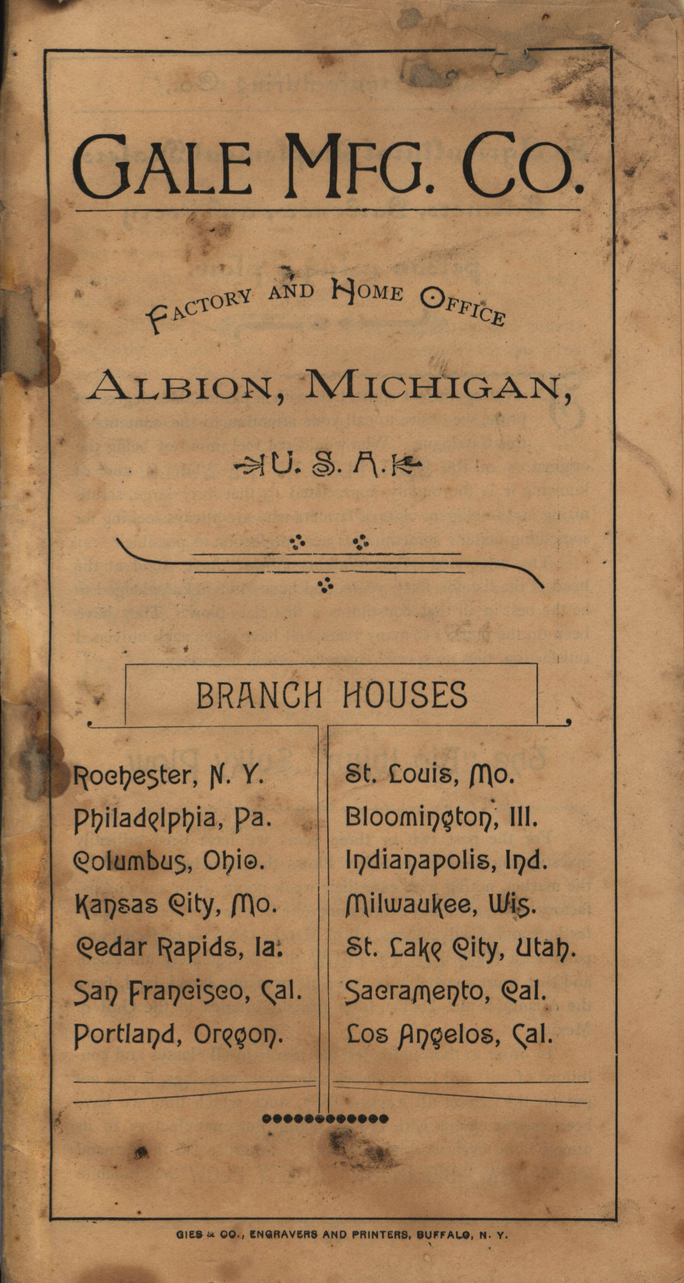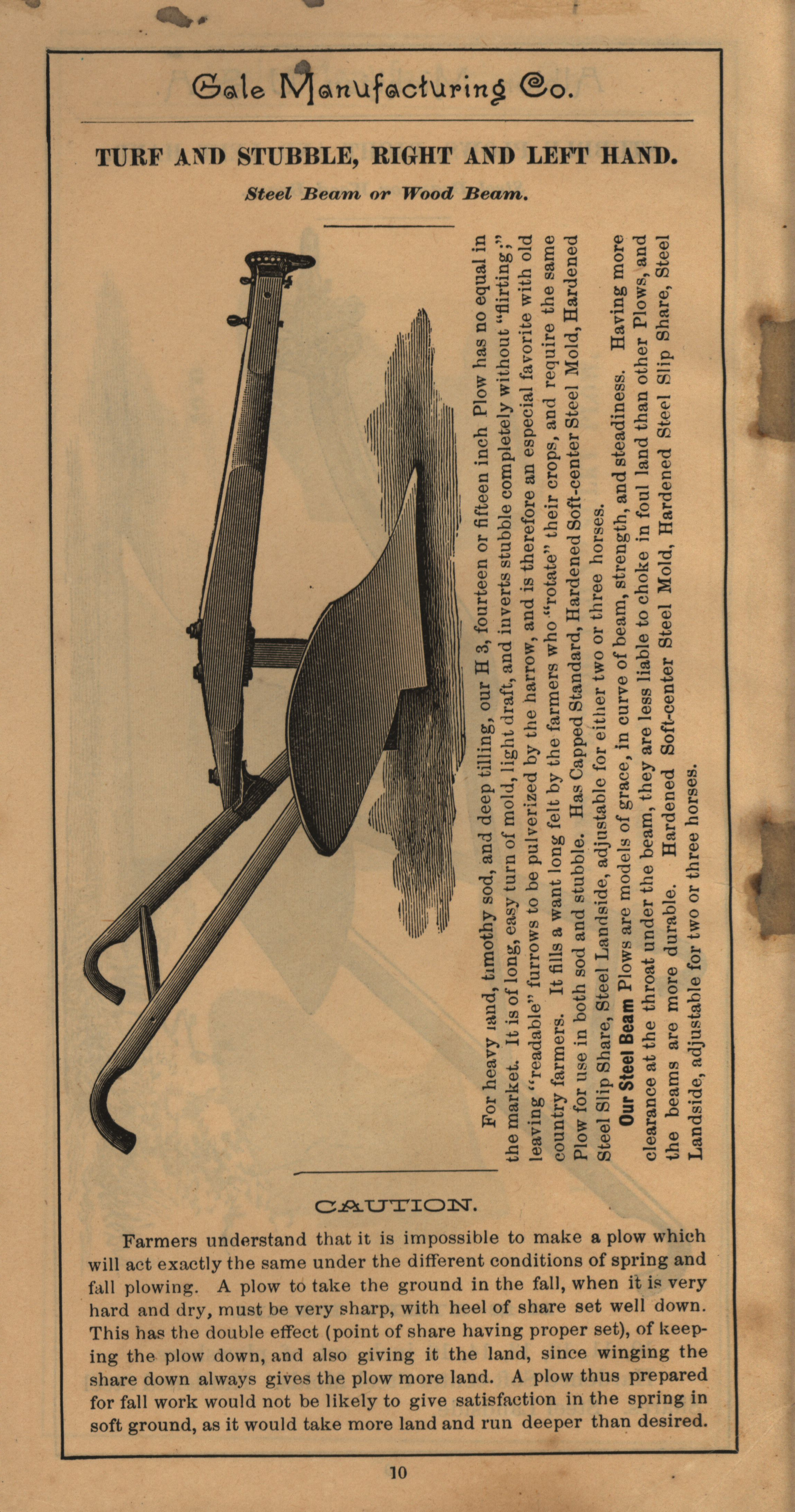 - Illustrated catalog describing the plows offered by the Gale Manufacturing Company in 1888.