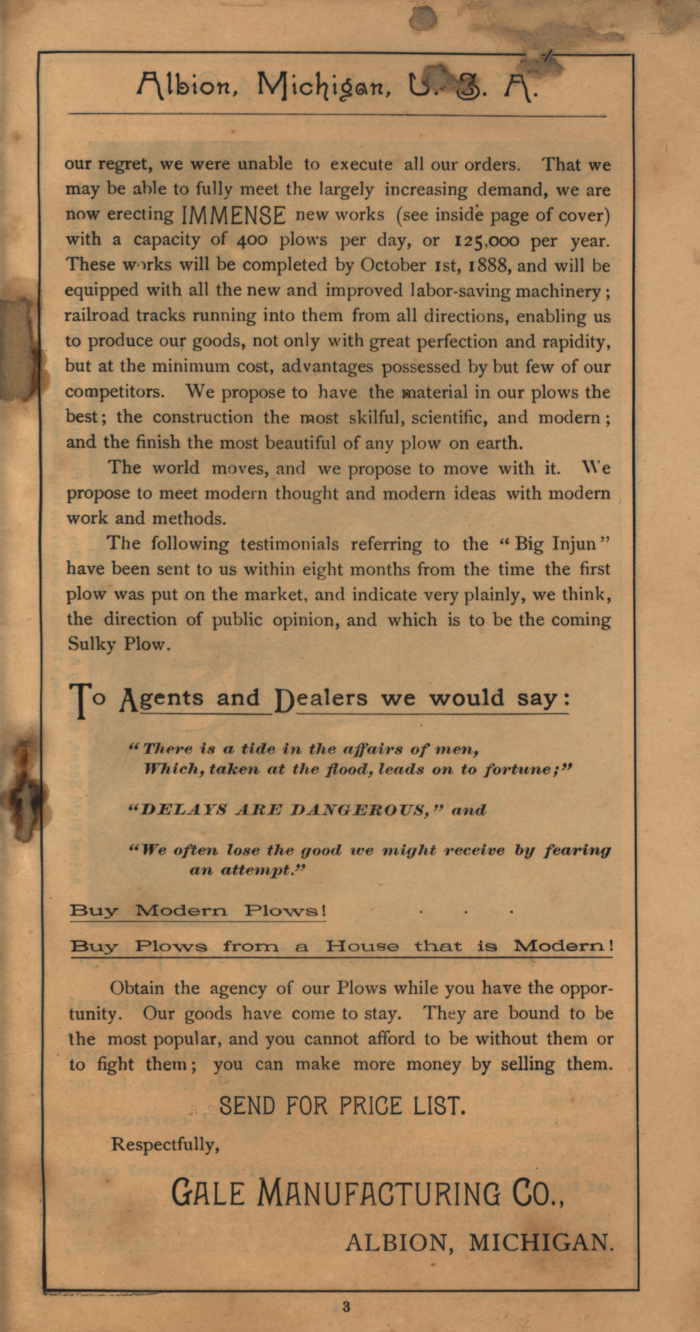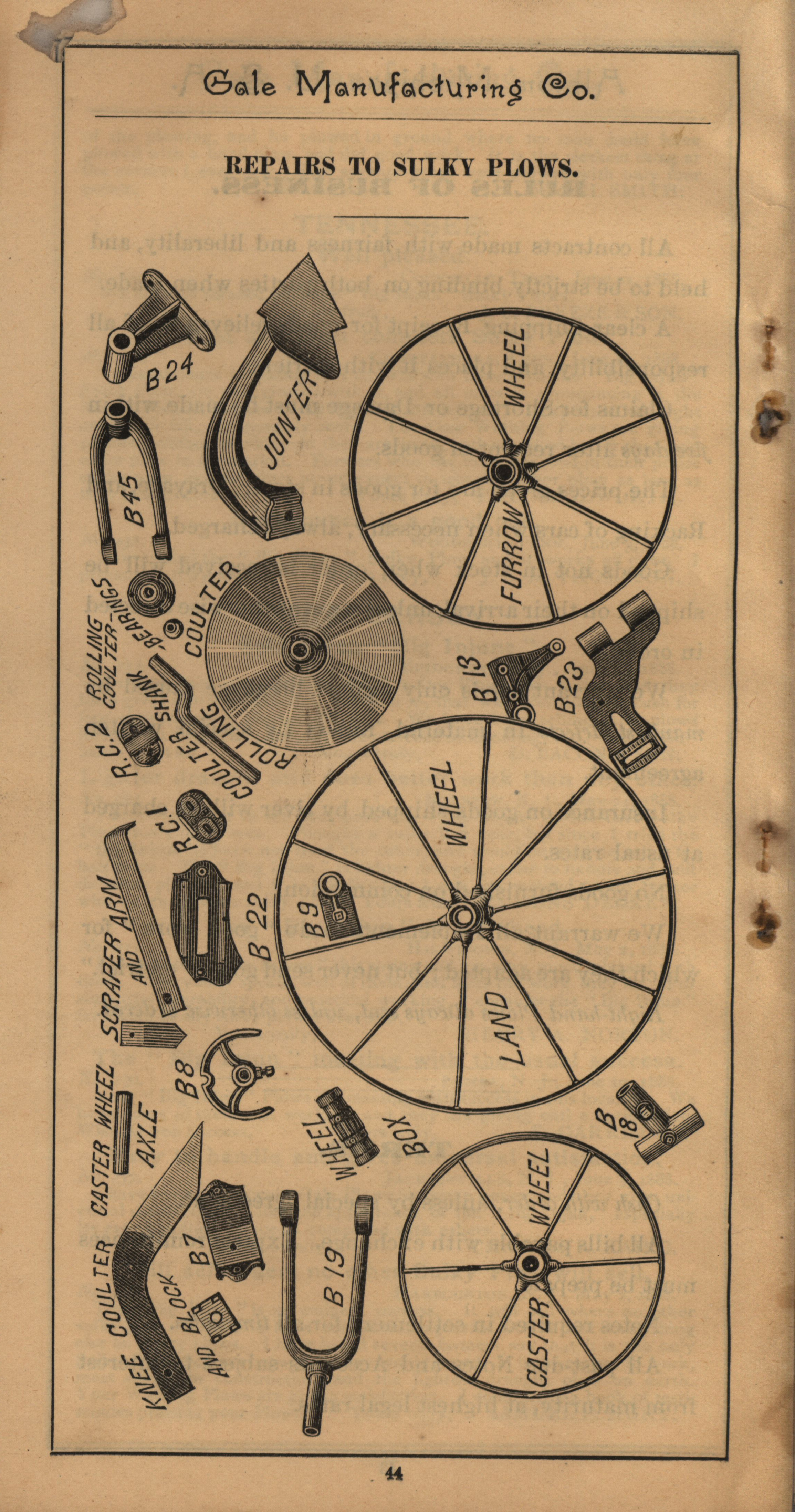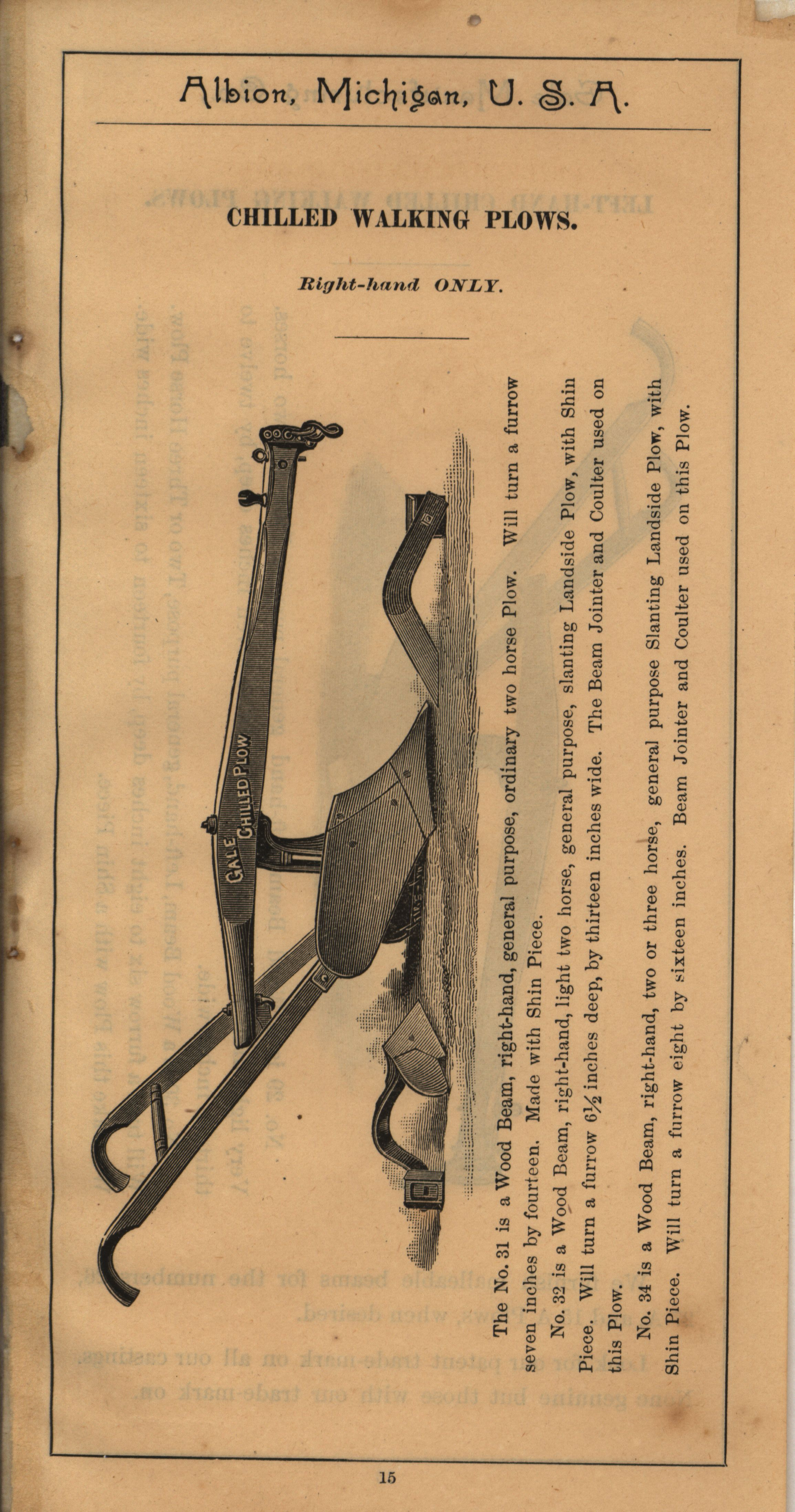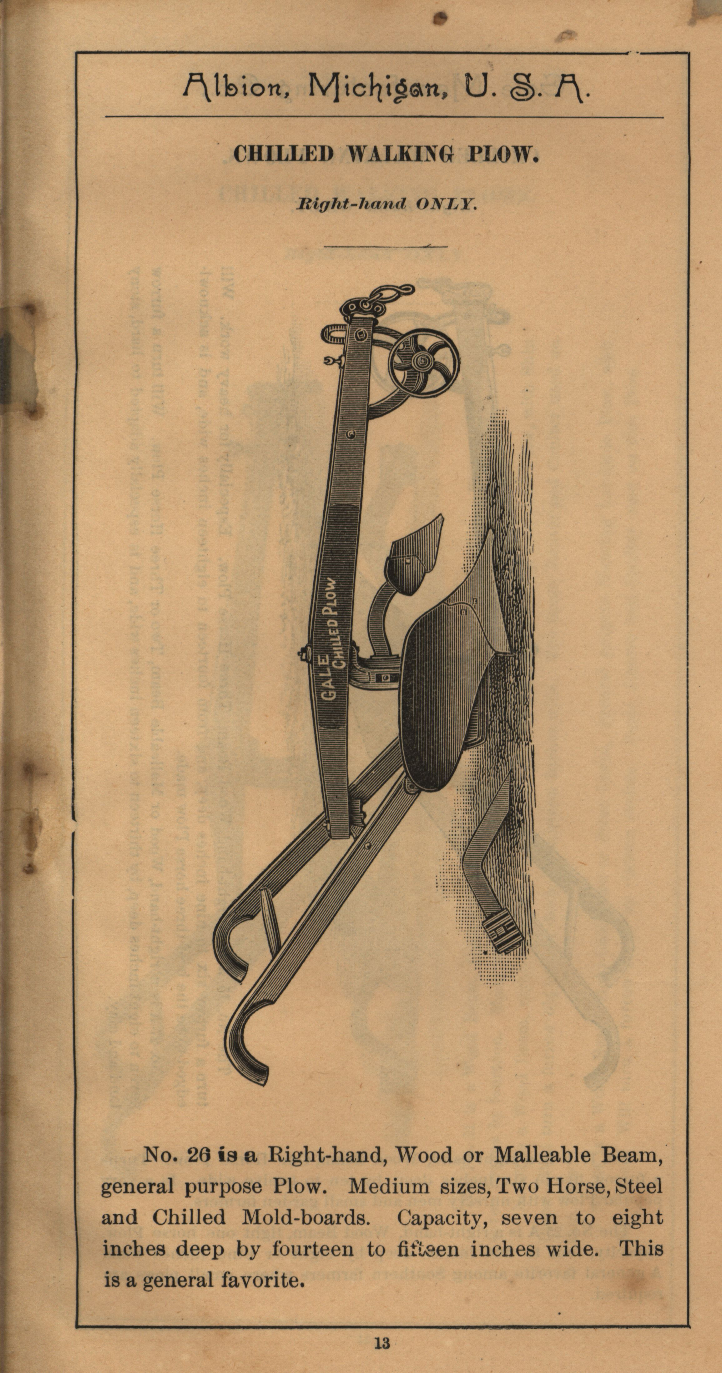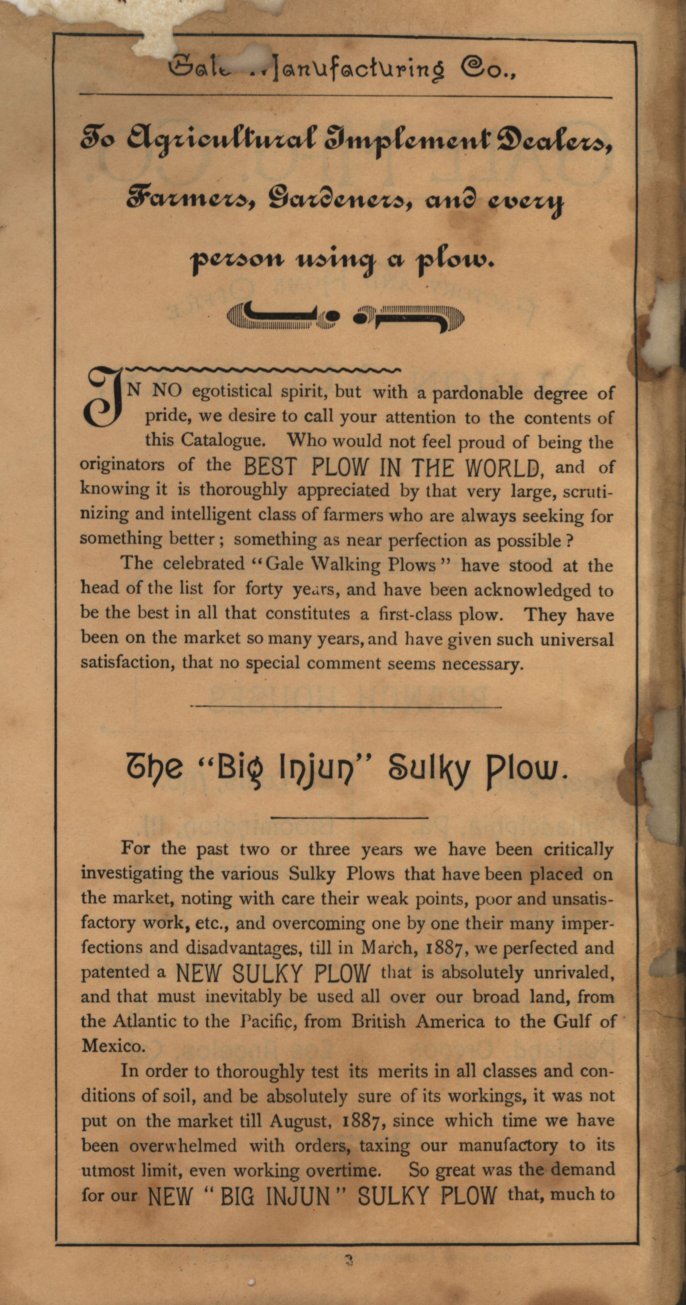 - Illustrated catalog describing the plows offered by the Gale Manufacturing Company in 1888.
