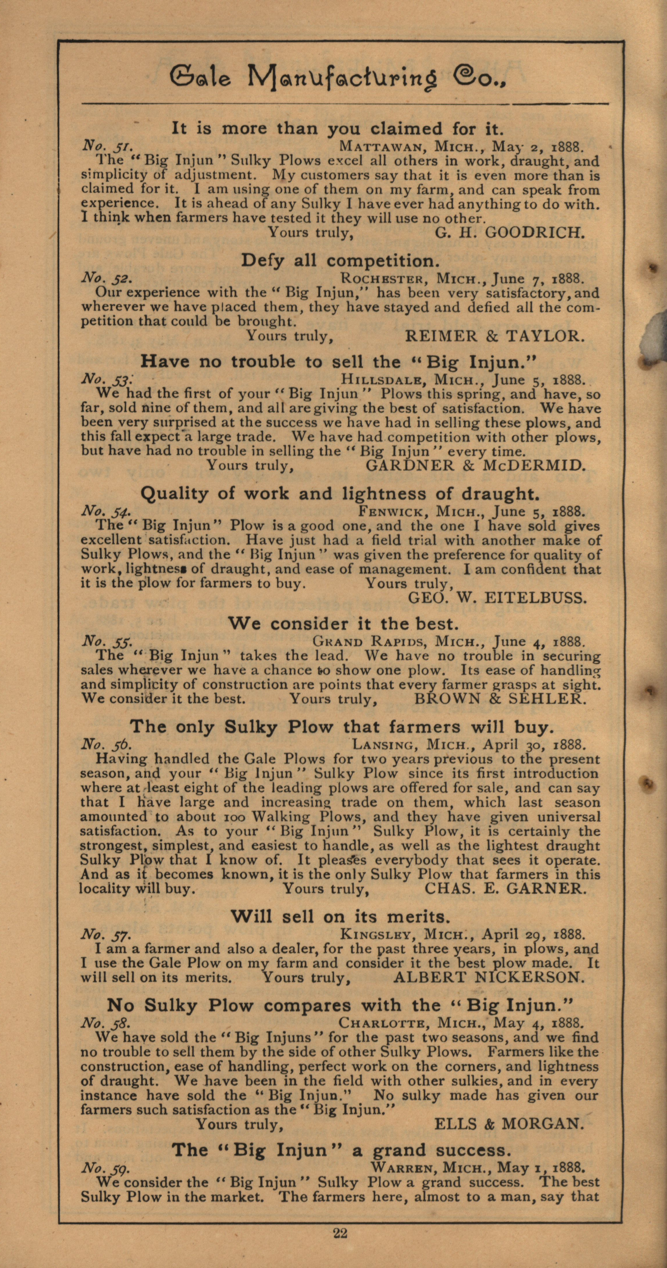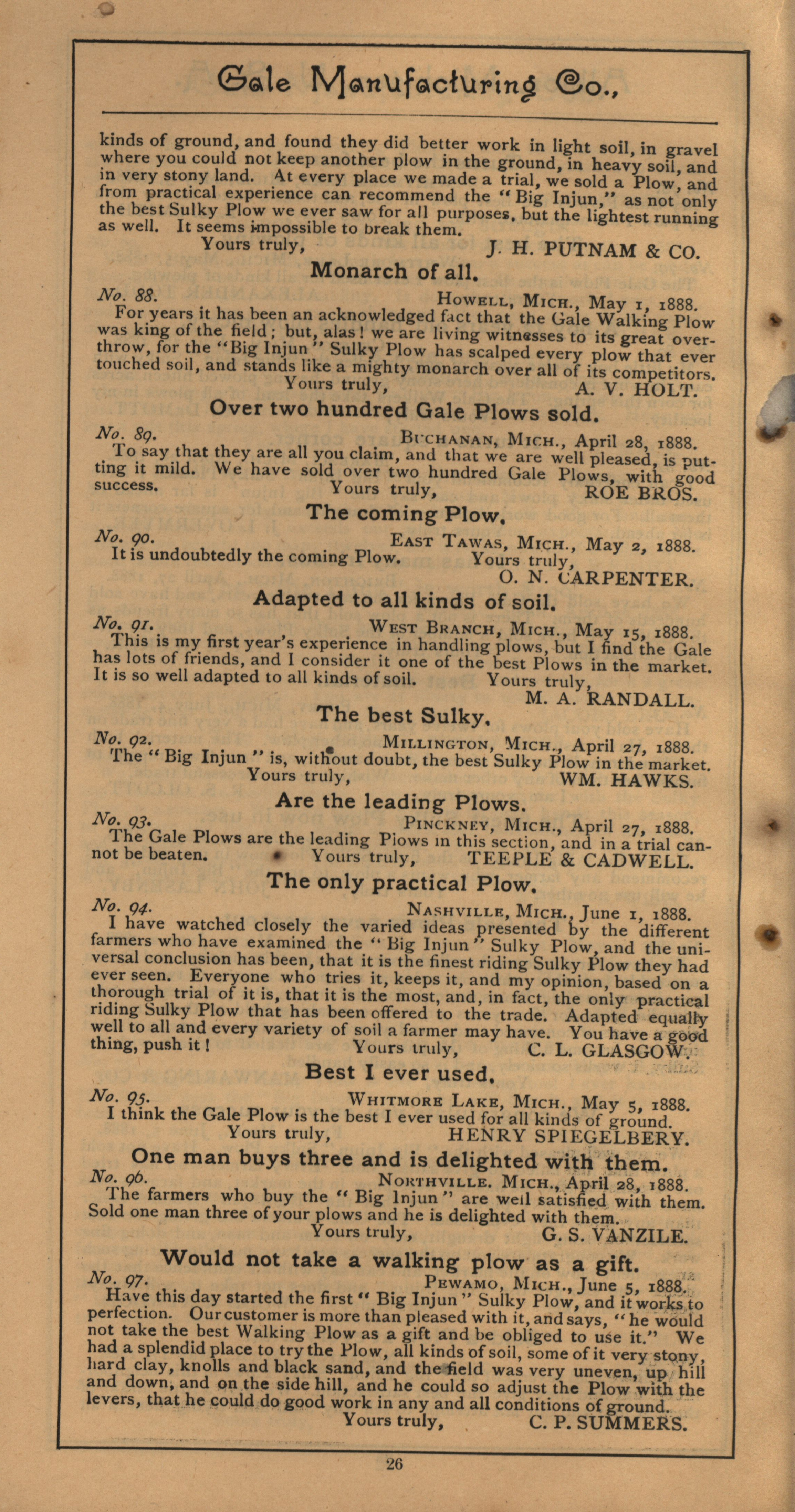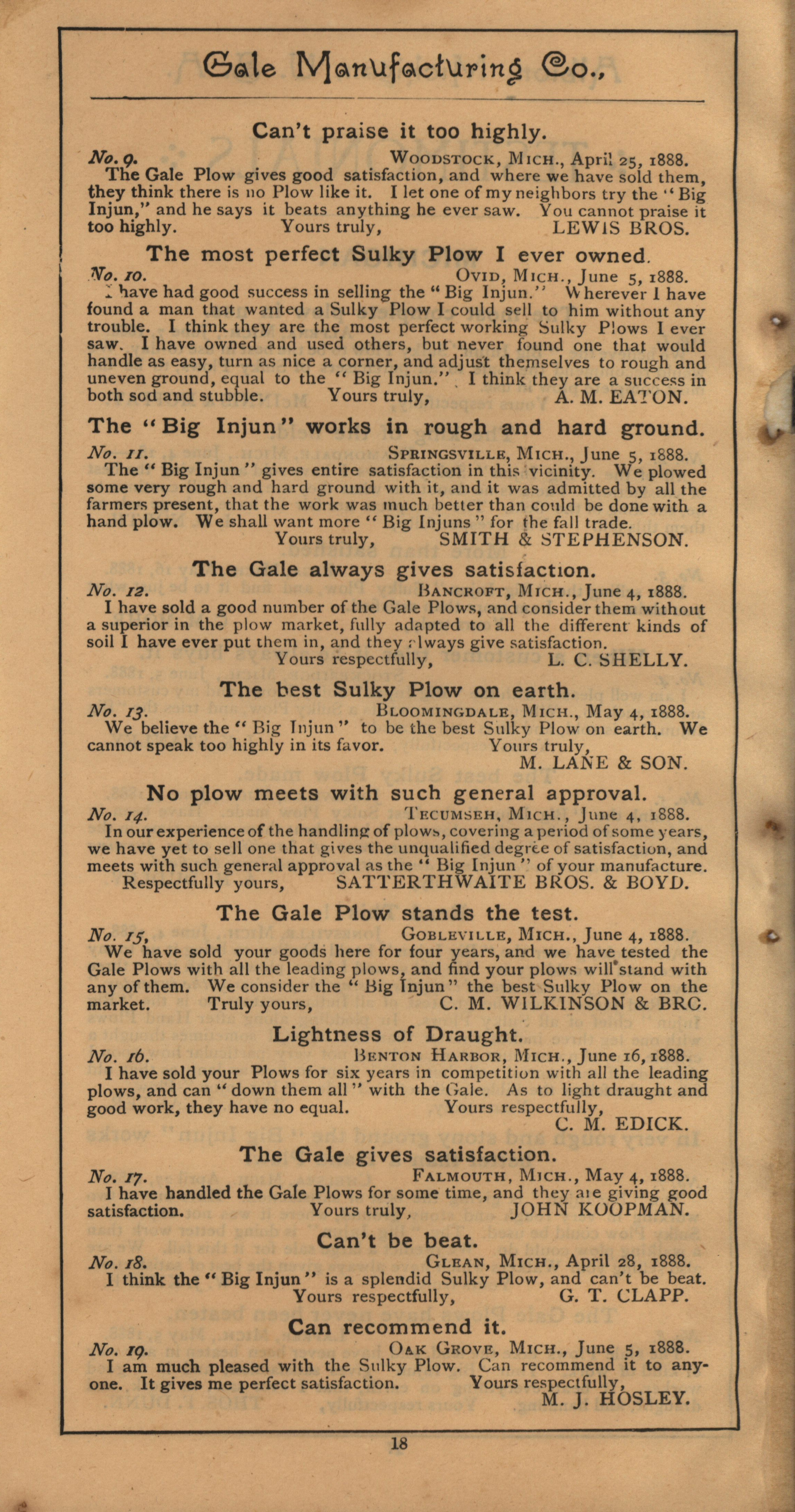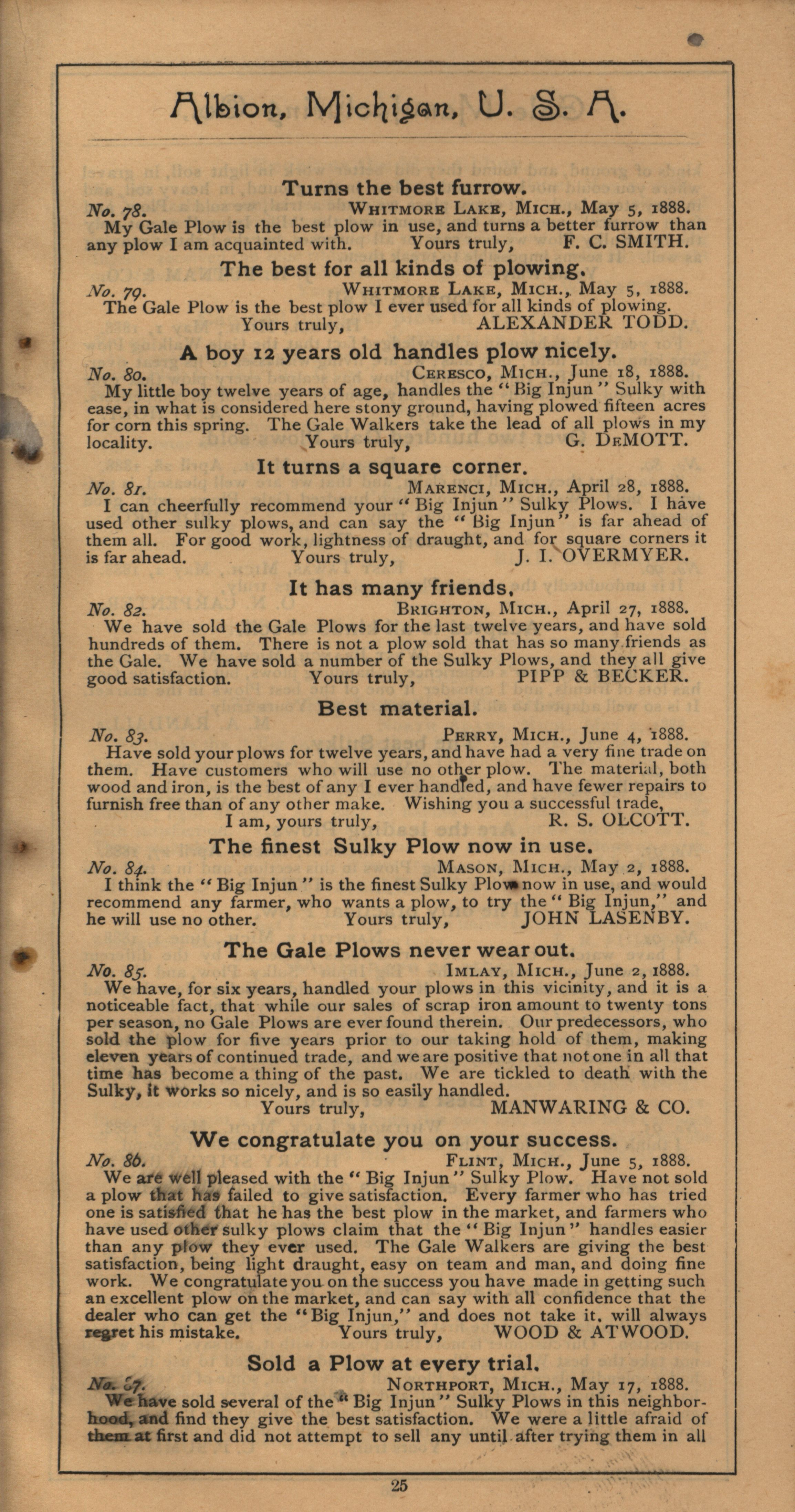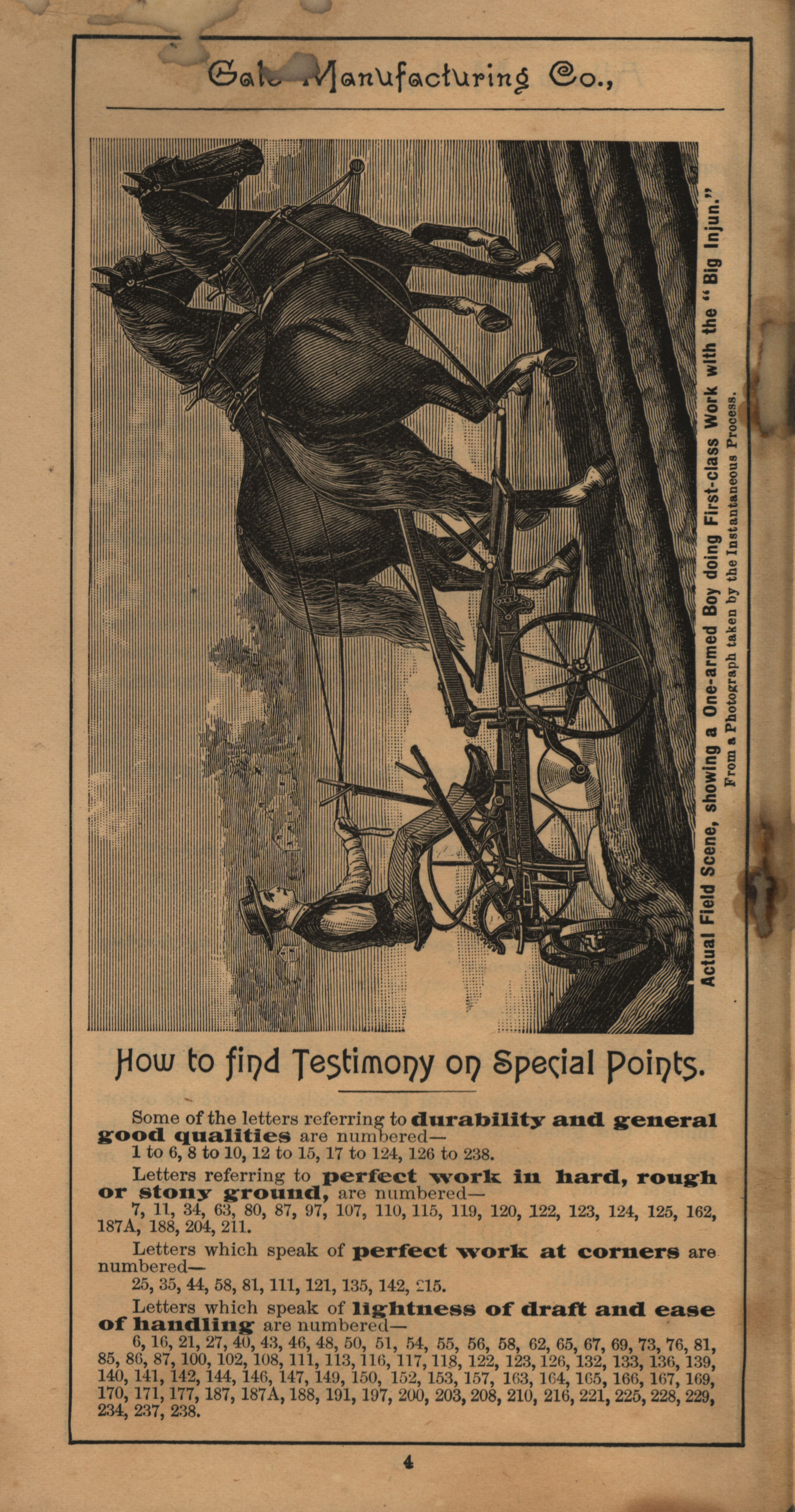 - Illustrated catalog describing the plows offered by the Gale Manufacturing Company in 1888.