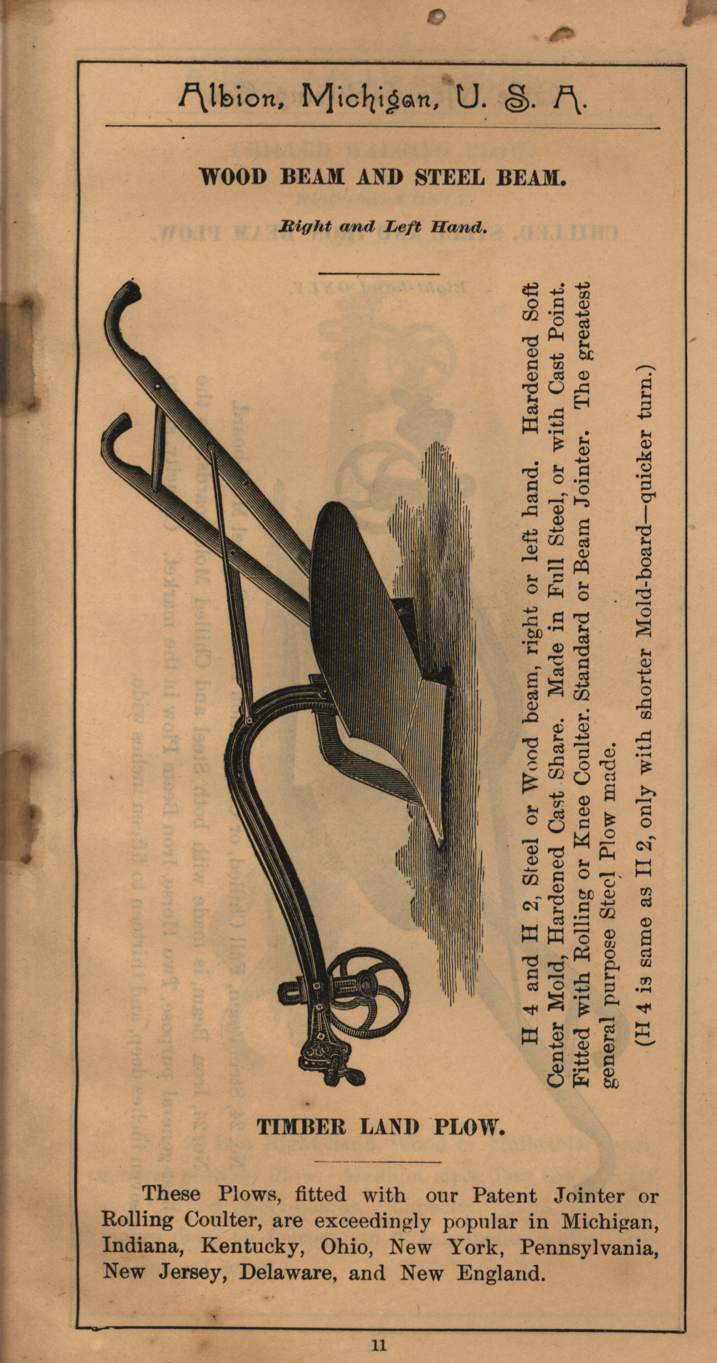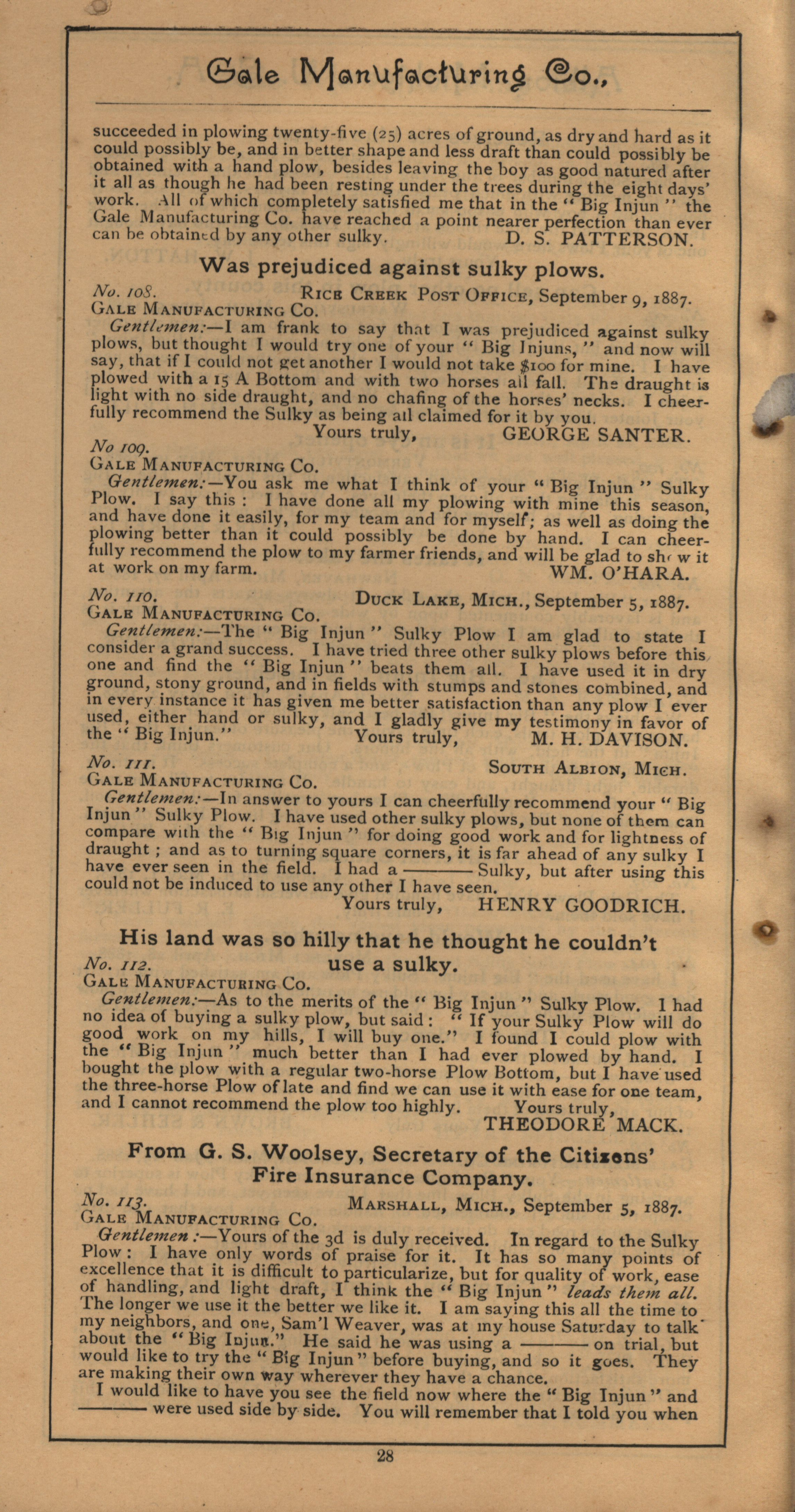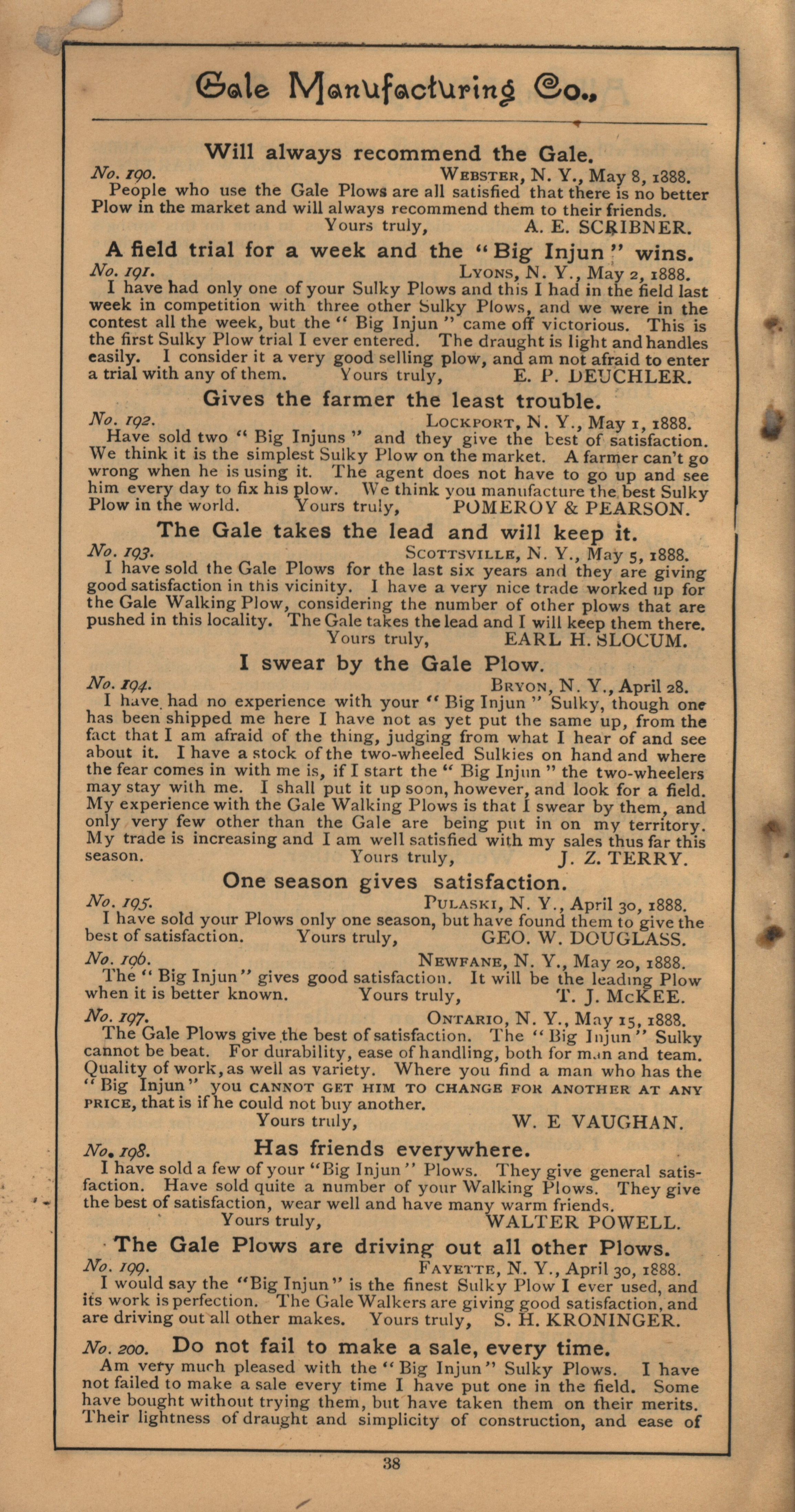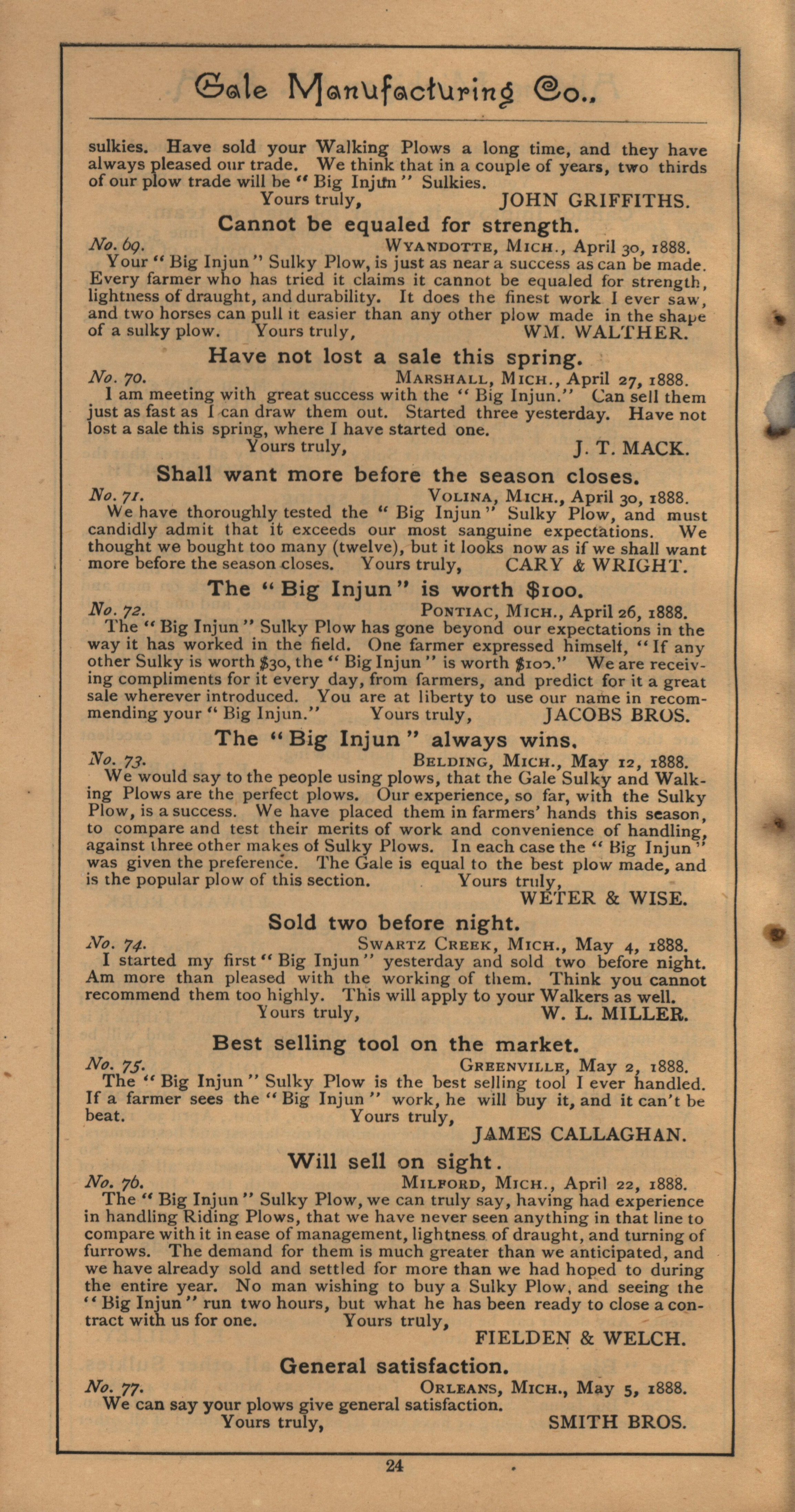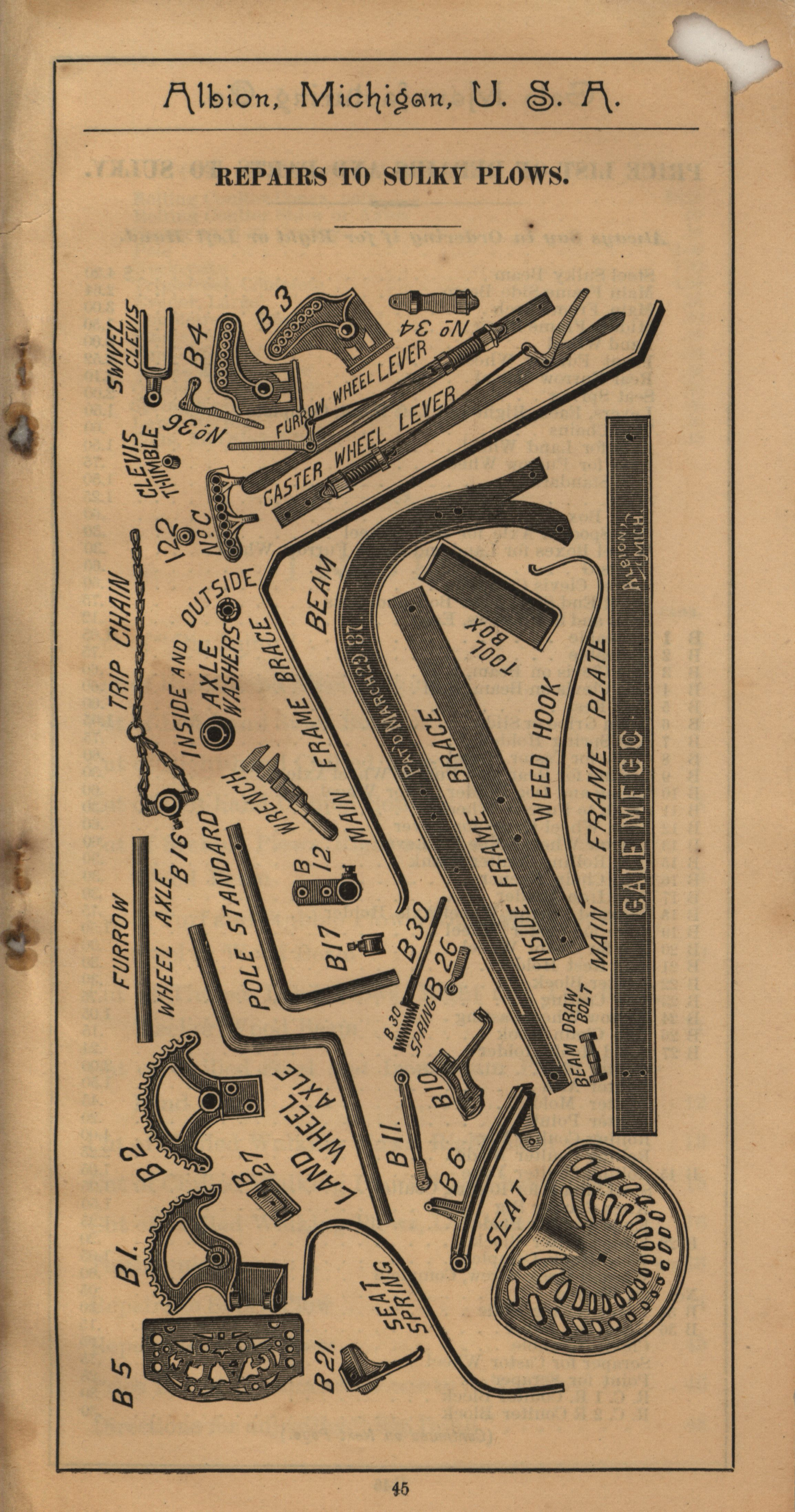 - Illustrated catalog describing the plows offered by the Gale Manufacturing Company in 1888.