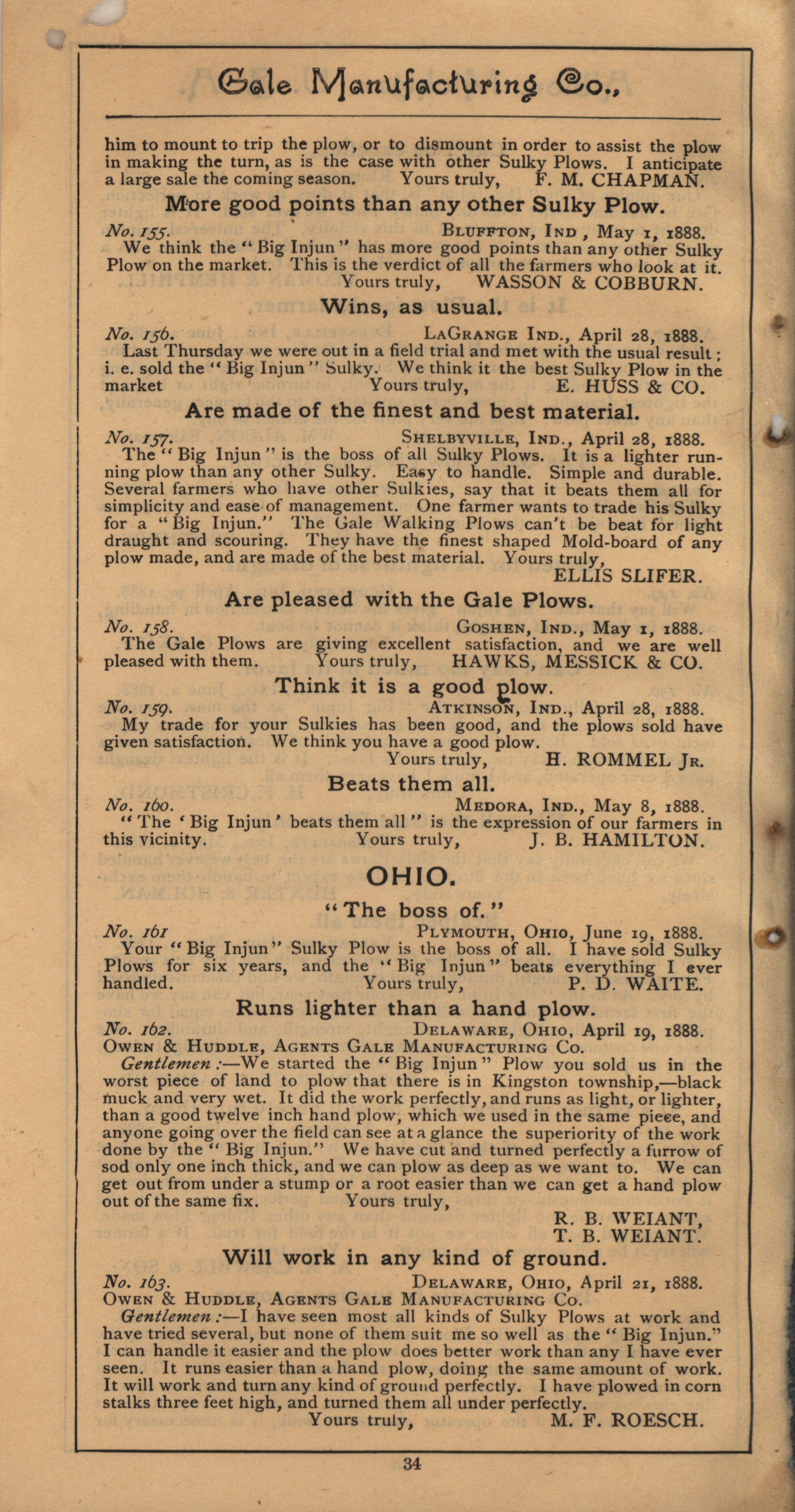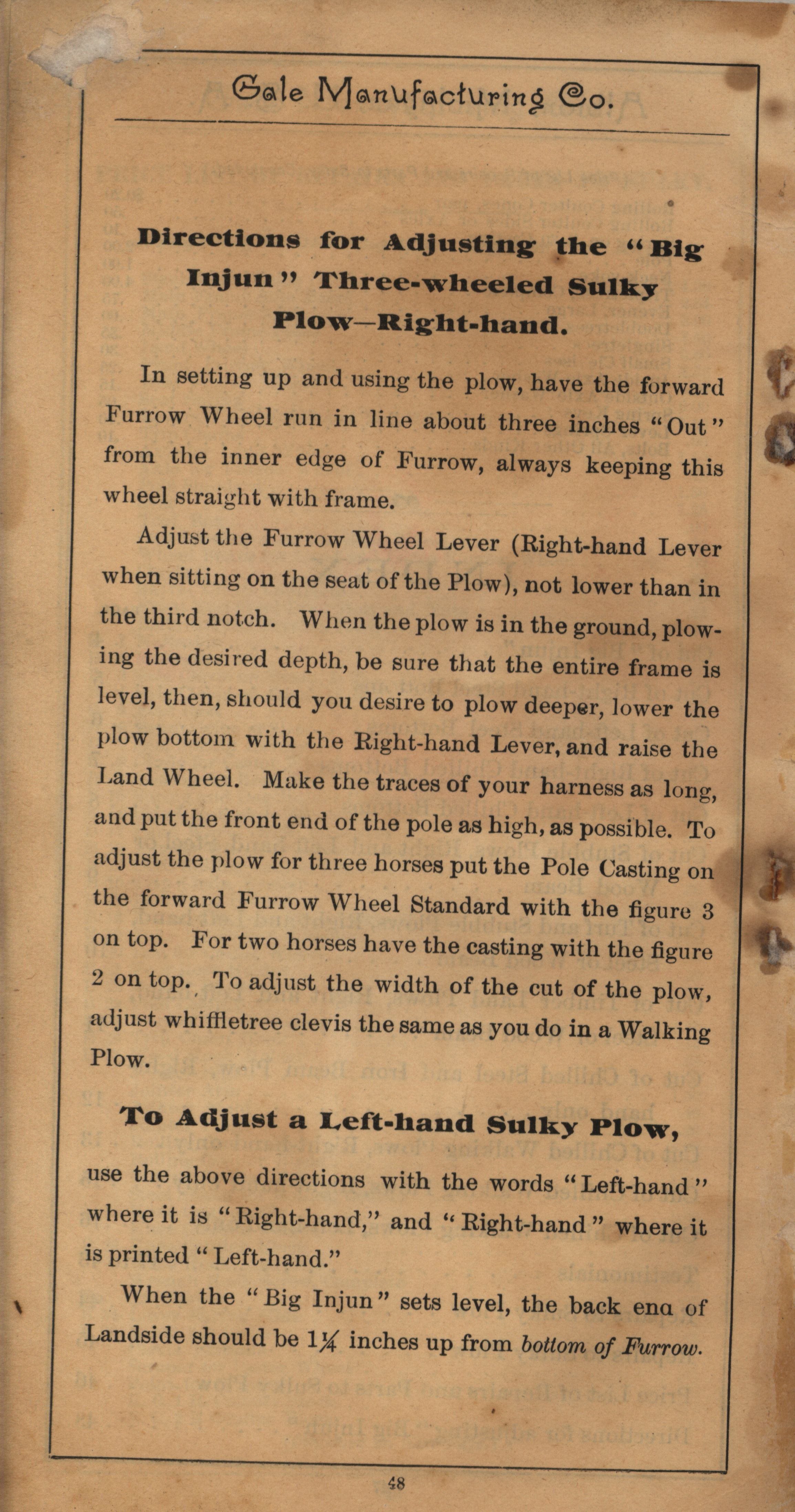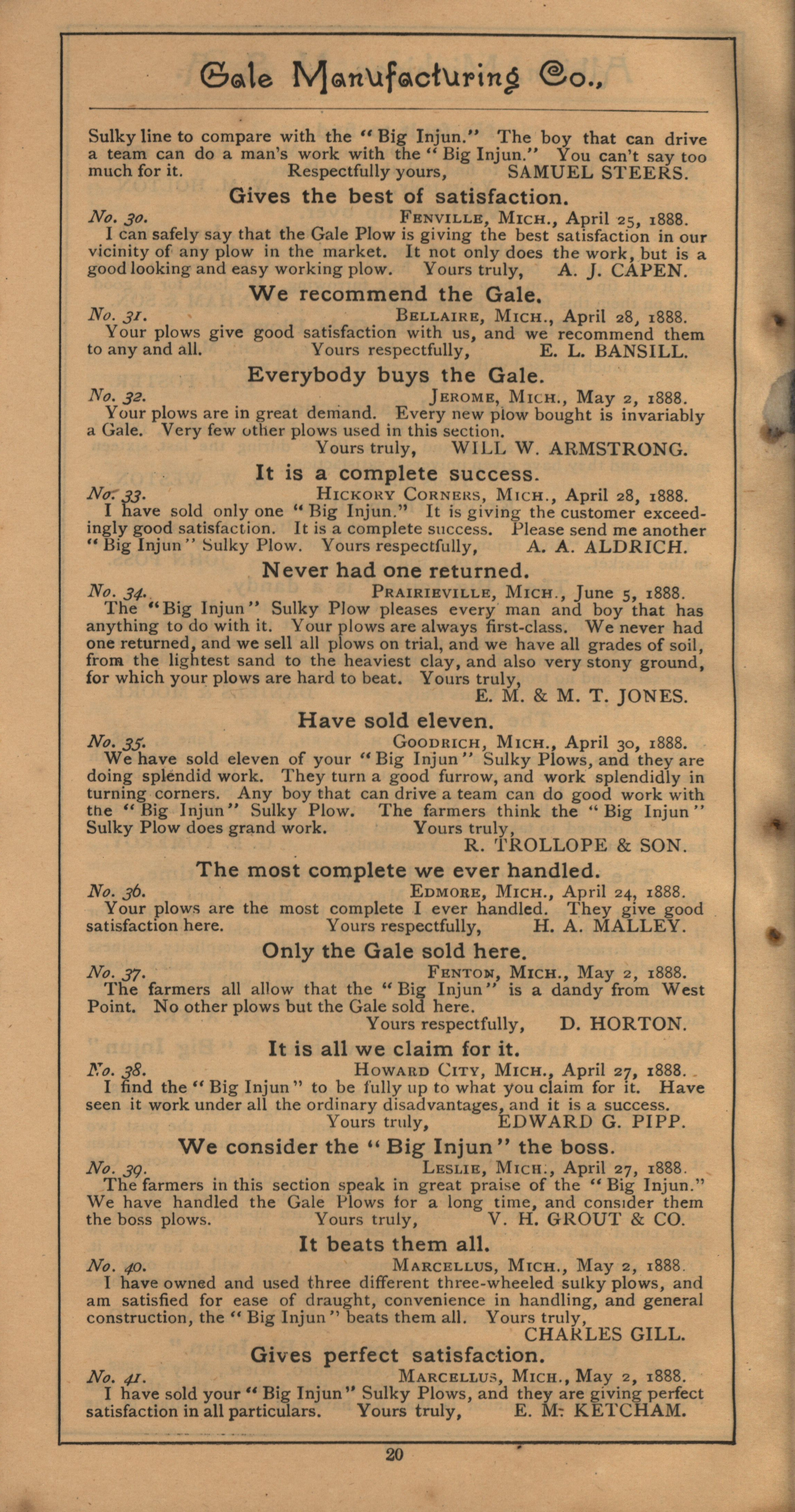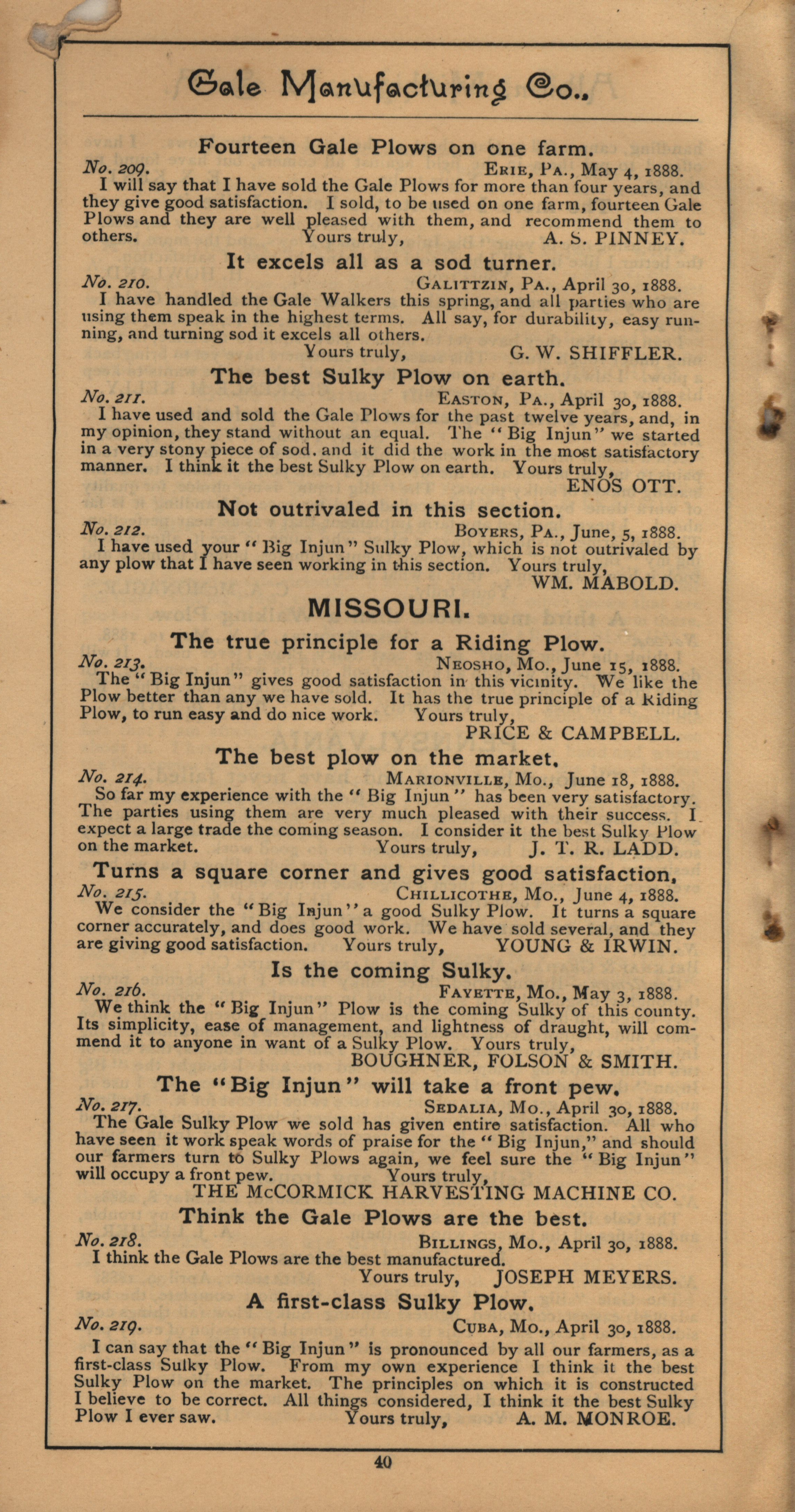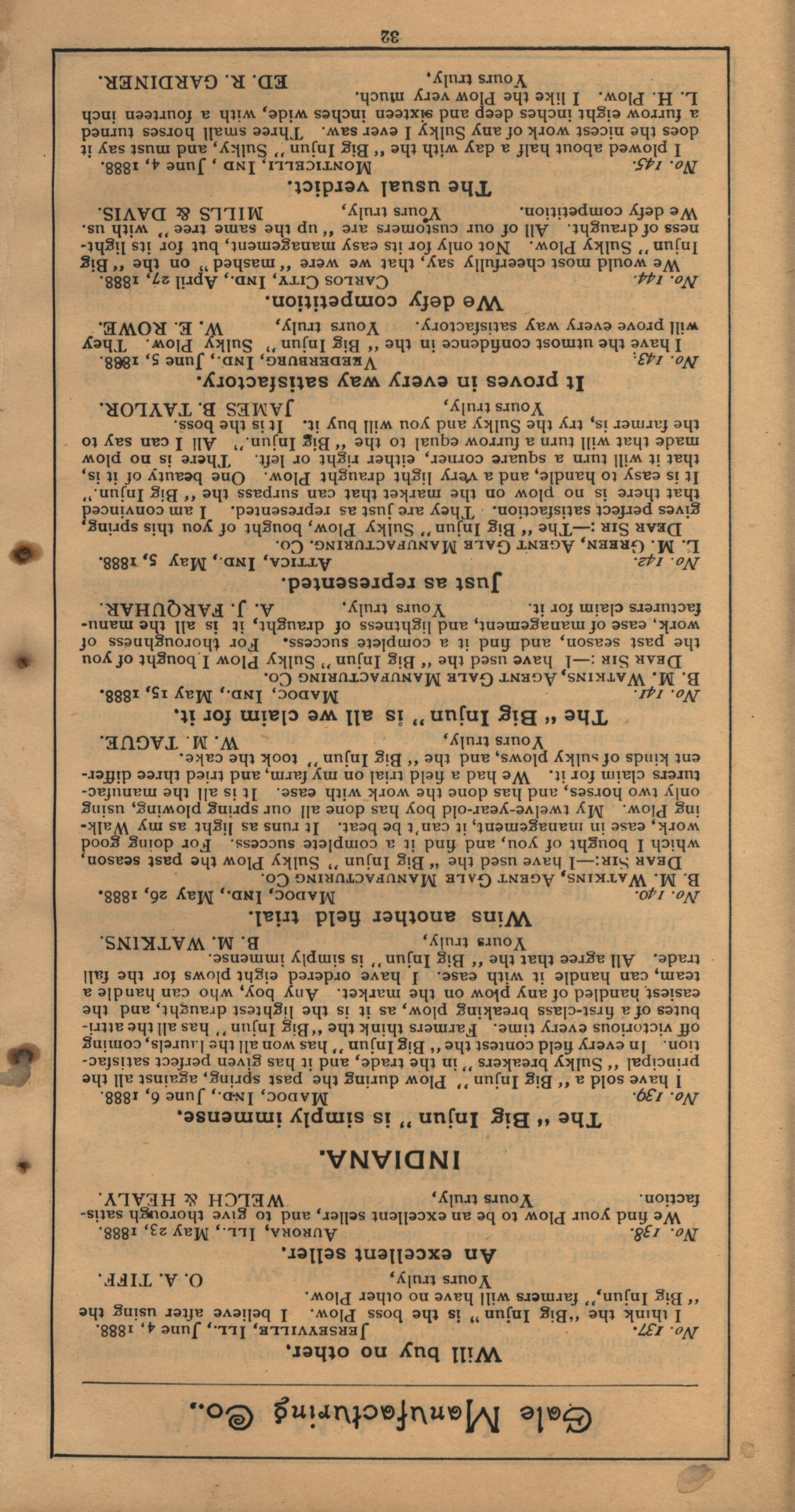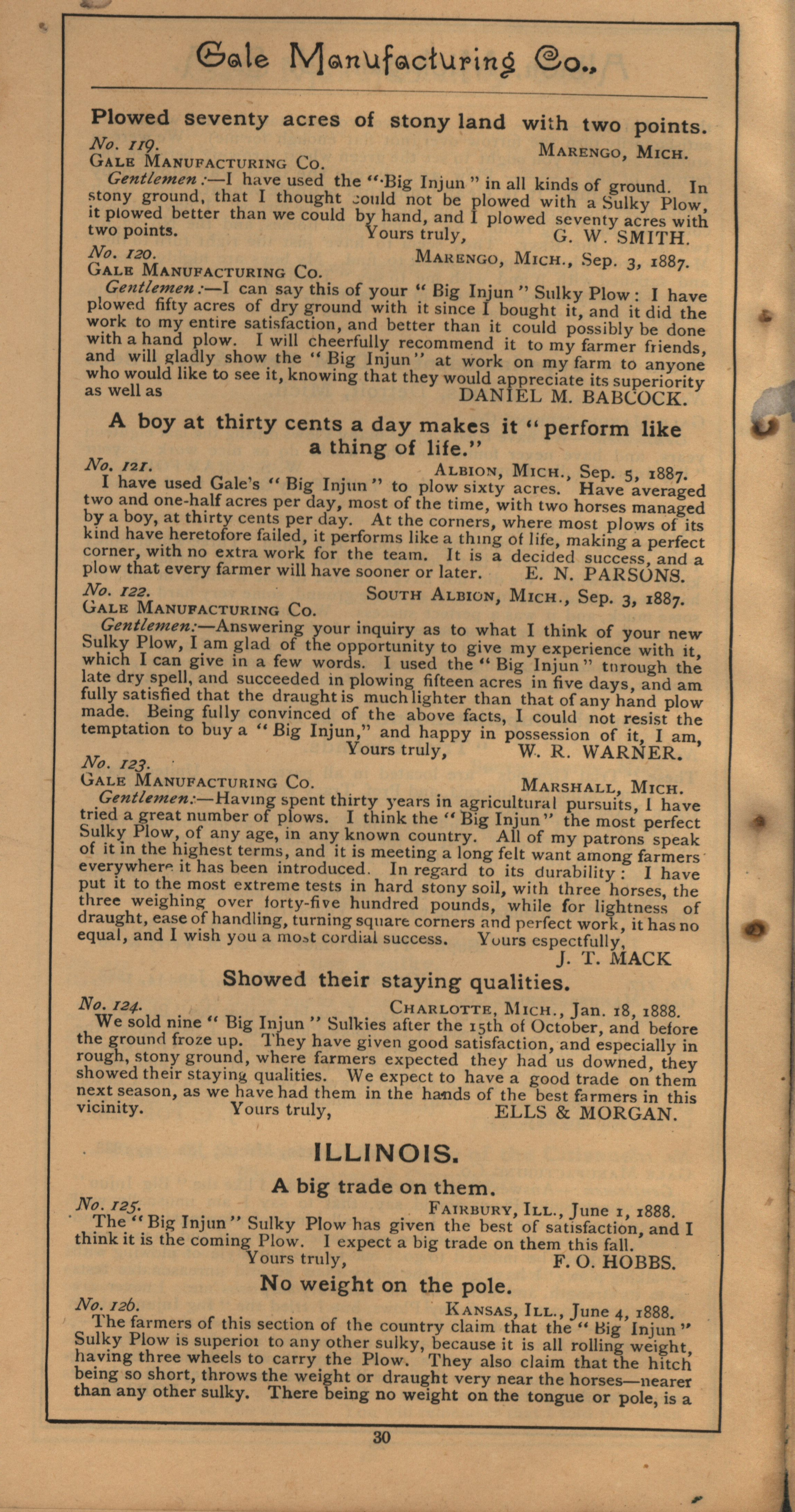 - Illustrated catalog describing the plows offered by the Gale Manufacturing Company in 1888.
