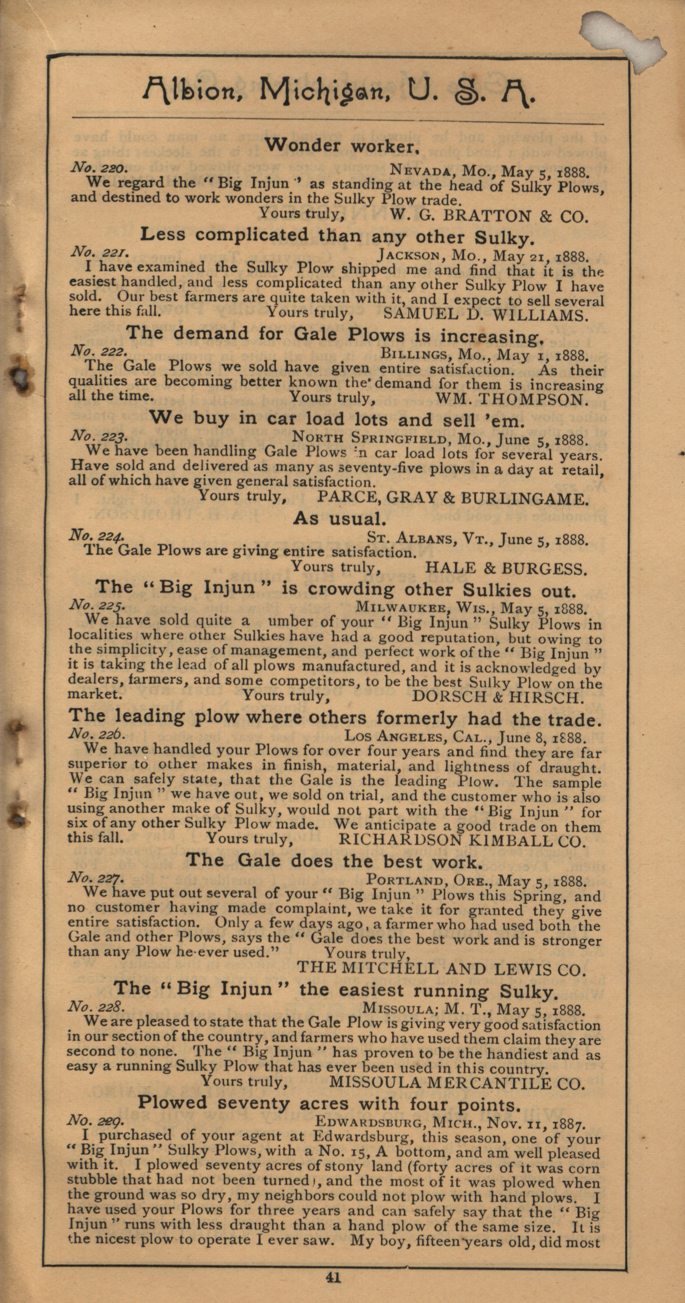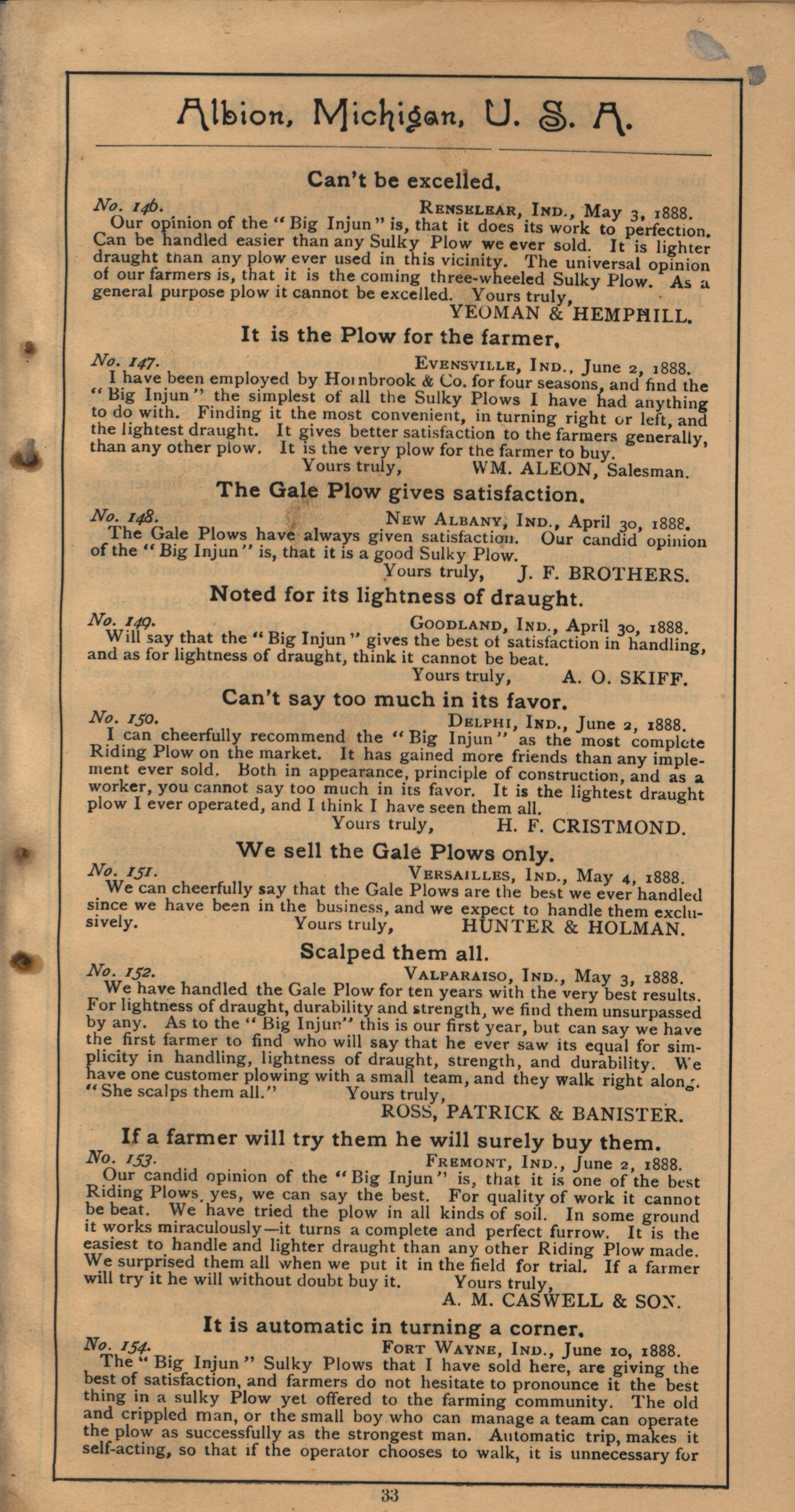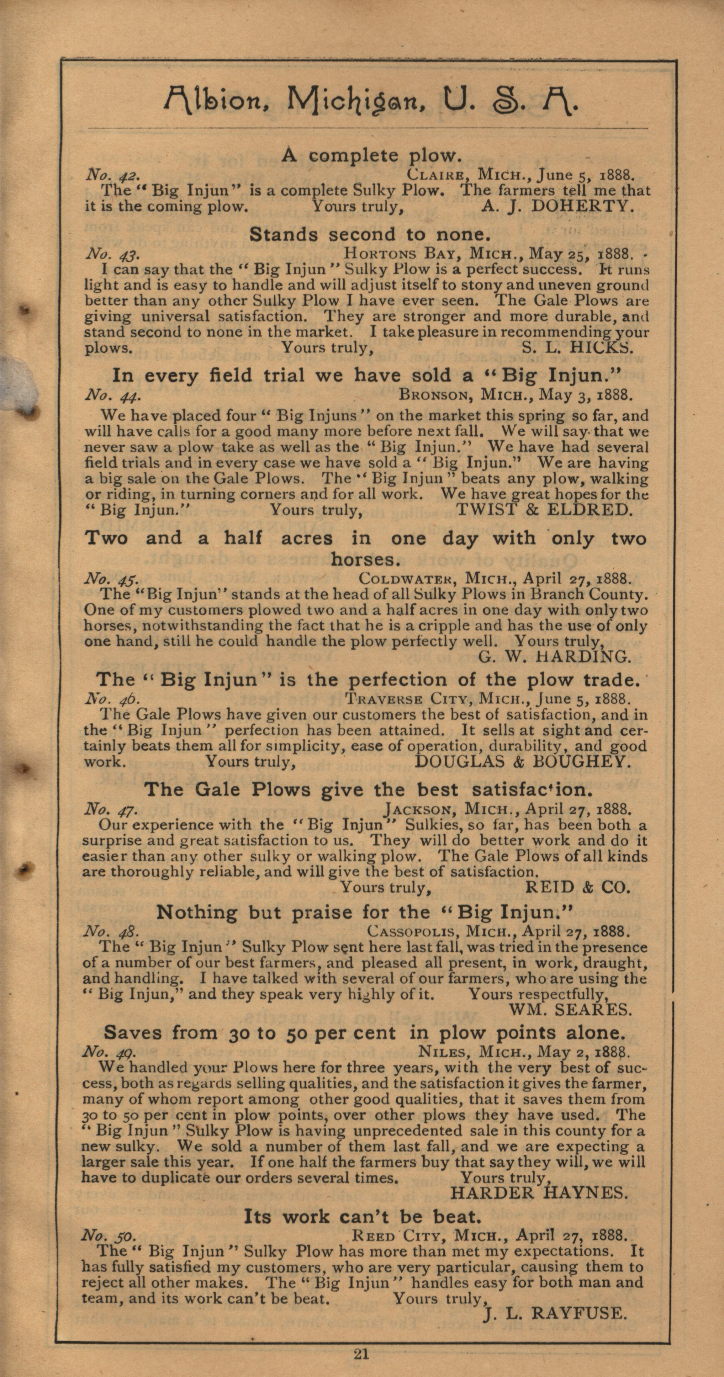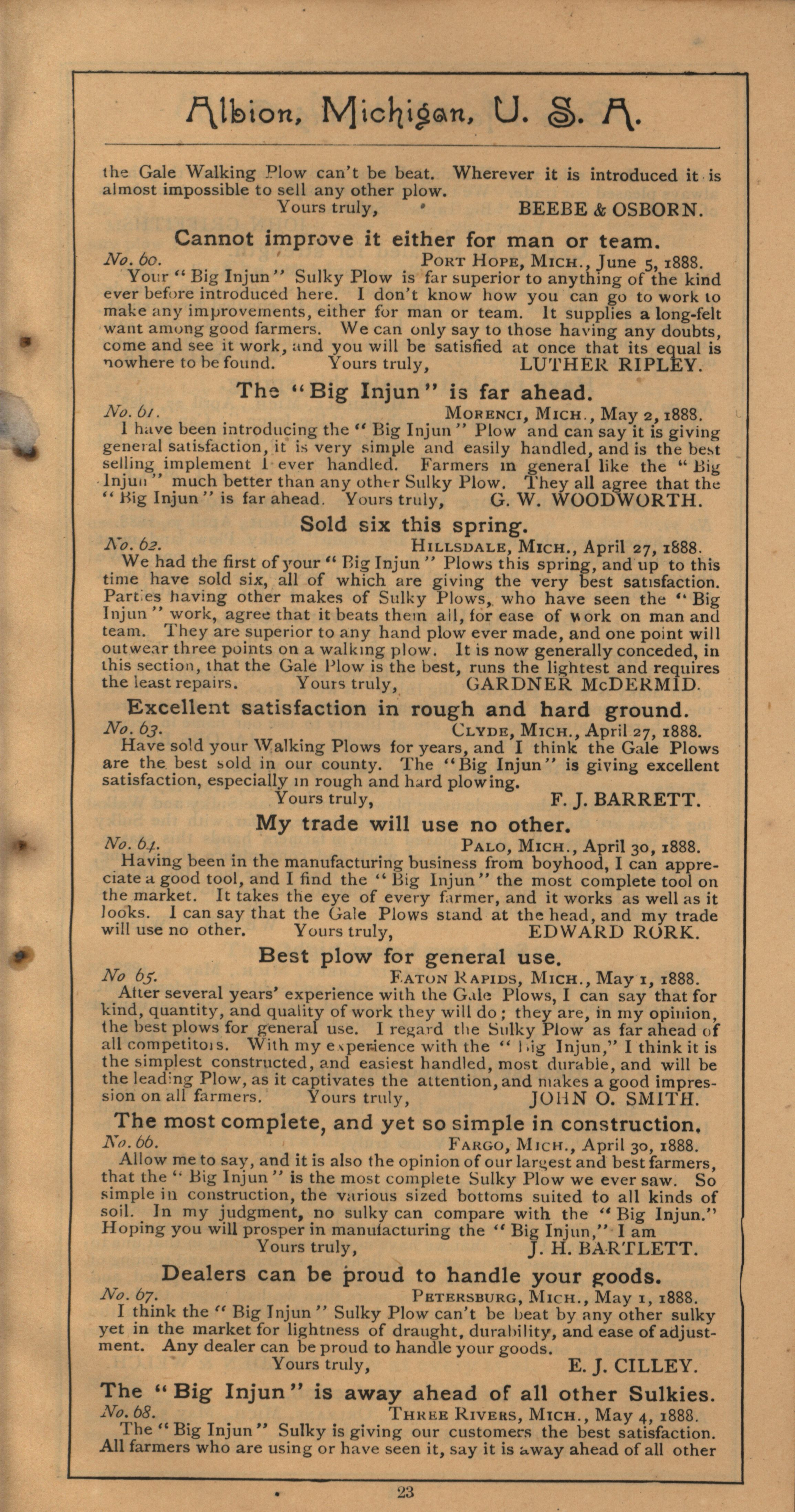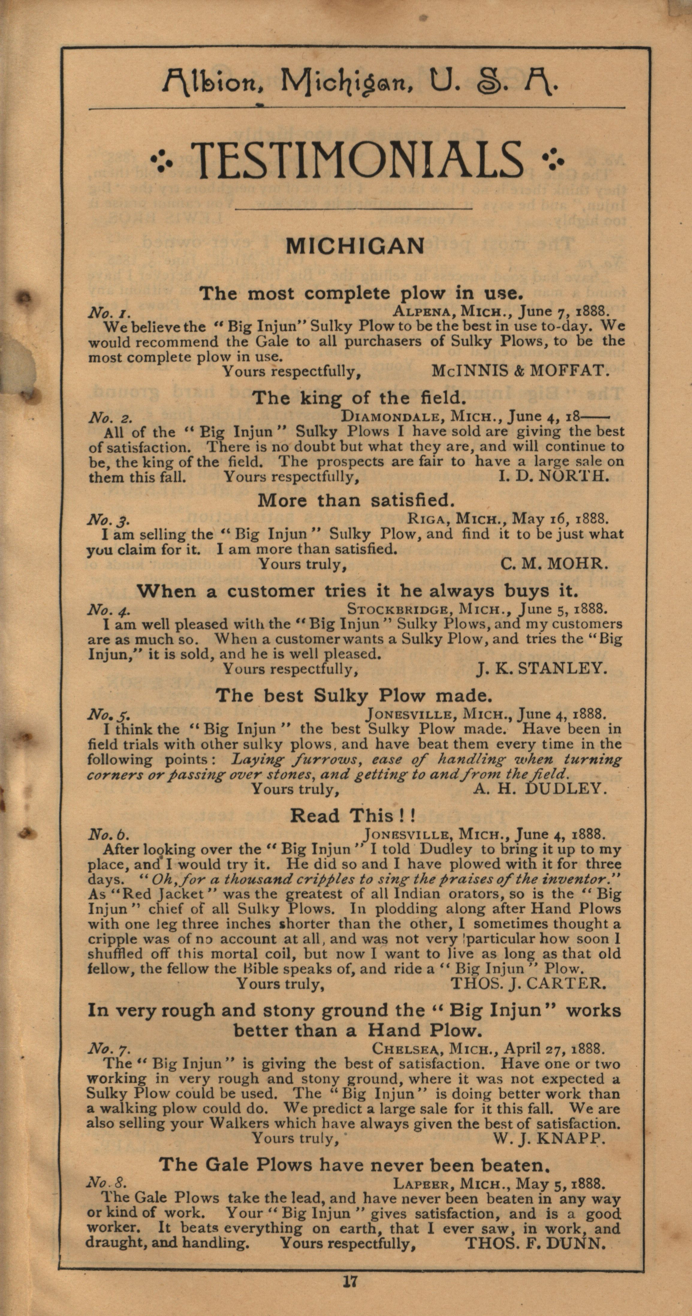 - Illustrated catalog describing the plows offered by the Gale Manufacturing Company in 1888.