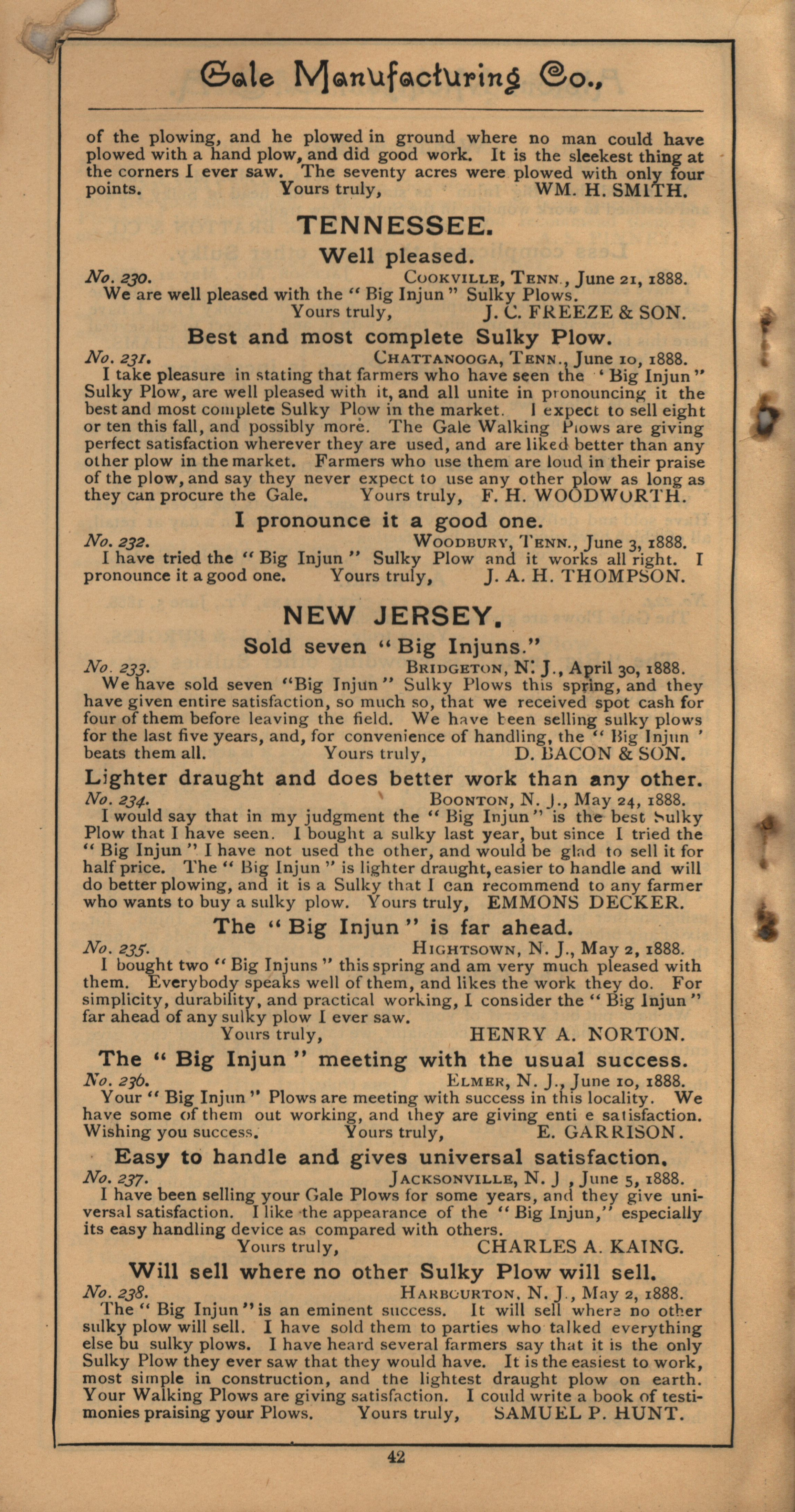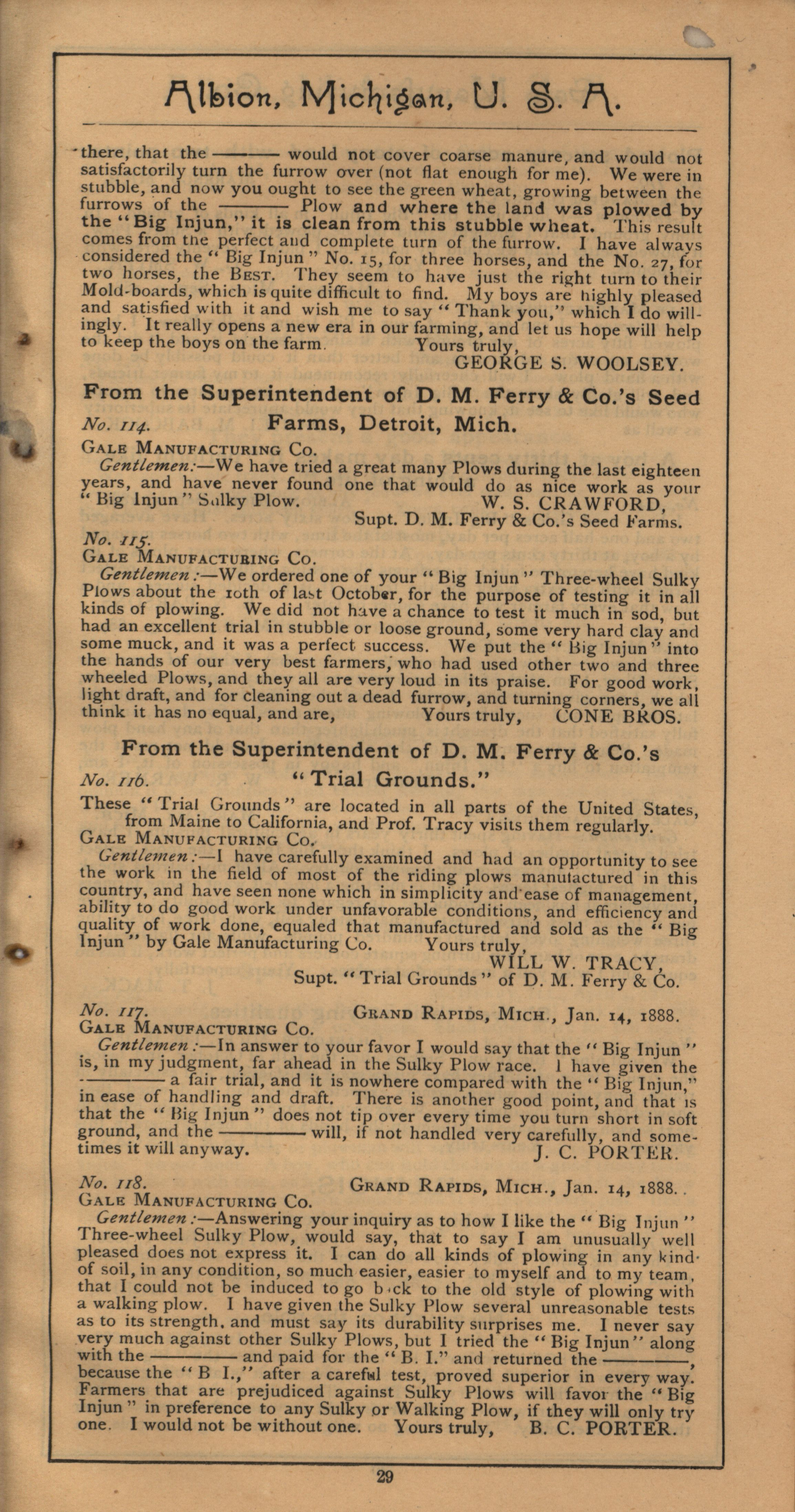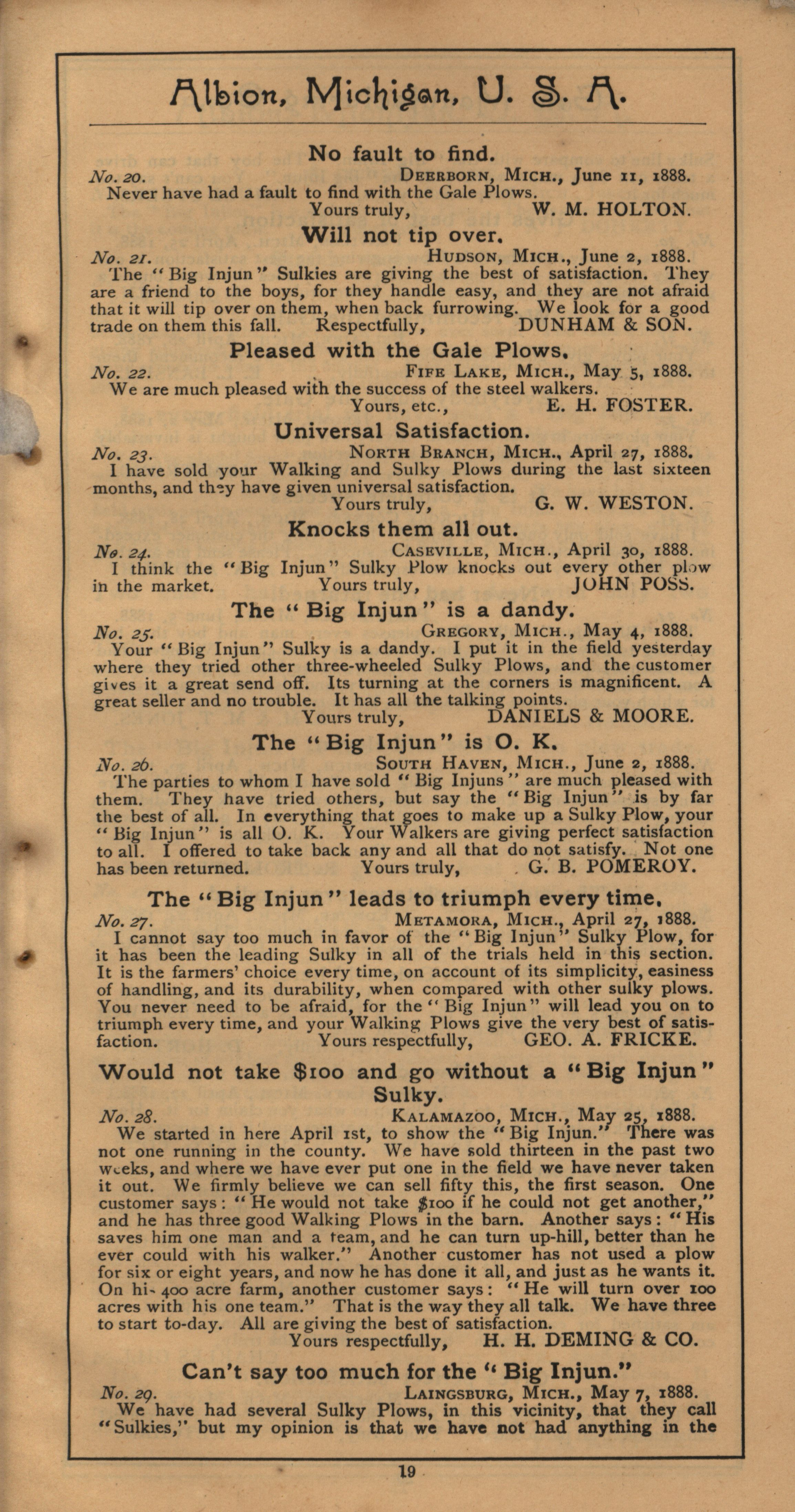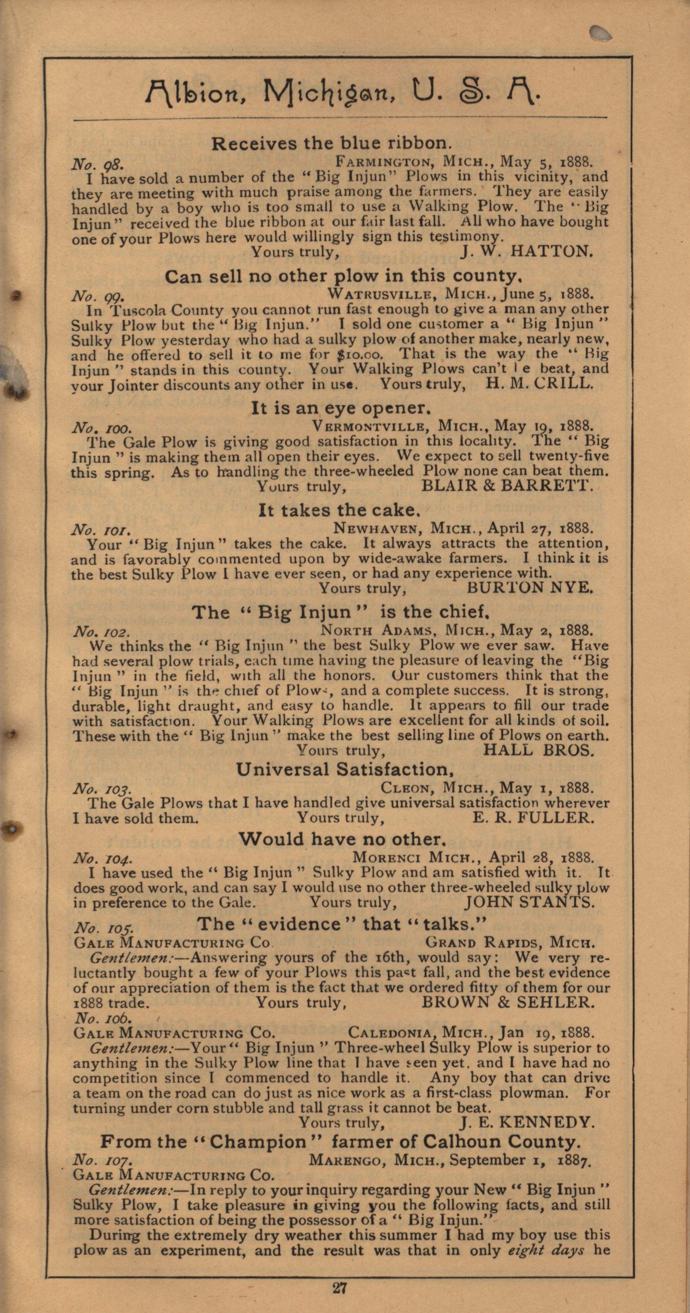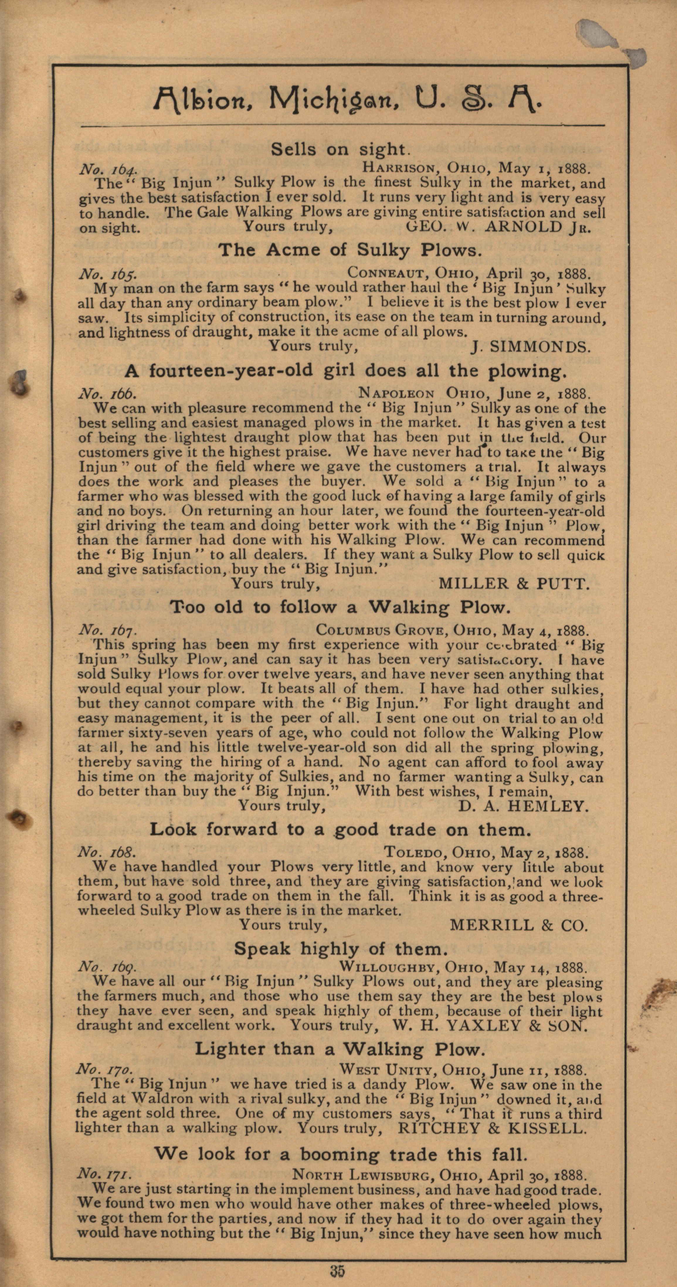- Illustrated catalog describing the plows offered by the Gale Manufacturing Company in 1888.