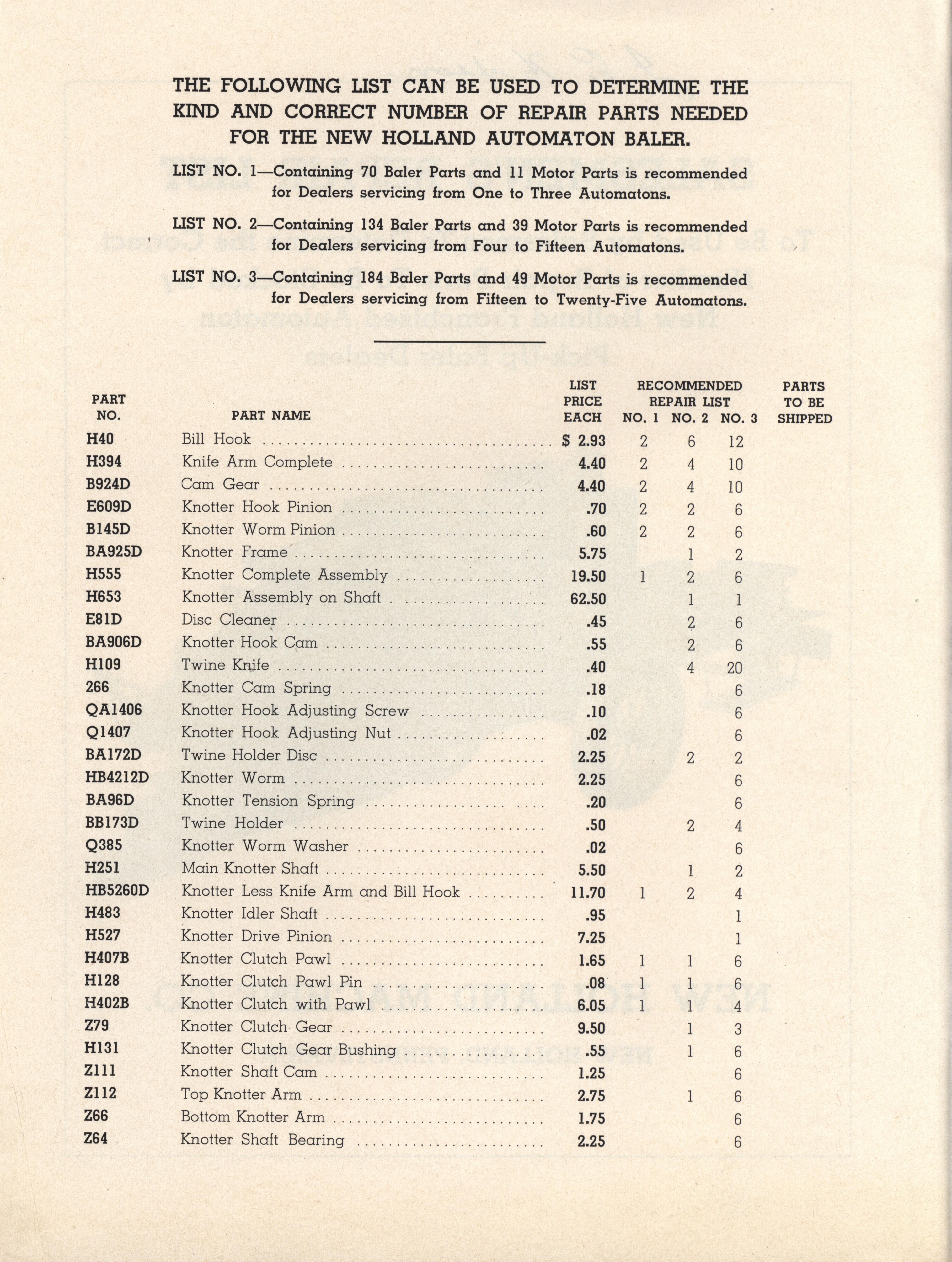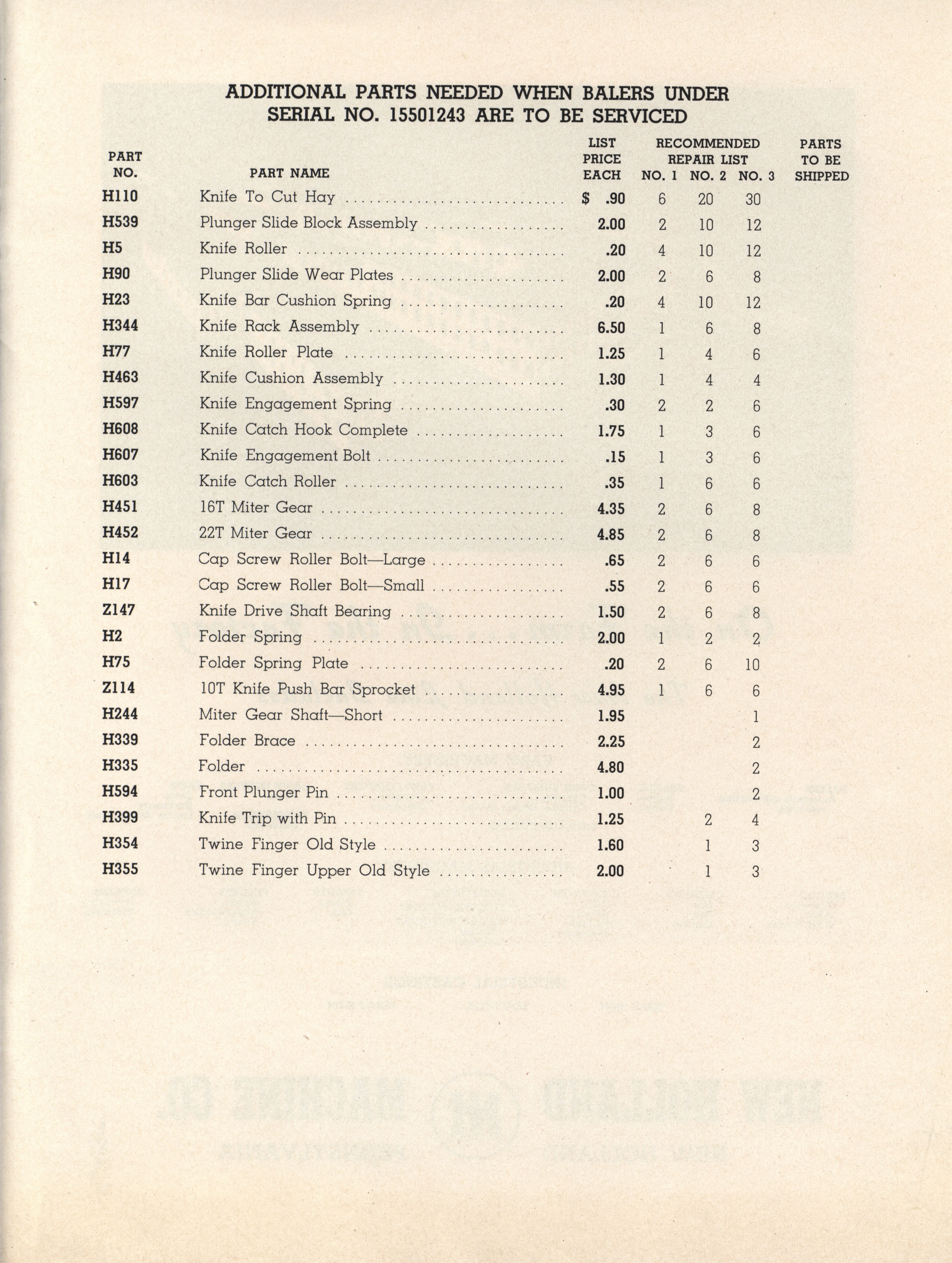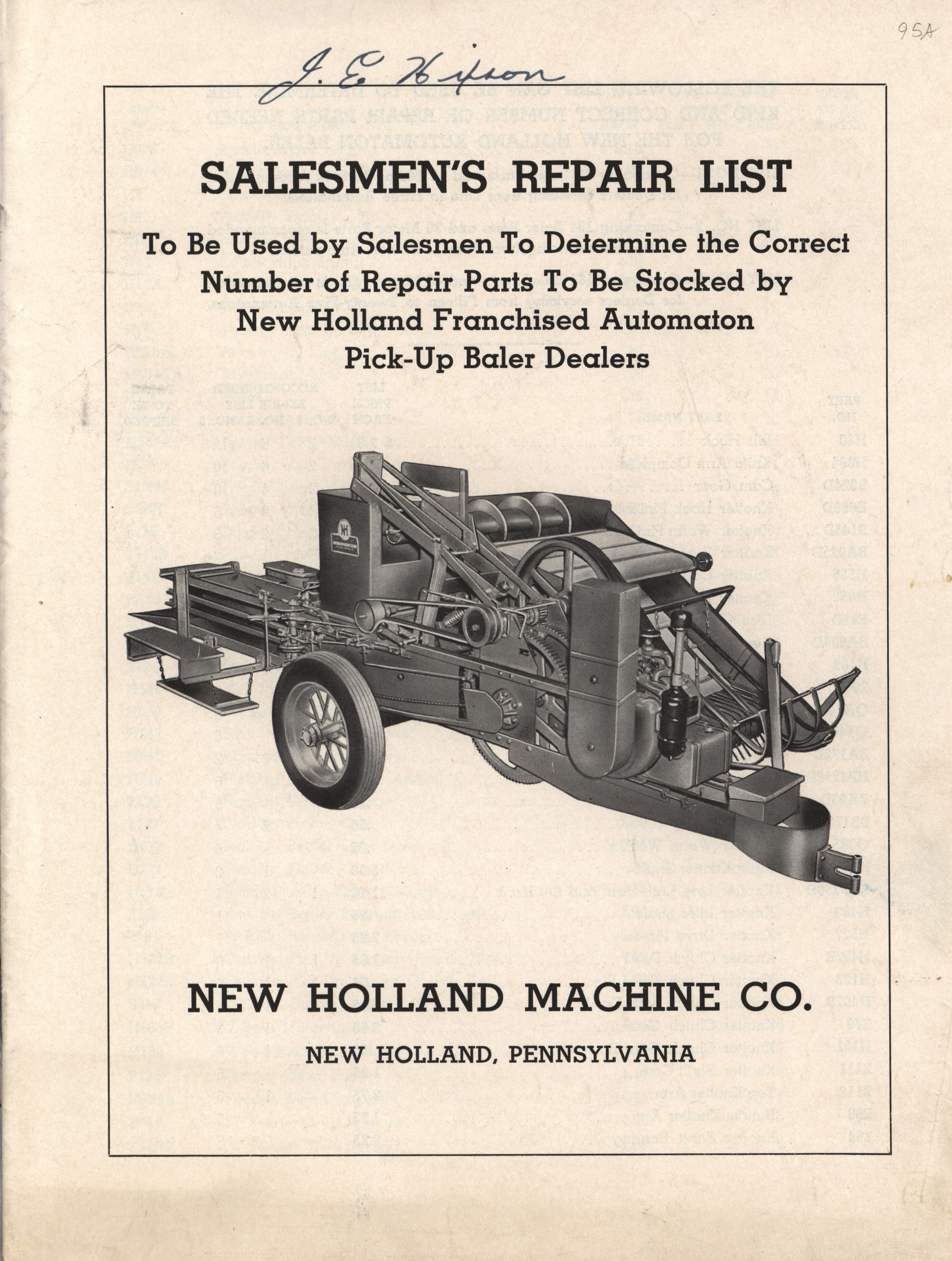 - Illustrated price list for repairs from the New Holland Machine Company.