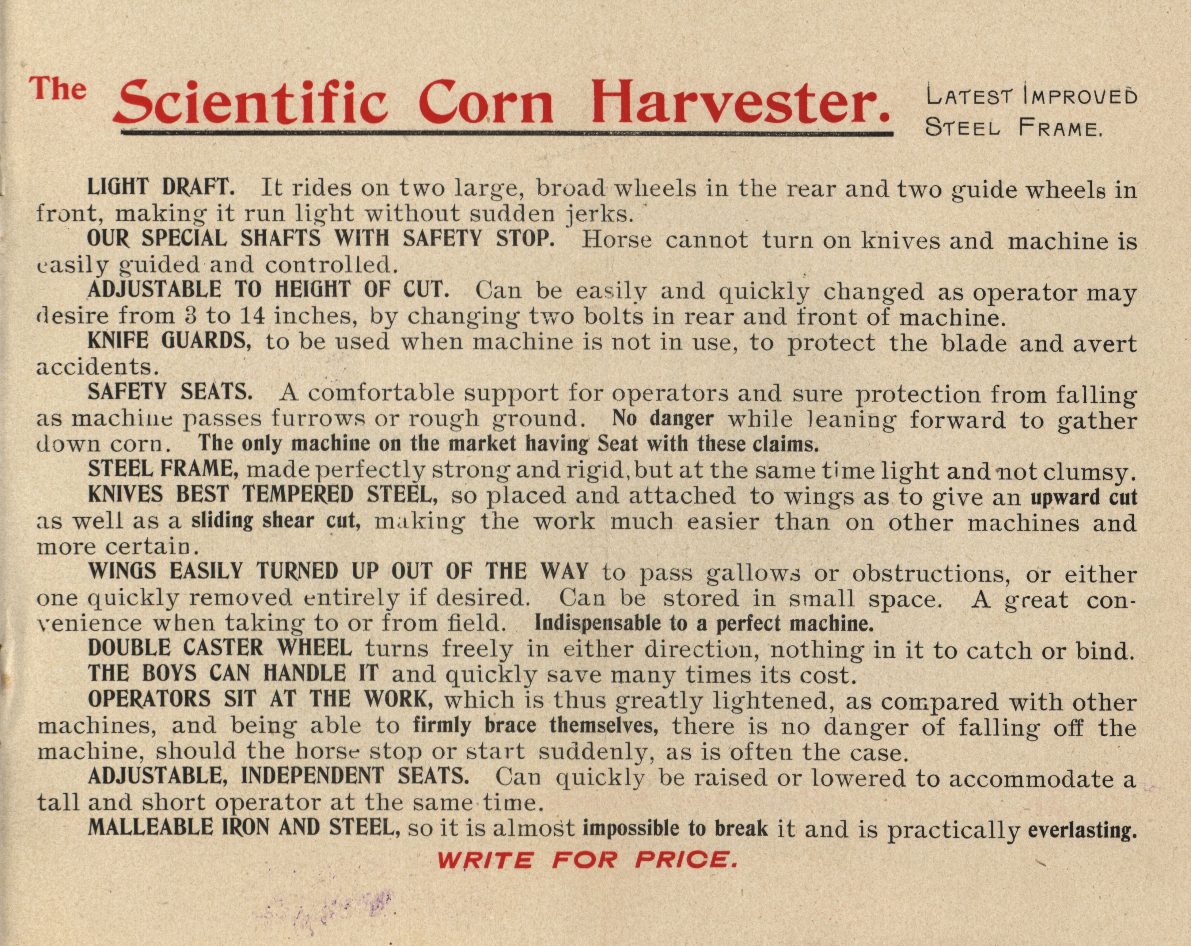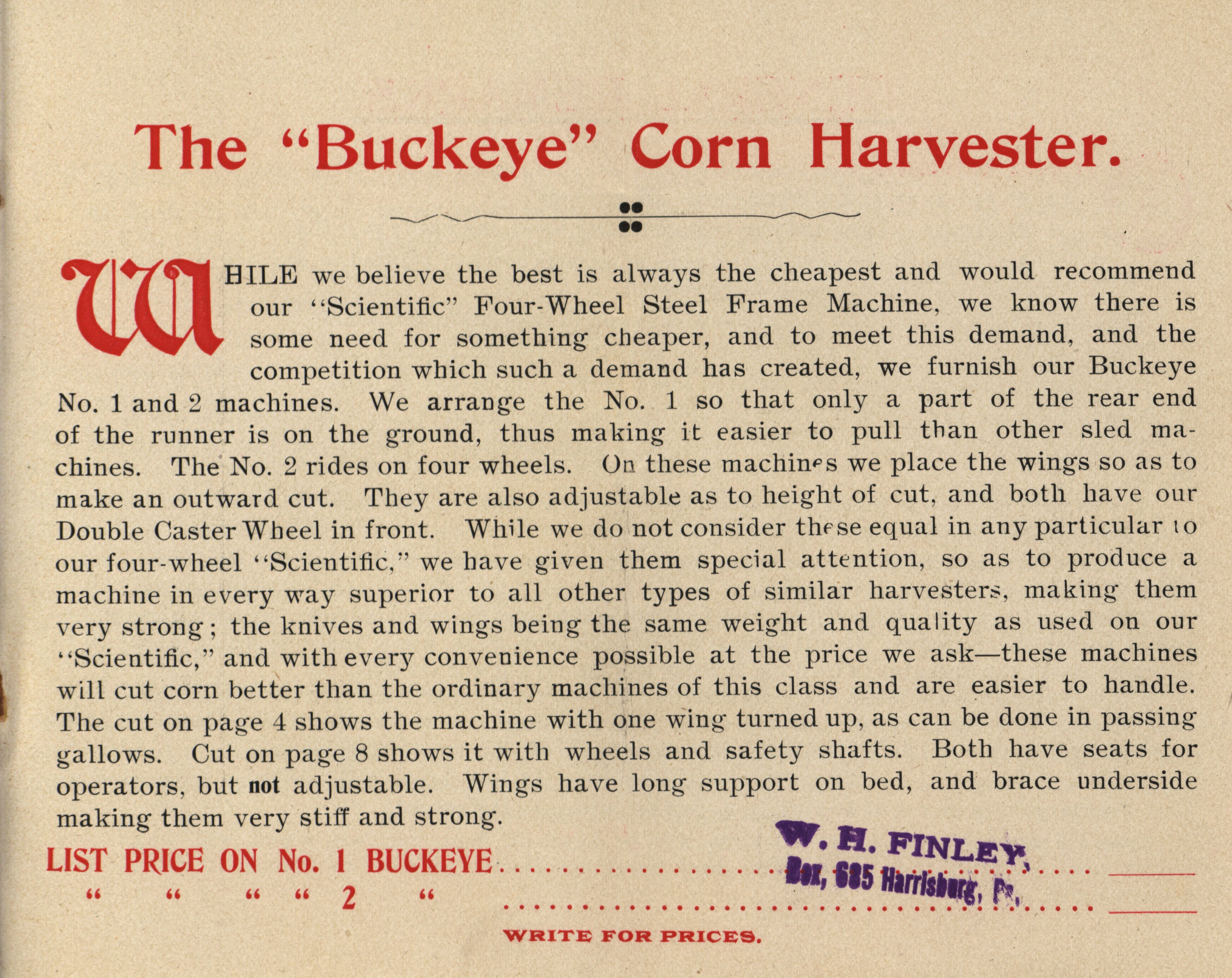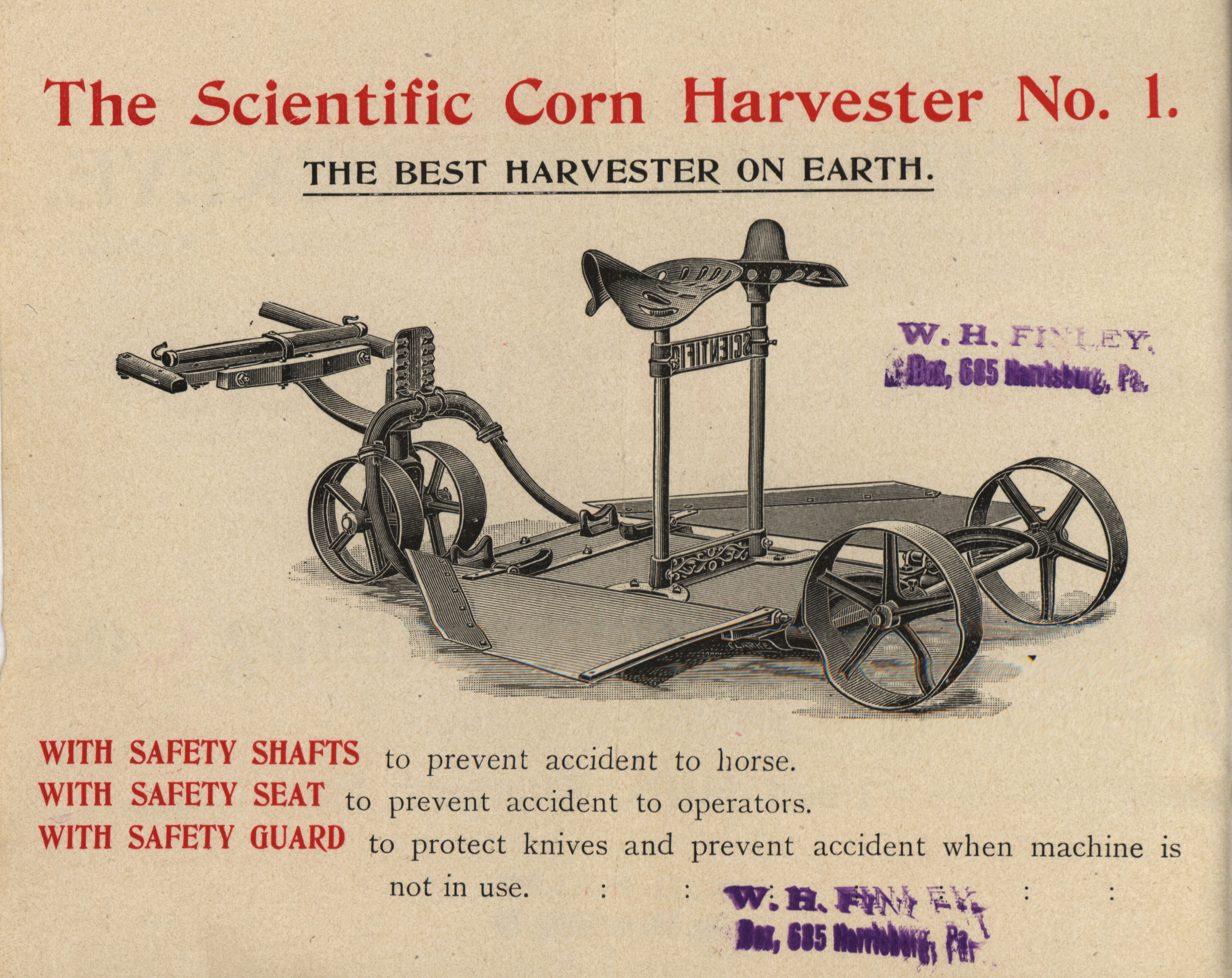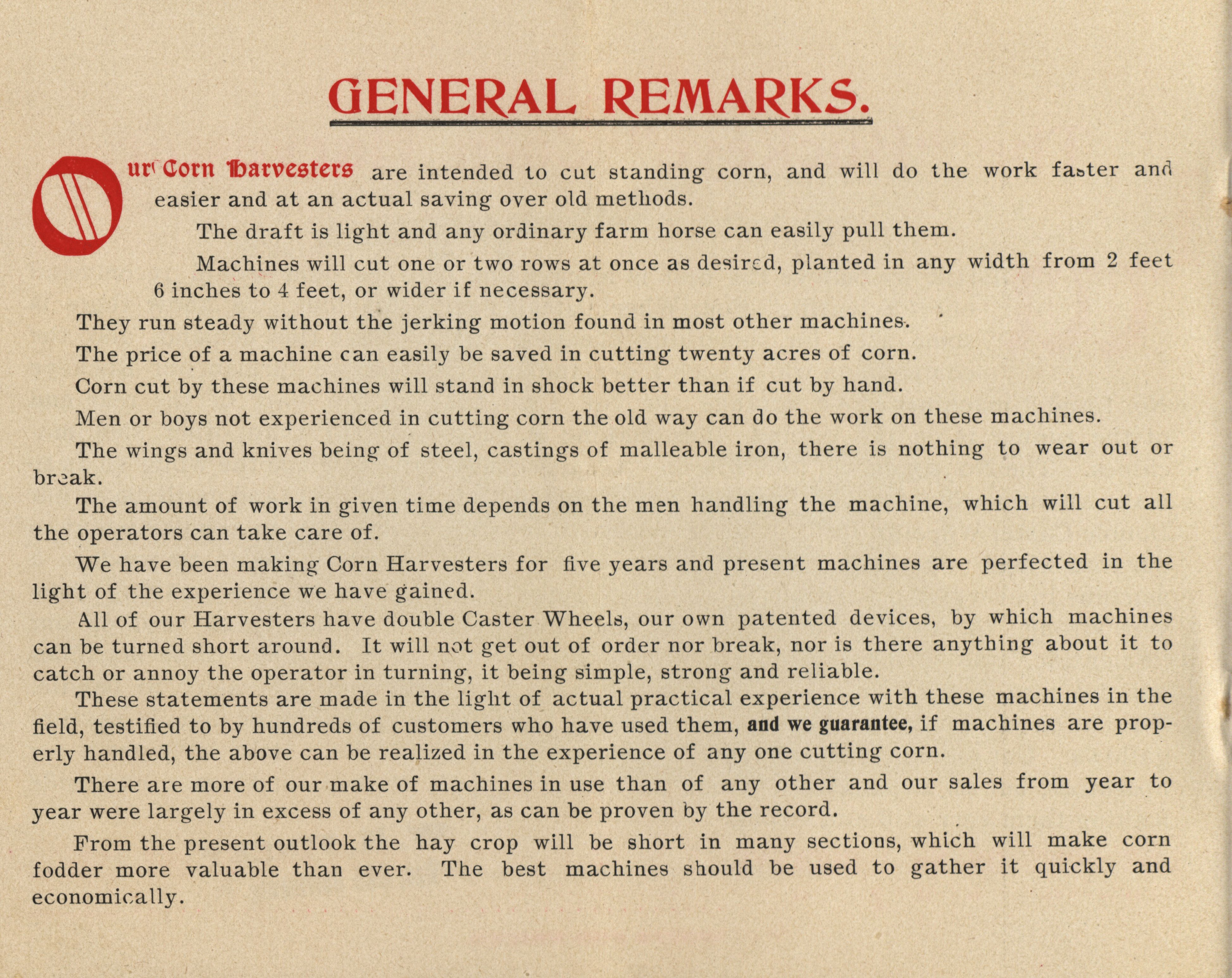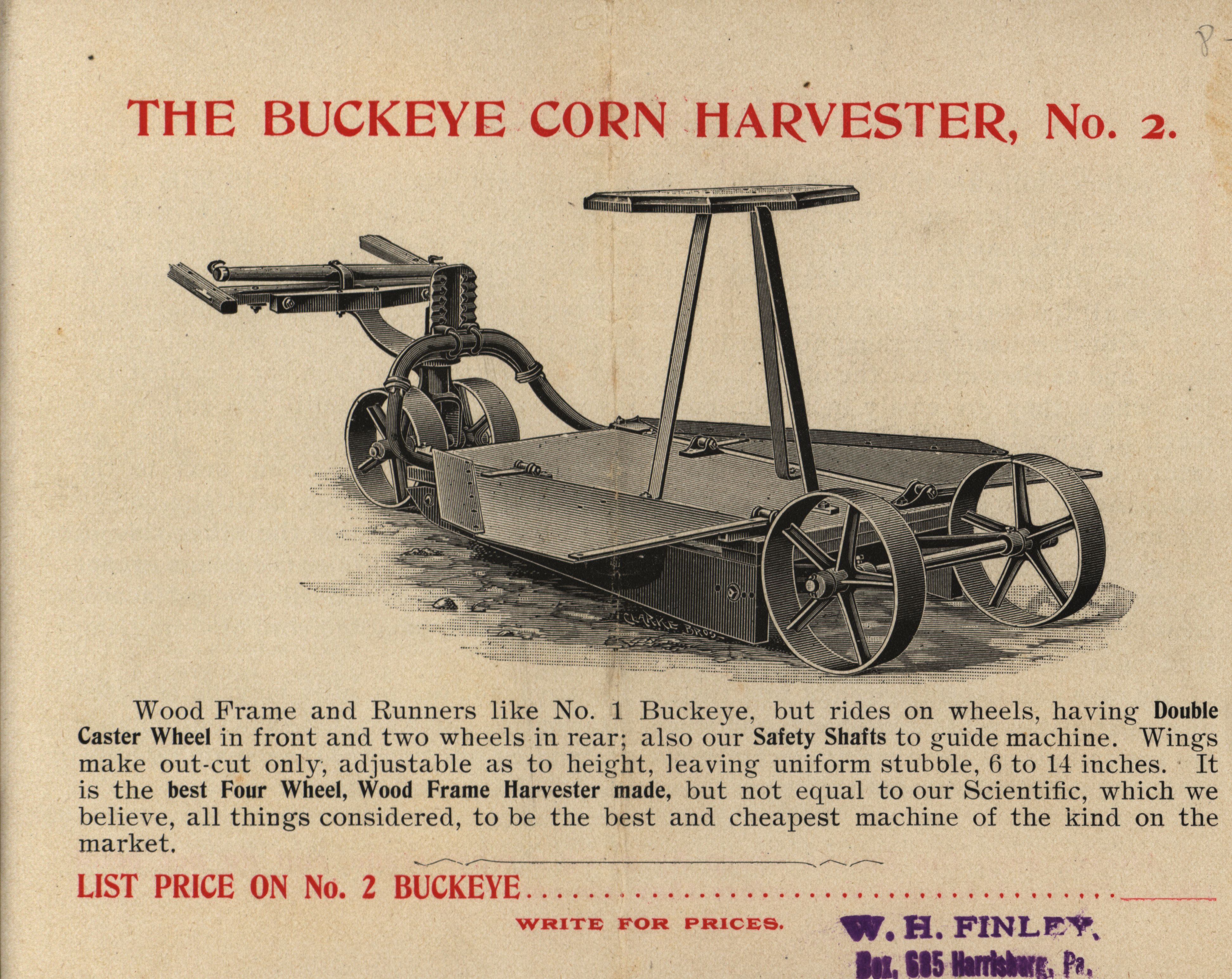 - Illustrated catalog describing the corn harvesters offered by The Food Manufacturing Company in 1896.