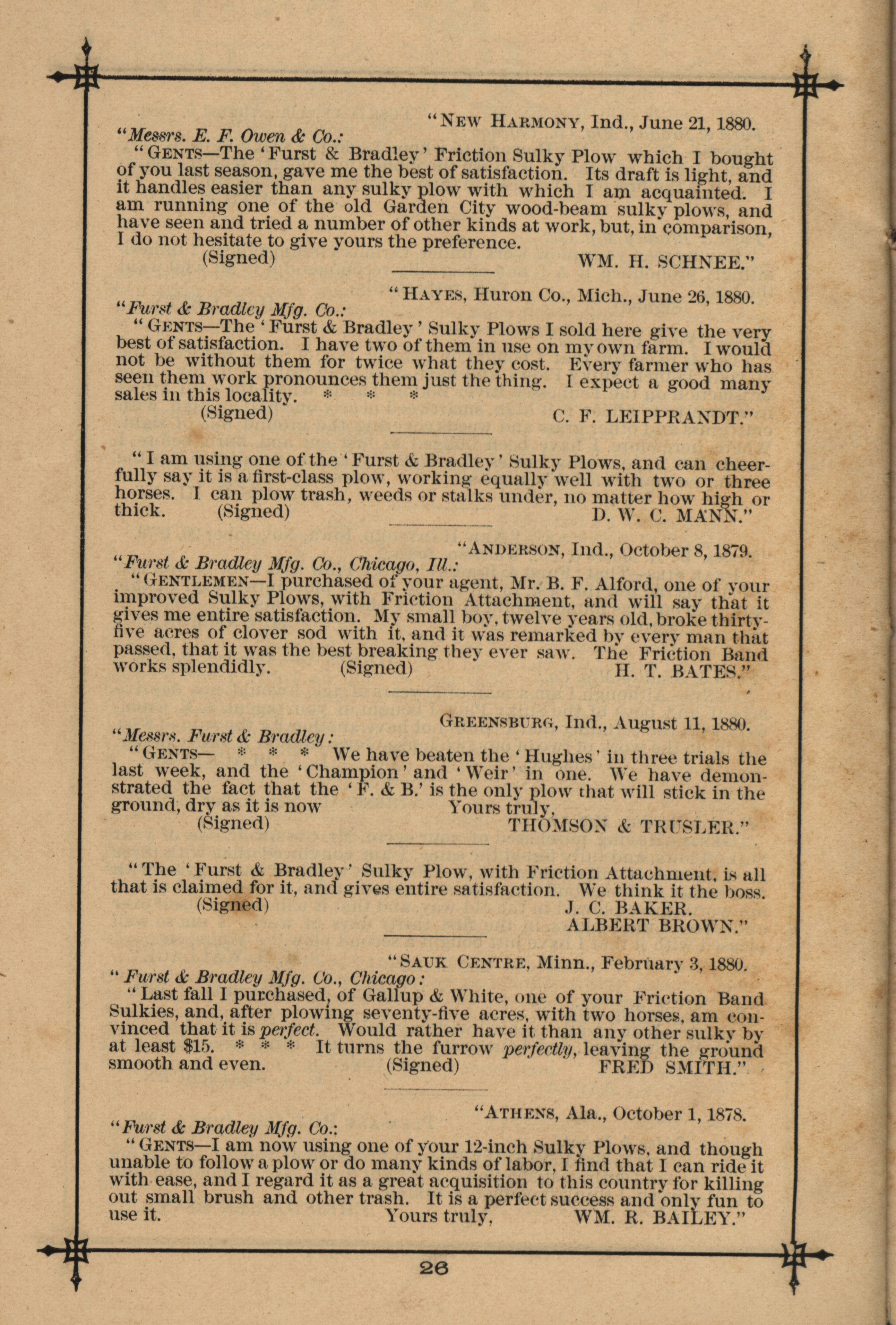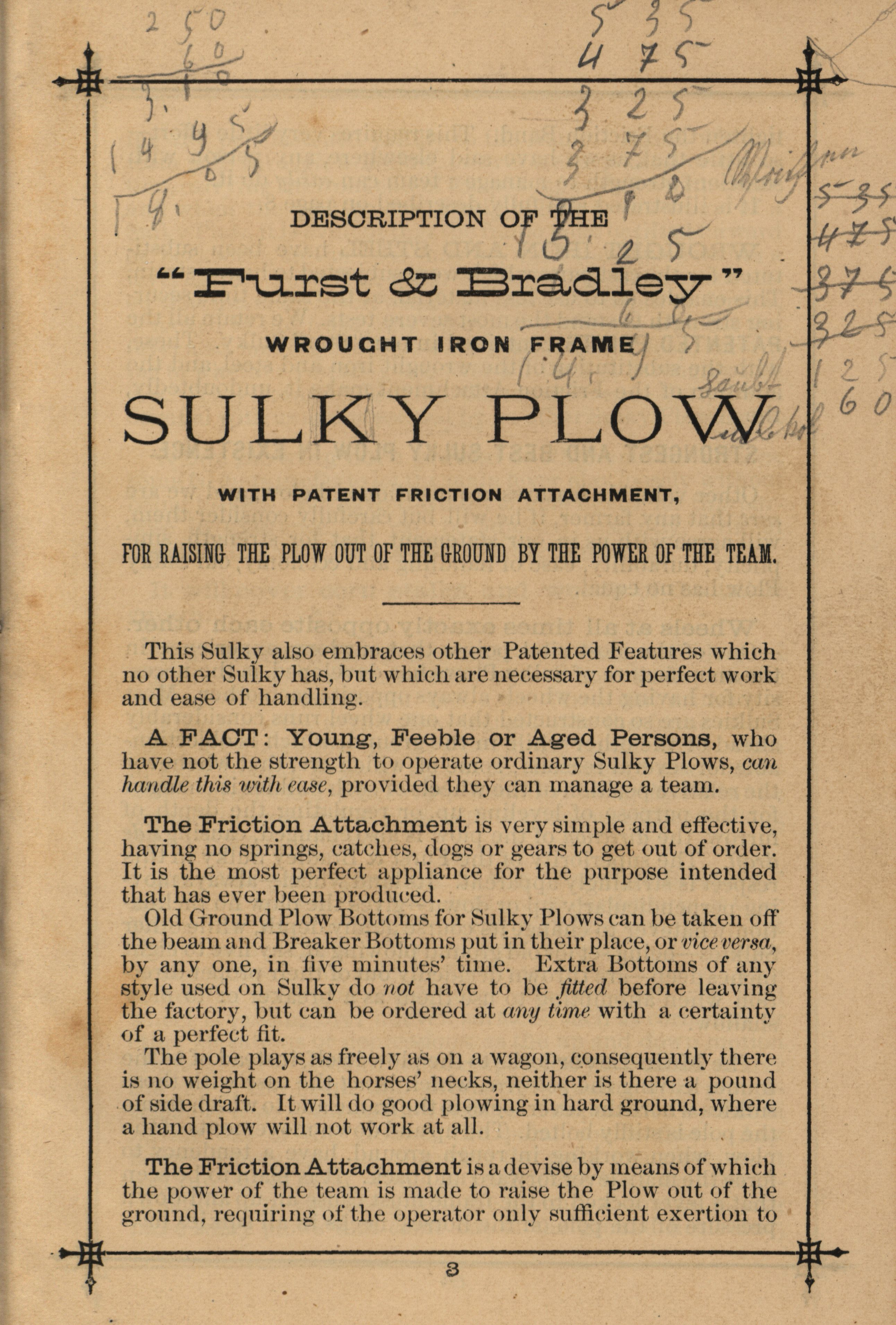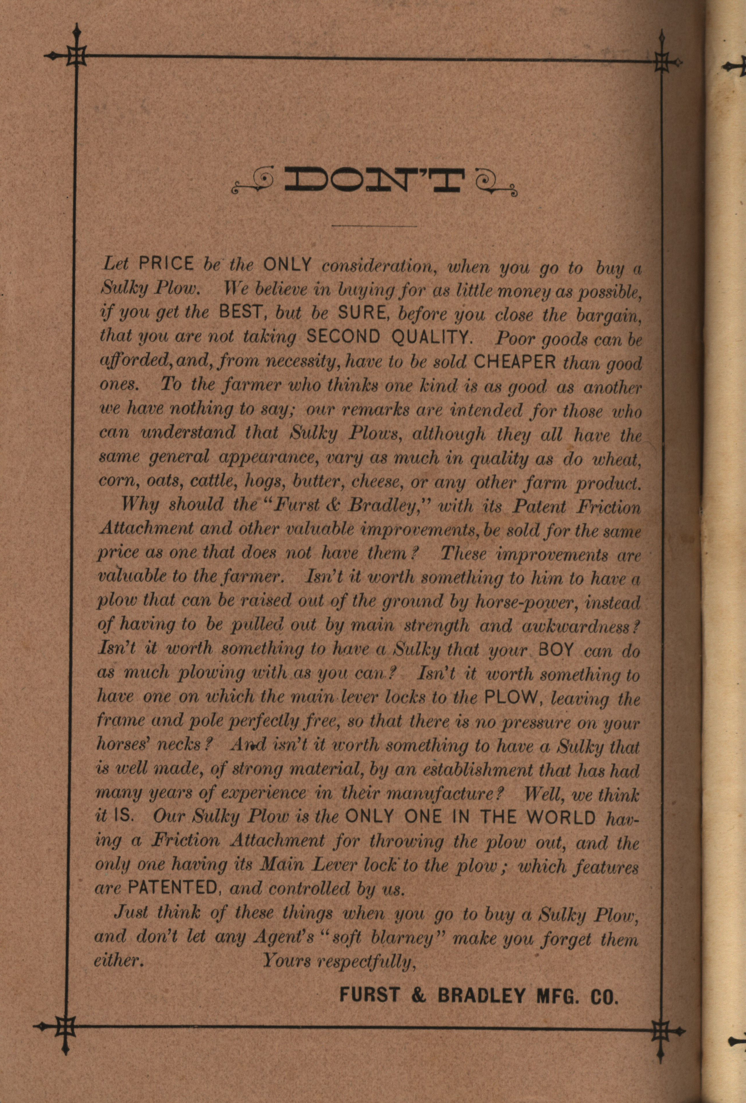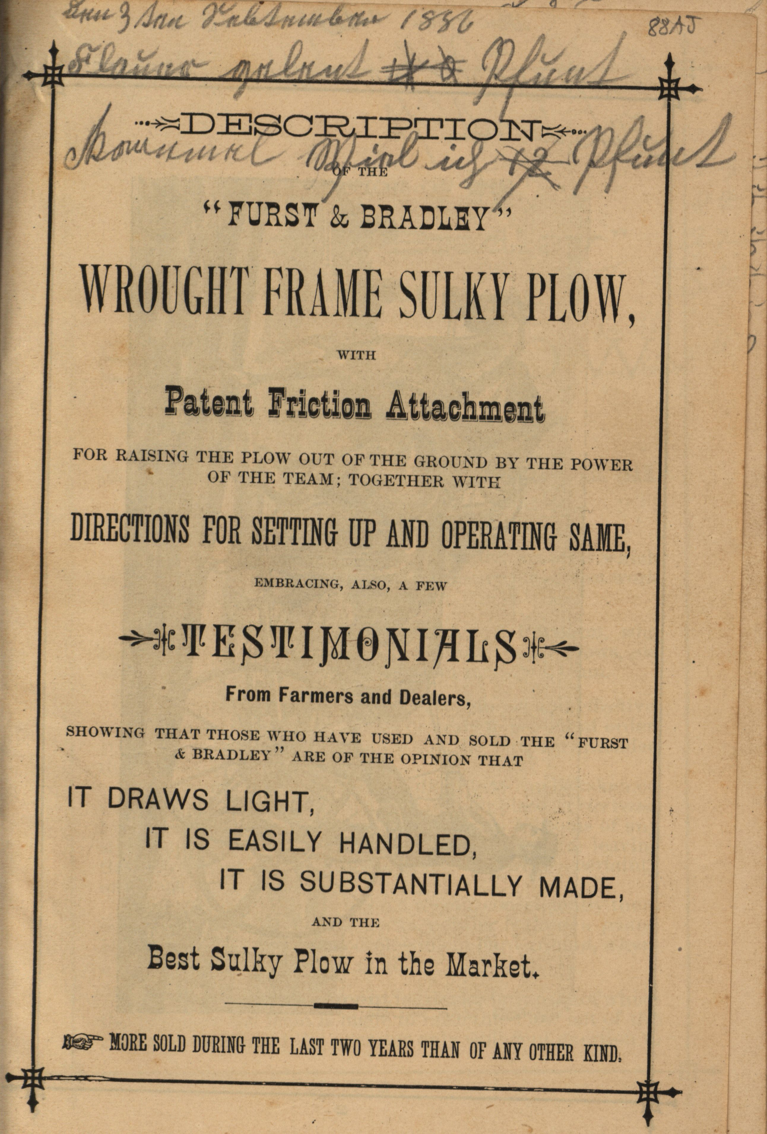 - Illustrated catalog describing the agricultural implements offered by the Furst and Bradley Manufacturing Company in 1886.