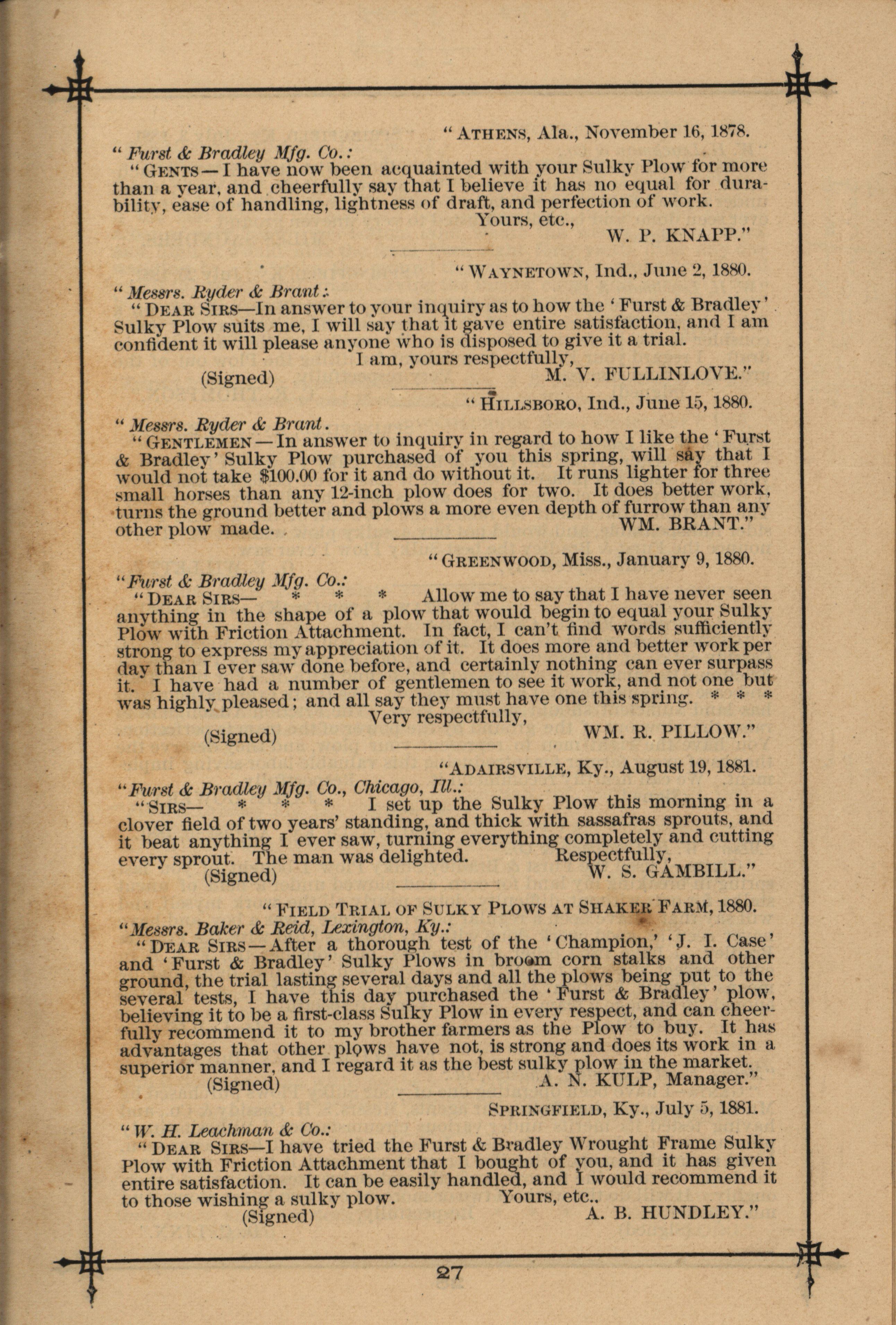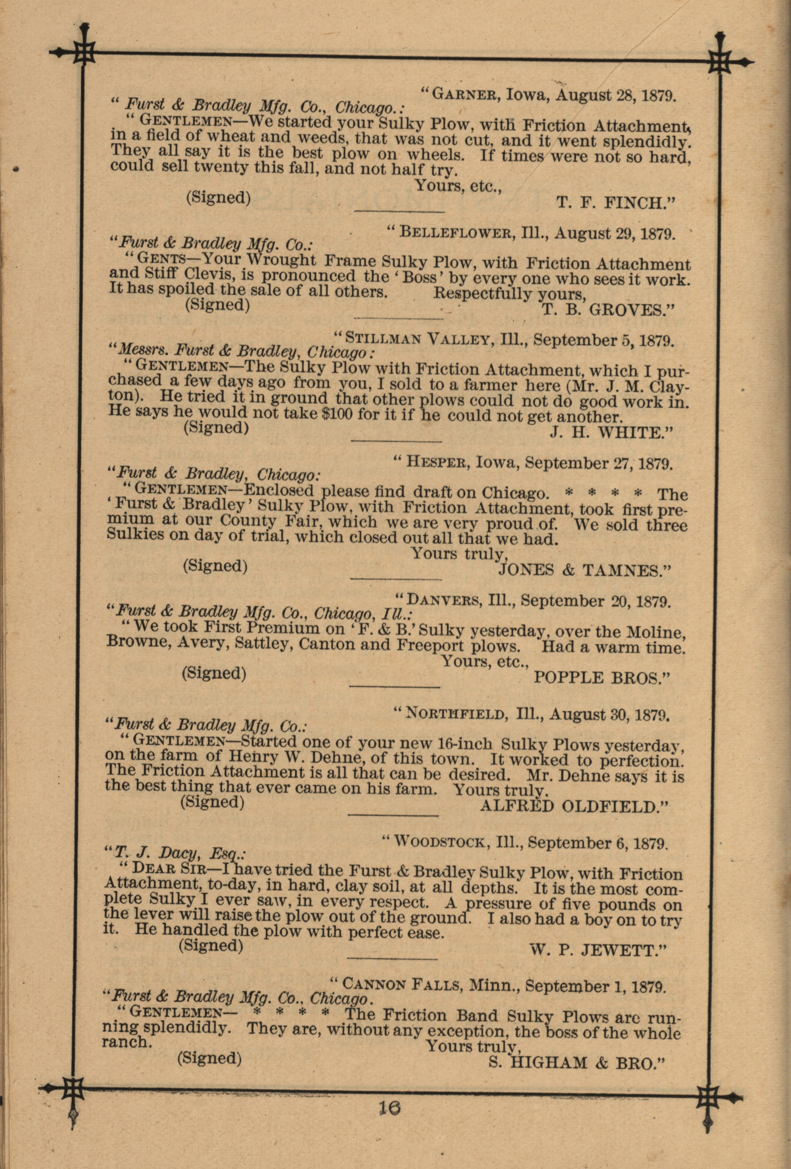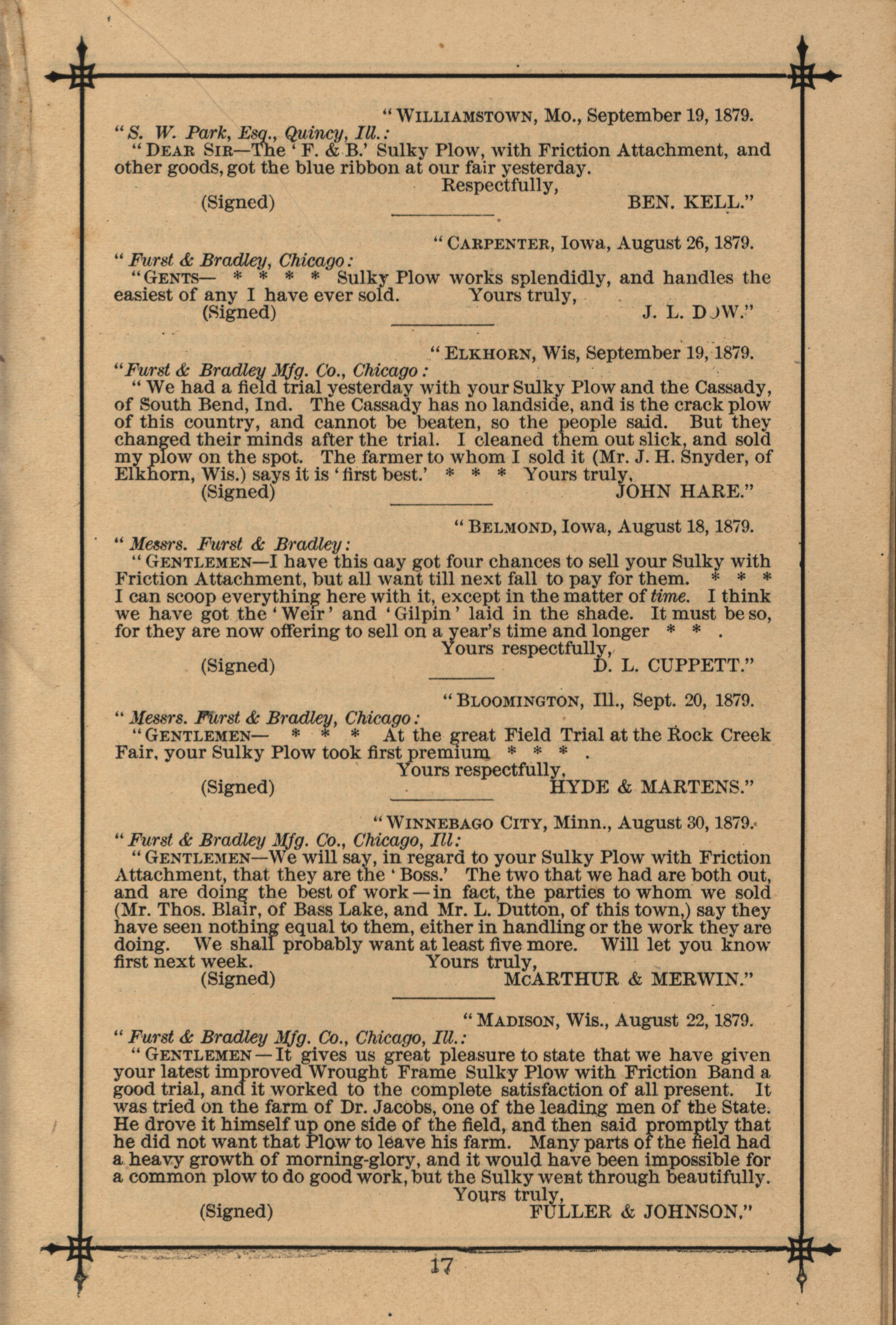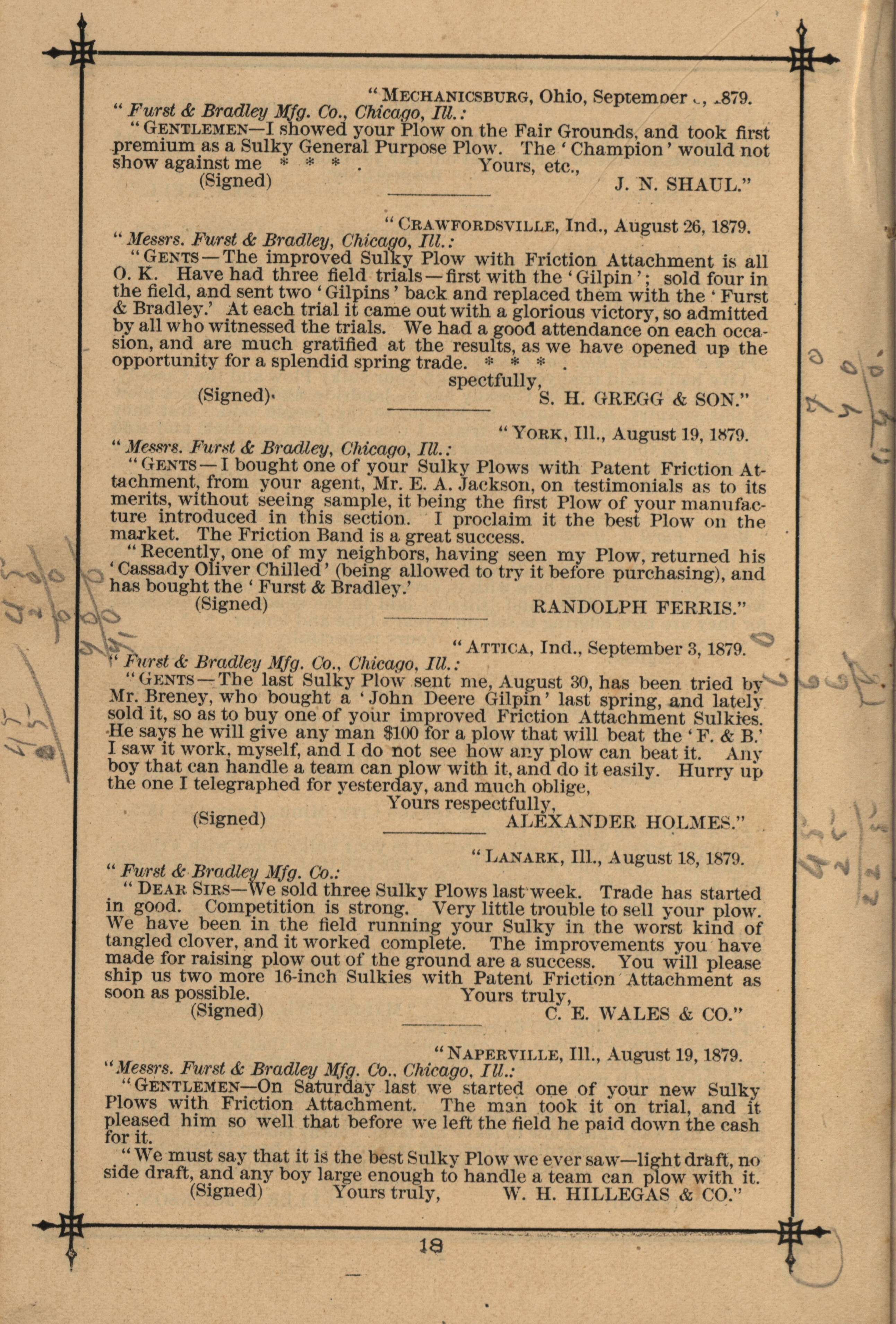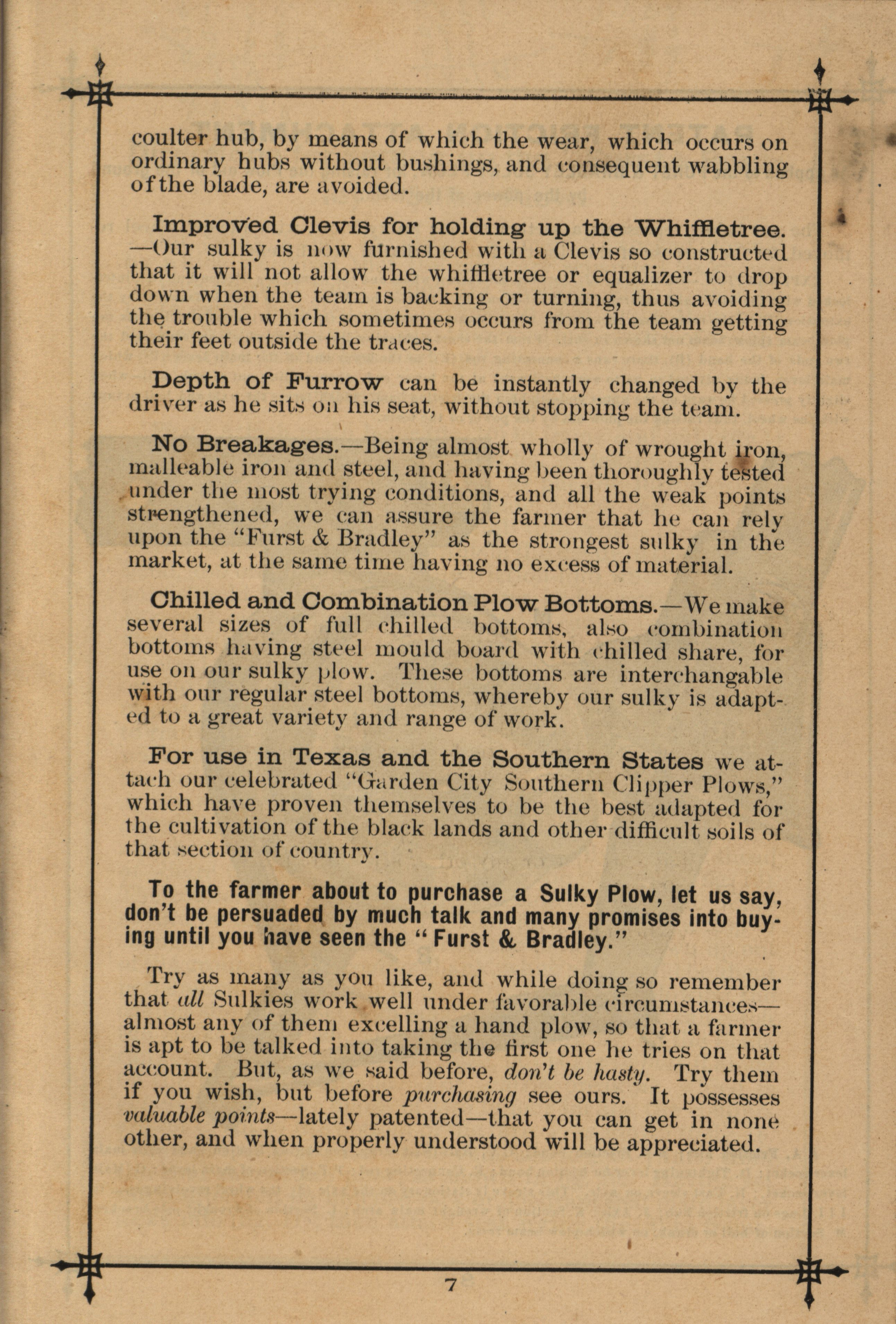 - Illustrated catalog describing the agricultural implements offered by the Furst and Bradley Manufacturing Company in 1886.