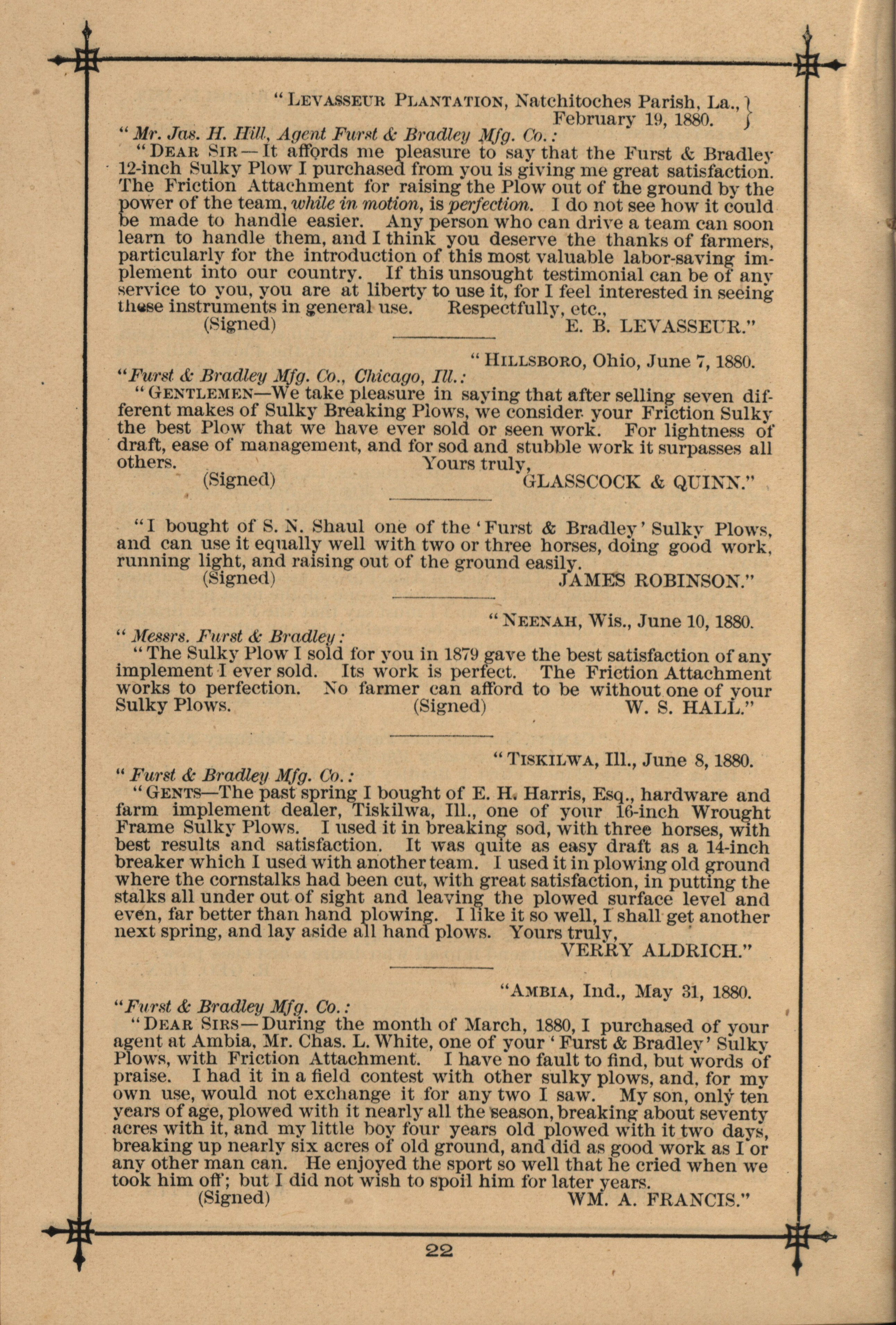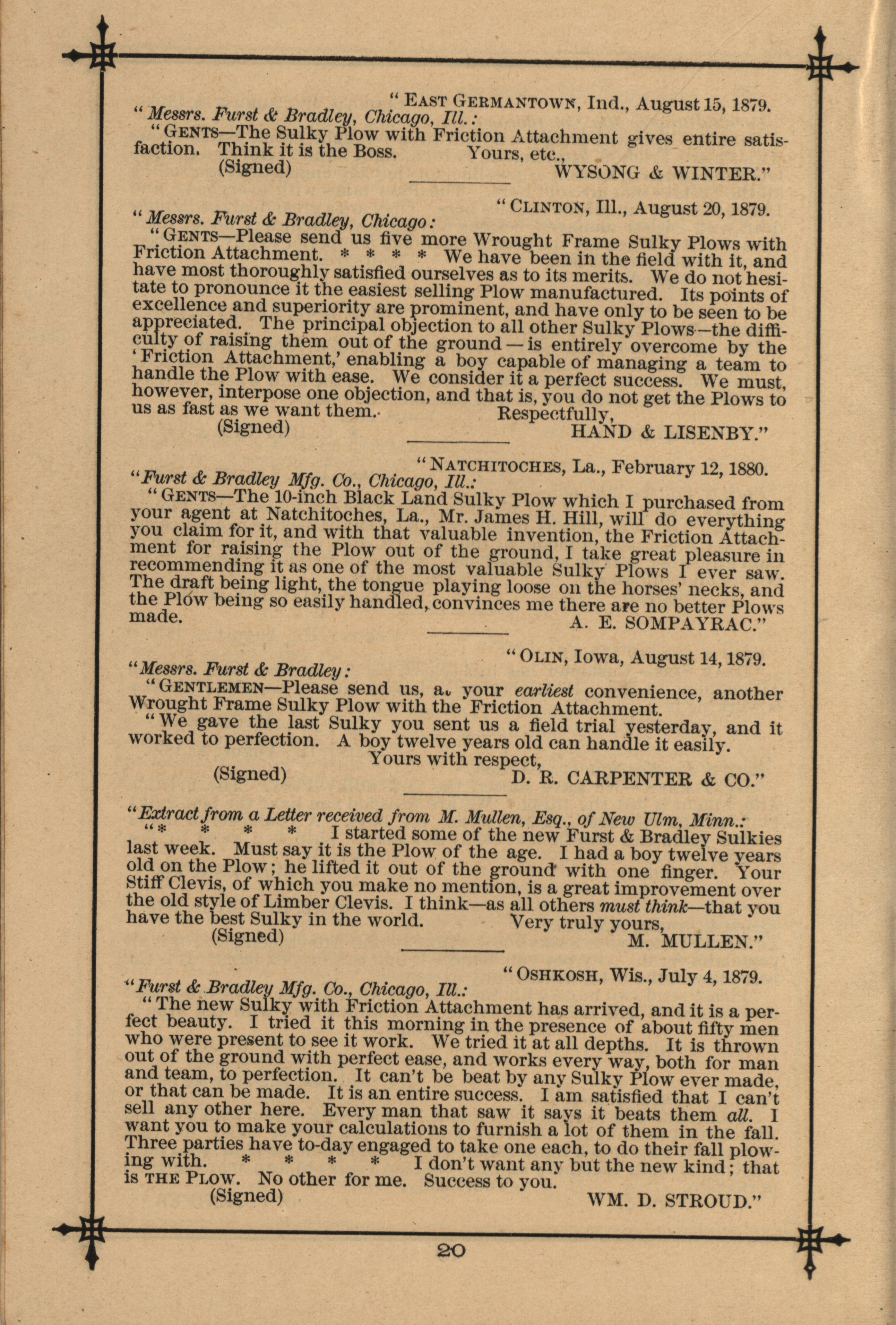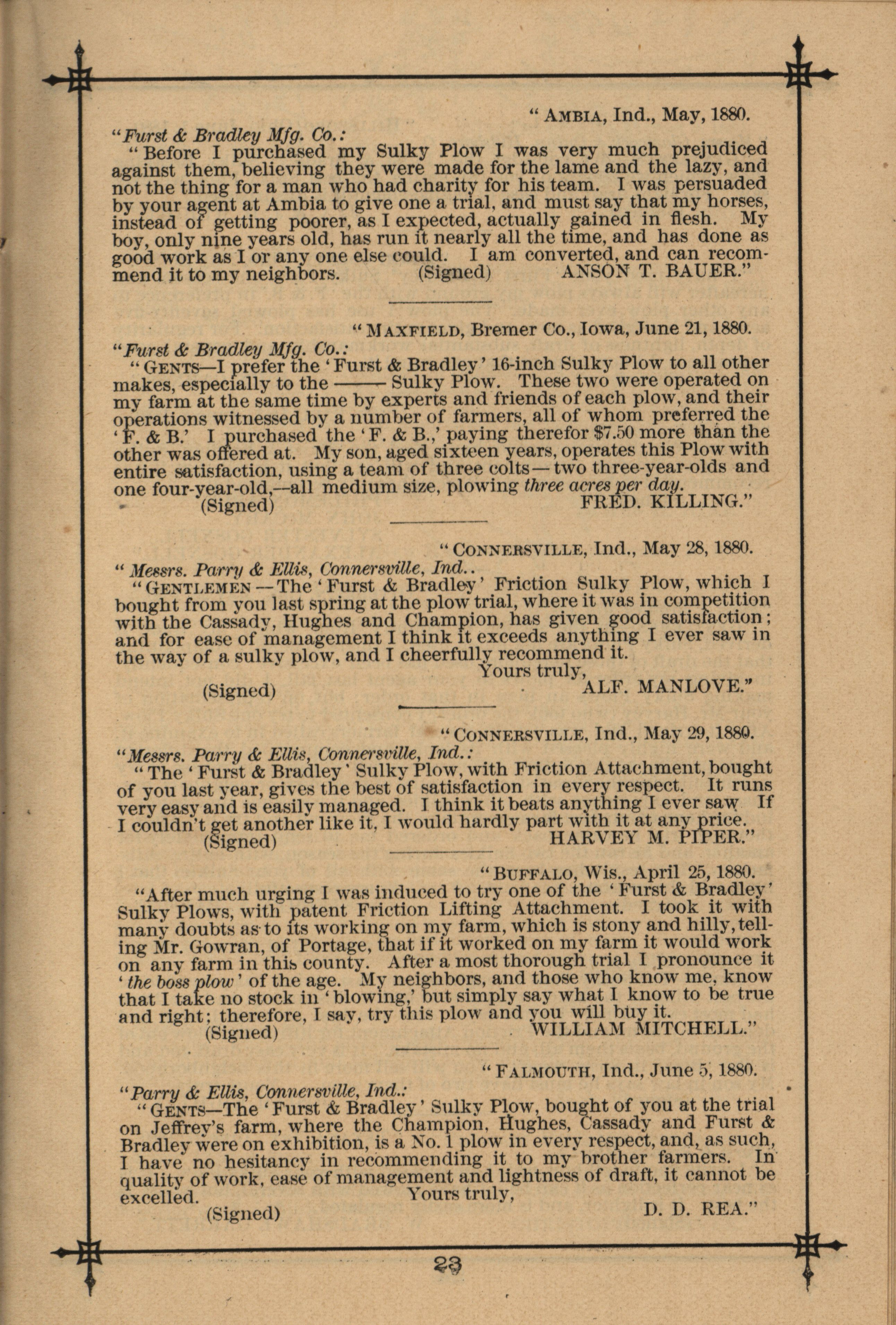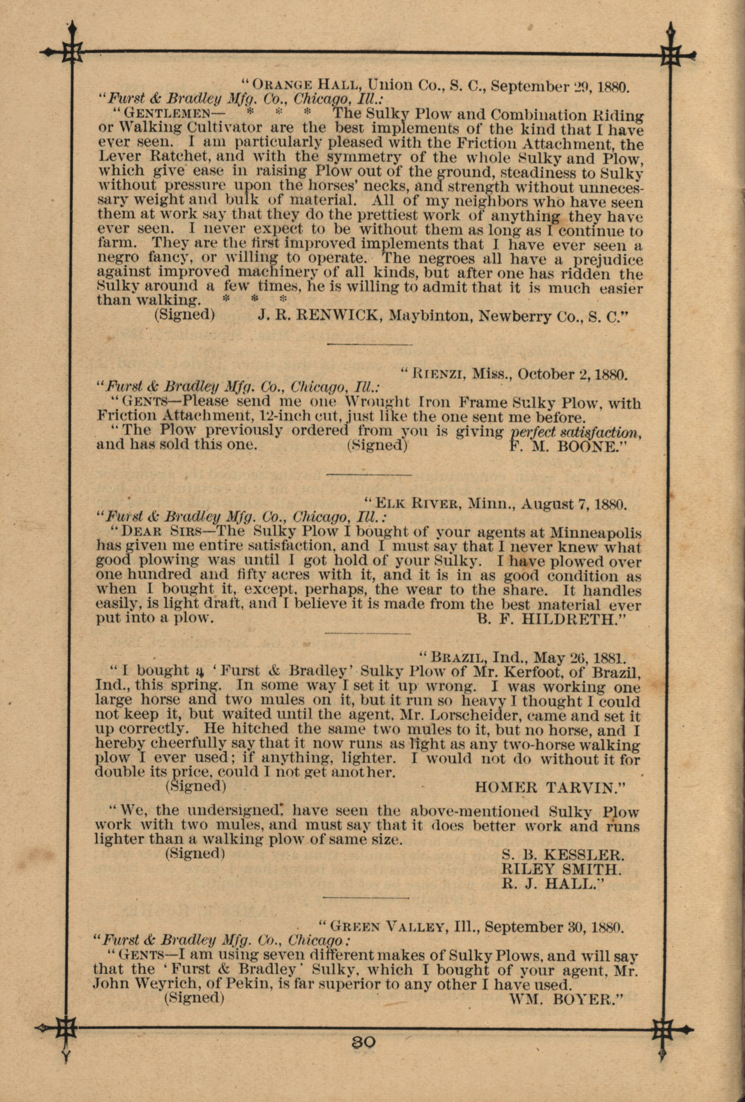 - Illustrated catalog describing the agricultural implements offered by the Furst and Bradley Manufacturing Company in 1886.