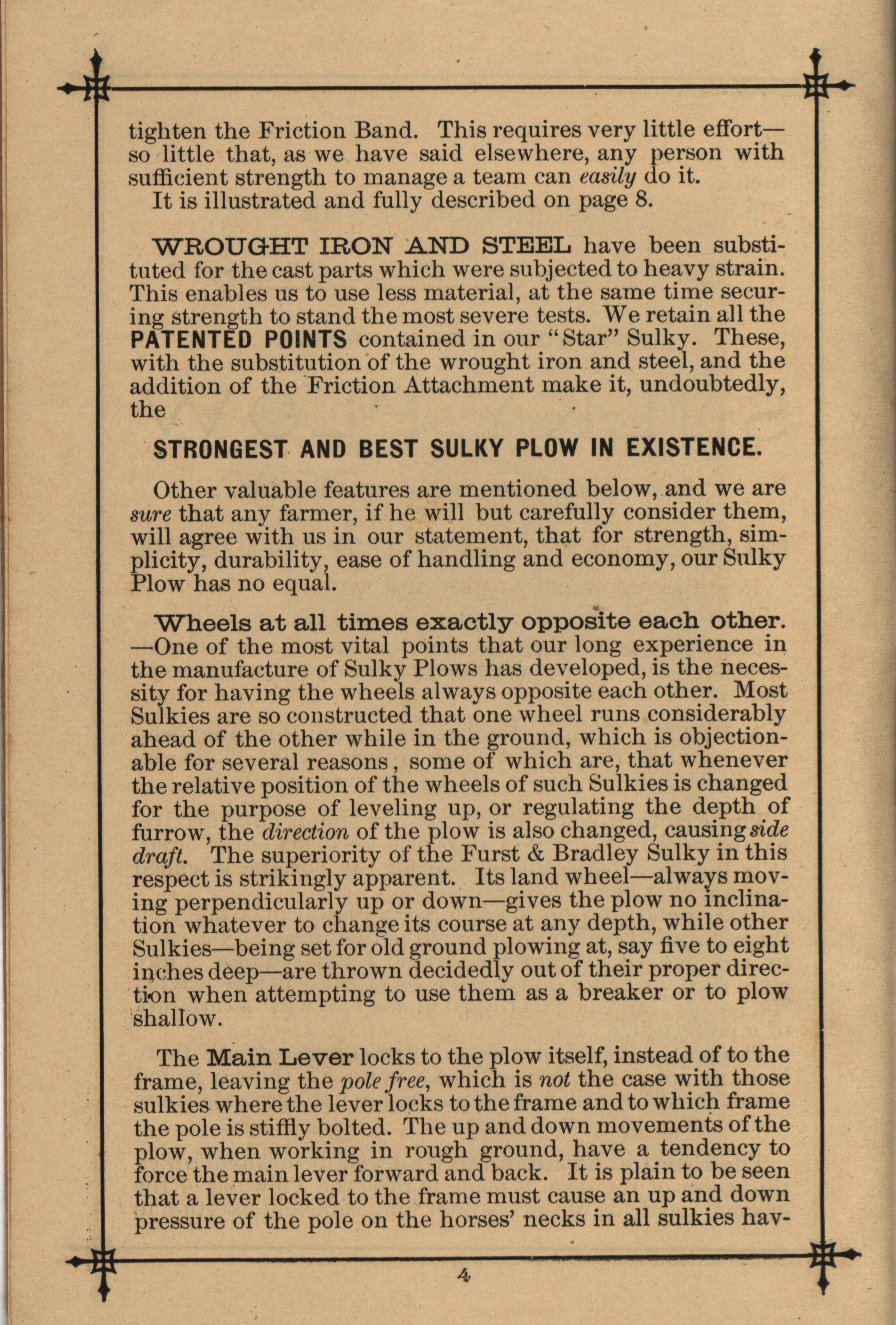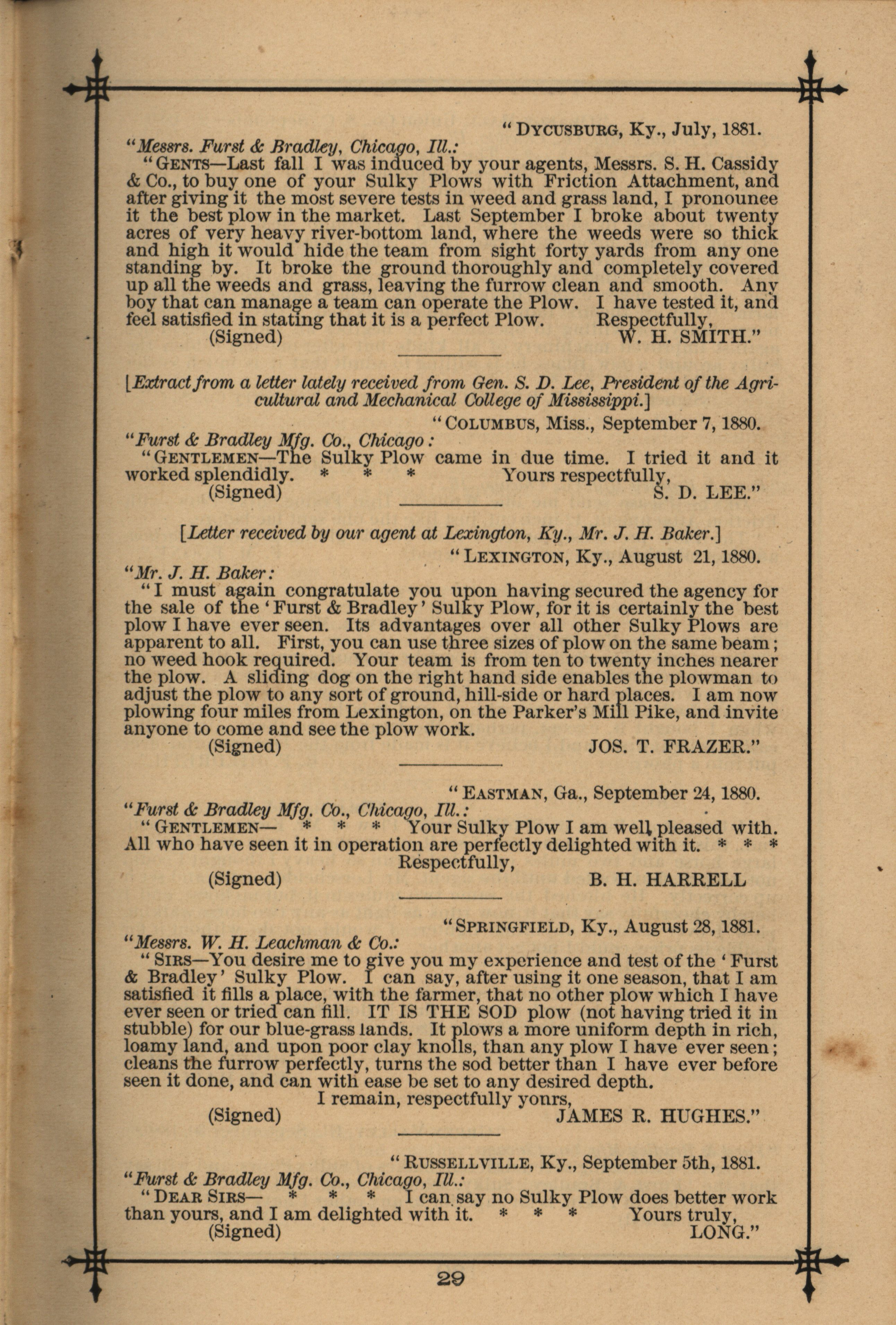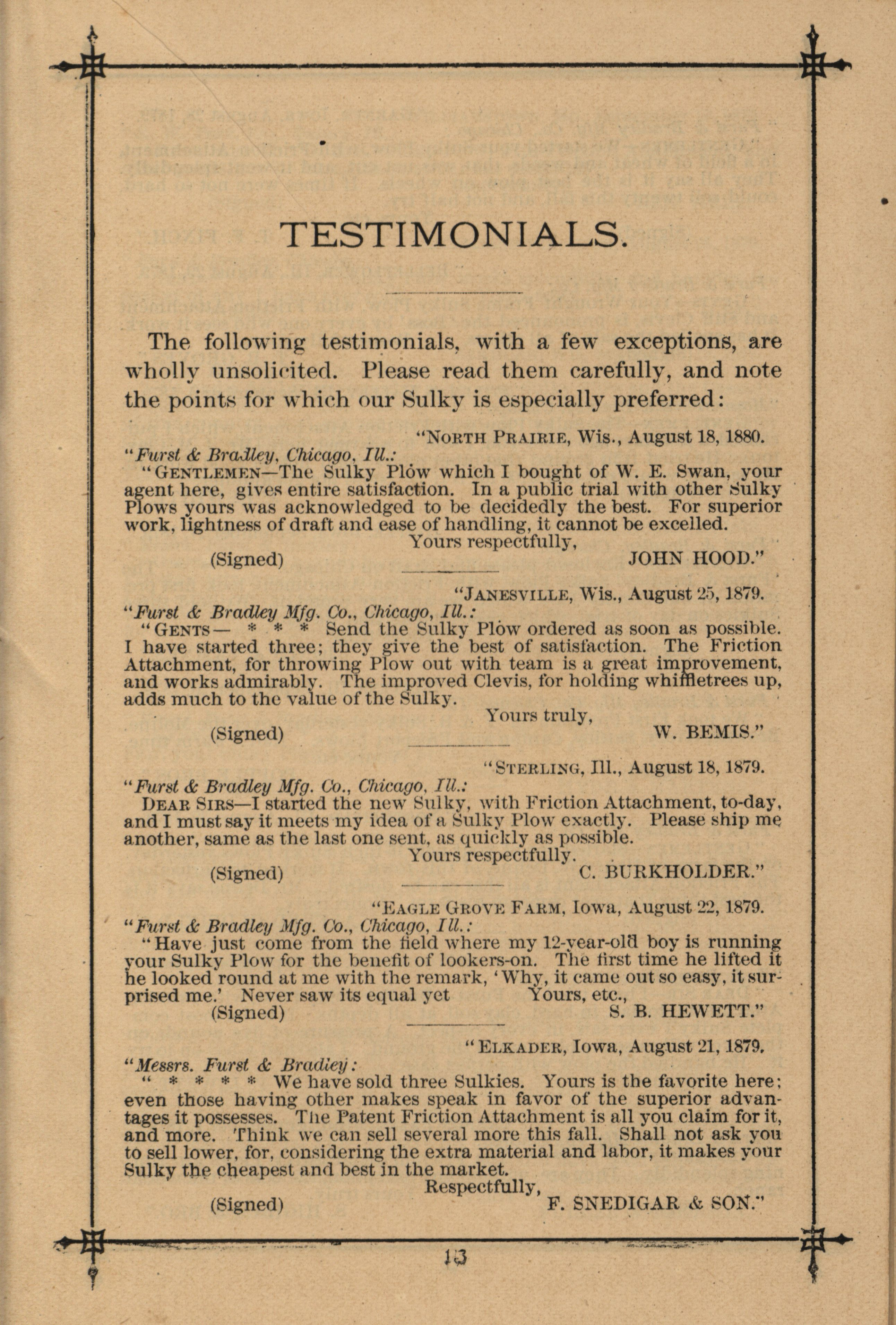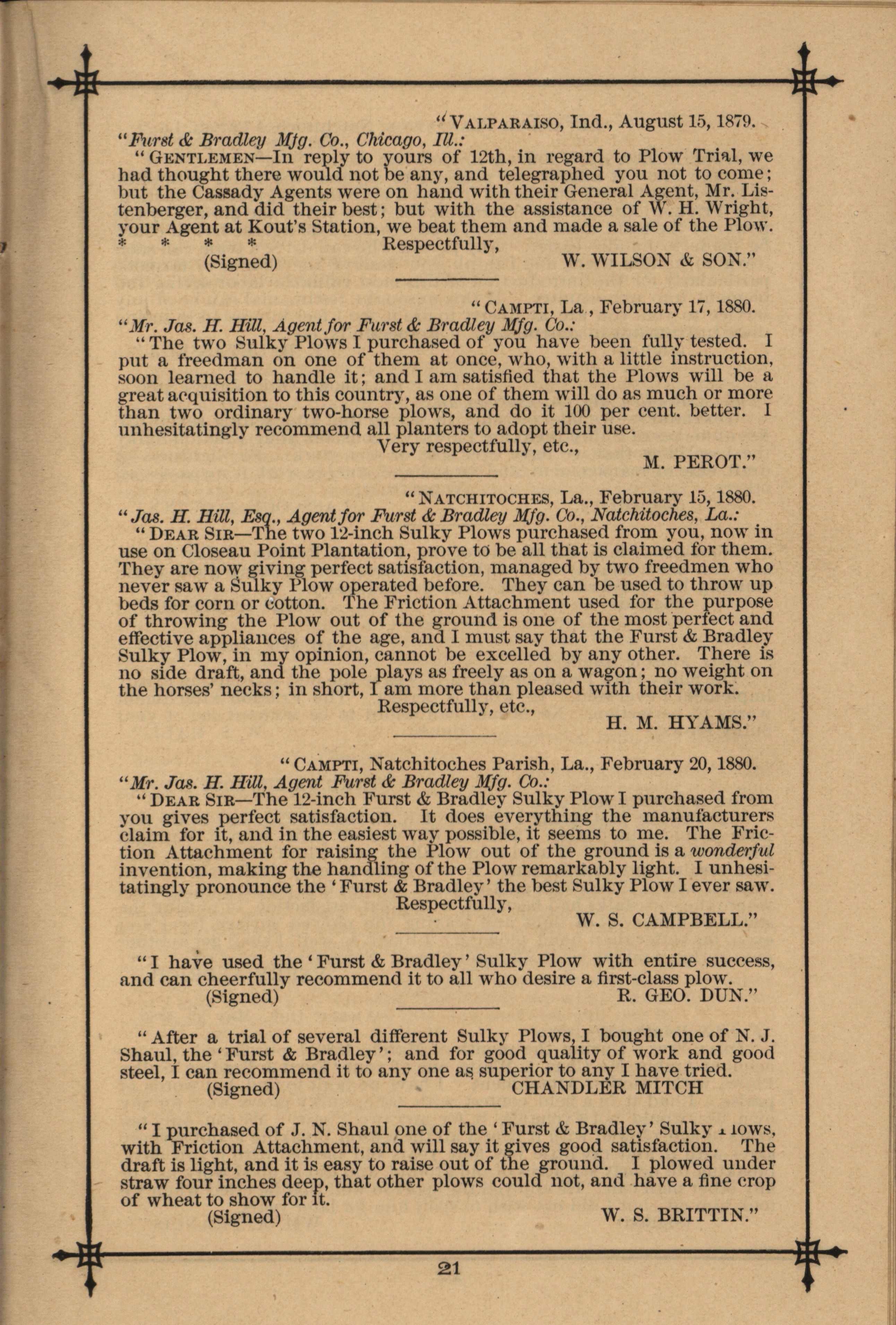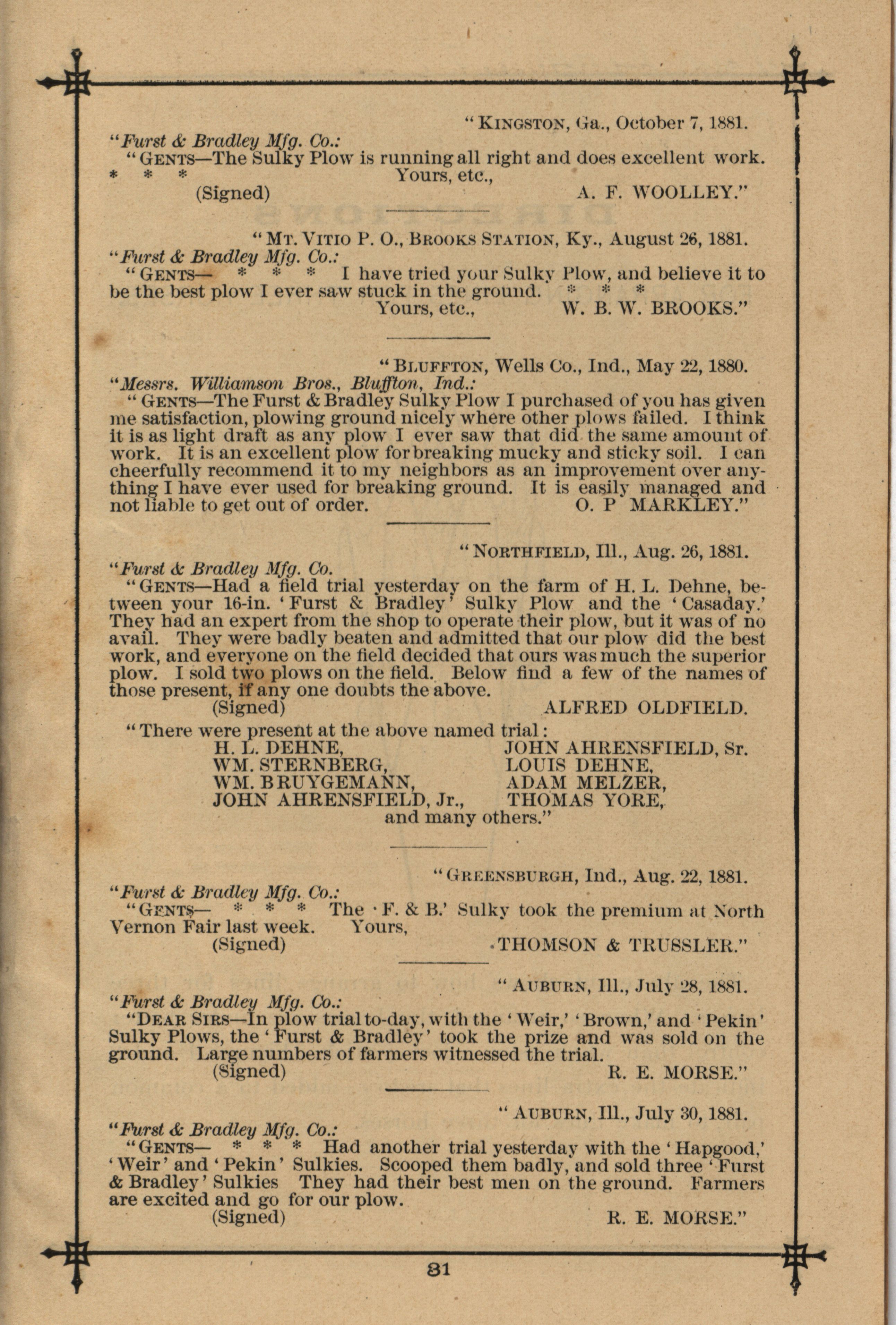 - Illustrated catalog describing the agricultural implements offered by the Furst and Bradley Manufacturing Company in 1886.