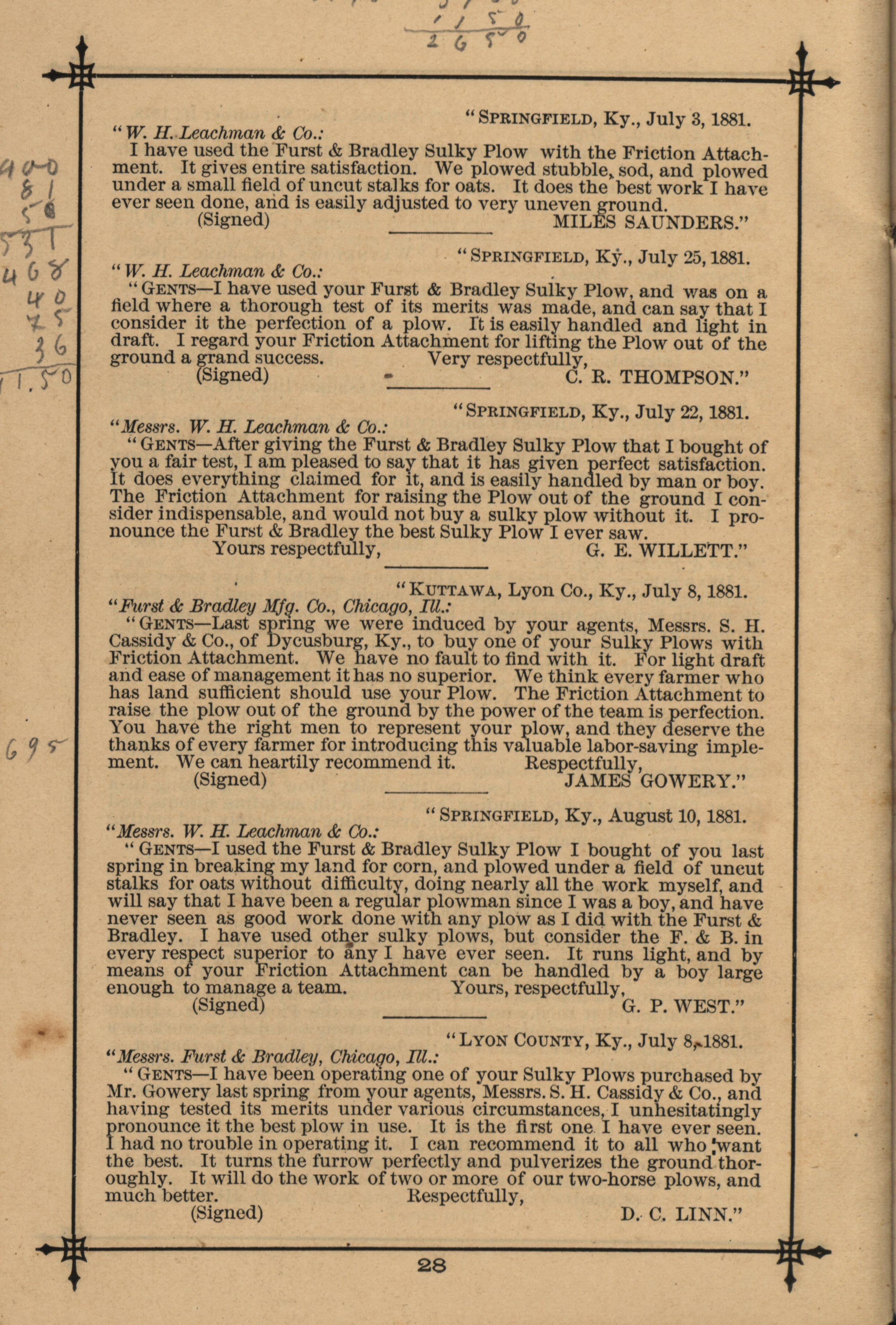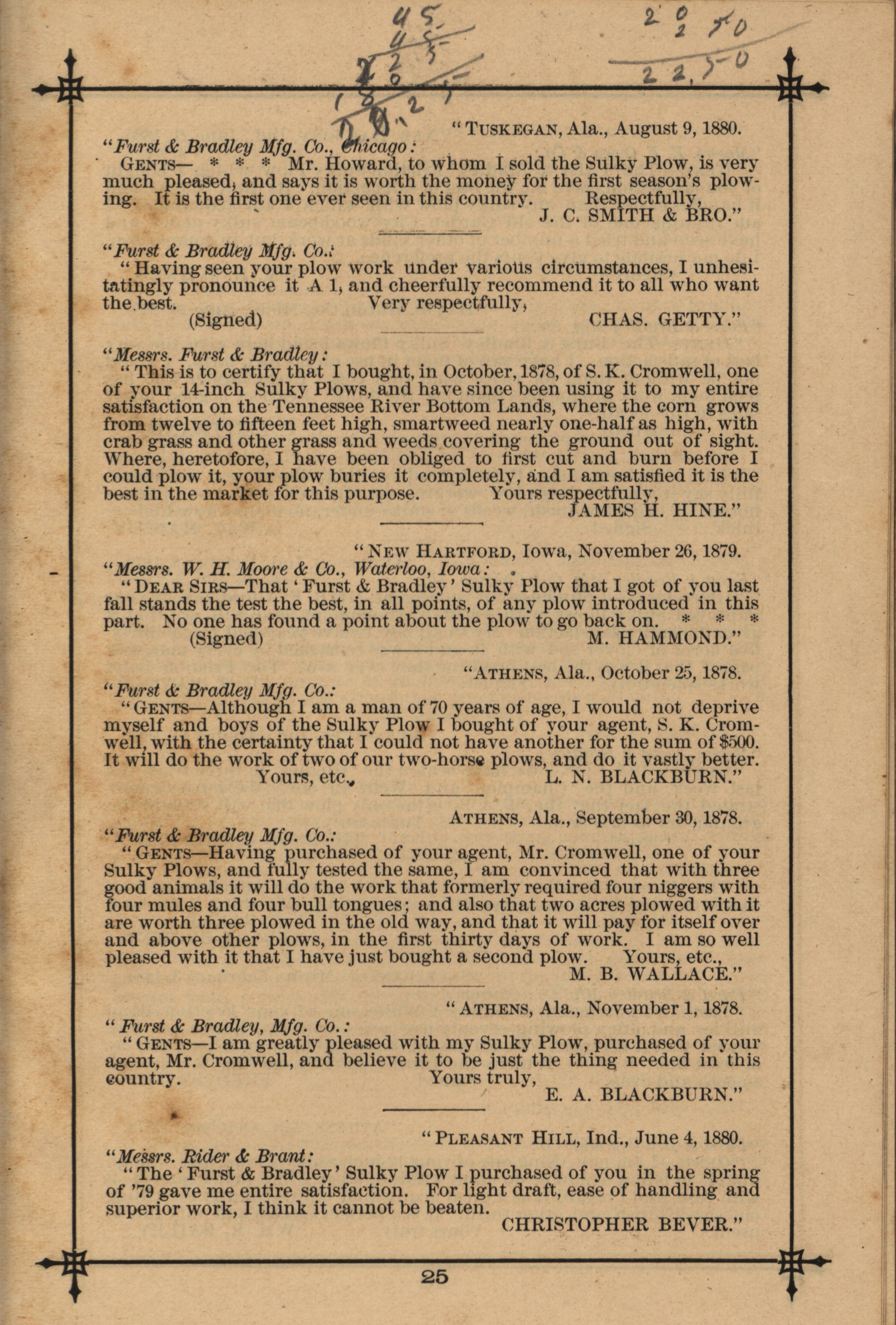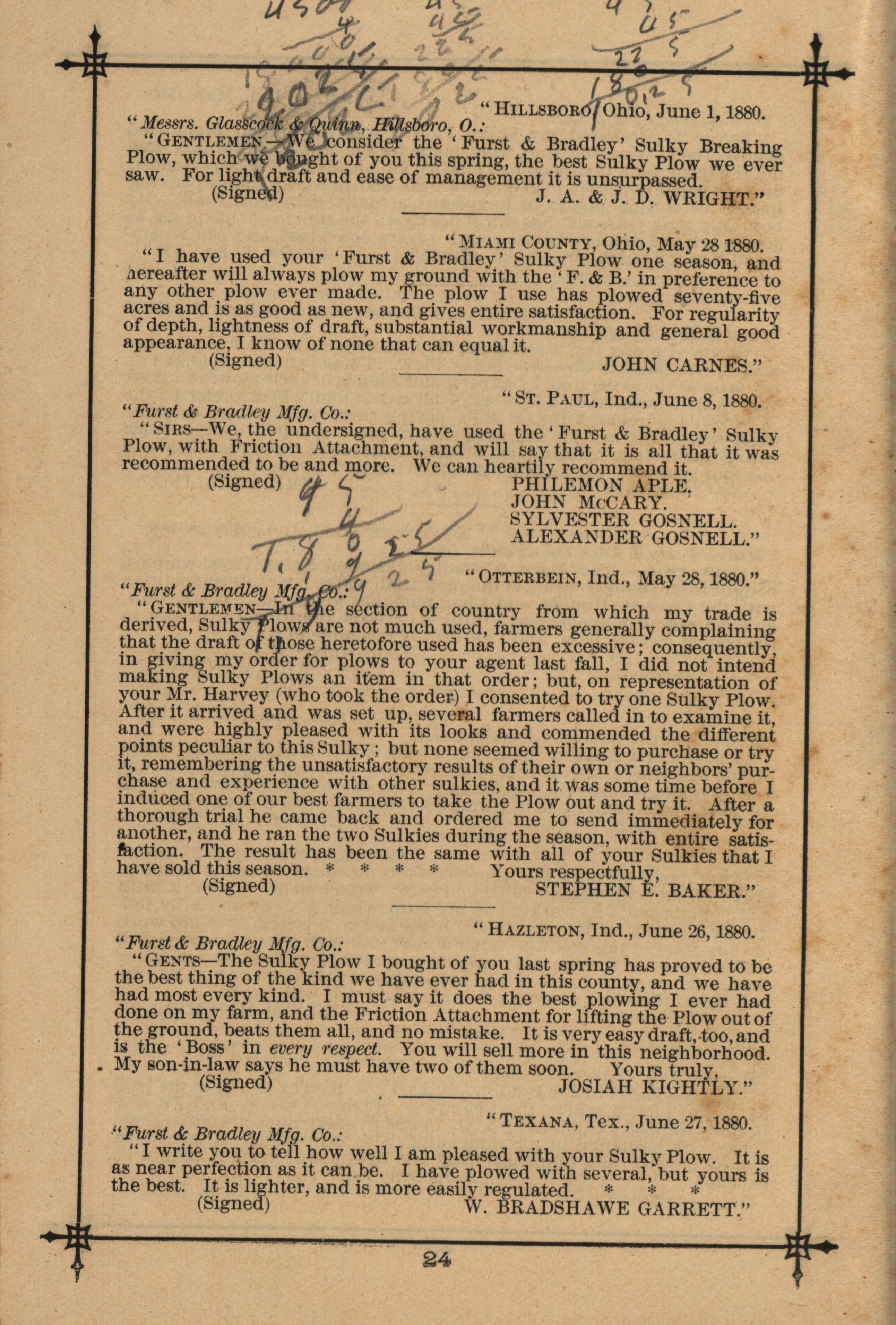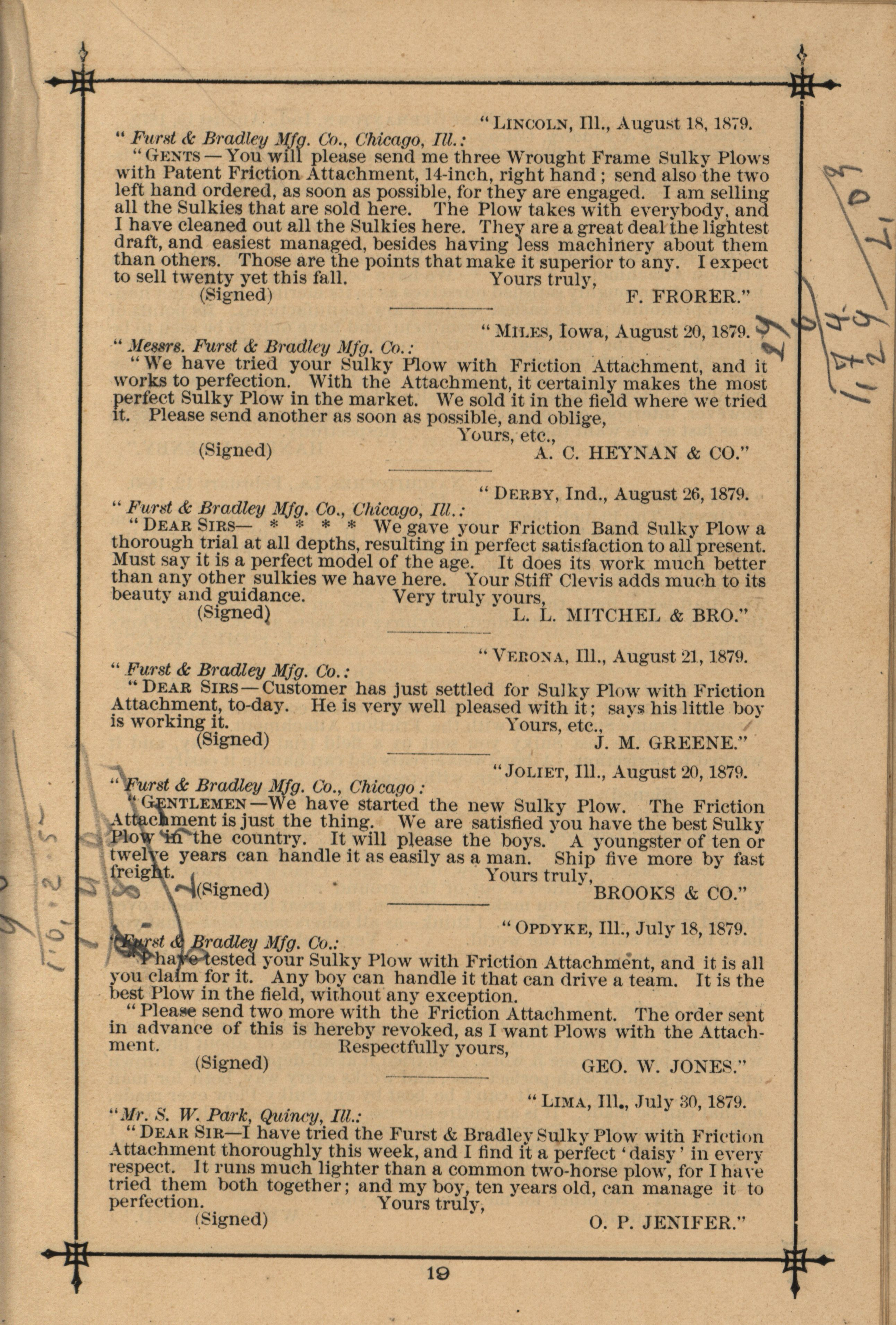 - Illustrated catalog describing the agricultural implements offered by the Furst and Bradley Manufacturing Company in 1886.