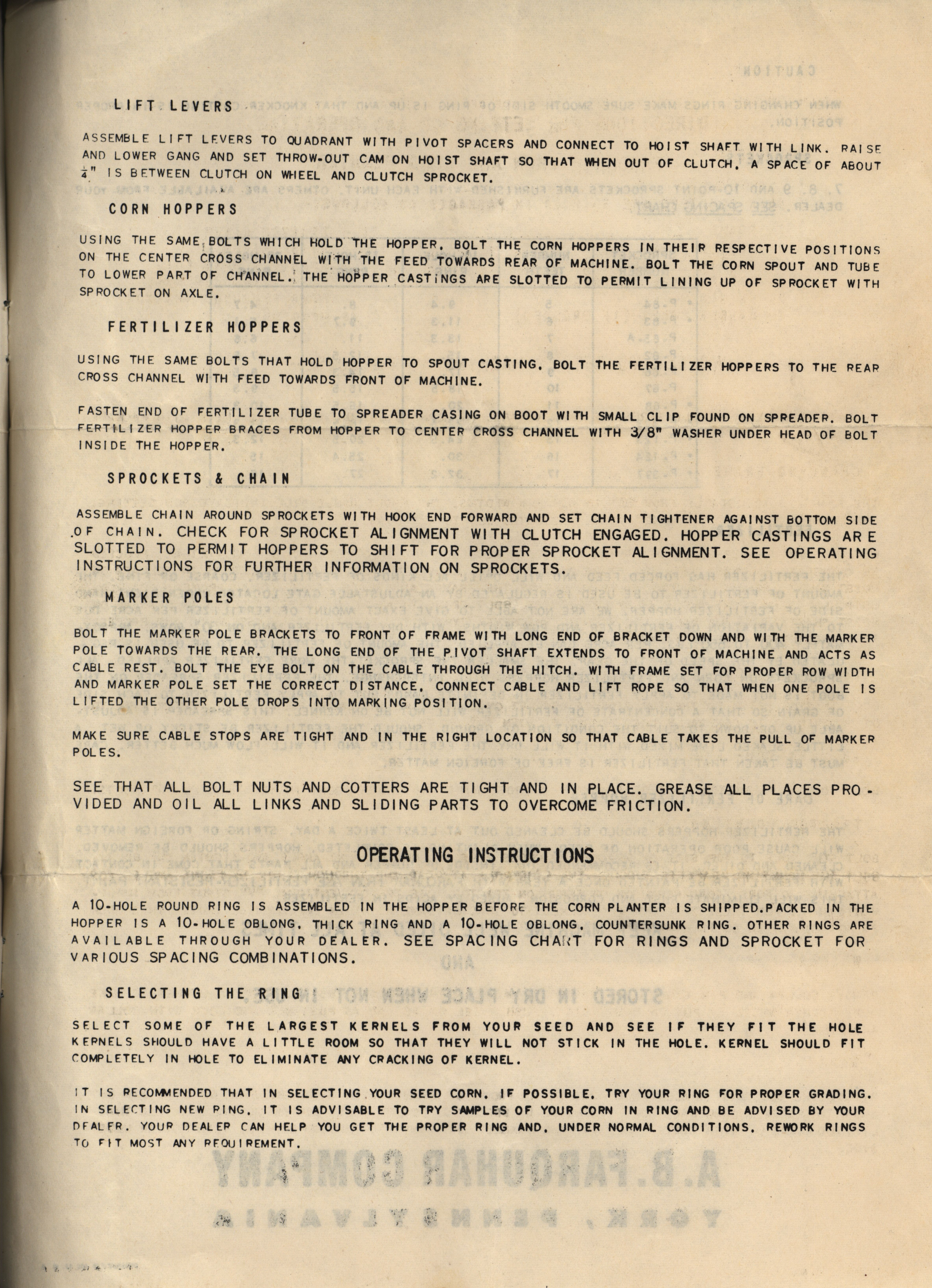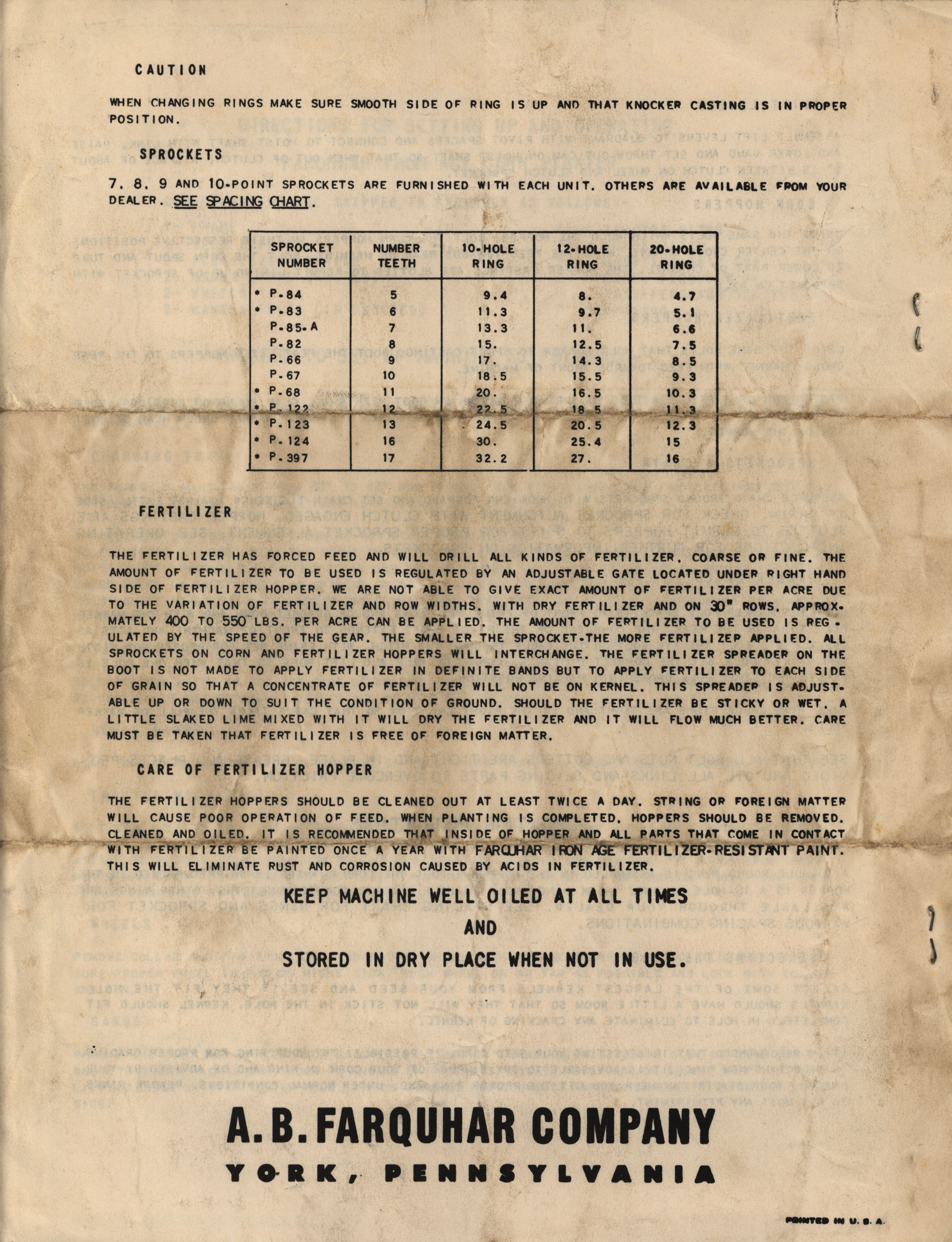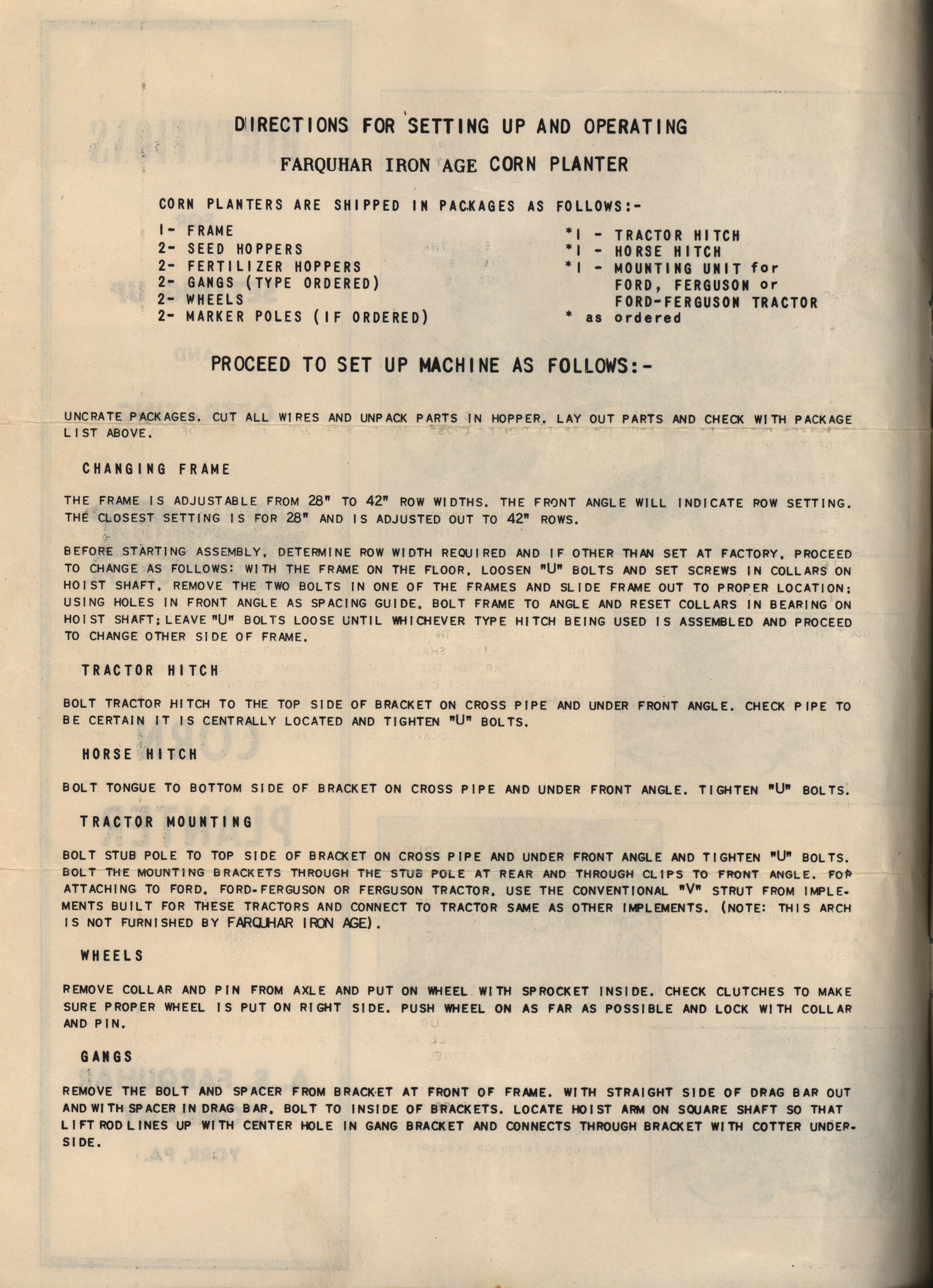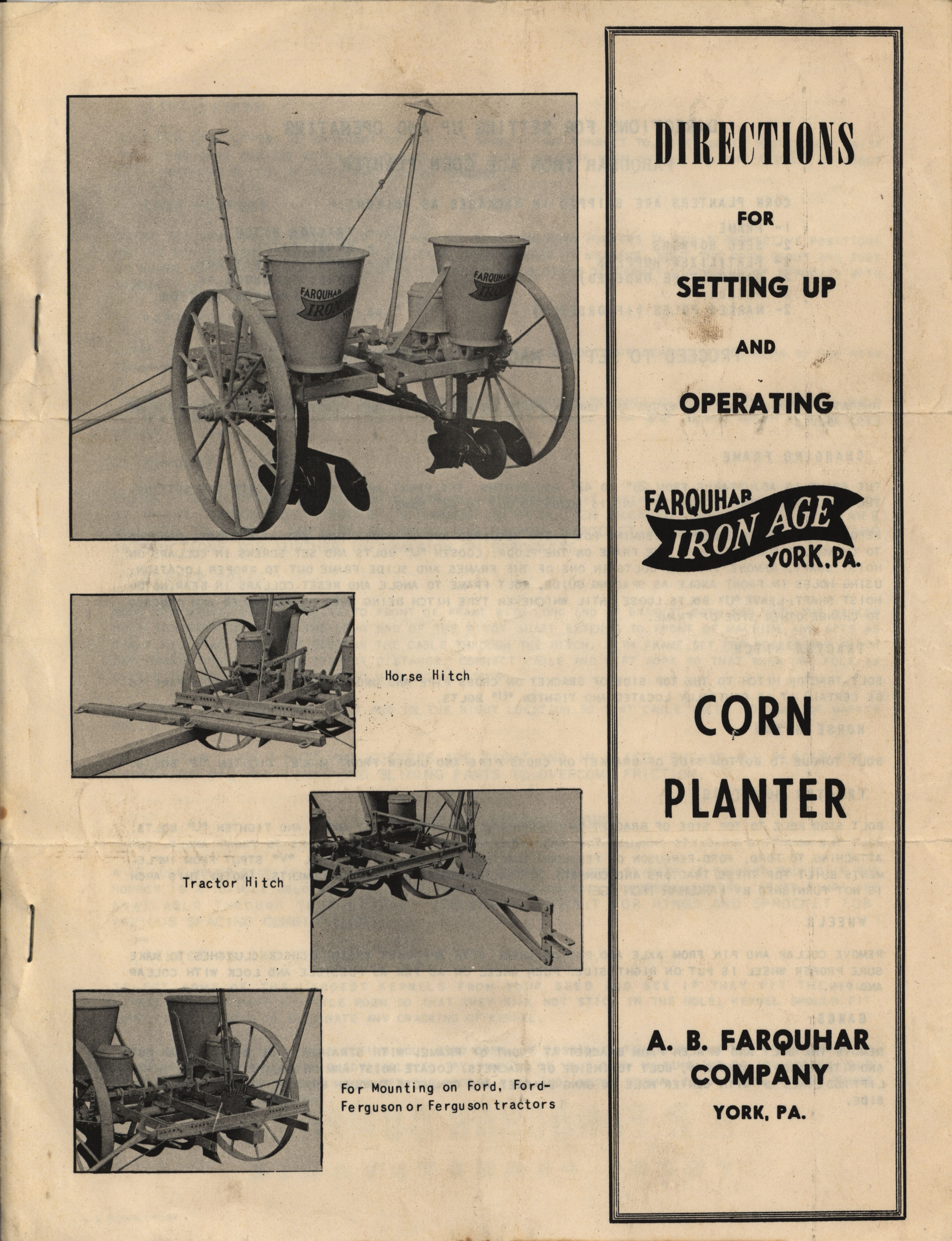 - Directions for setting up and operating Farquhar Iron Age Corn Planter produced by the A. B. Farquhar Company.