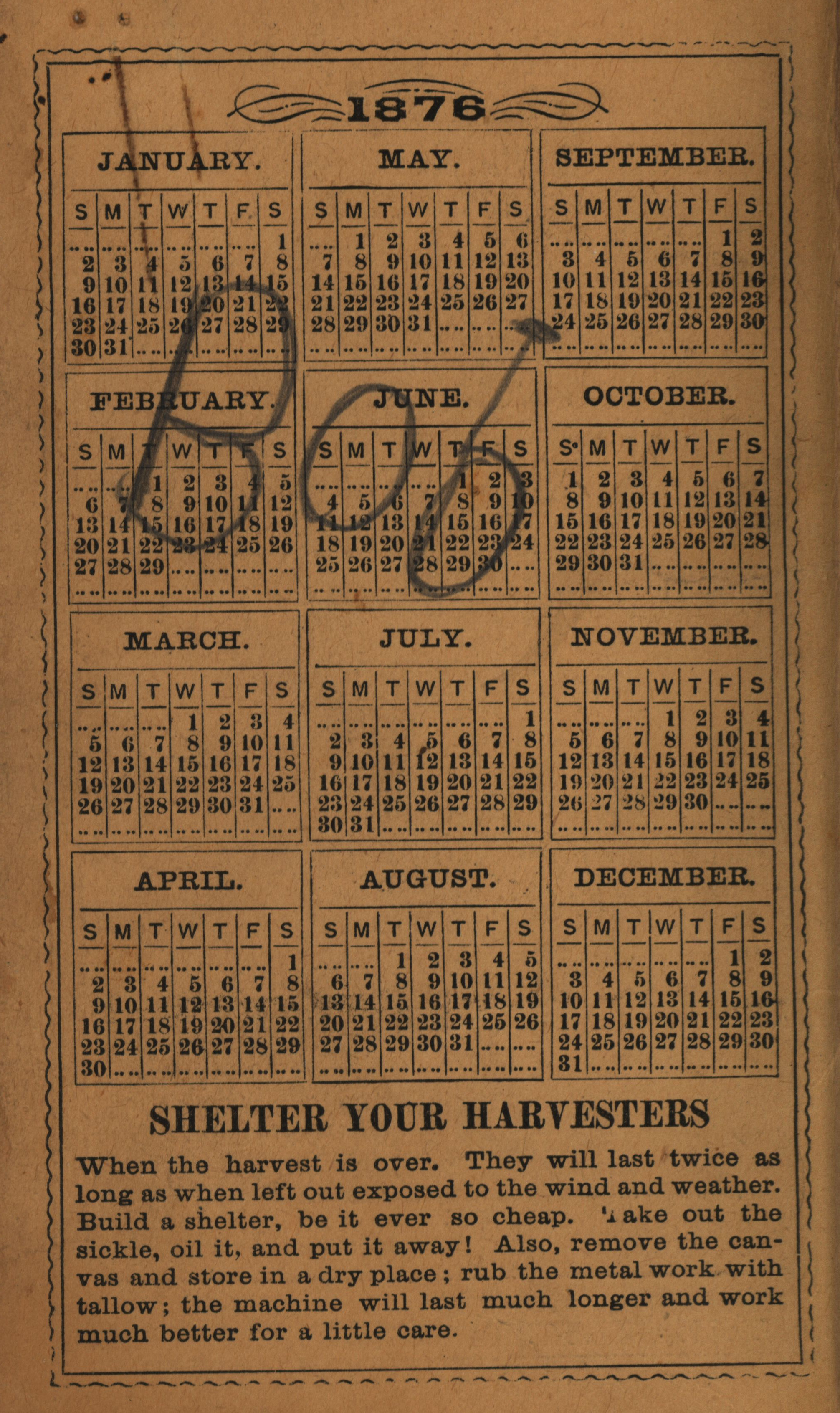 - Illustrated memorandum book produced by the Gammon and Deering Manufacturers in 1876.