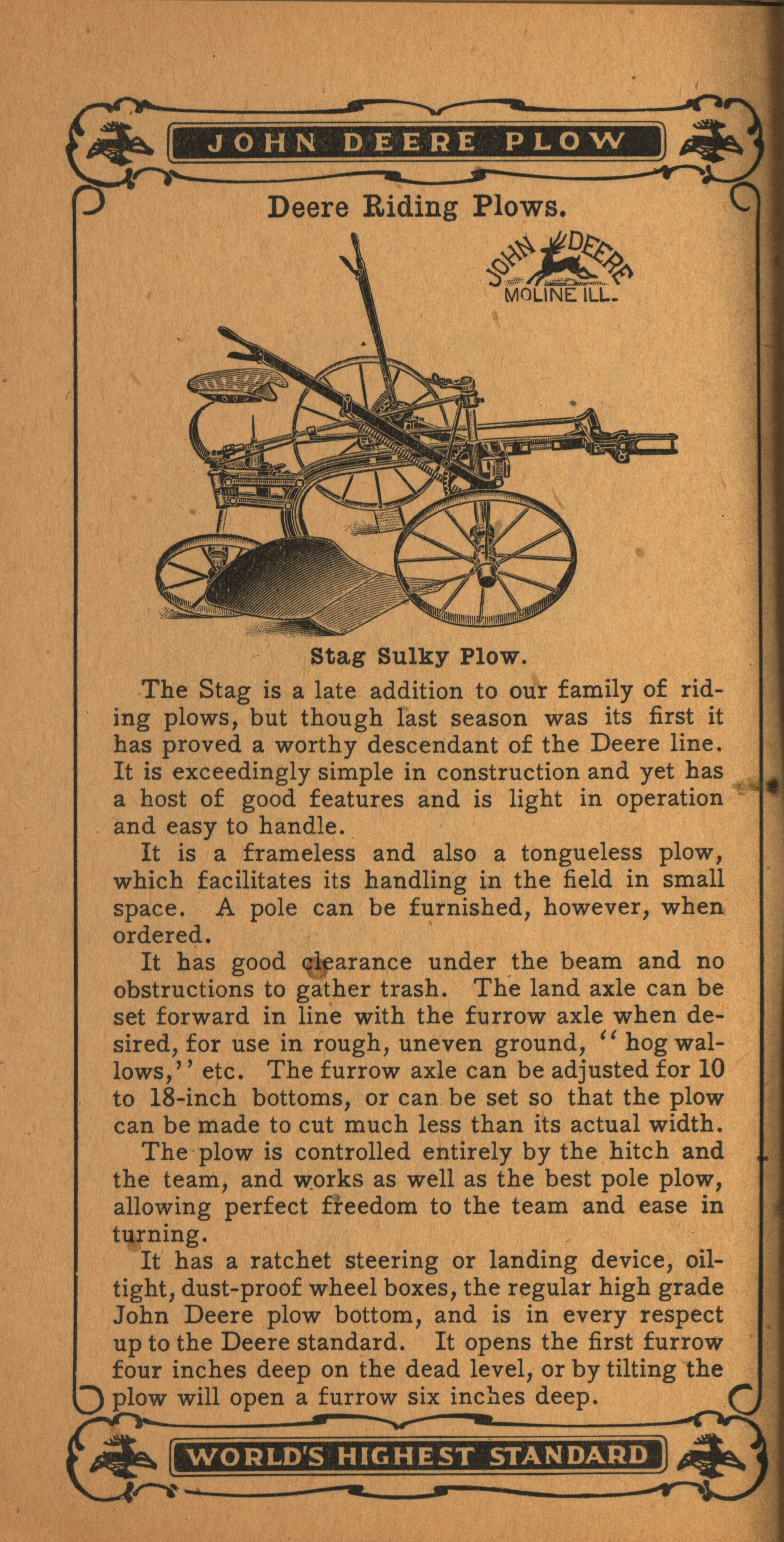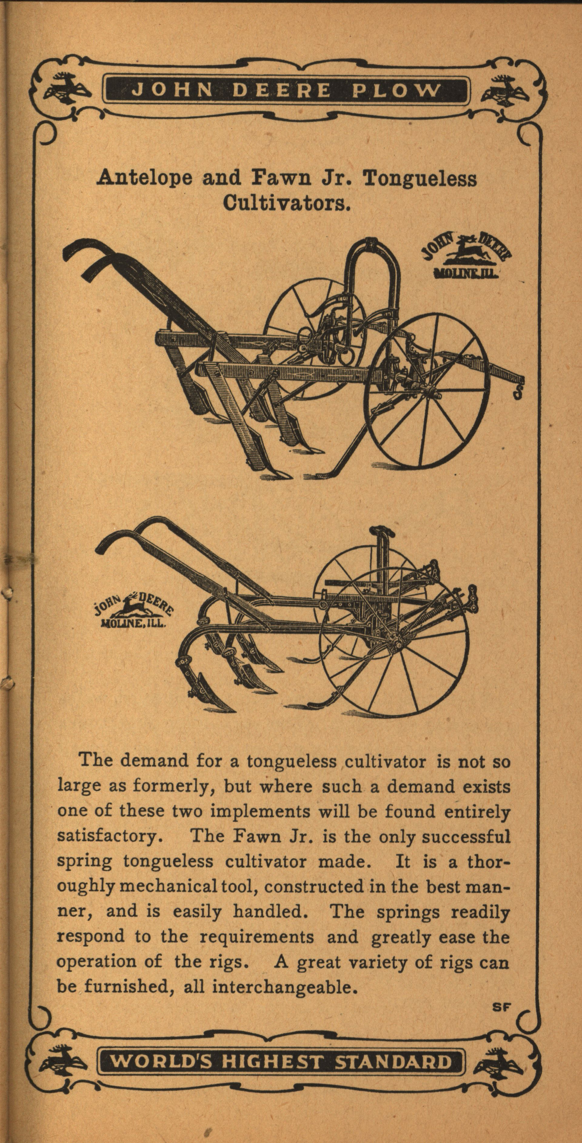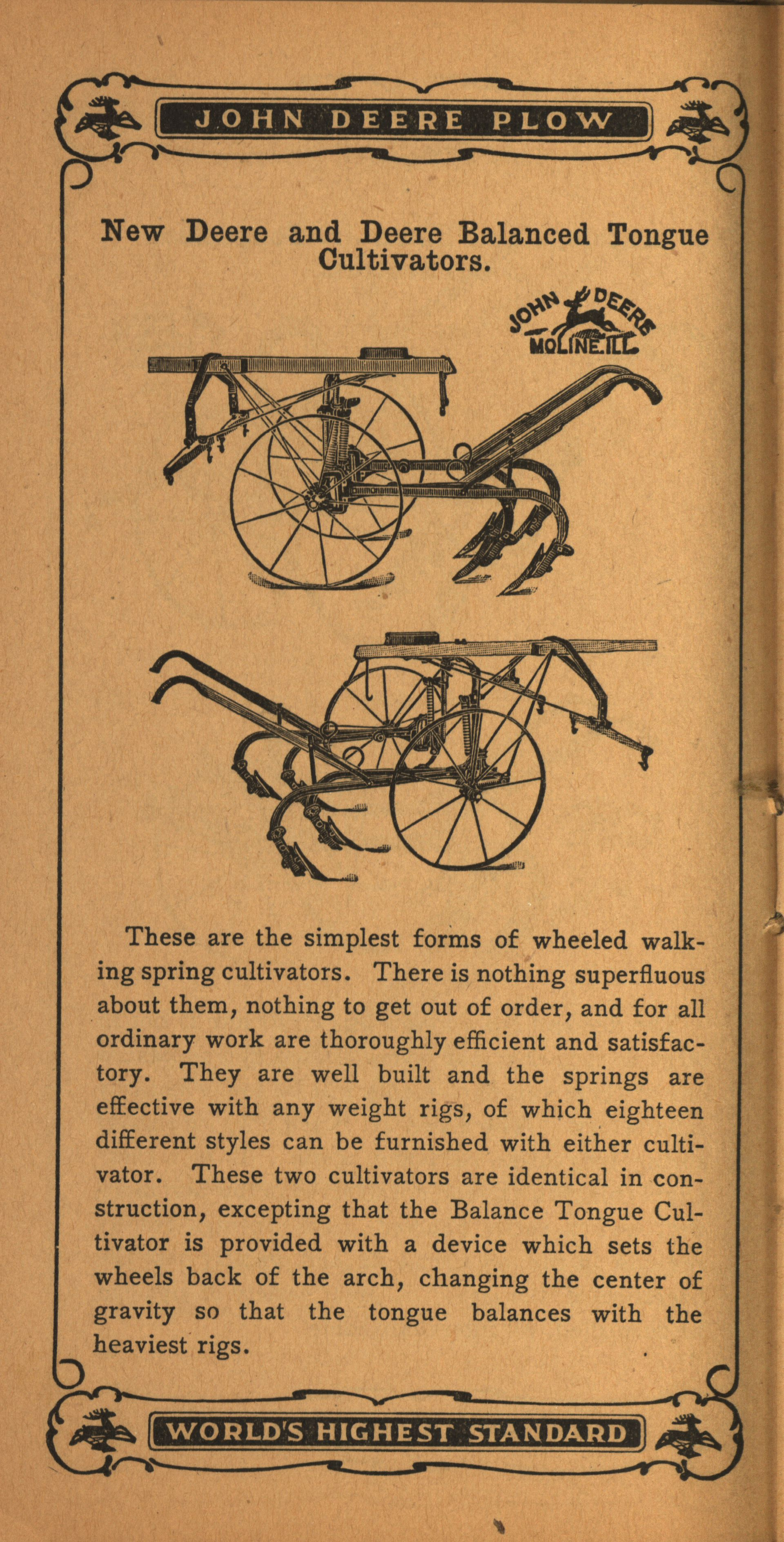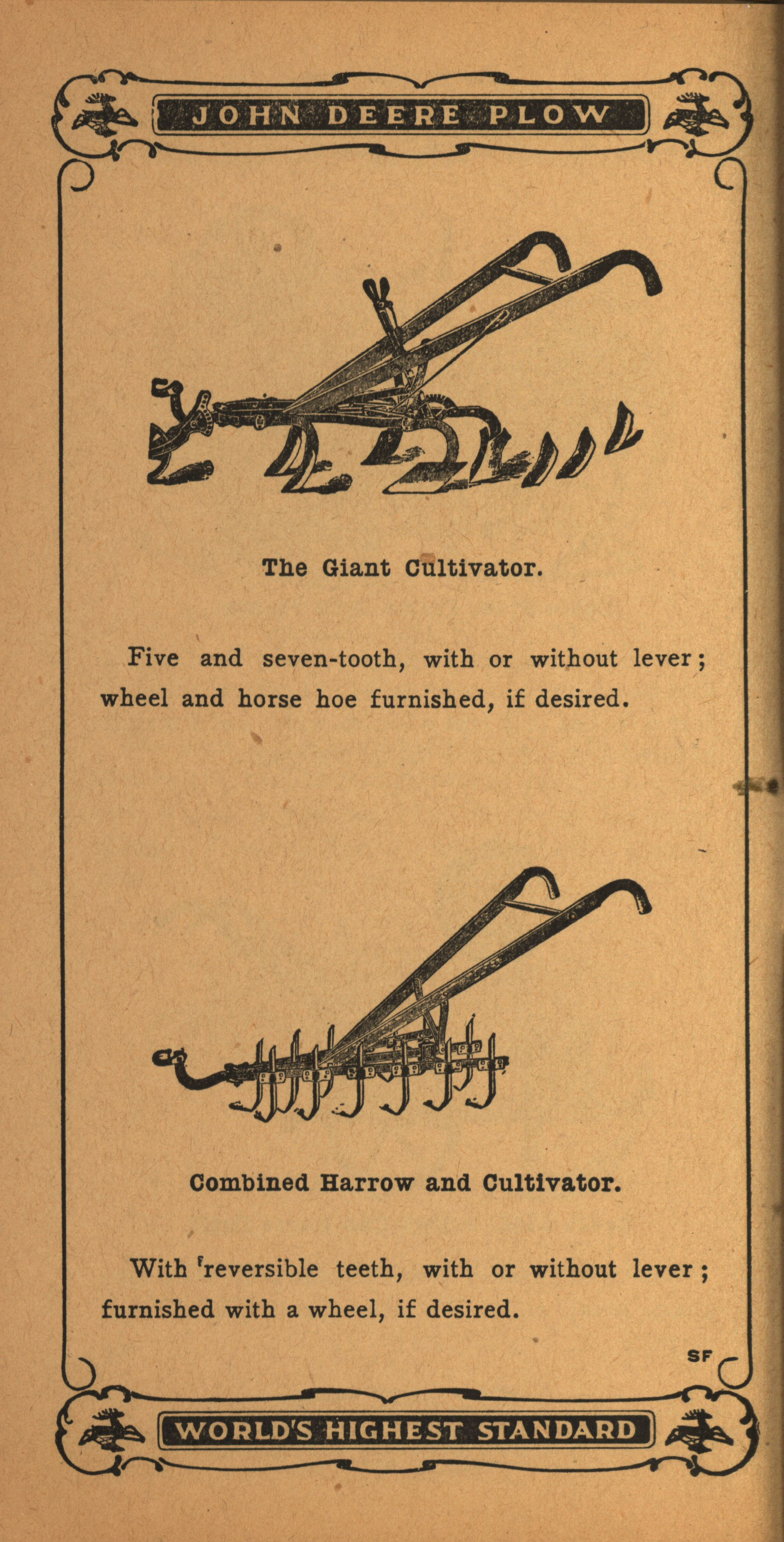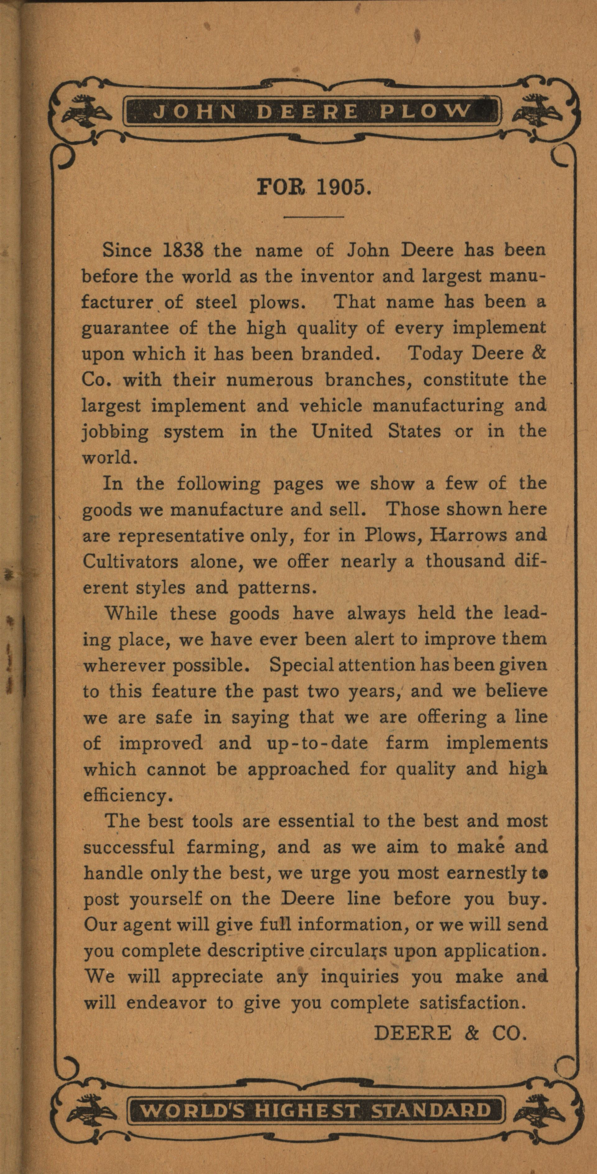 - Illustrated pocket catalog describing the products offered by Deere Implement Company in 1905.