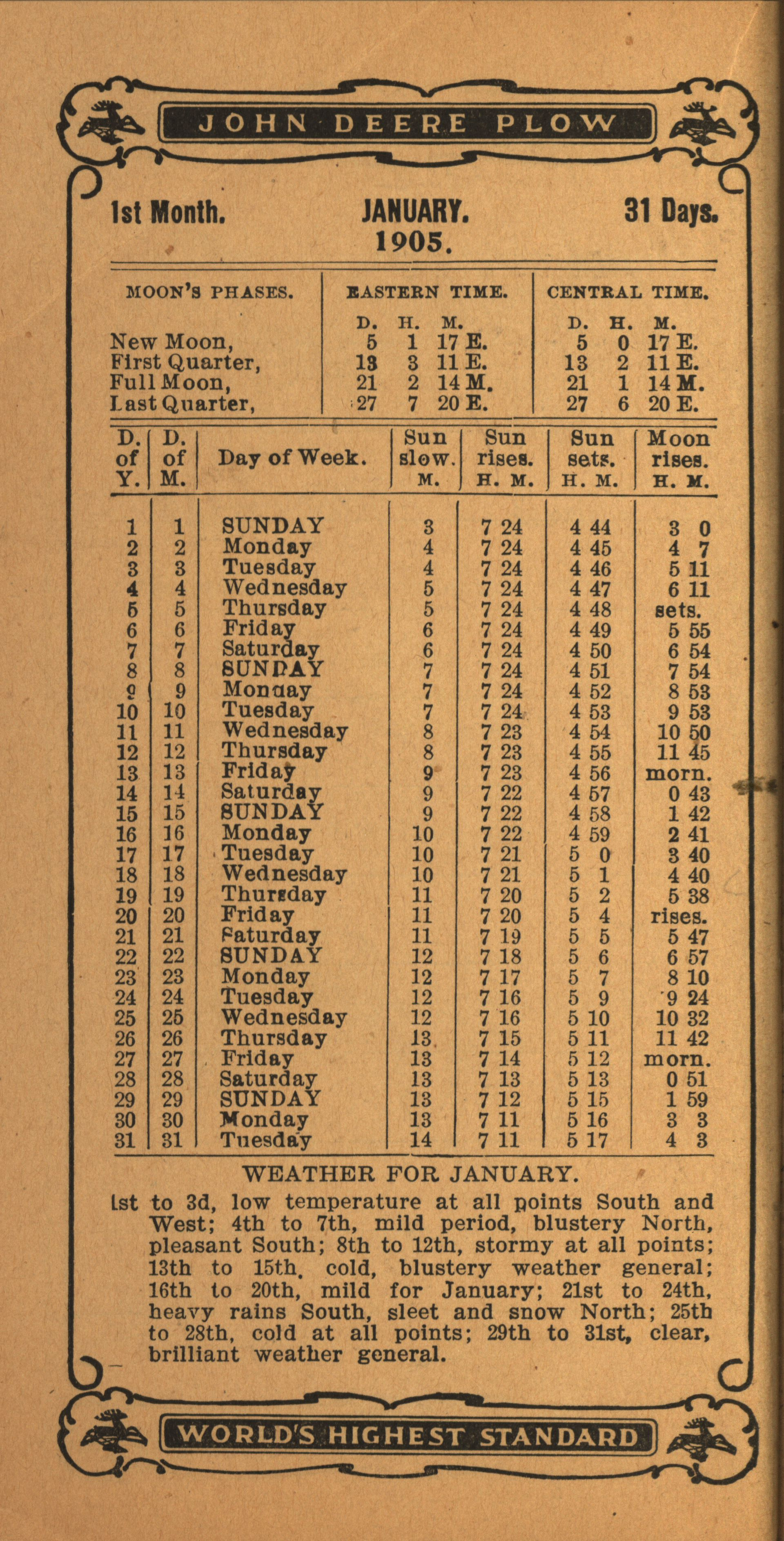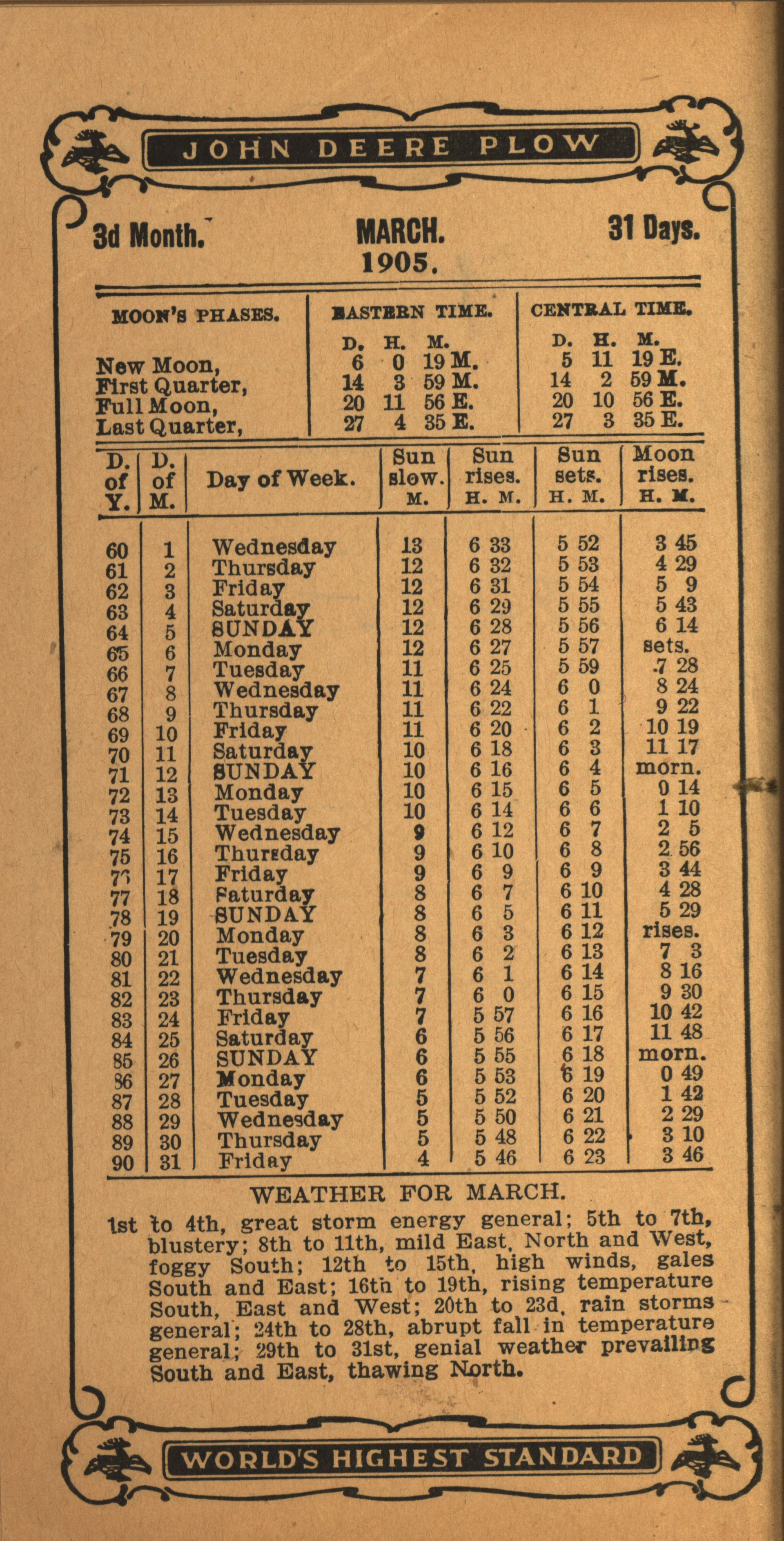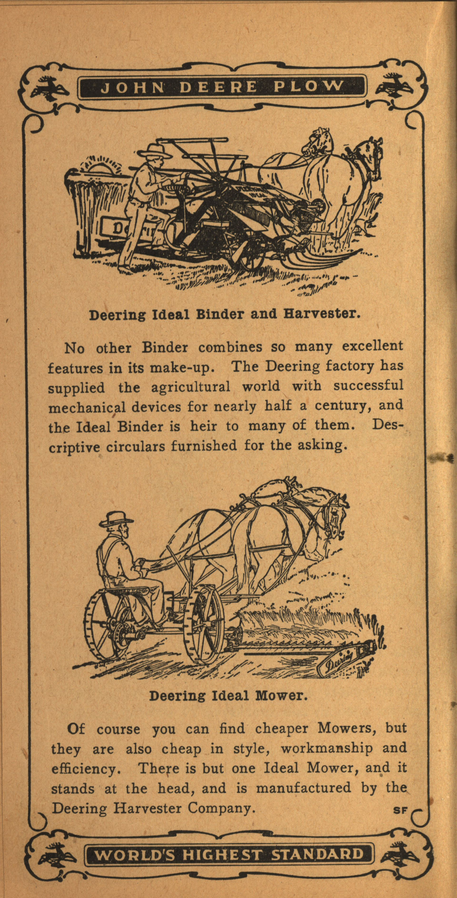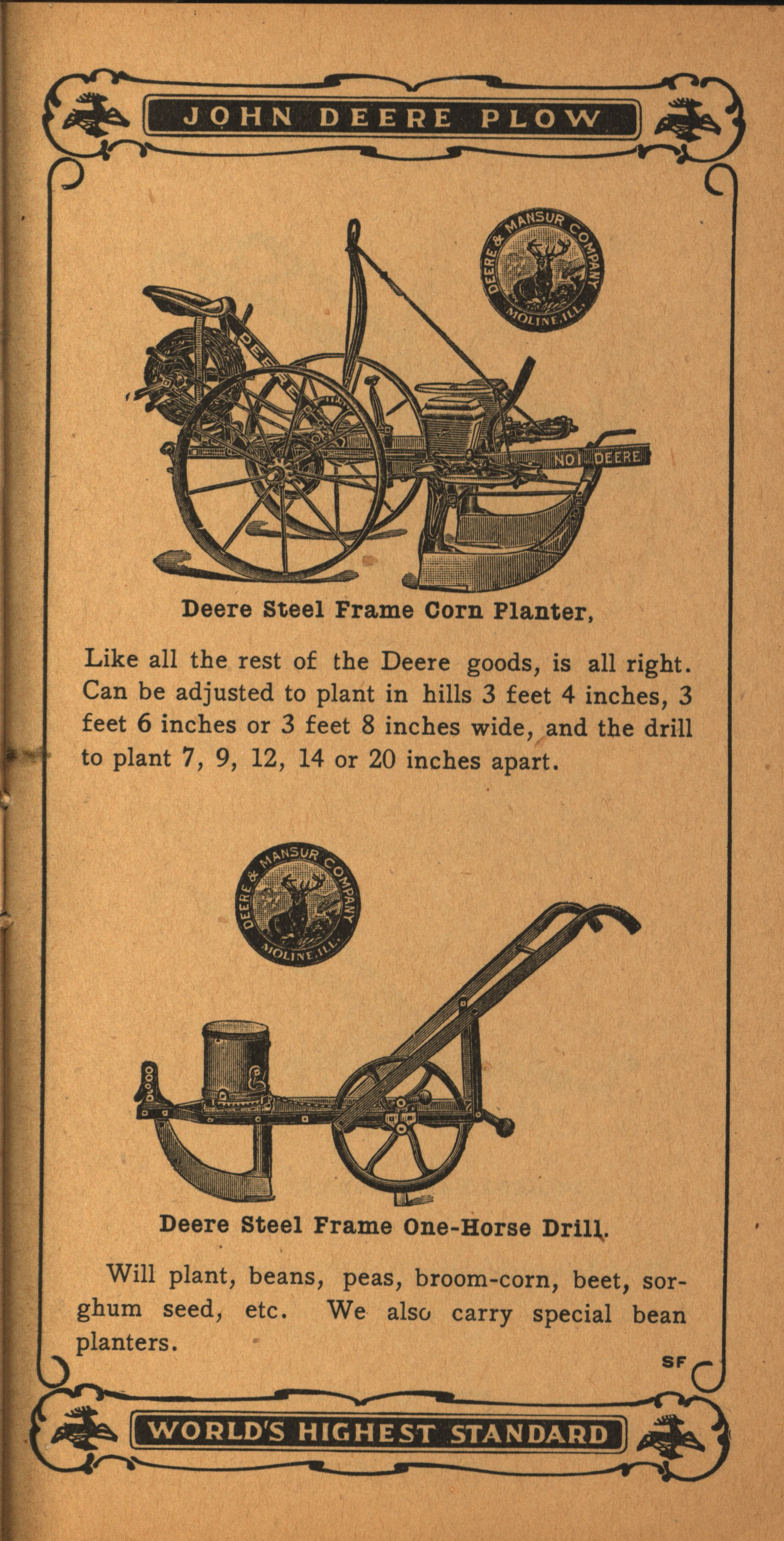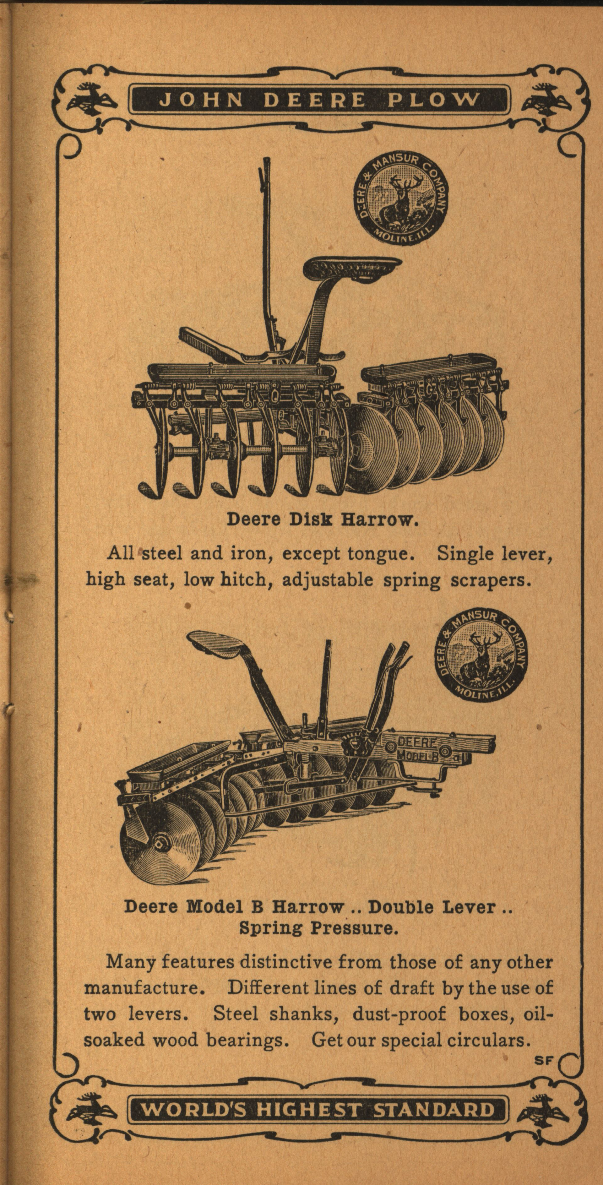 - "Deere Implement Company 1905 farmers pocket companion", Agricultural Machinery Literature Collection, Iowa State University Library Digital Collections
