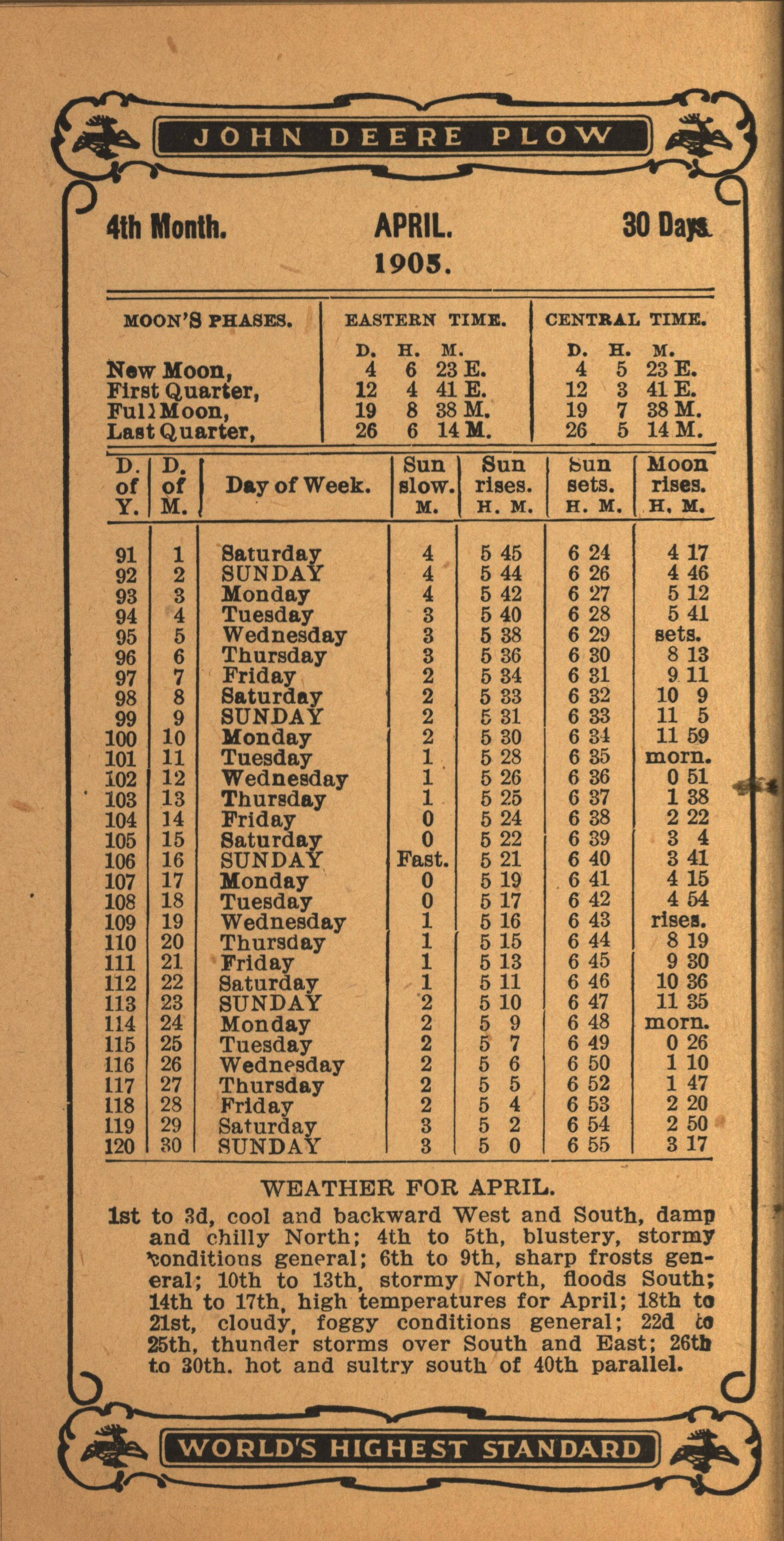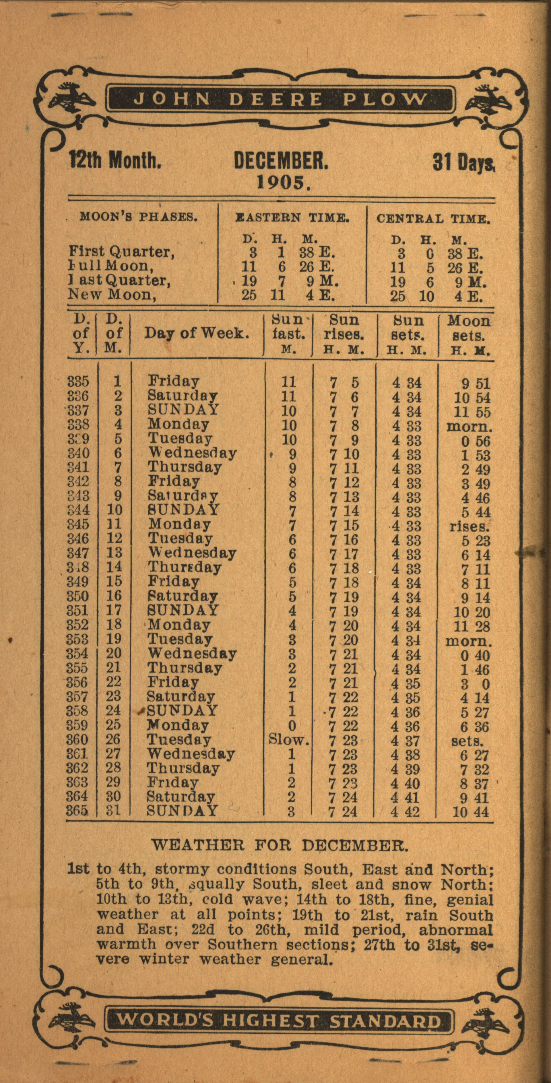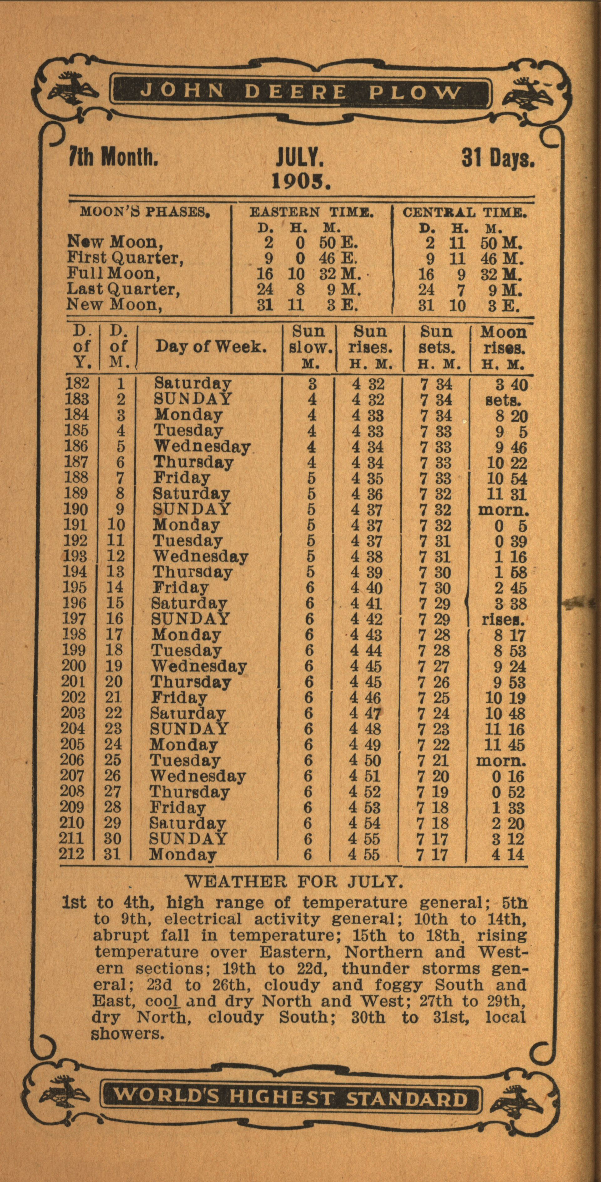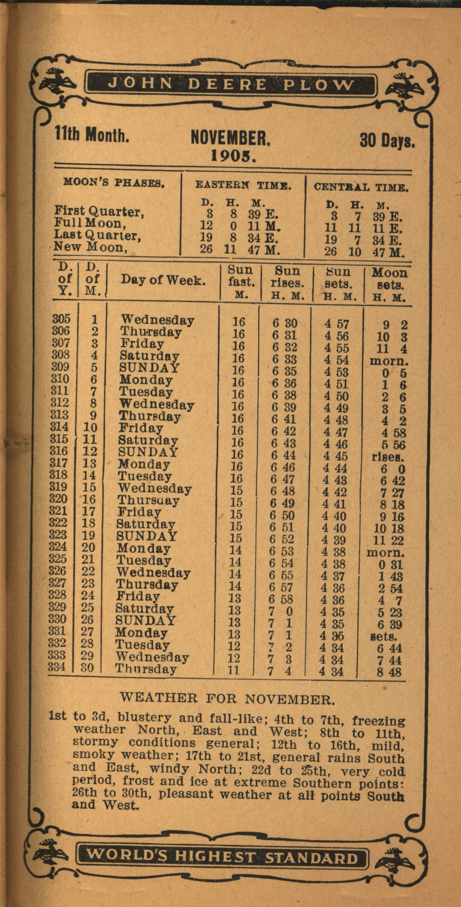 - "Deere Implement Company 1905 farmers pocket companion", Agricultural Machinery Literature Collection, Iowa State University Library Digital Collections