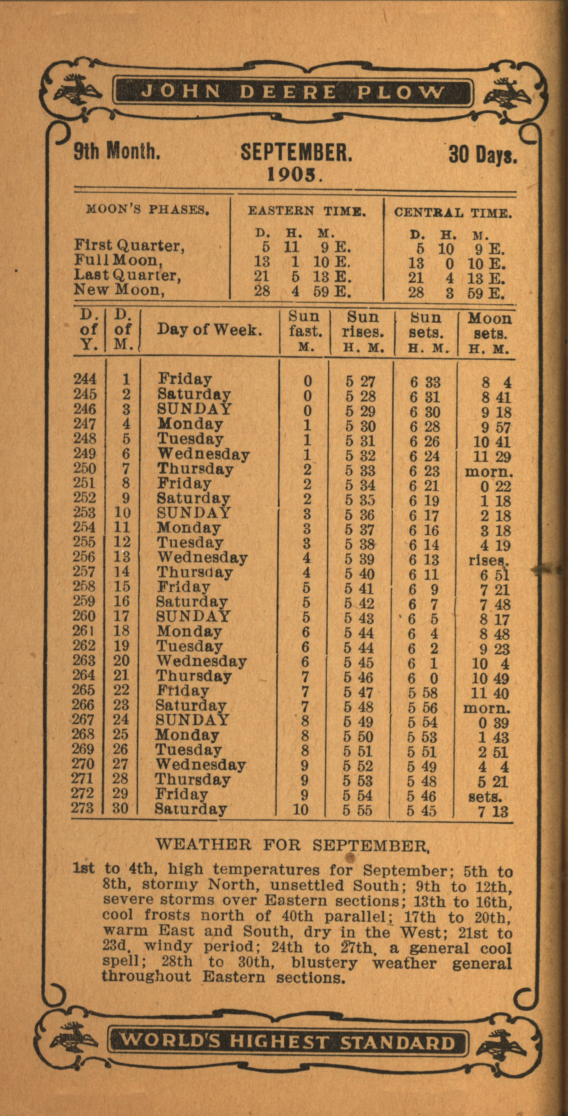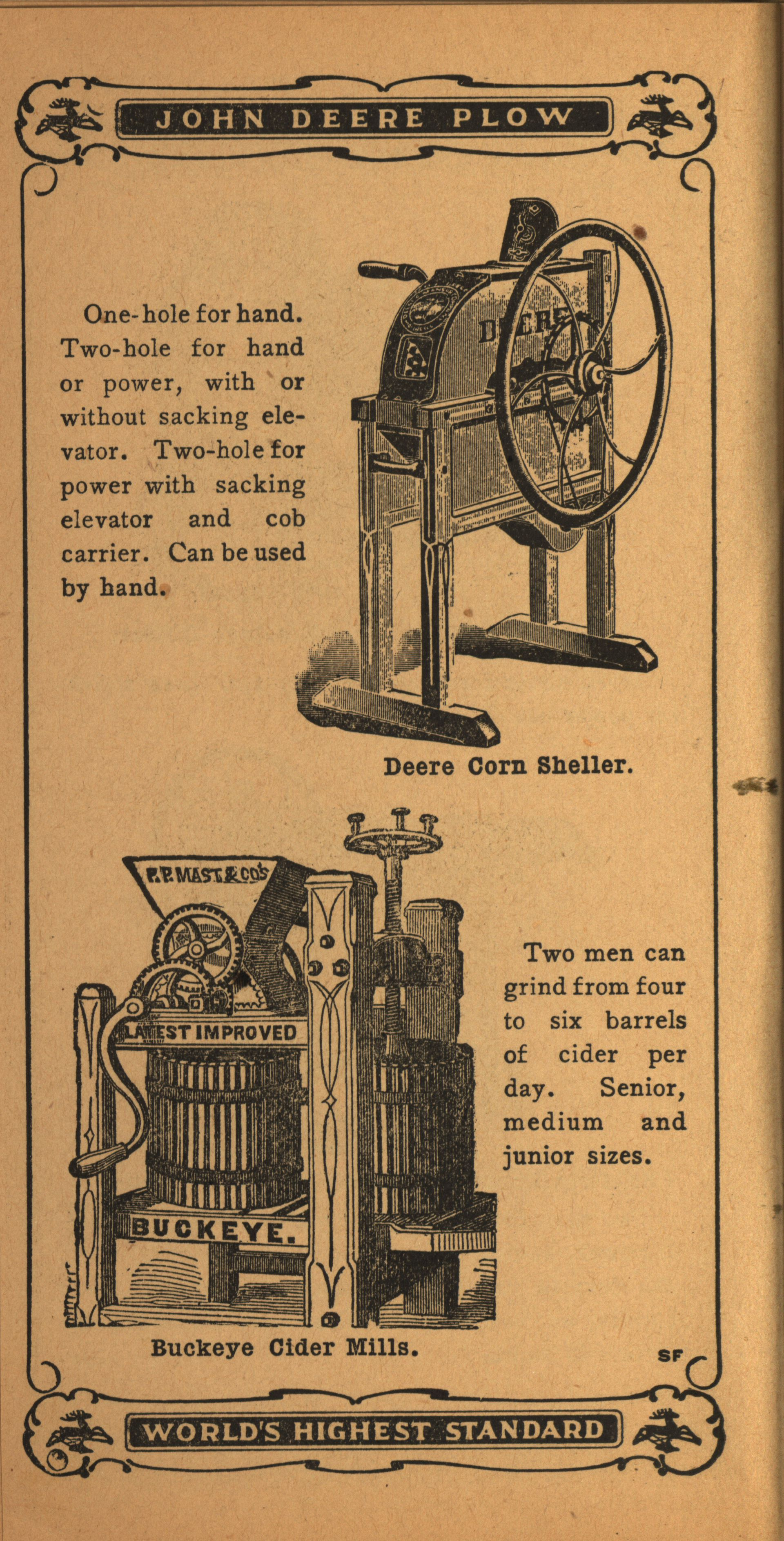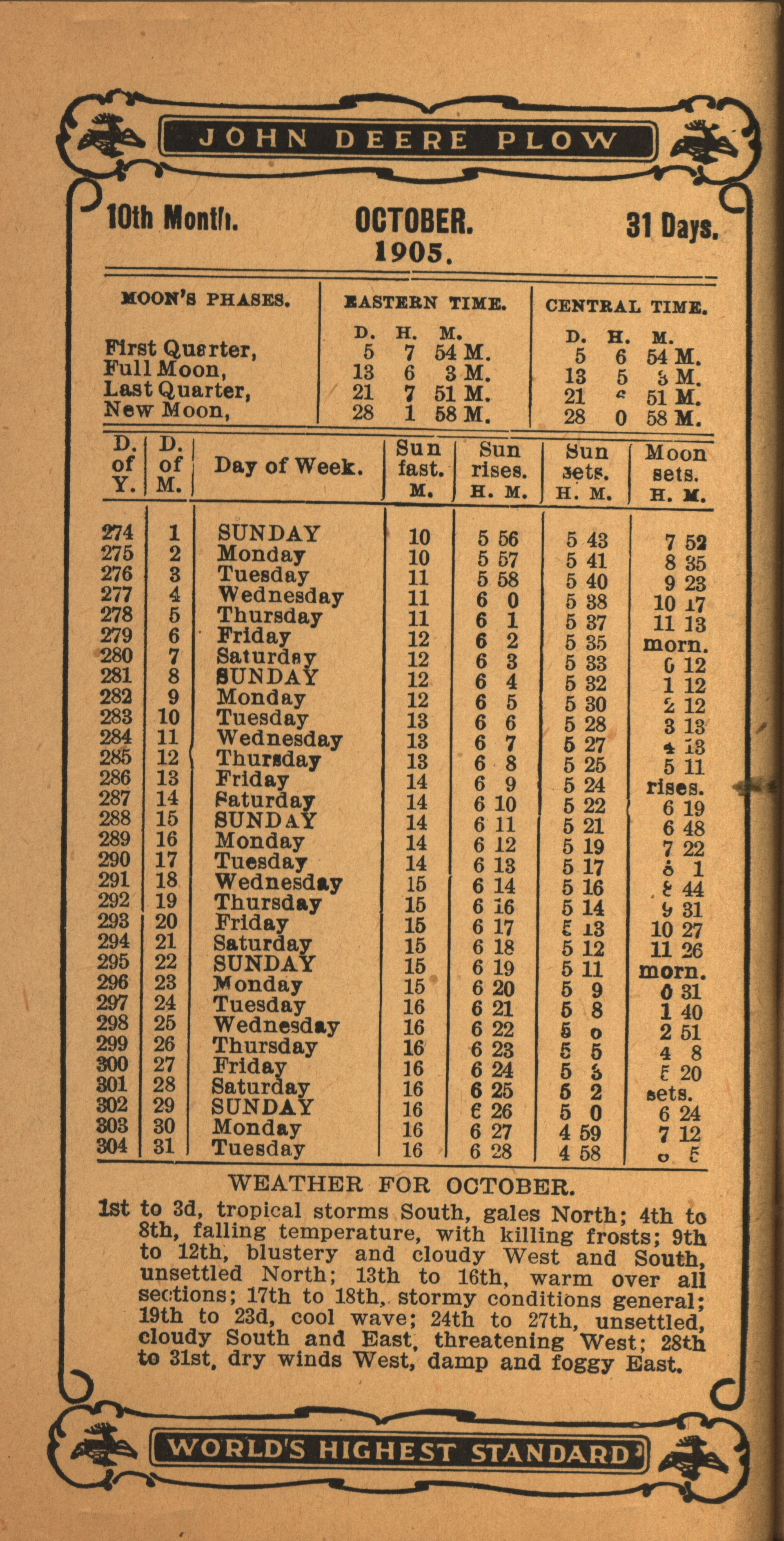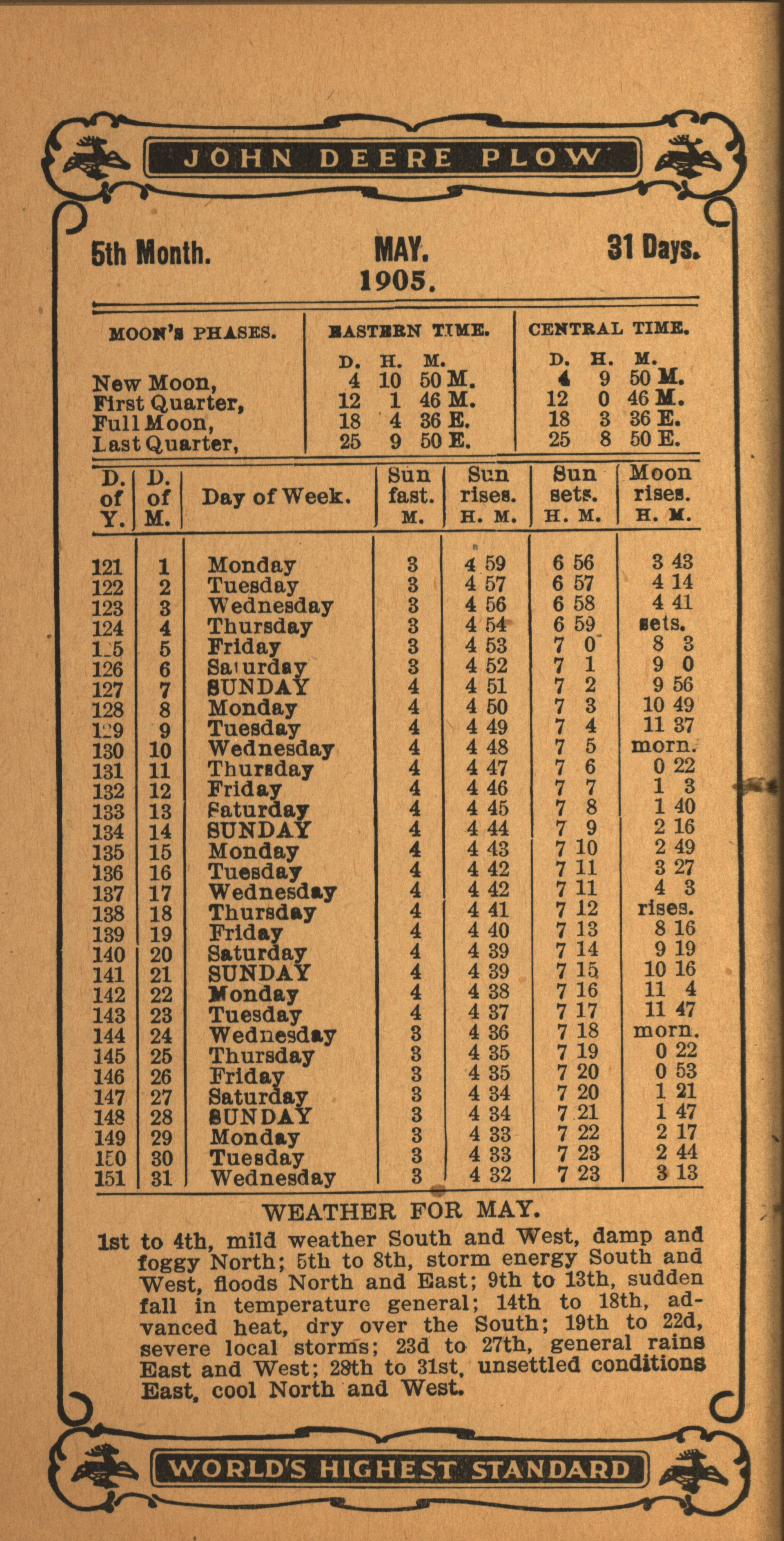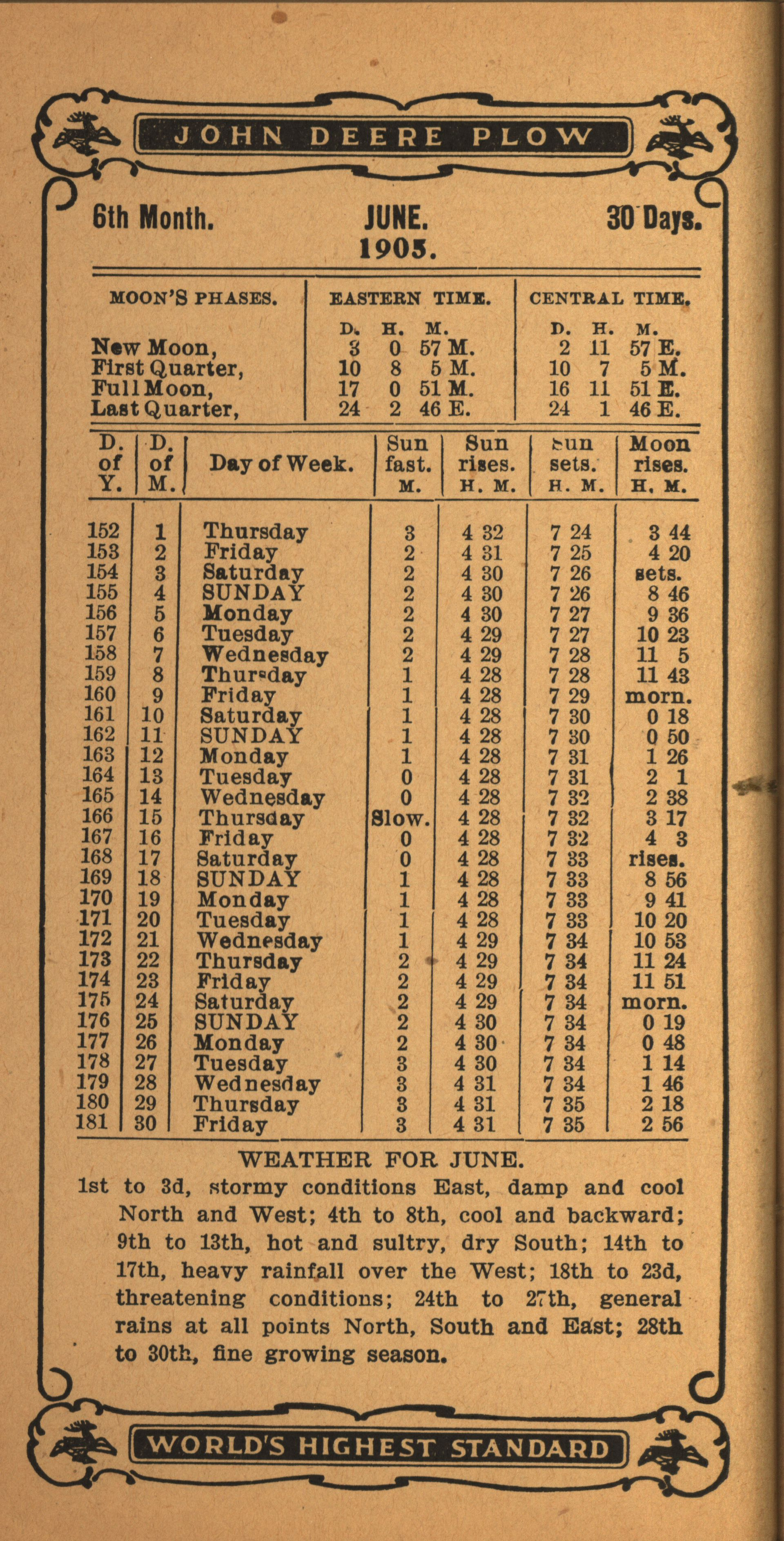 - "Deere Implement Company 1905 farmers pocket companion", Agricultural Machinery Literature Collection, Iowa State University Library Digital Collections