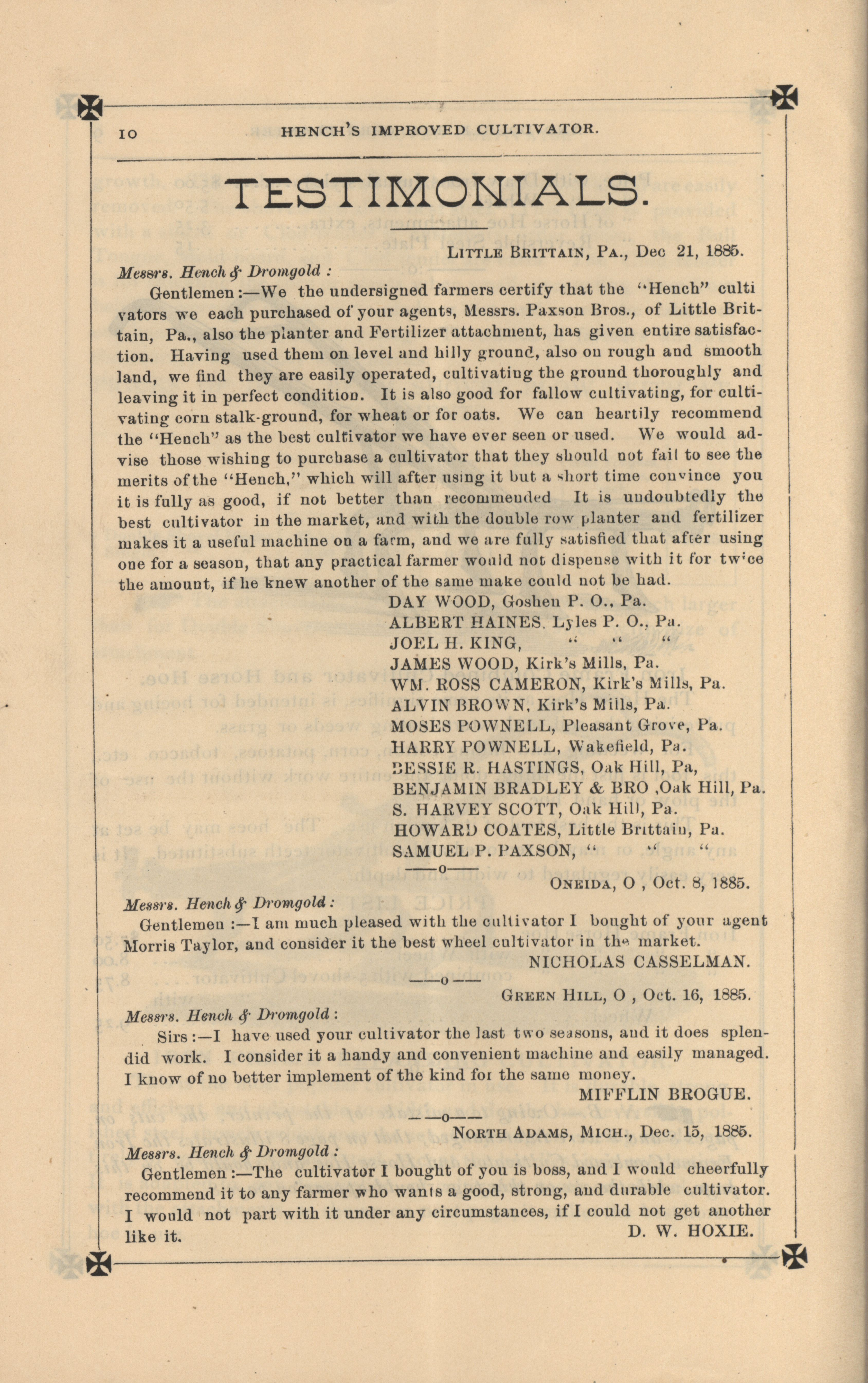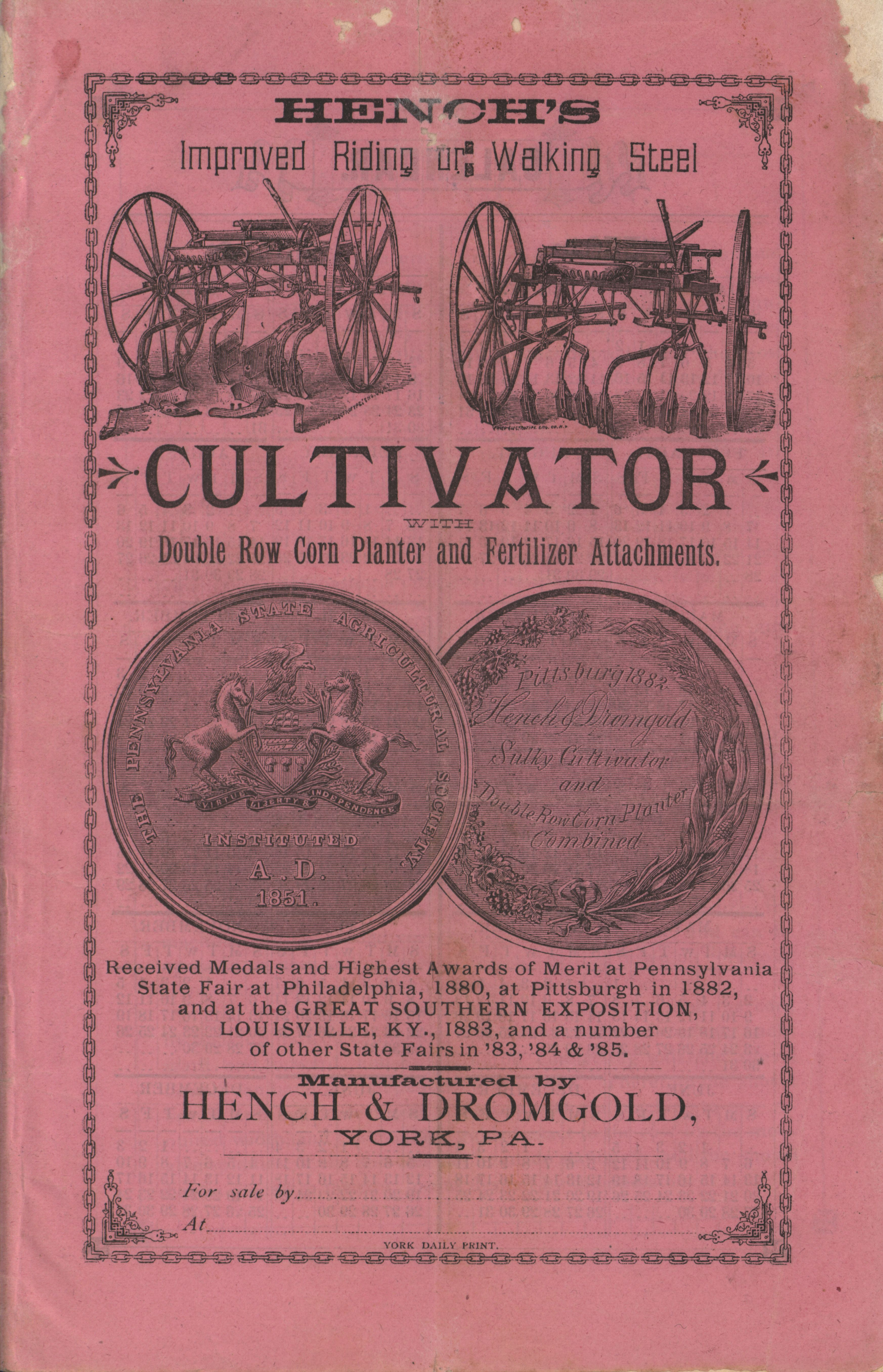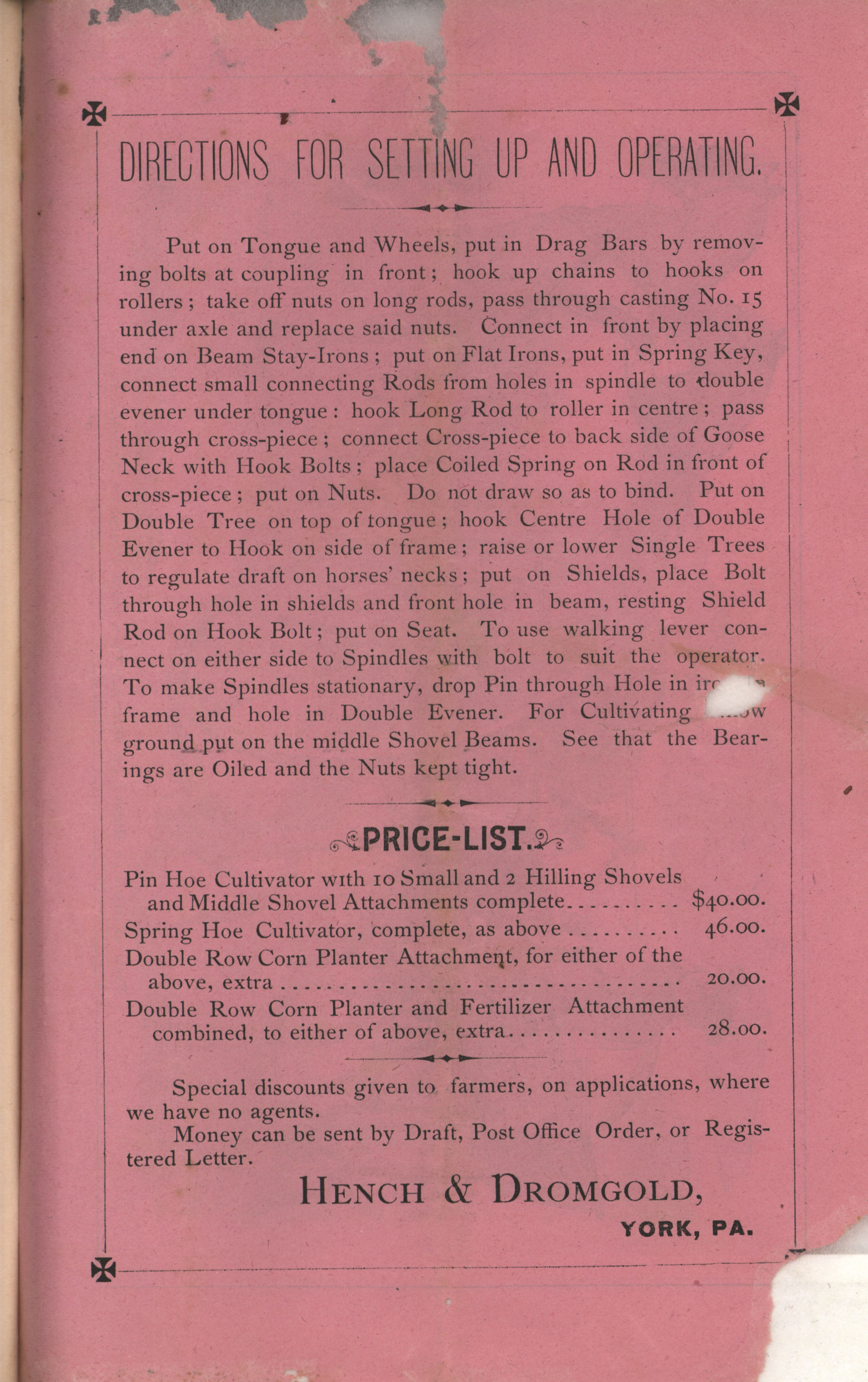 - Agricultural machinery catalog containing illustrations, descriptions and a price list for the products offered by the Hench & Dromgold Company.
