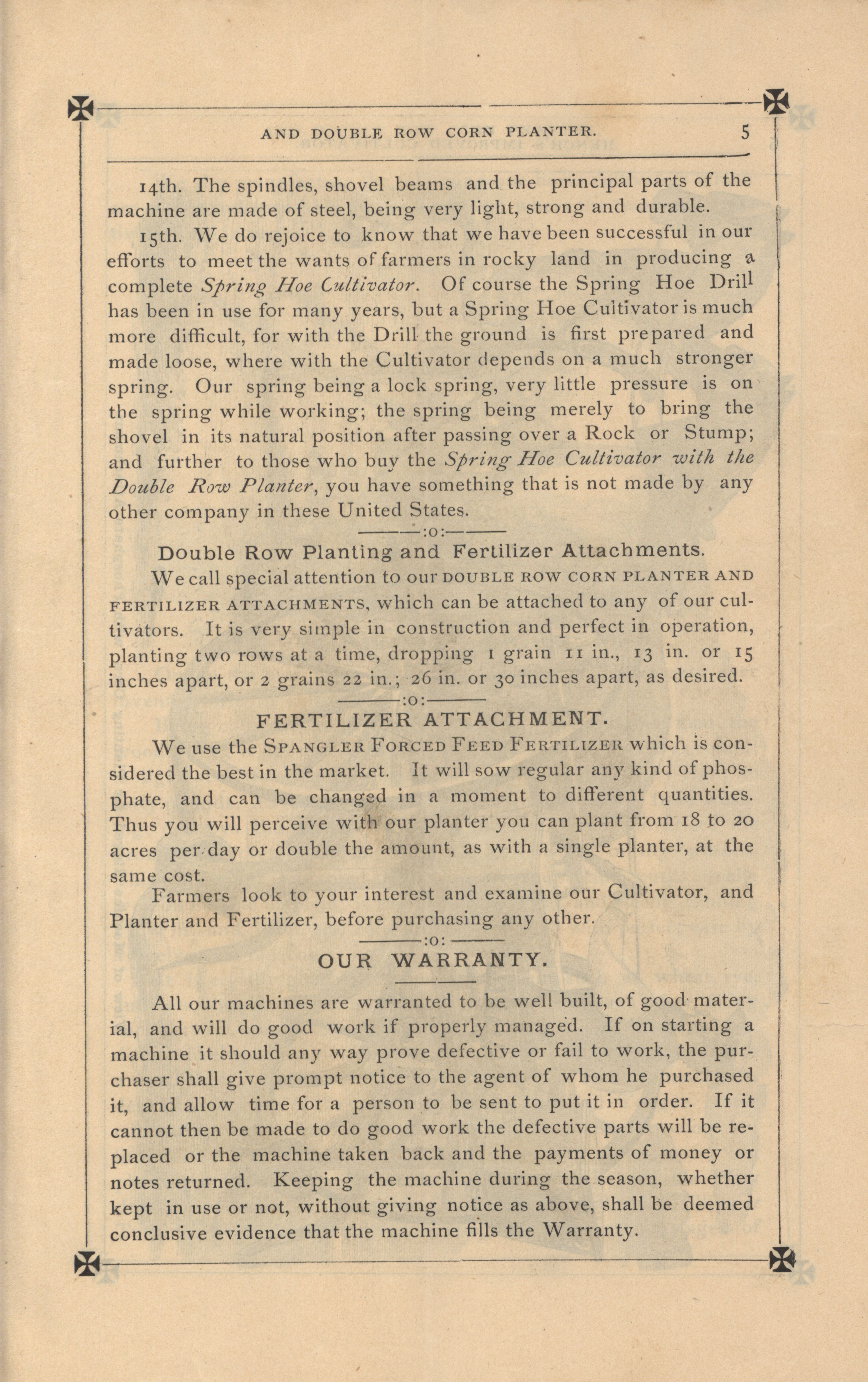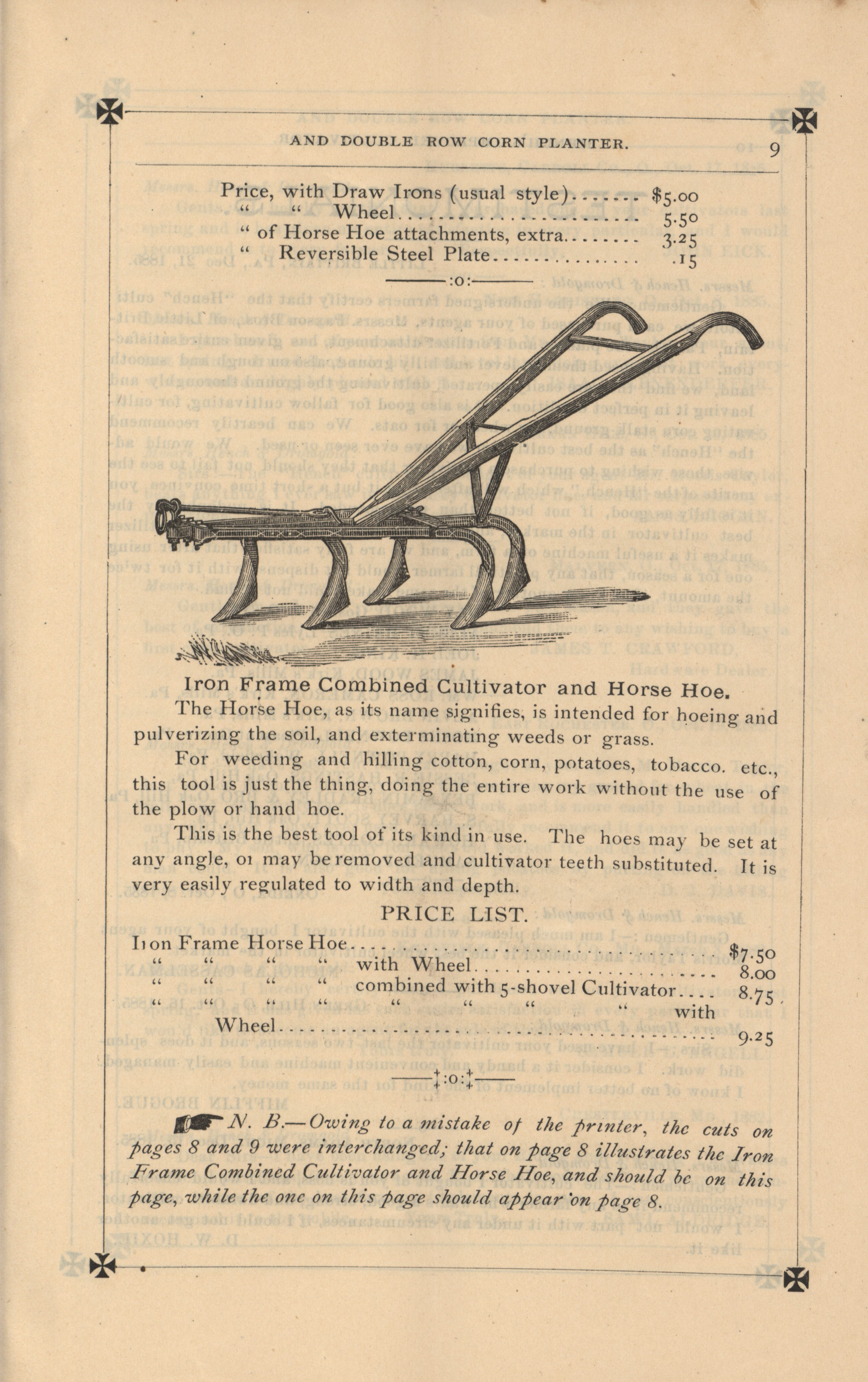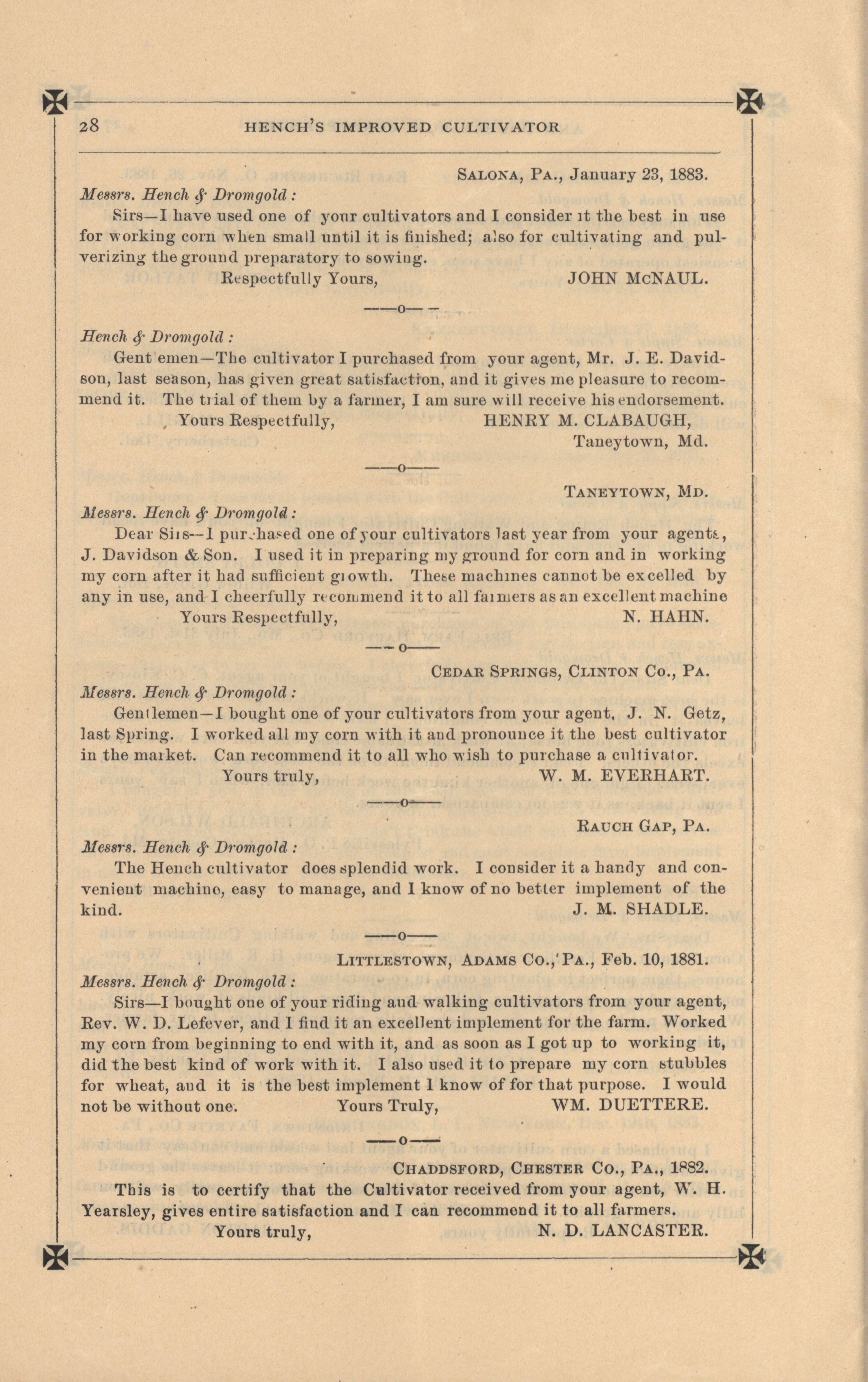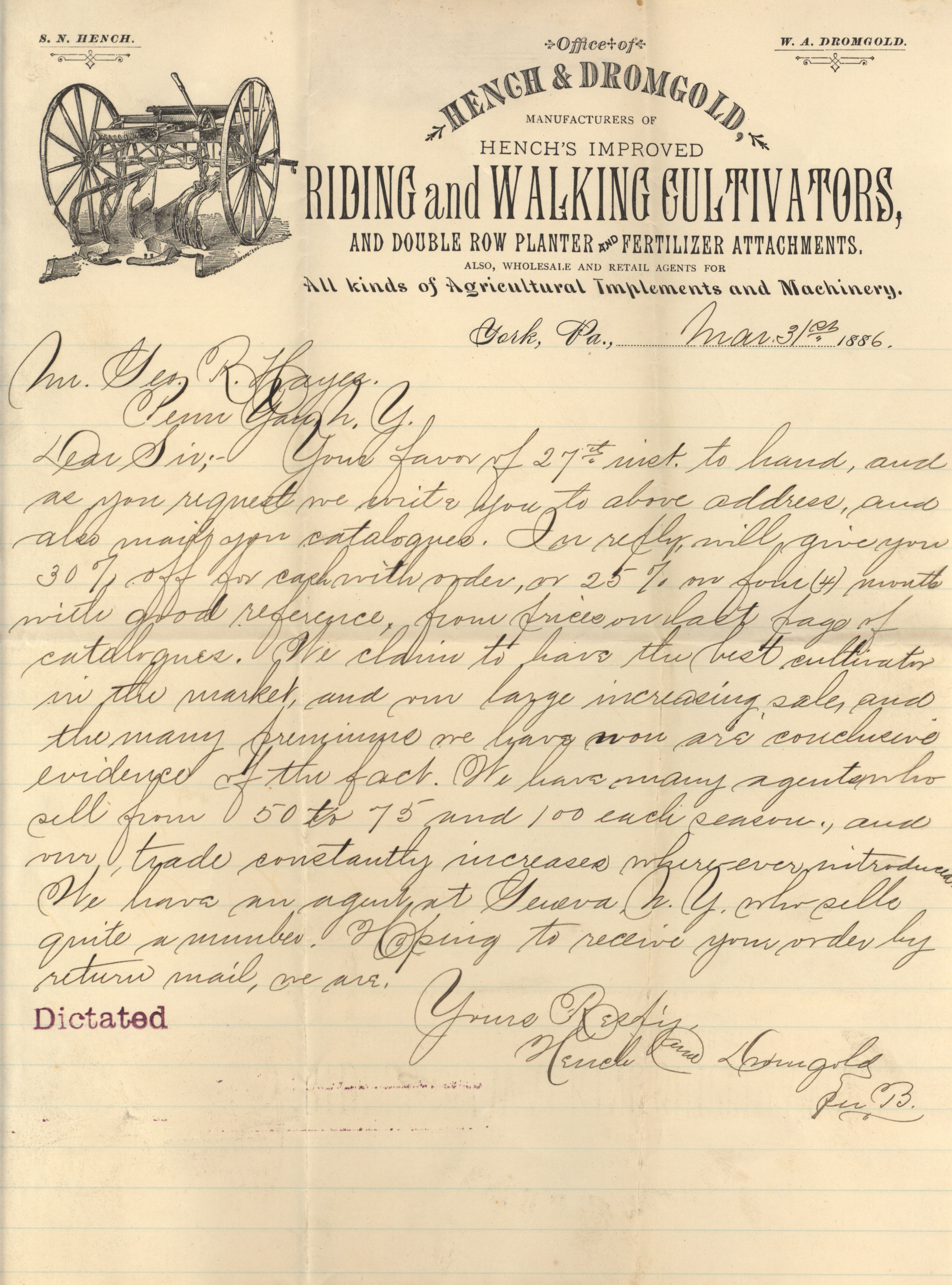 - Agricultural machinery catalog containing illustrations, descriptions and a price list for the products offered by the Hench & Dromgold Company.