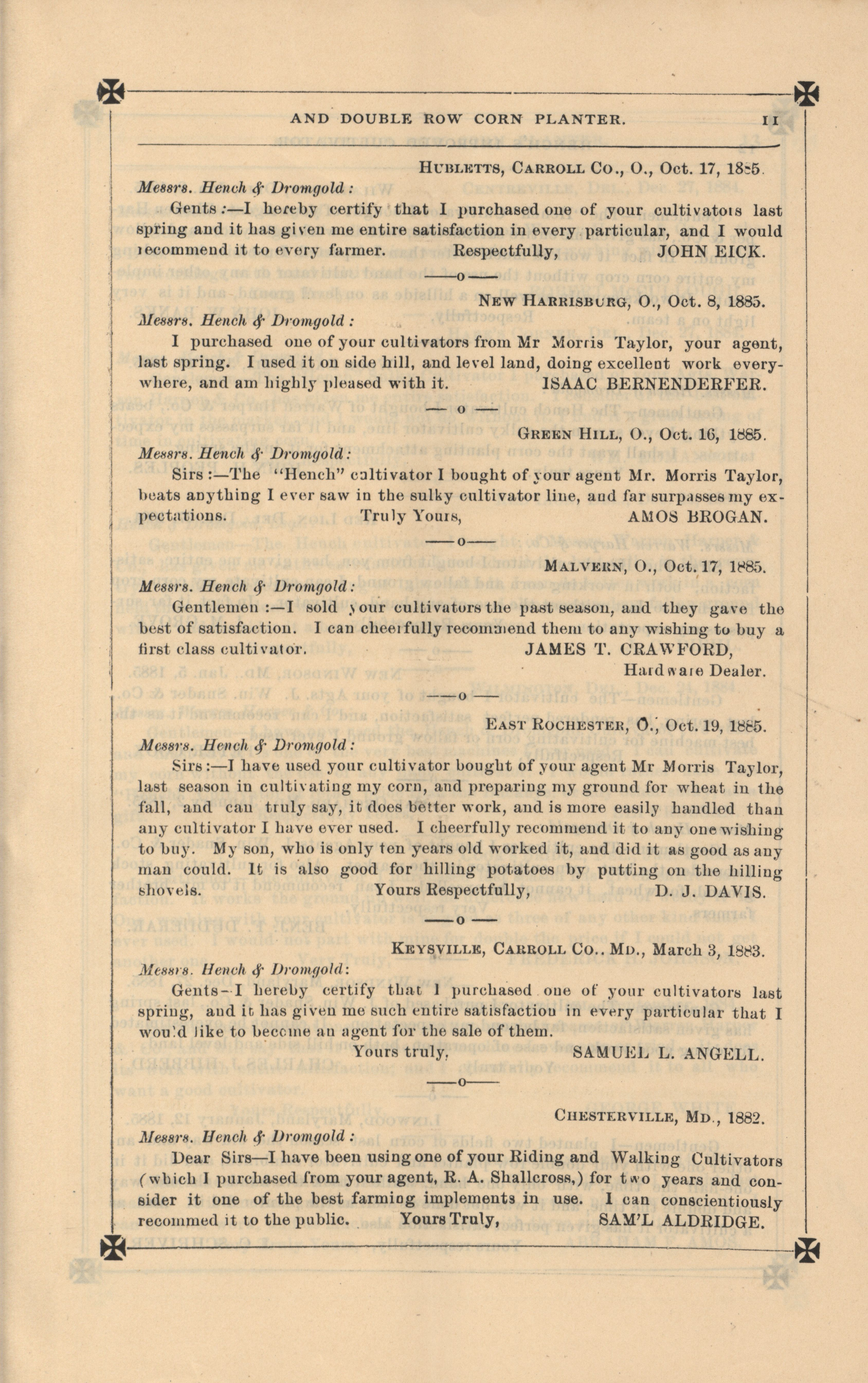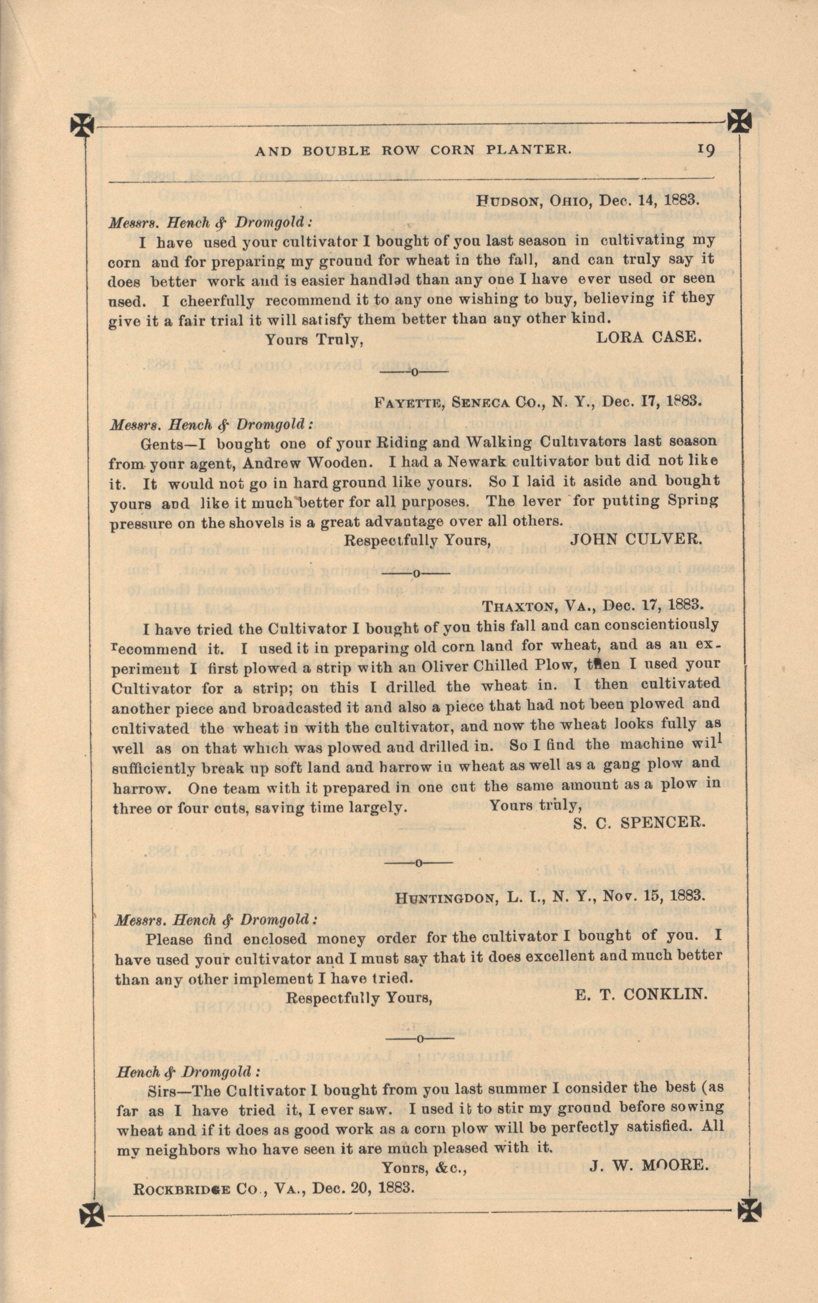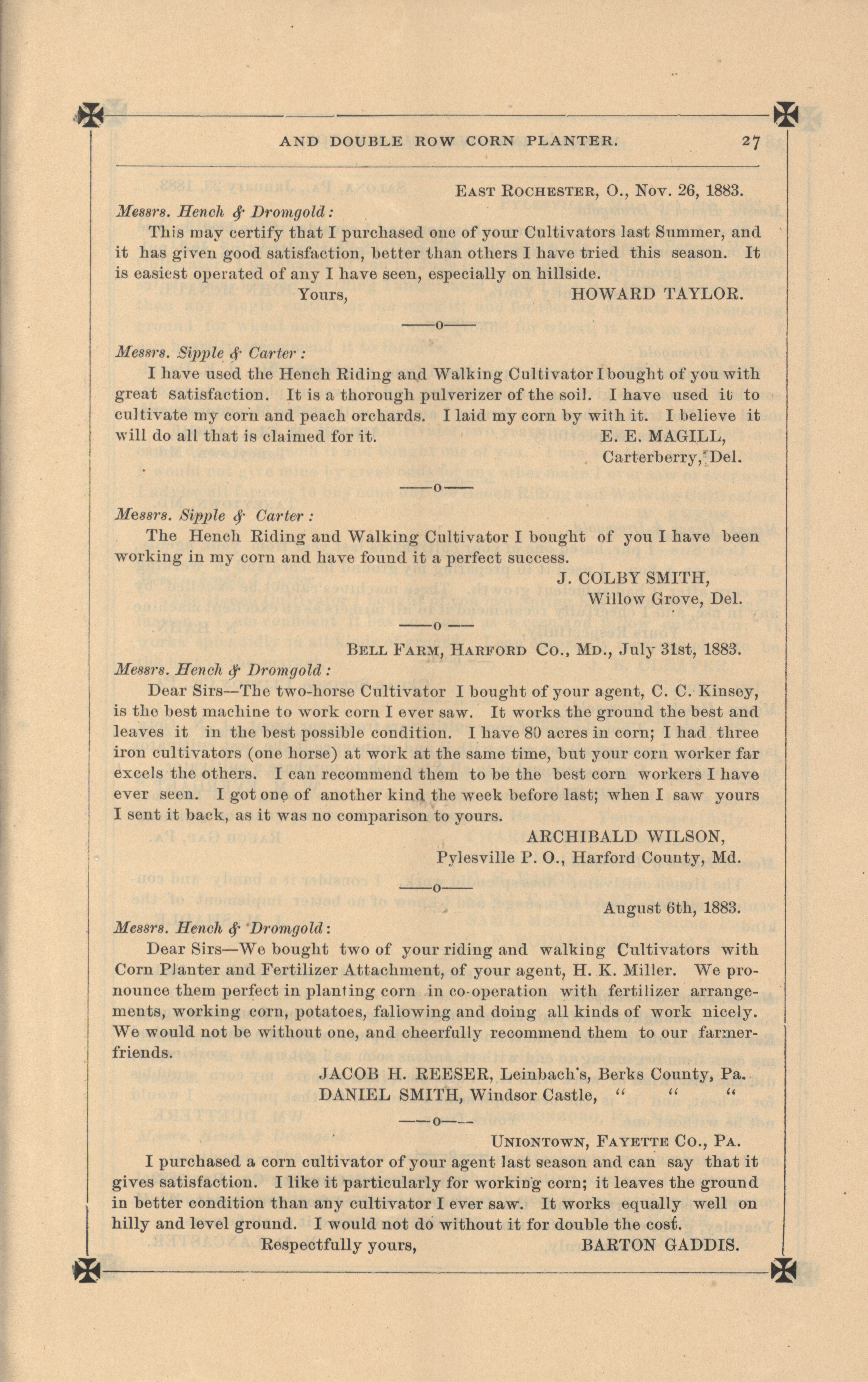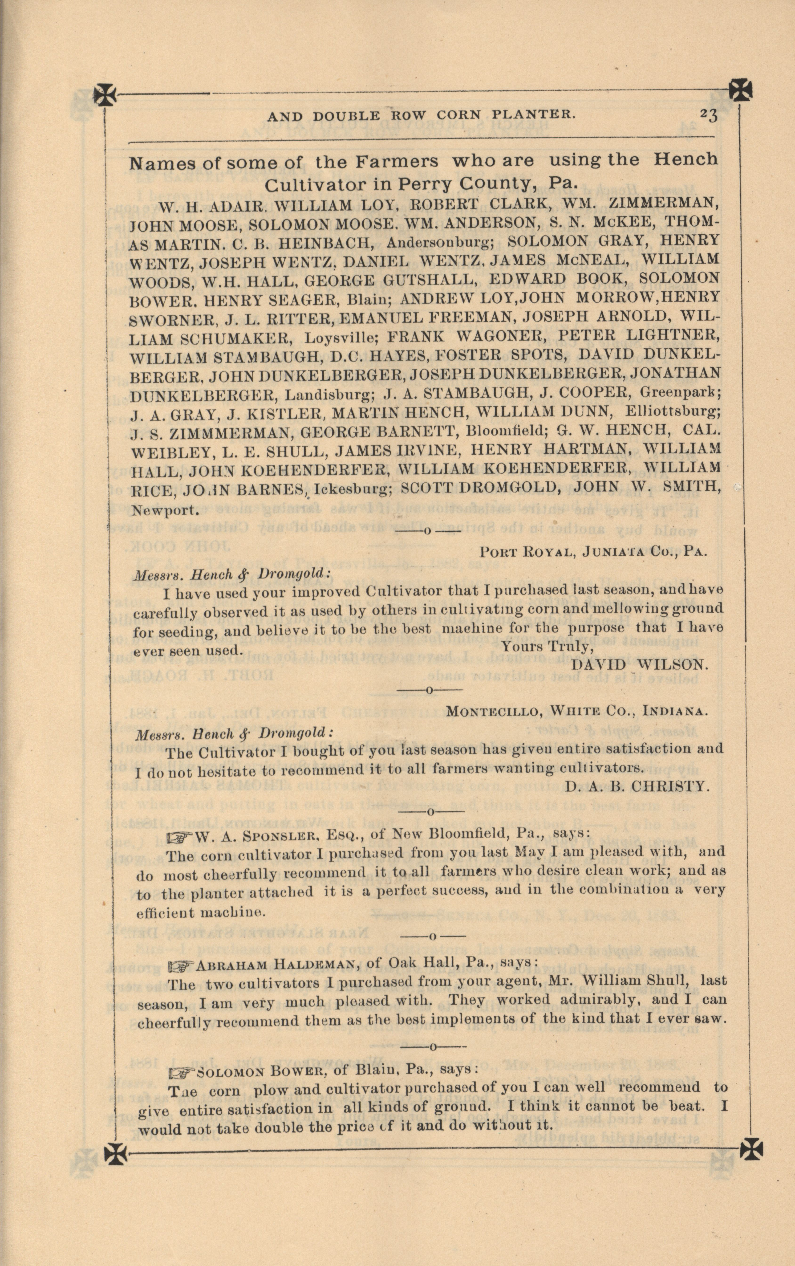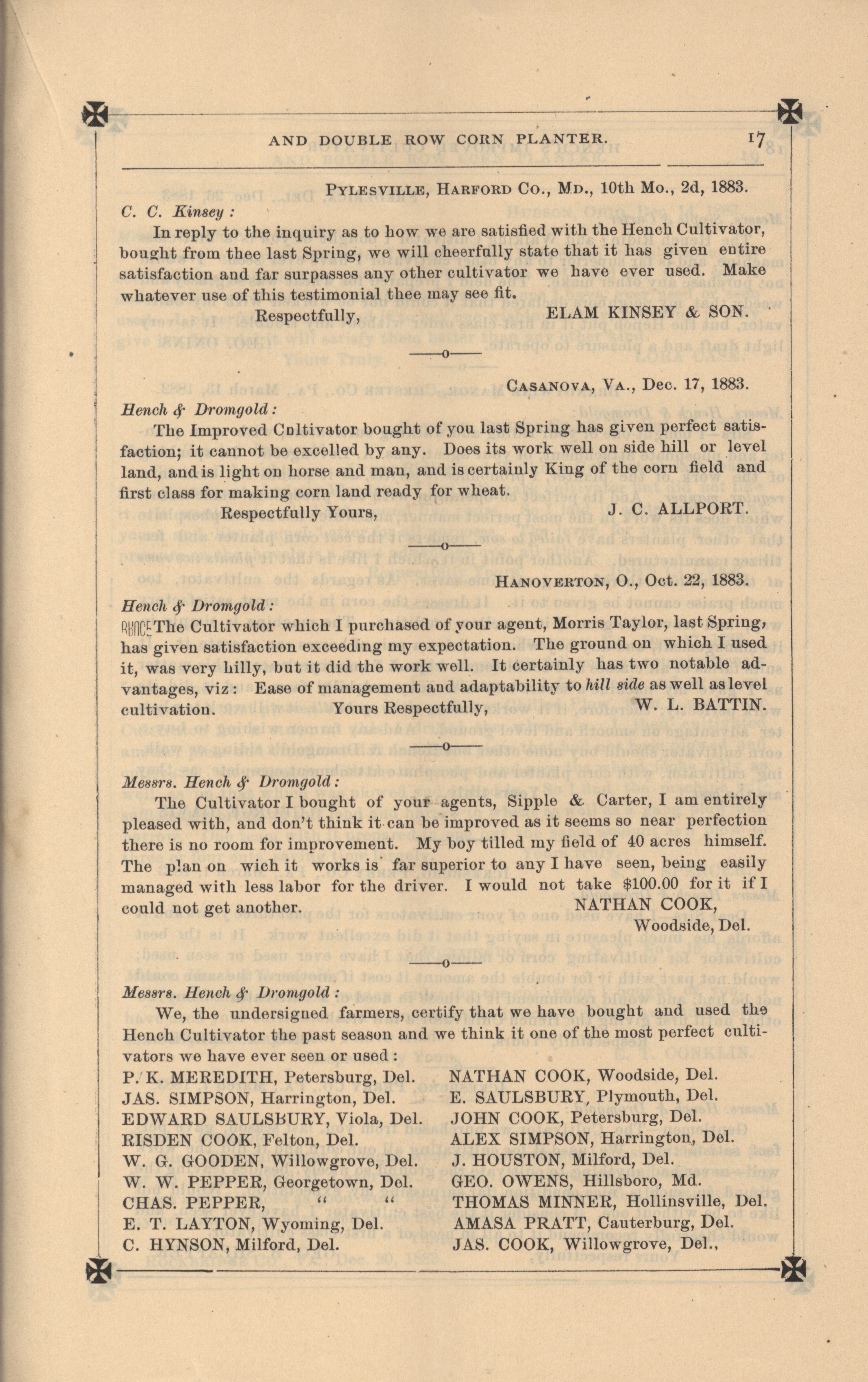 - "Hench's agricultural catalog", Agricultural Machinery Literature Collection, Iowa State University Library Digital Collections