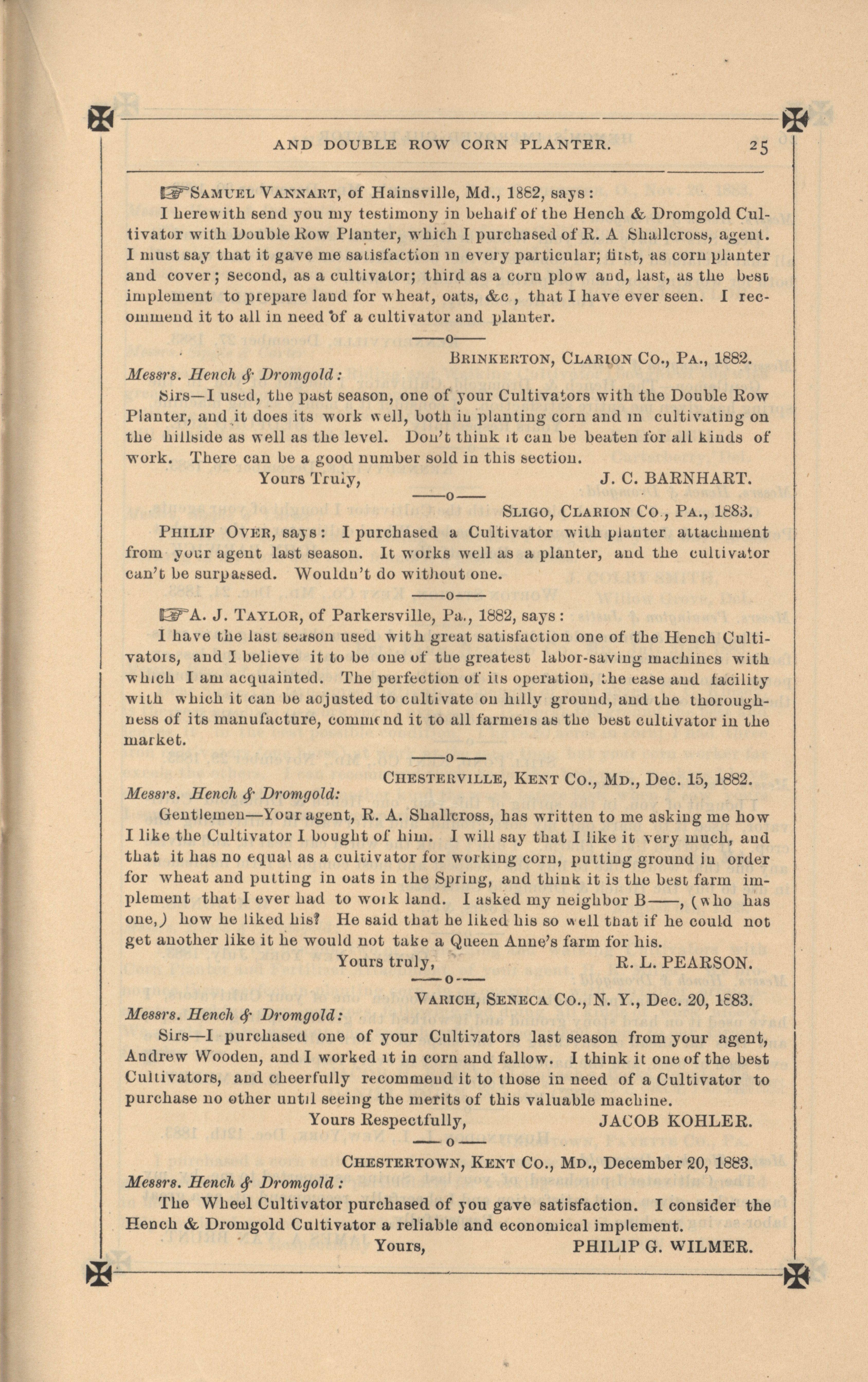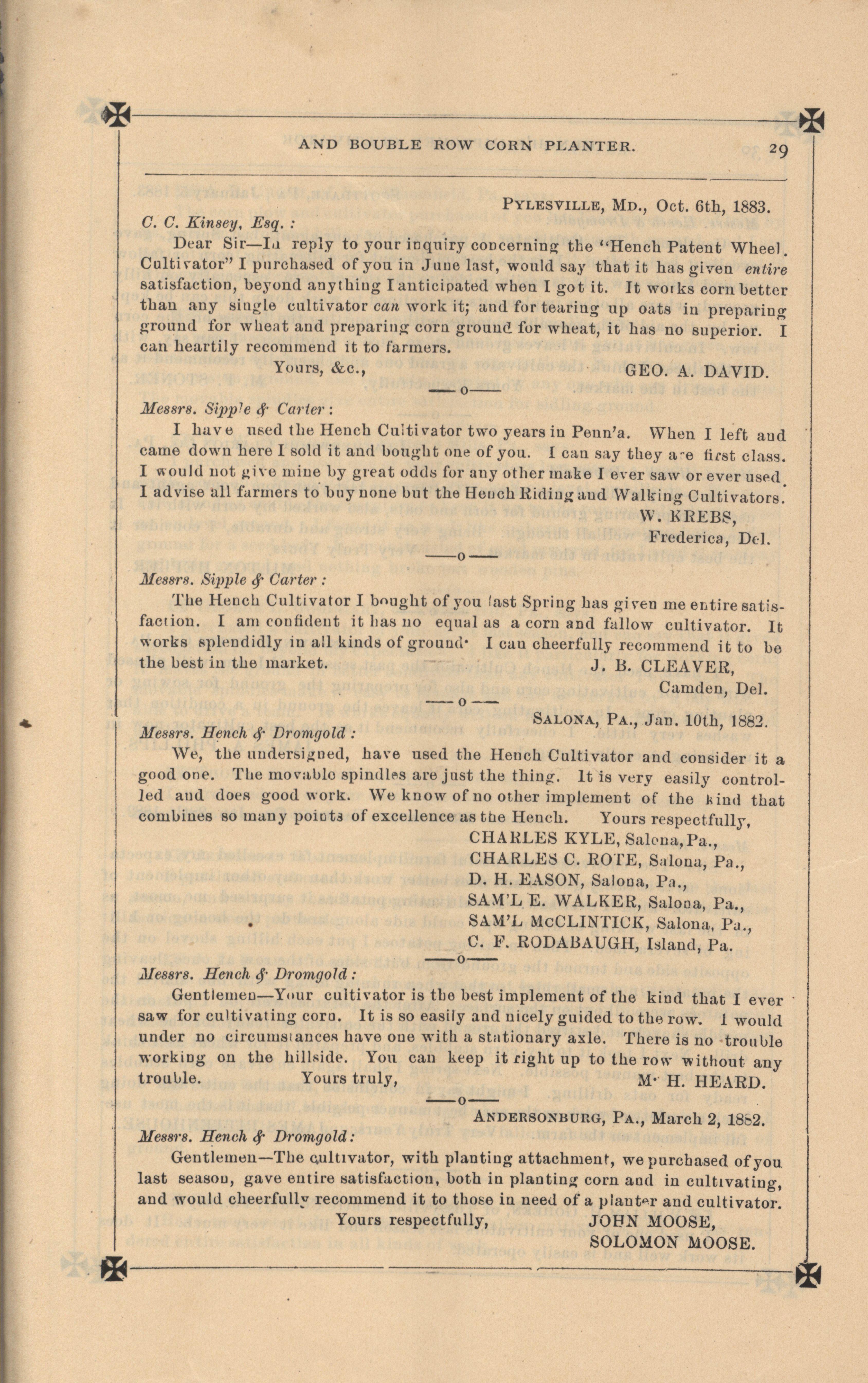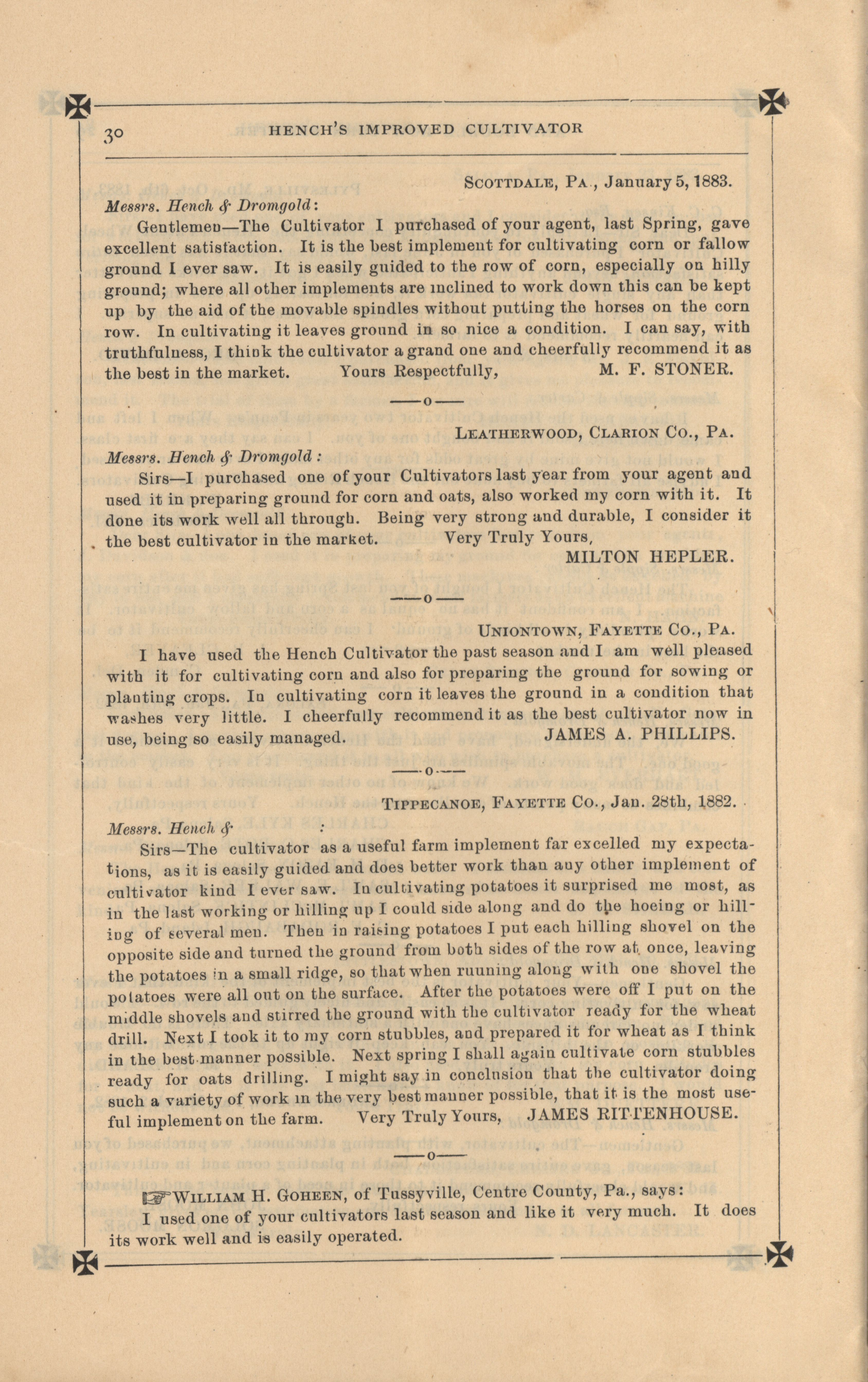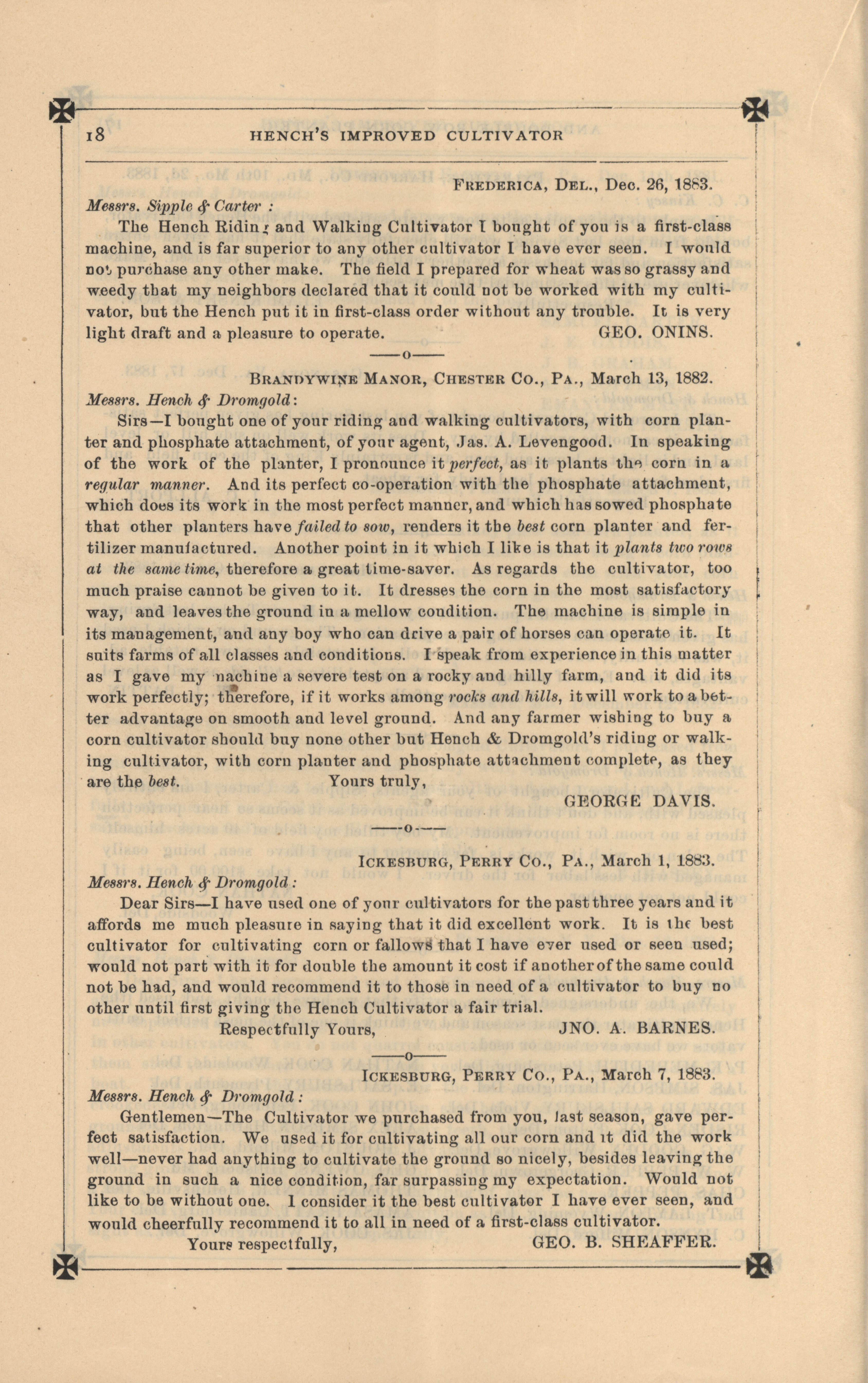 - "Hench's agricultural catalog", Agricultural Machinery Literature Collection, Iowa State University Library Digital Collections