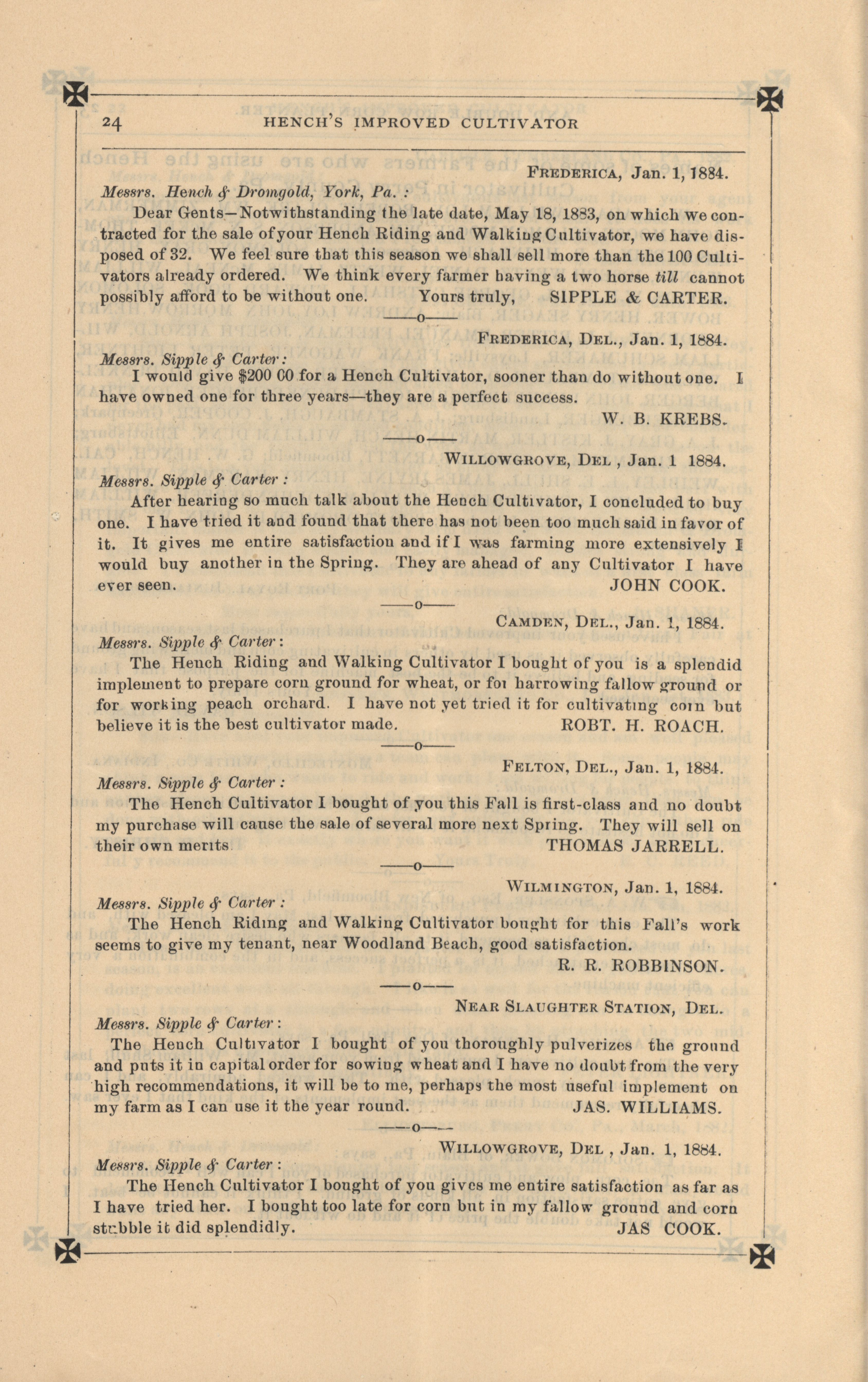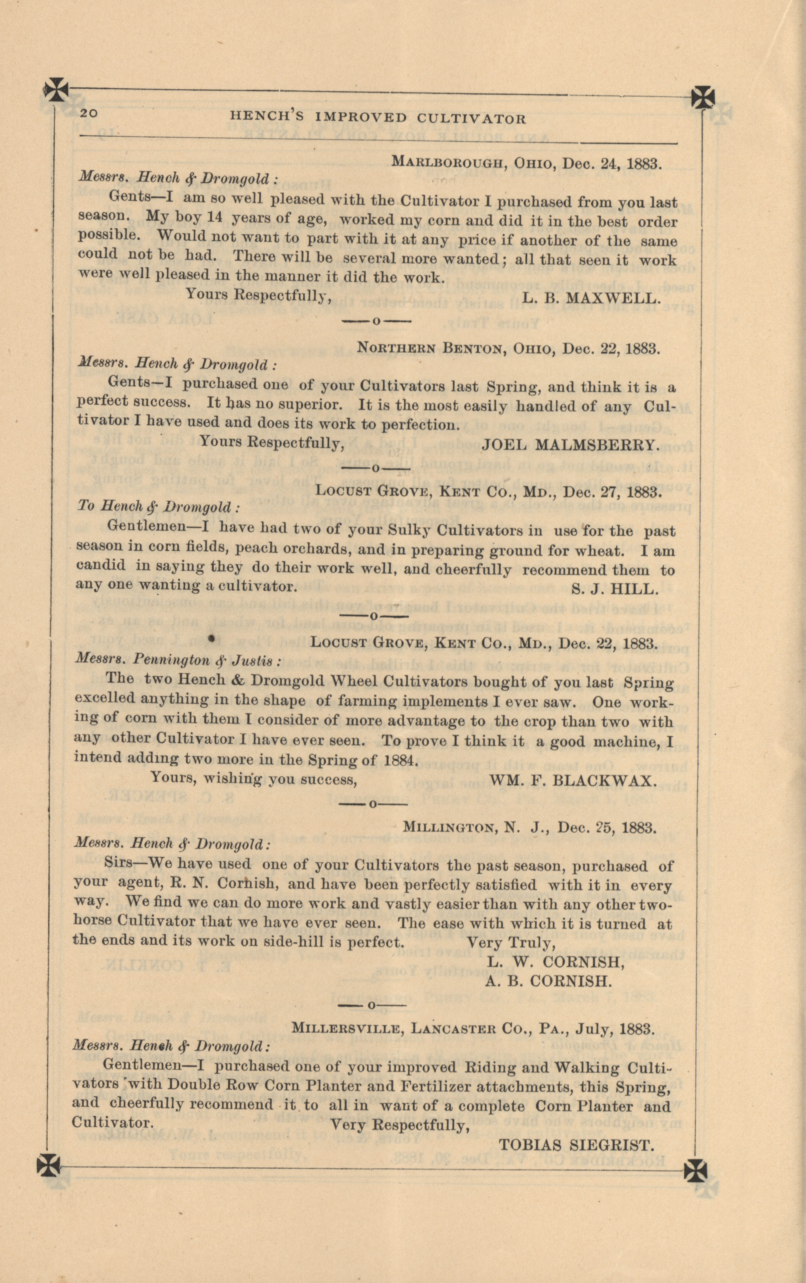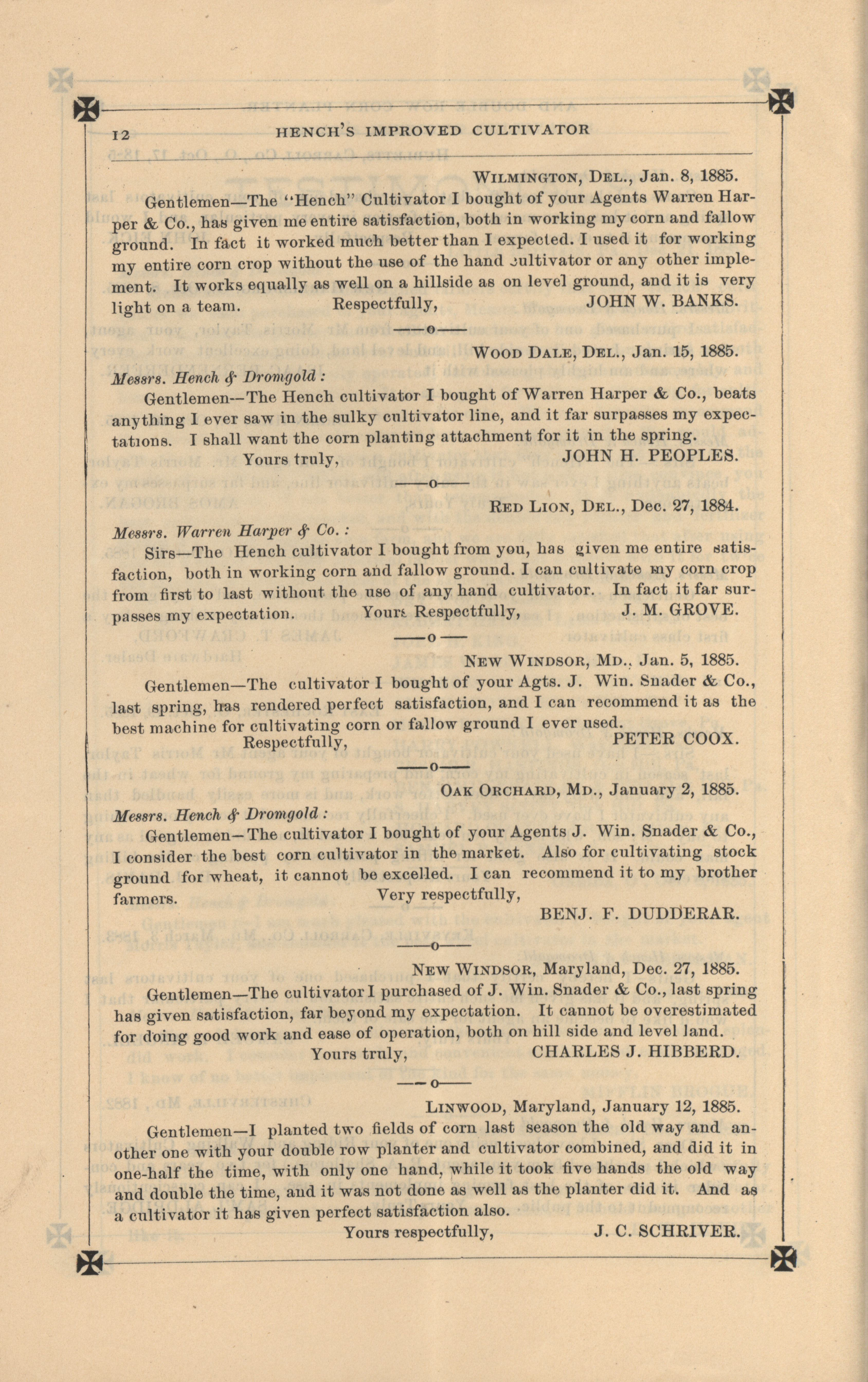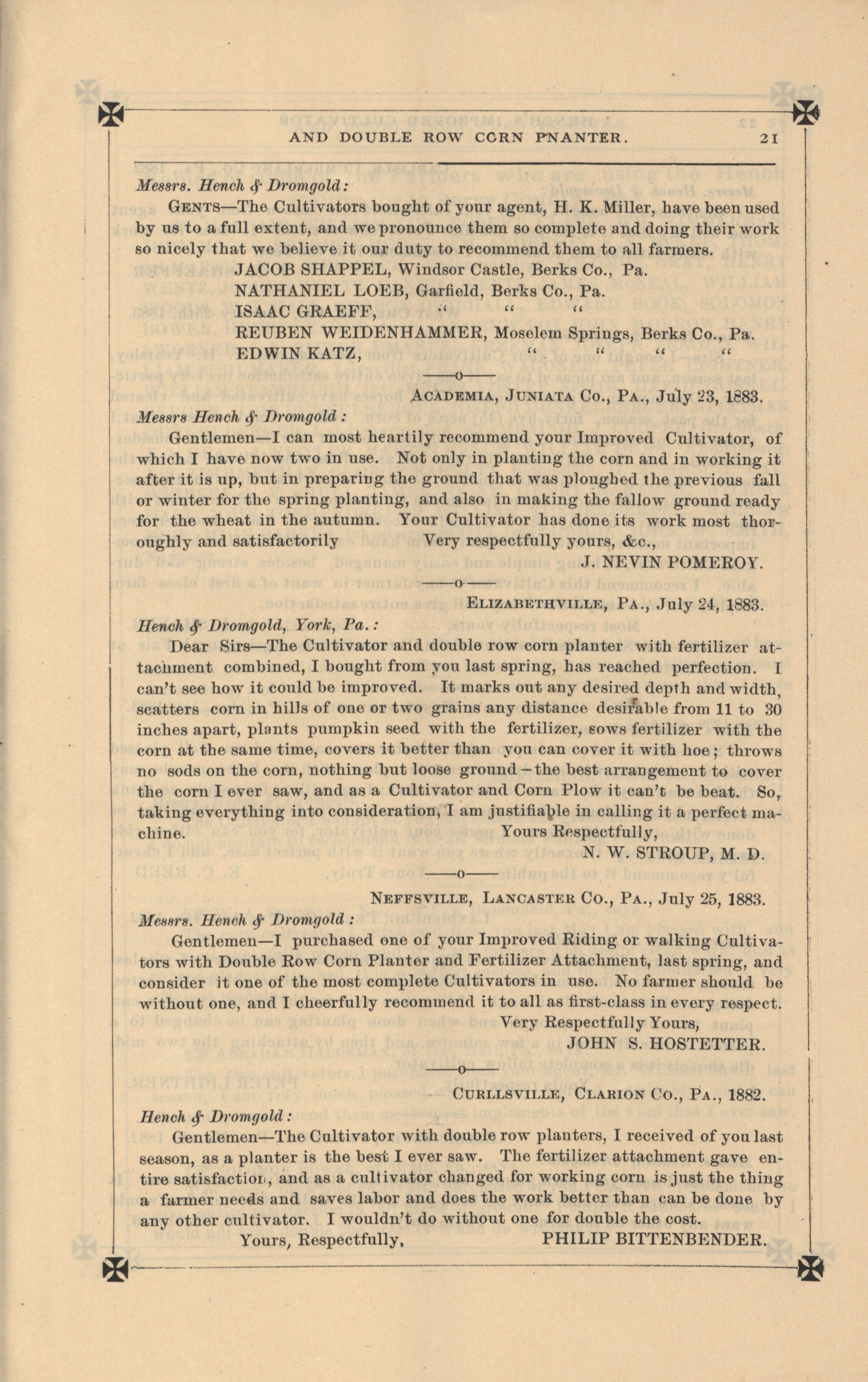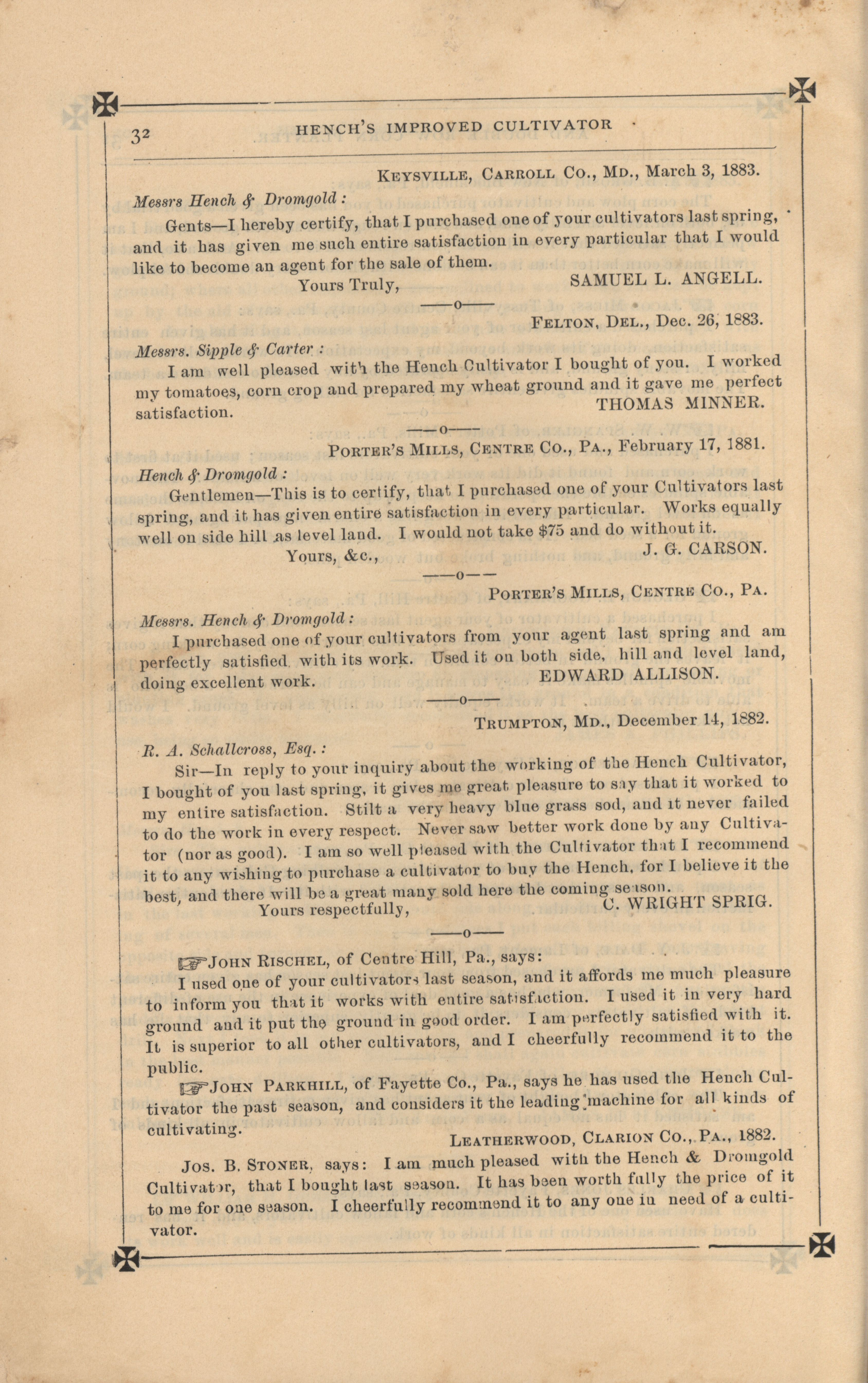 - "Hench's agricultural catalog", Agricultural Machinery Literature Collection, Iowa State University Library Digital Collections