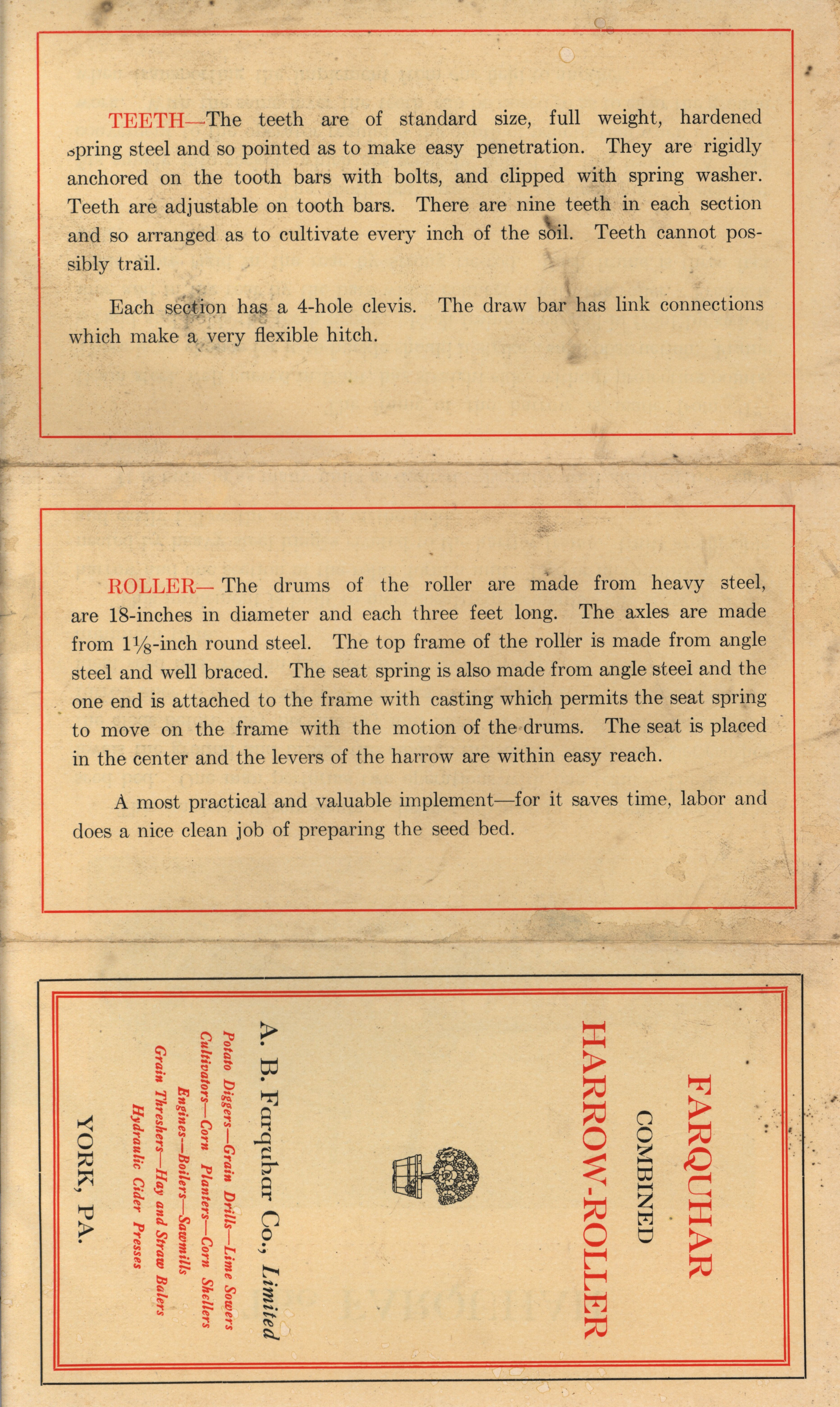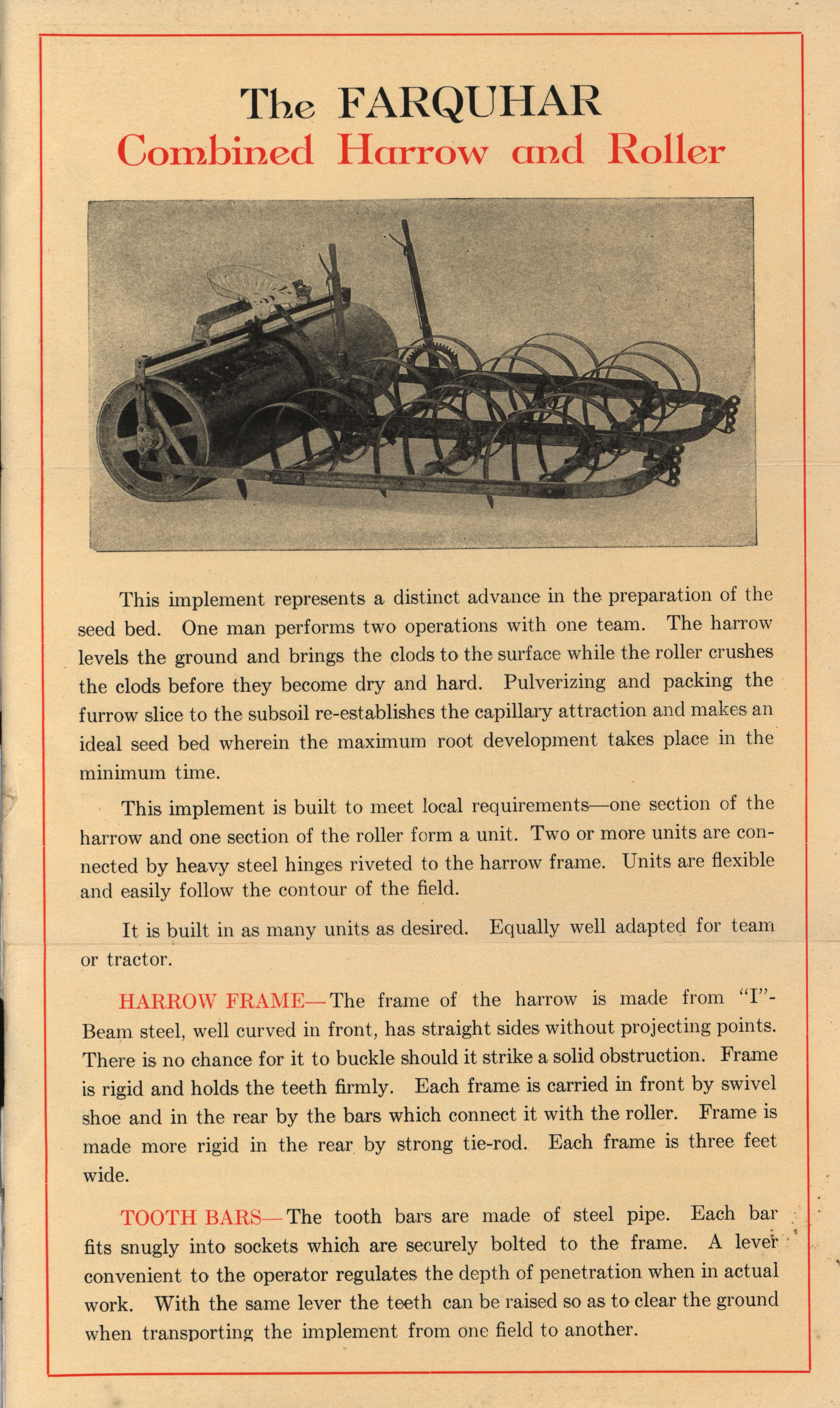 - Double-sided informational pamphlet describing the Farquhar Combined Harrow-Roller. Details include different parts of the agricultural machinery including the harrow frame, tooth bars, teeth, and roller.
