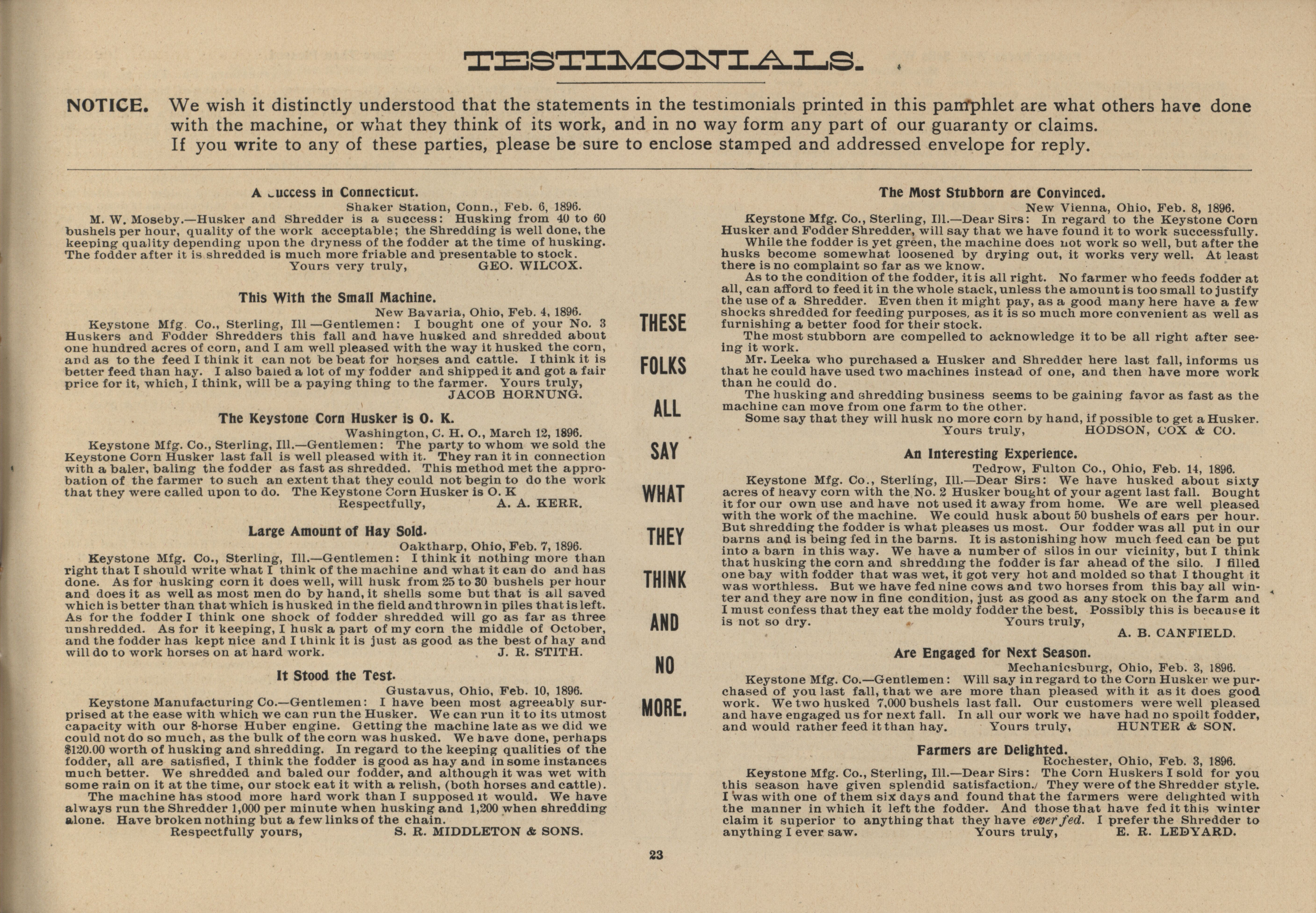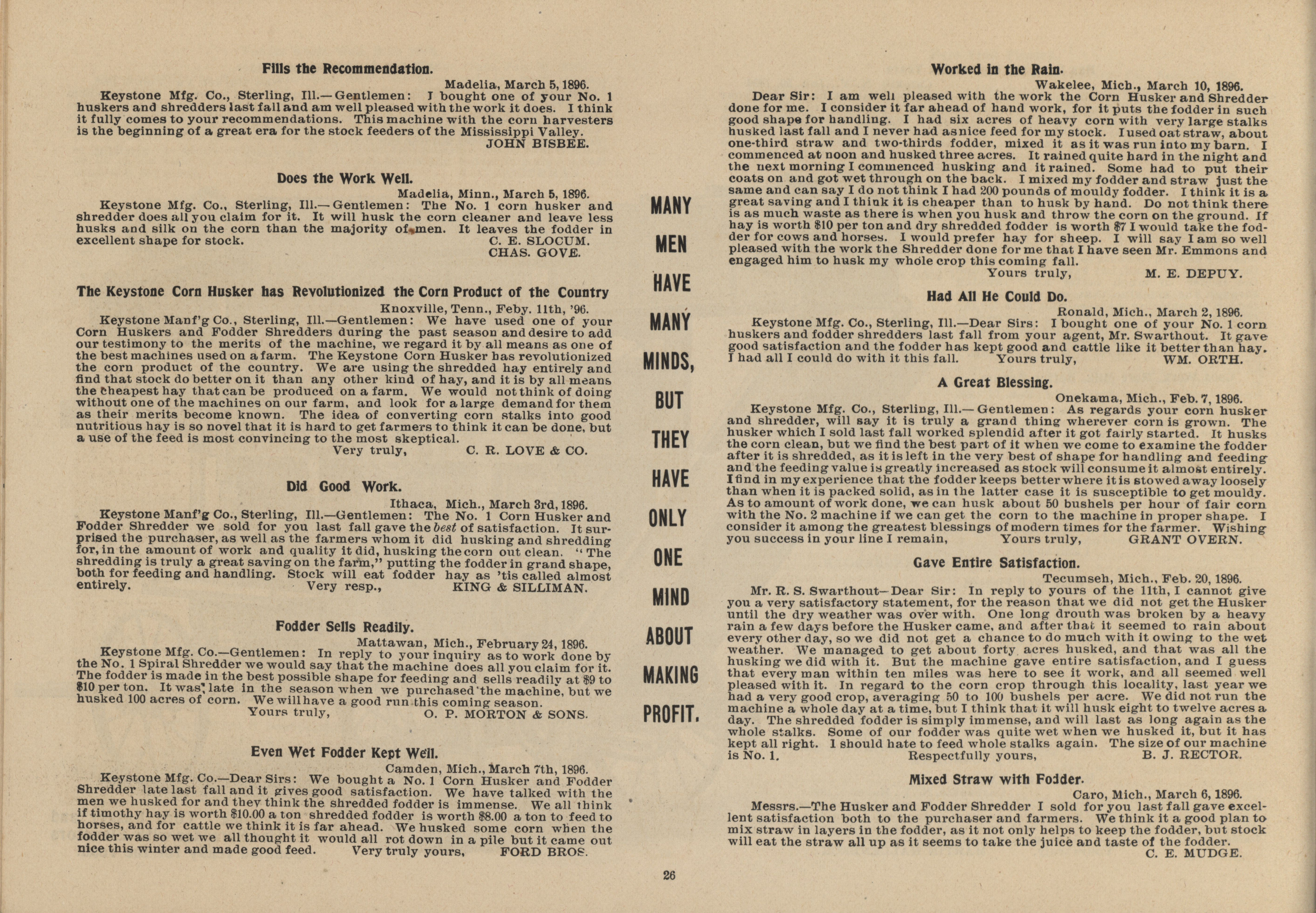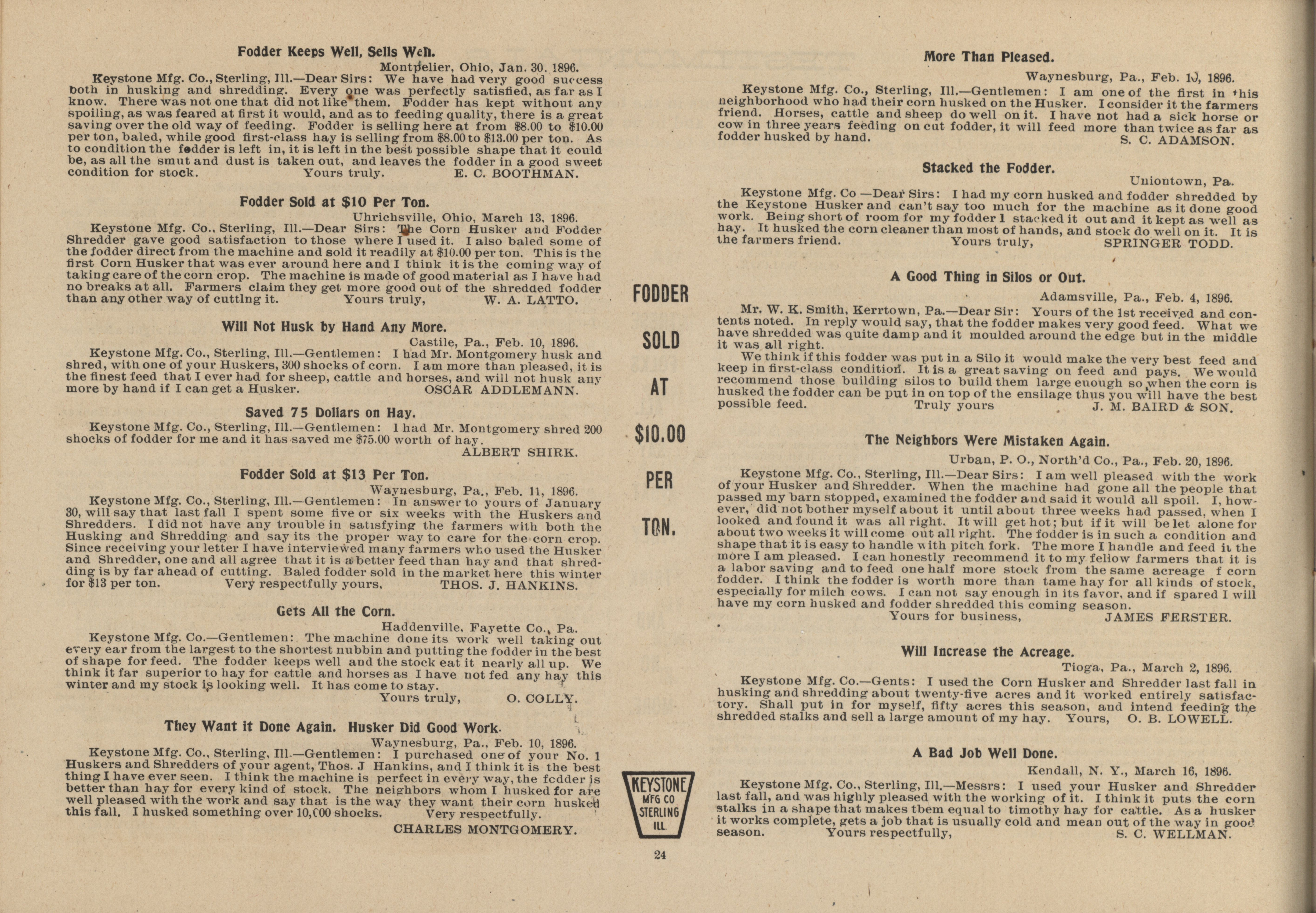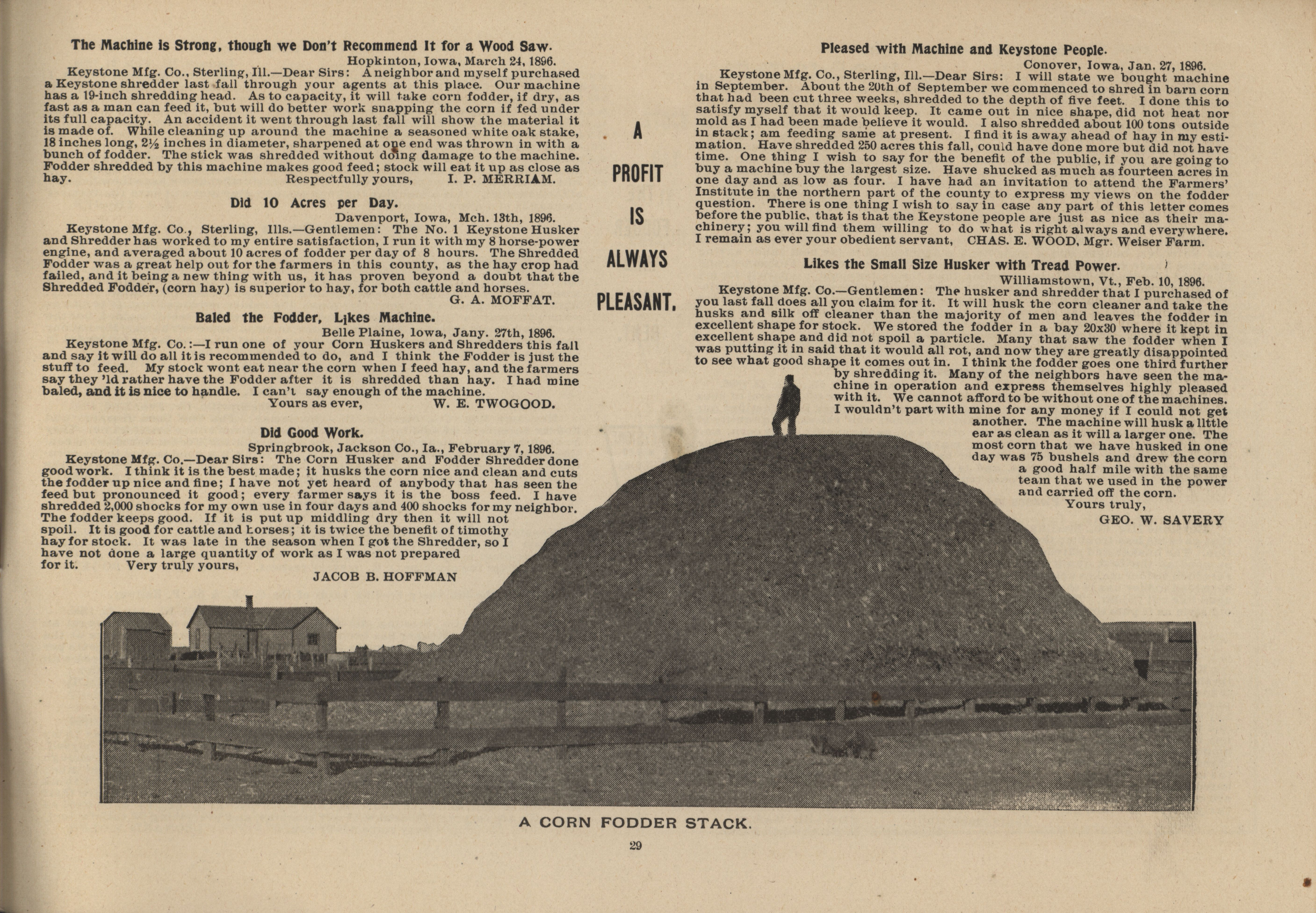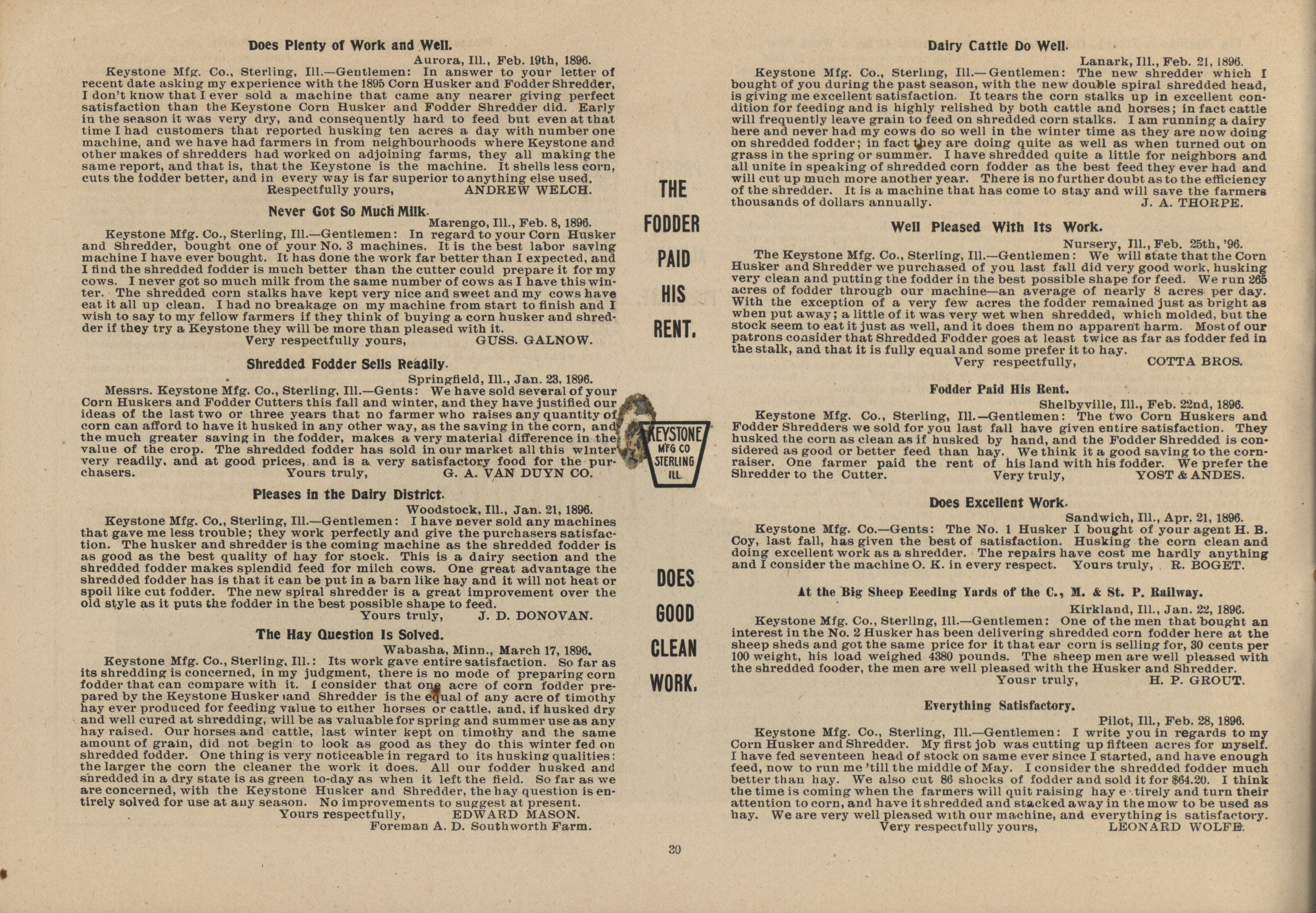 - A booklet containing anecdotes about purchasing Keystone Manufacturing's agricultural machinery.