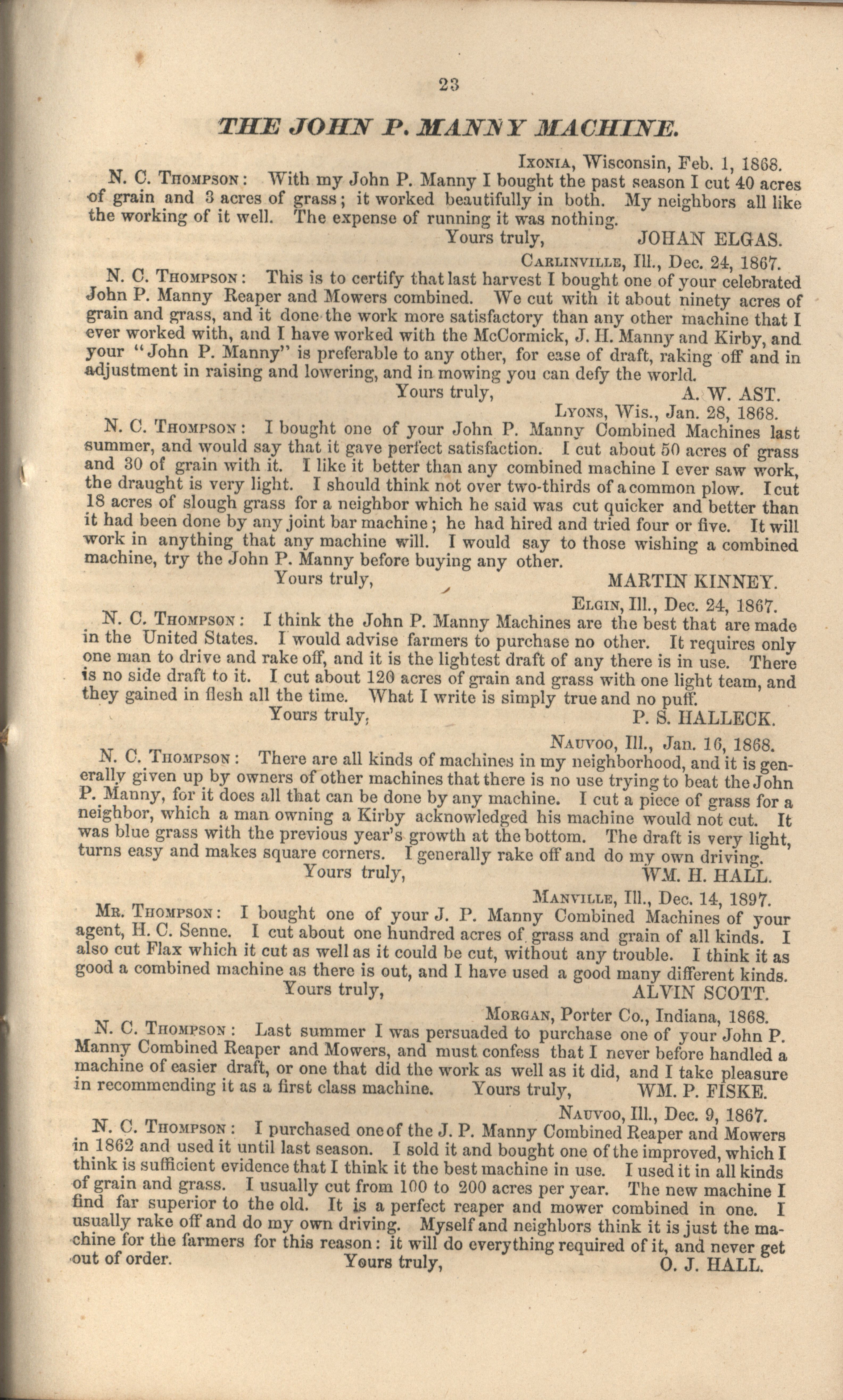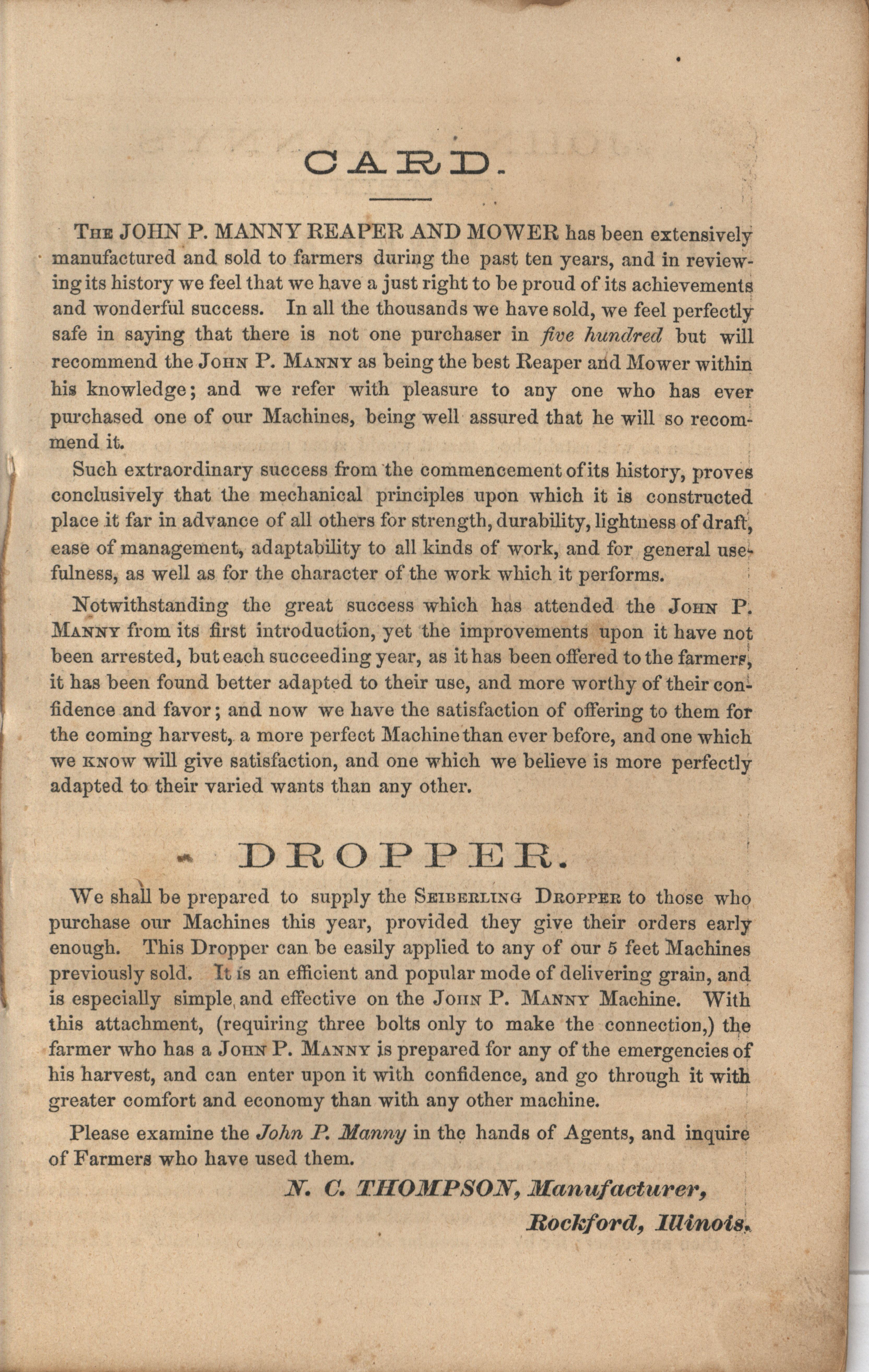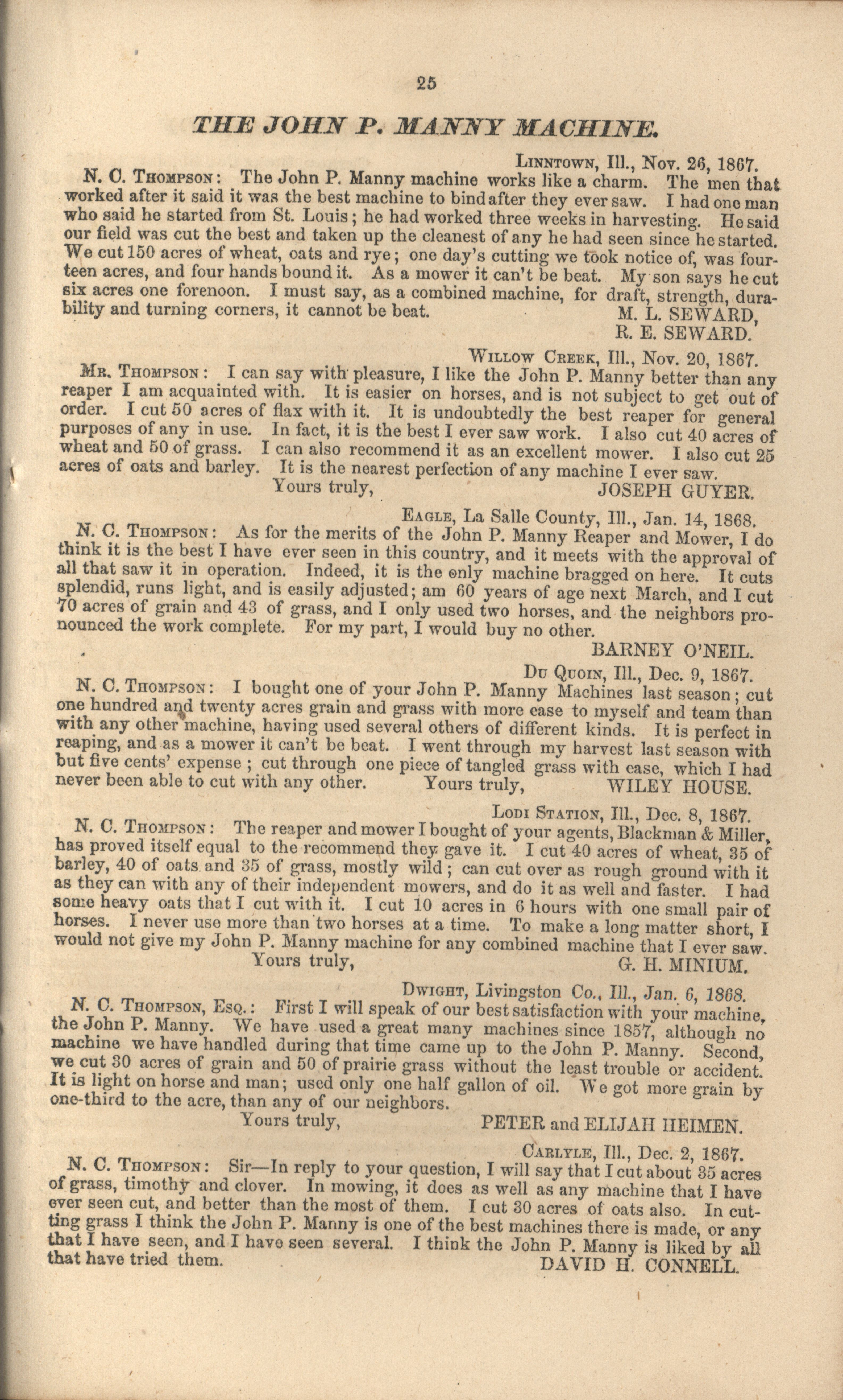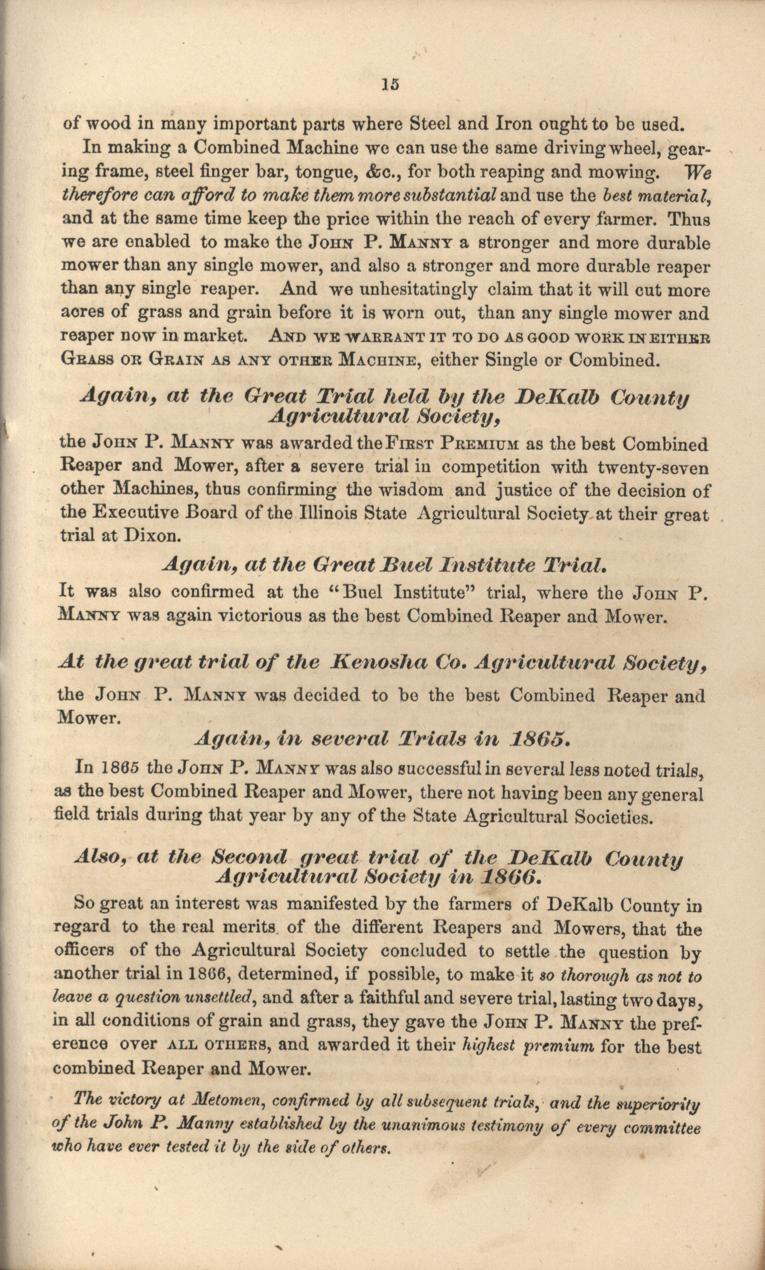 - "John P. Manny's combination mower, reaper, hand-raker and dropper catalog", Agricultural Machinery Literature Collection, Iowa State University Library Digital Collections