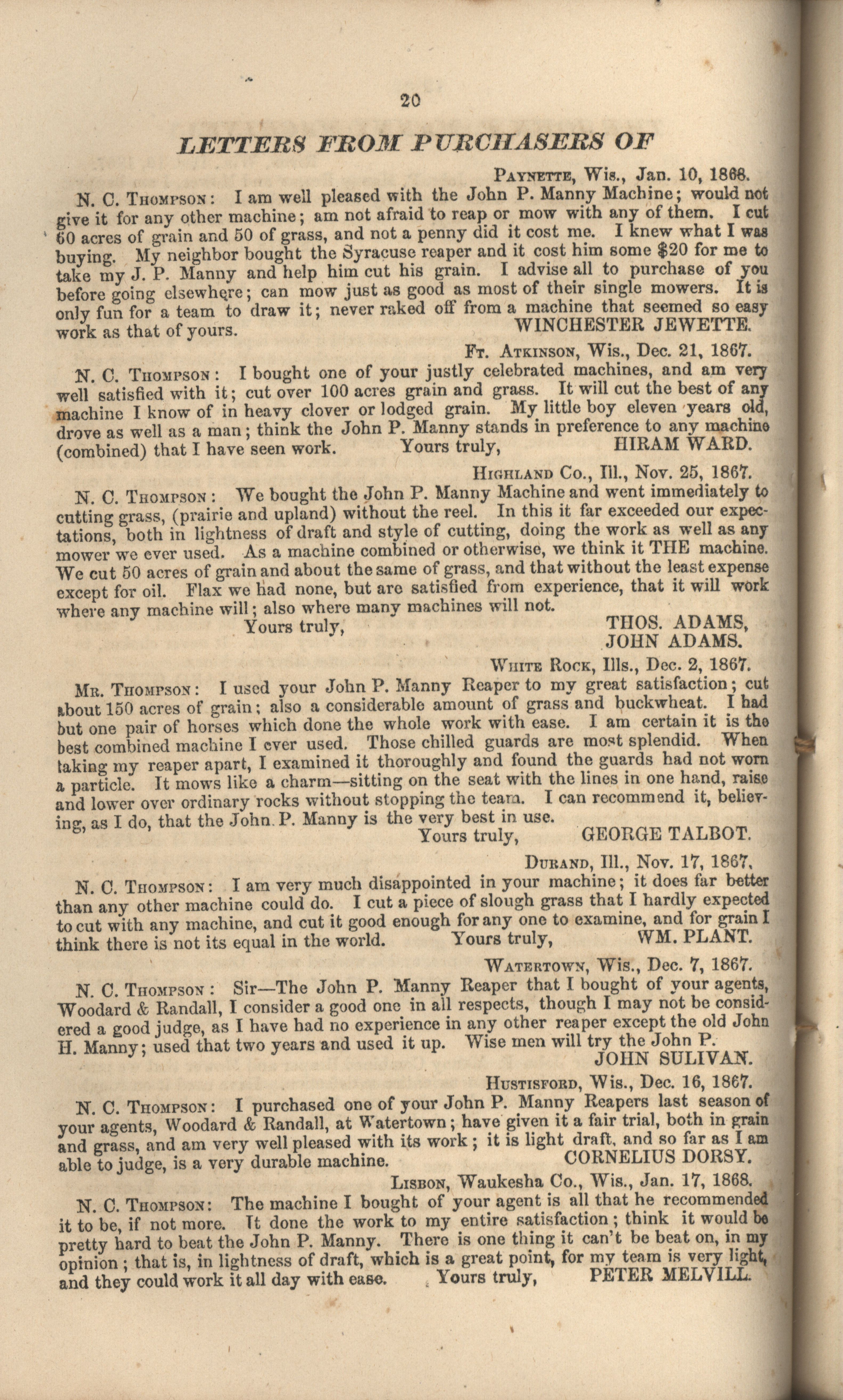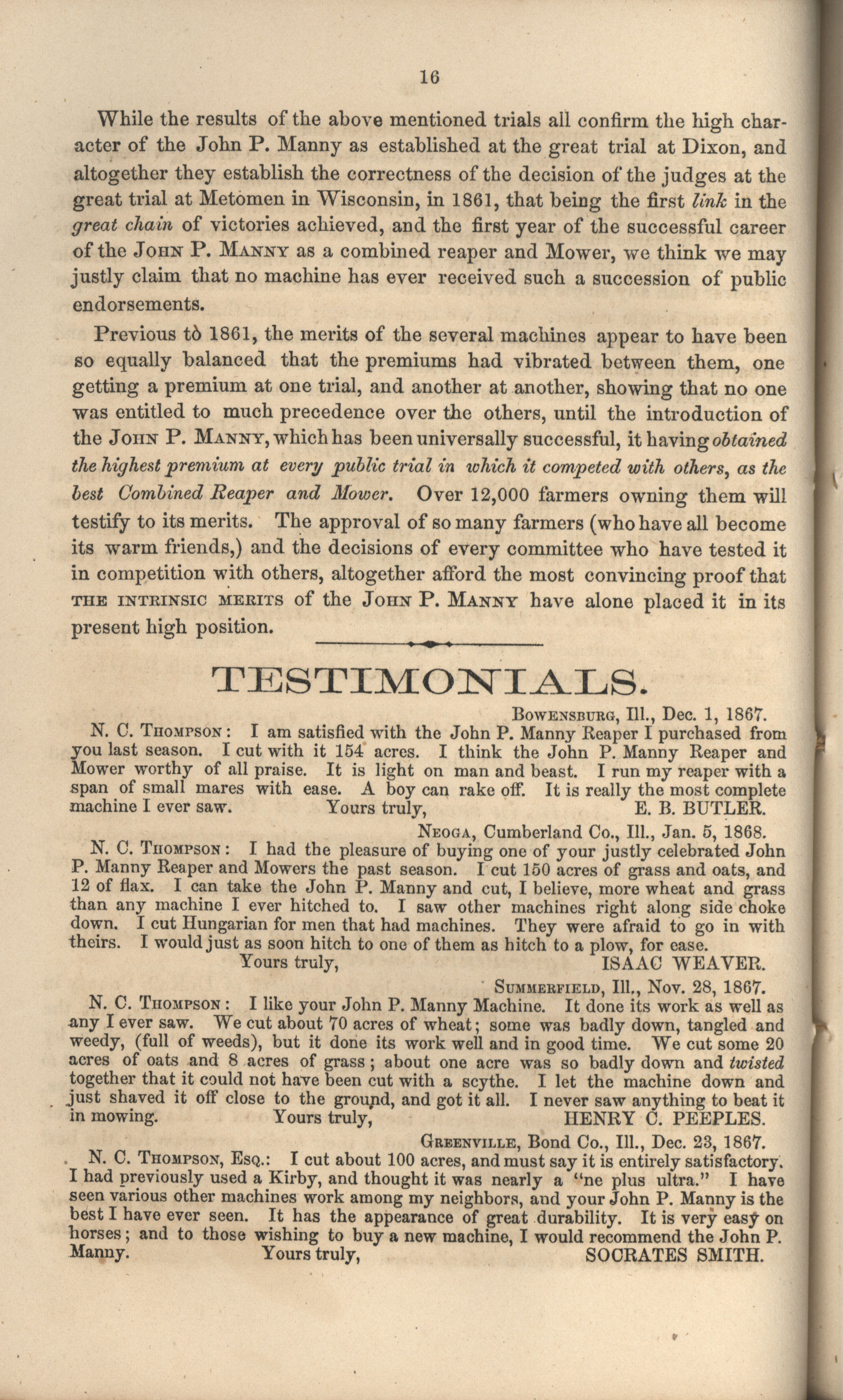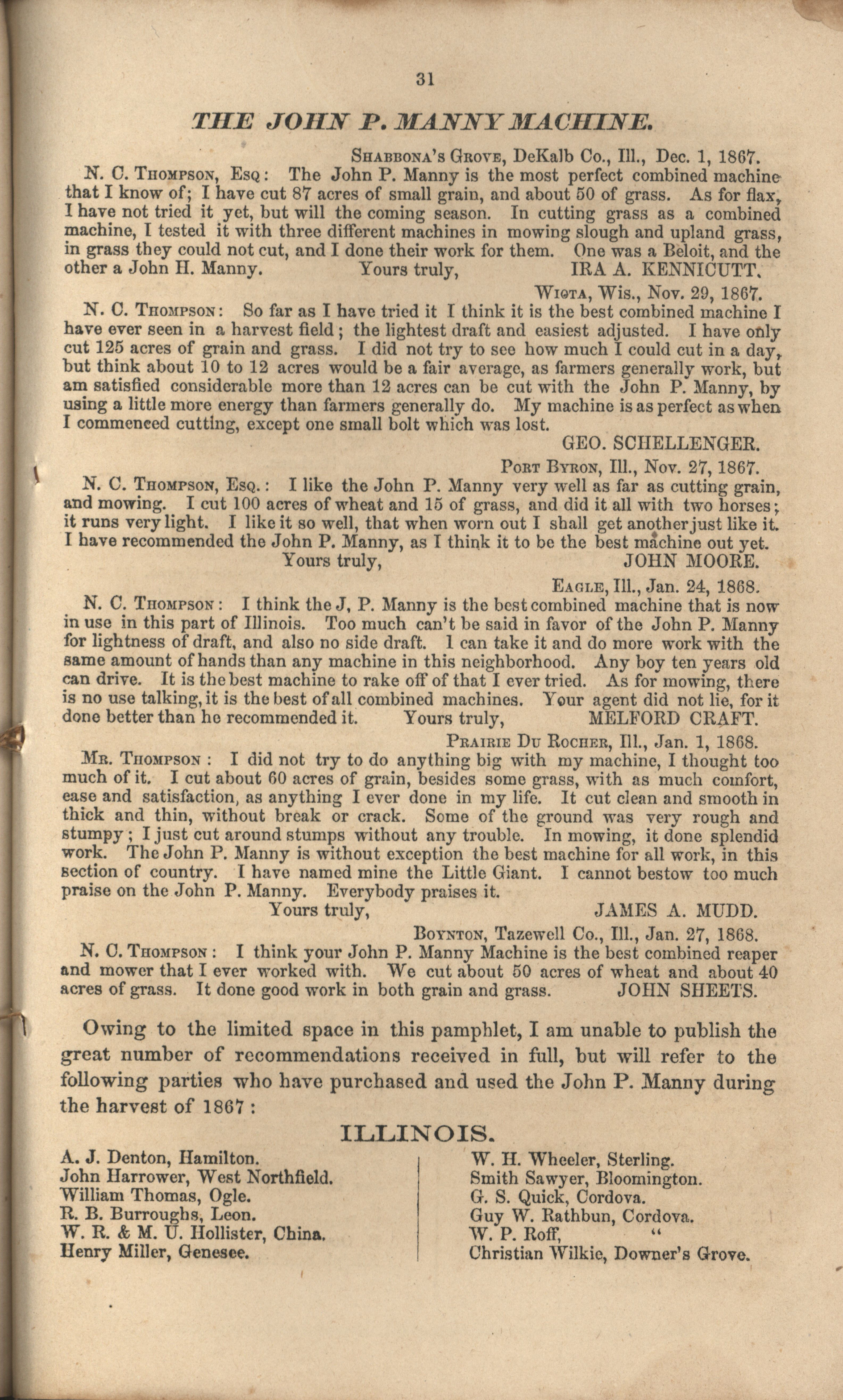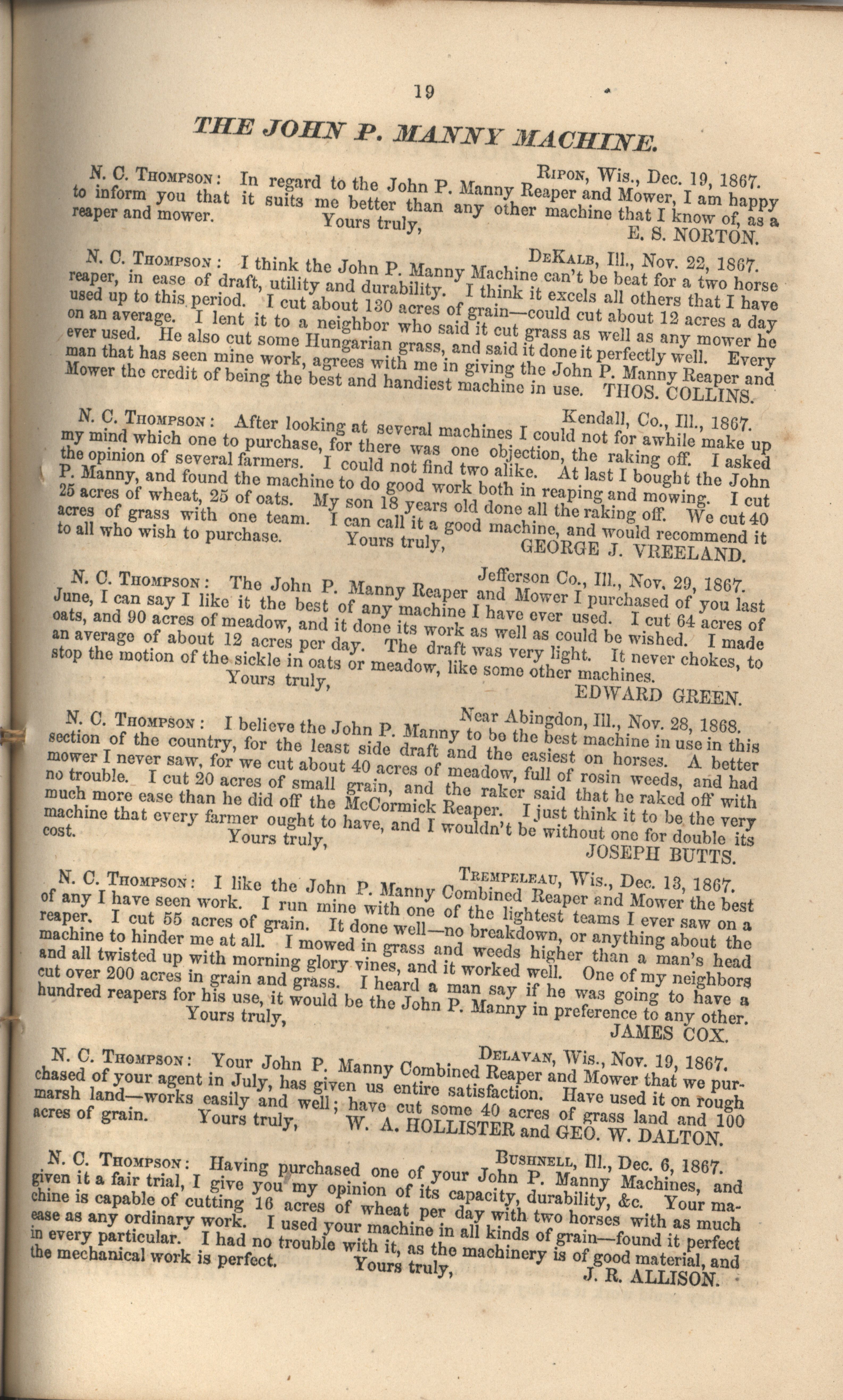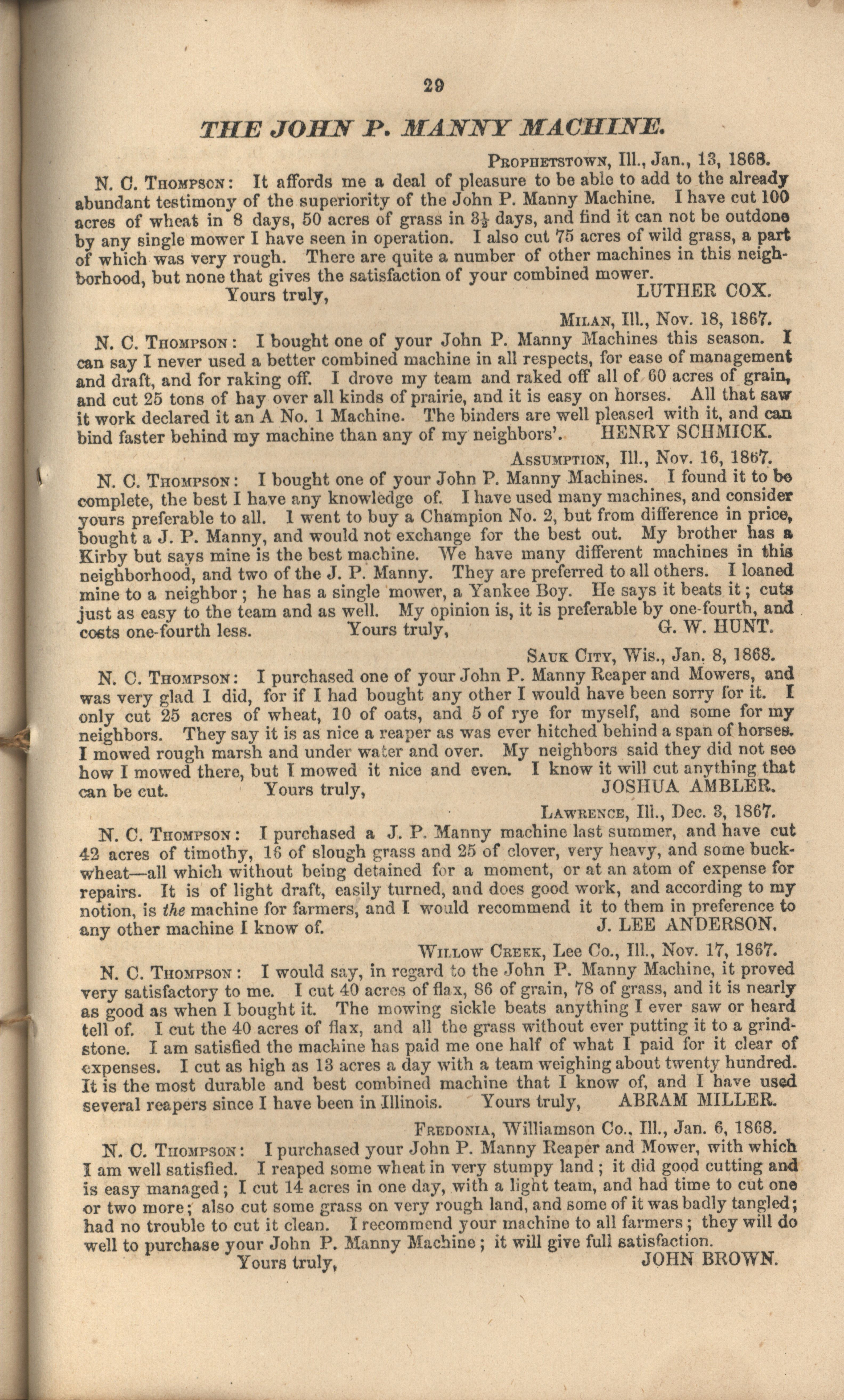 - "John P. Manny's combination mower, reaper, hand-raker and dropper catalog", Agricultural Machinery Literature Collection, Iowa State University Library Digital Collections