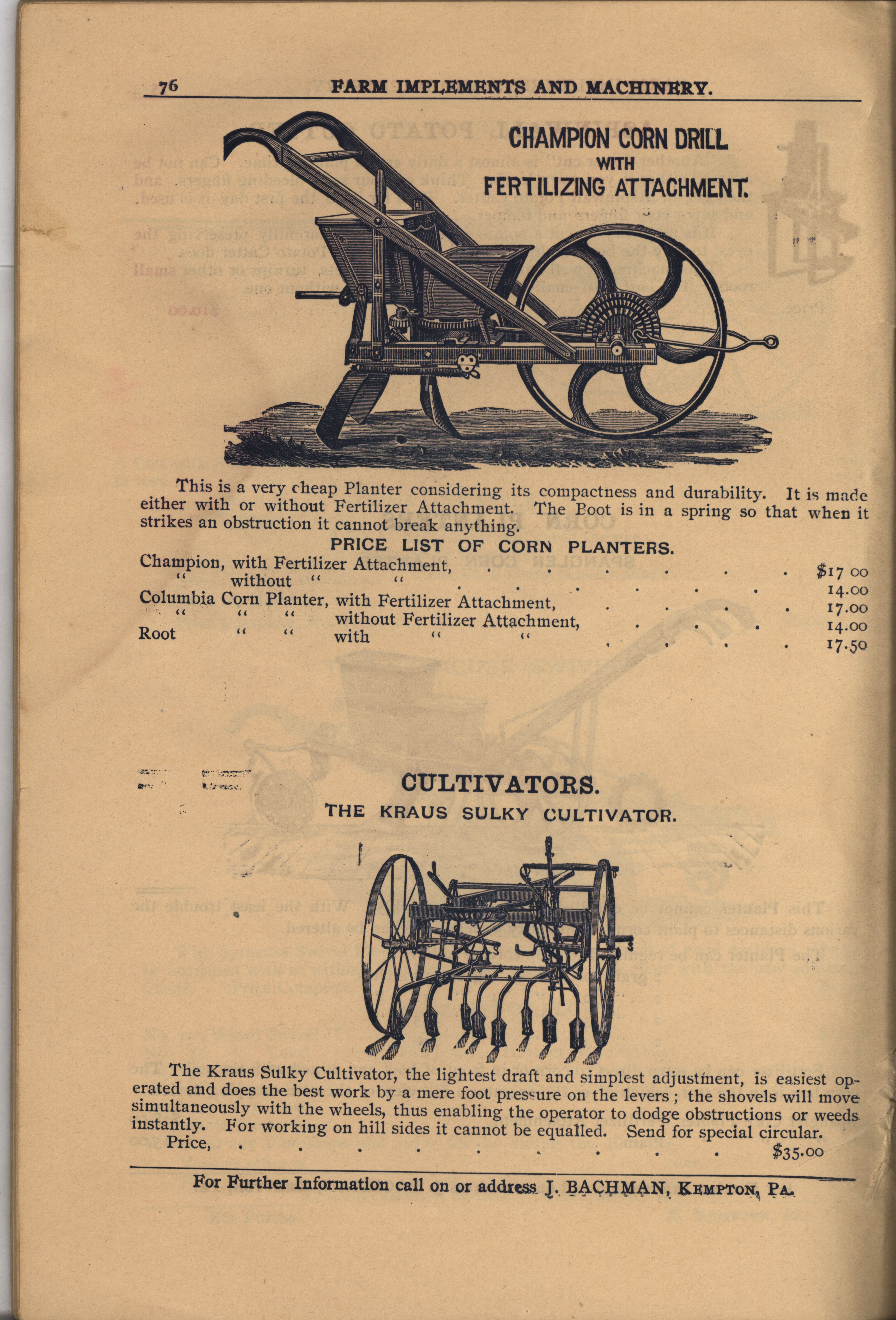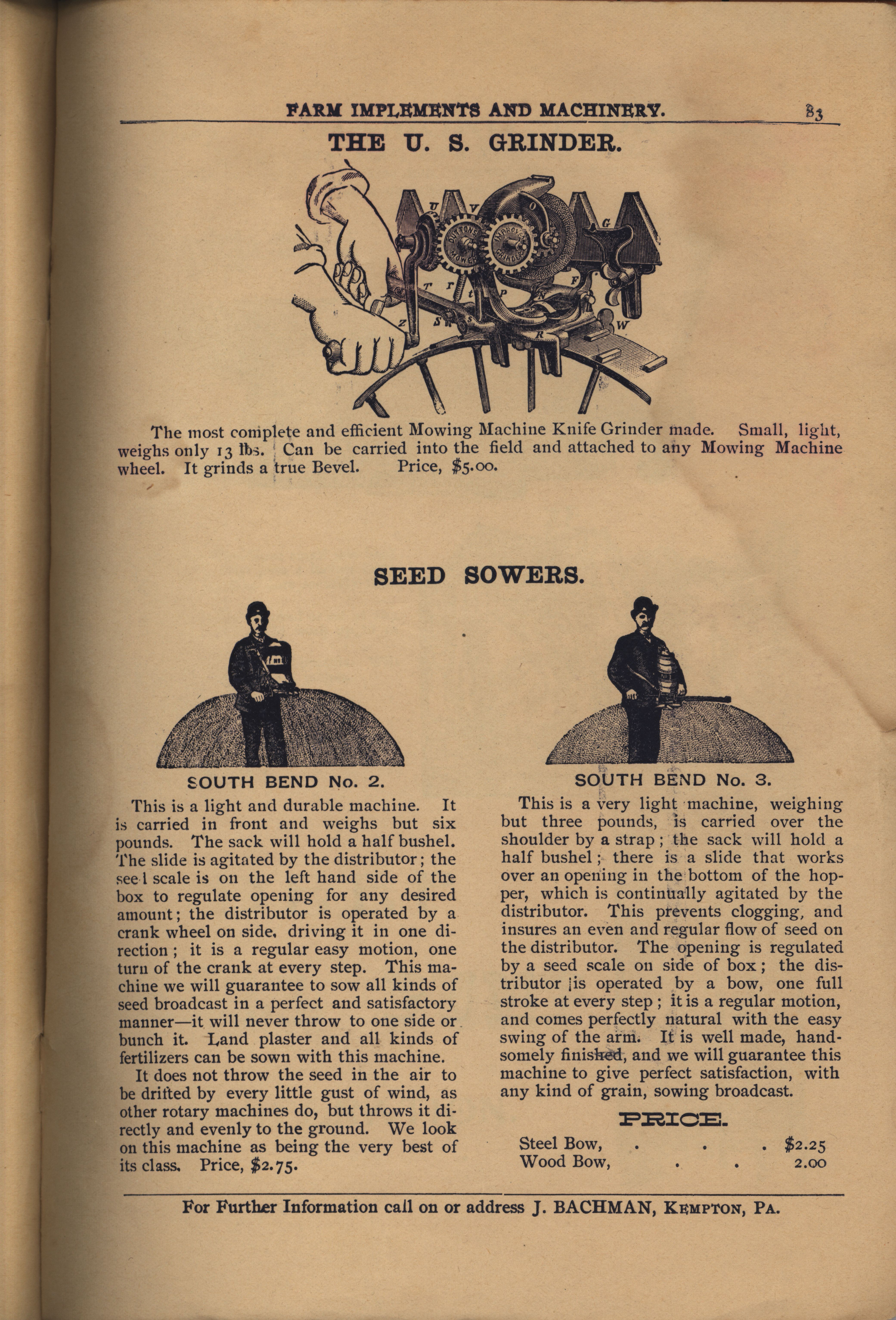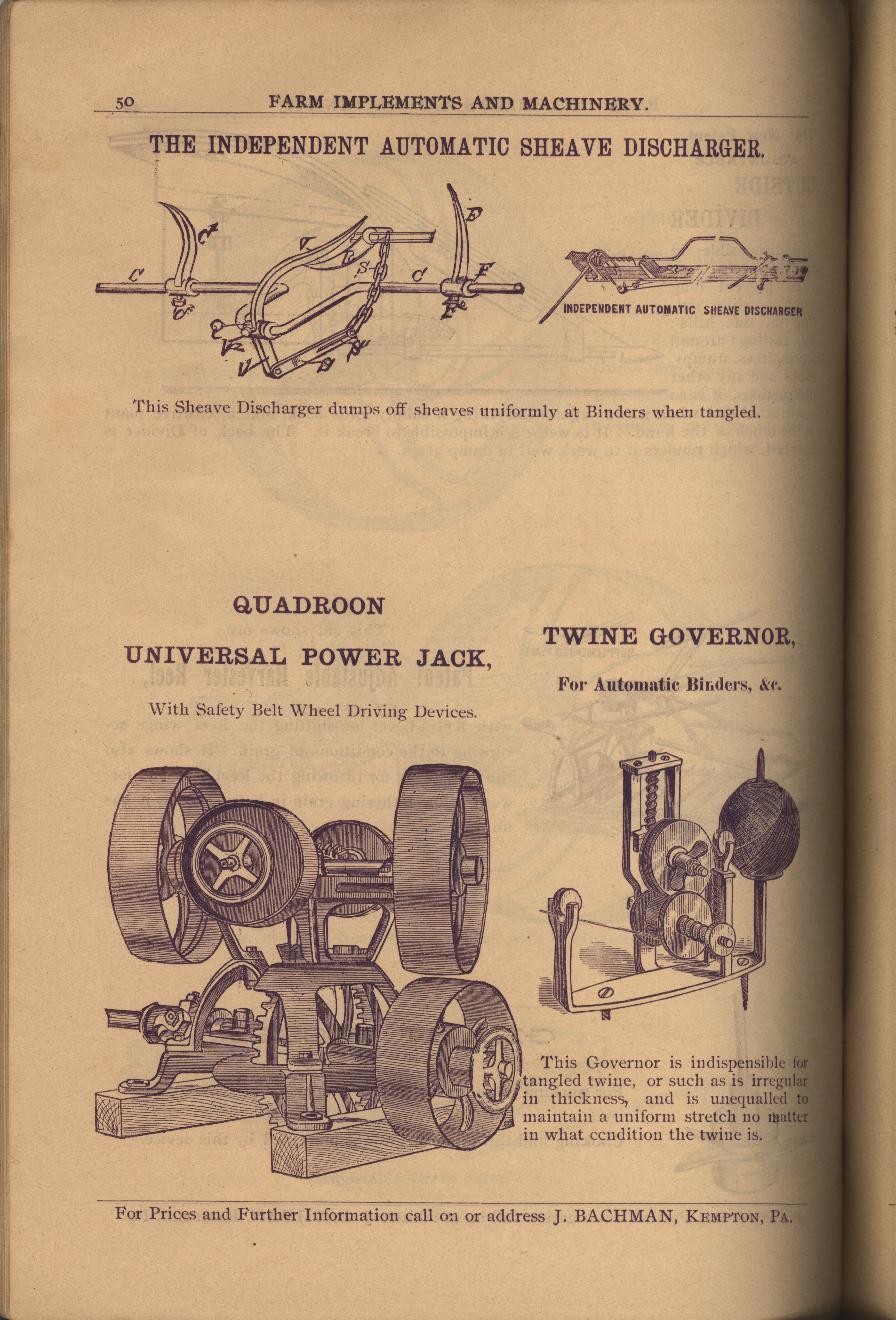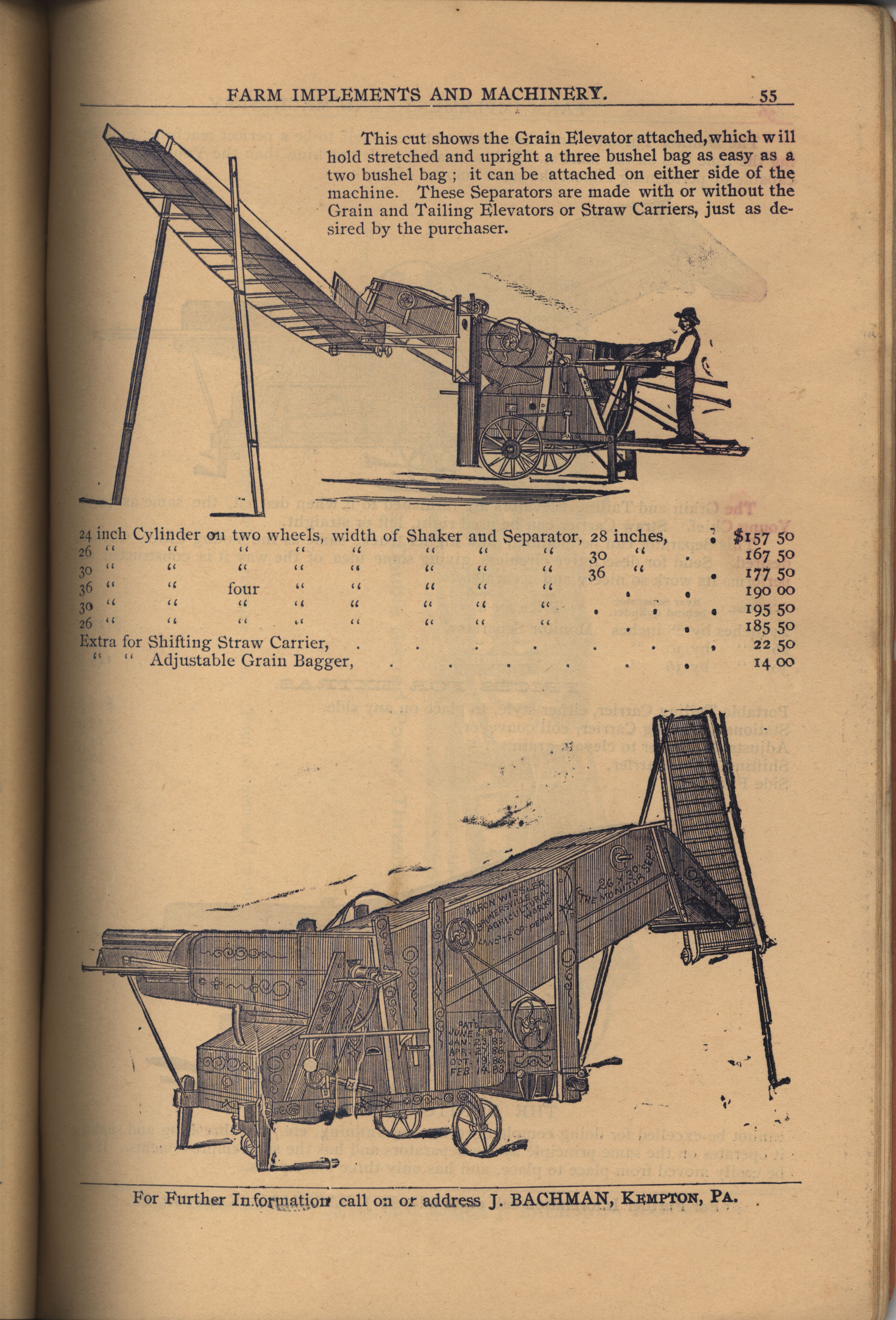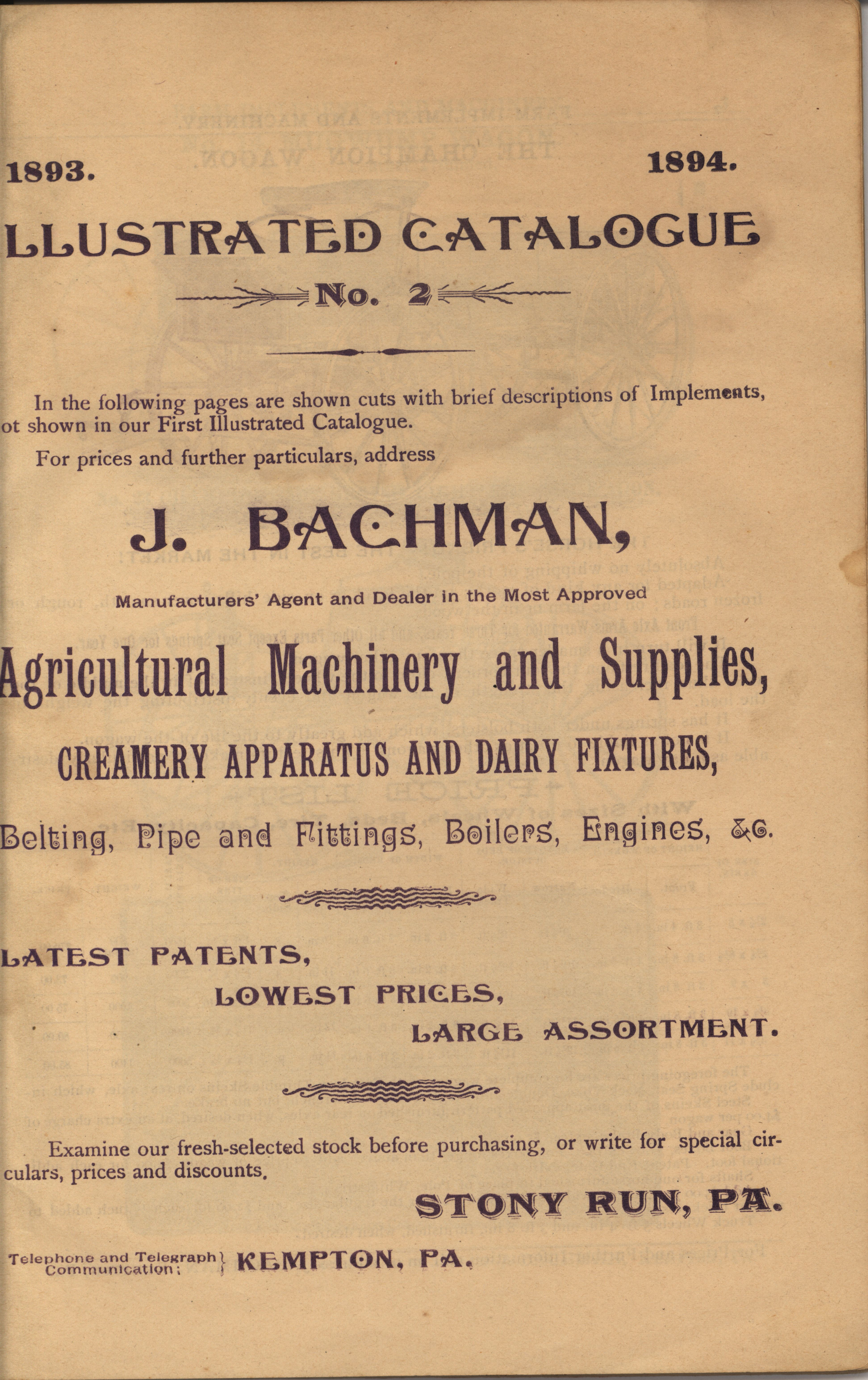 - "Illustrated catalogue No. 2 of agricultural machinery and supplies, for sale by J. Bachman", Agricultural Machinery Literature Collection, Iowa State University Library Digital Collections