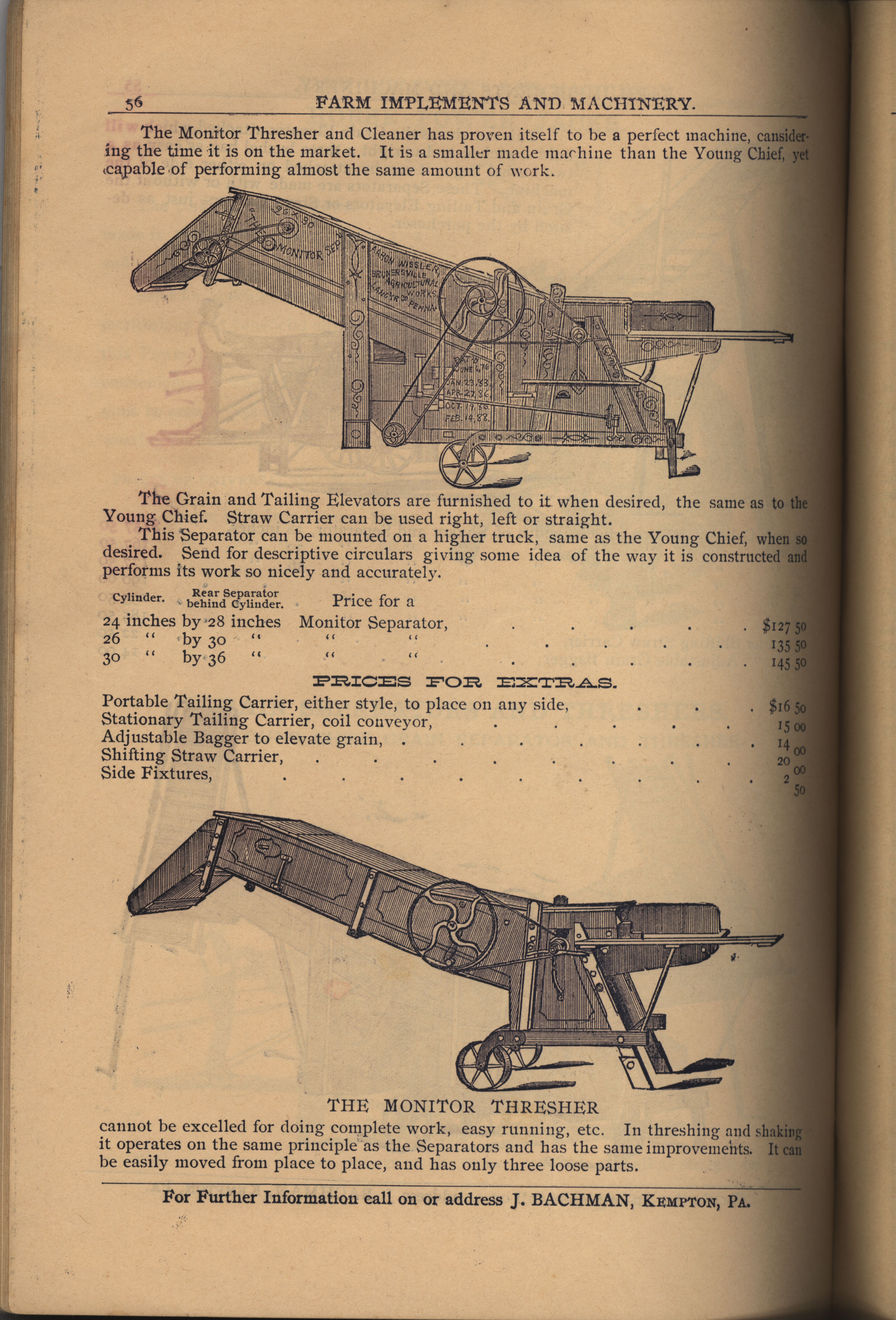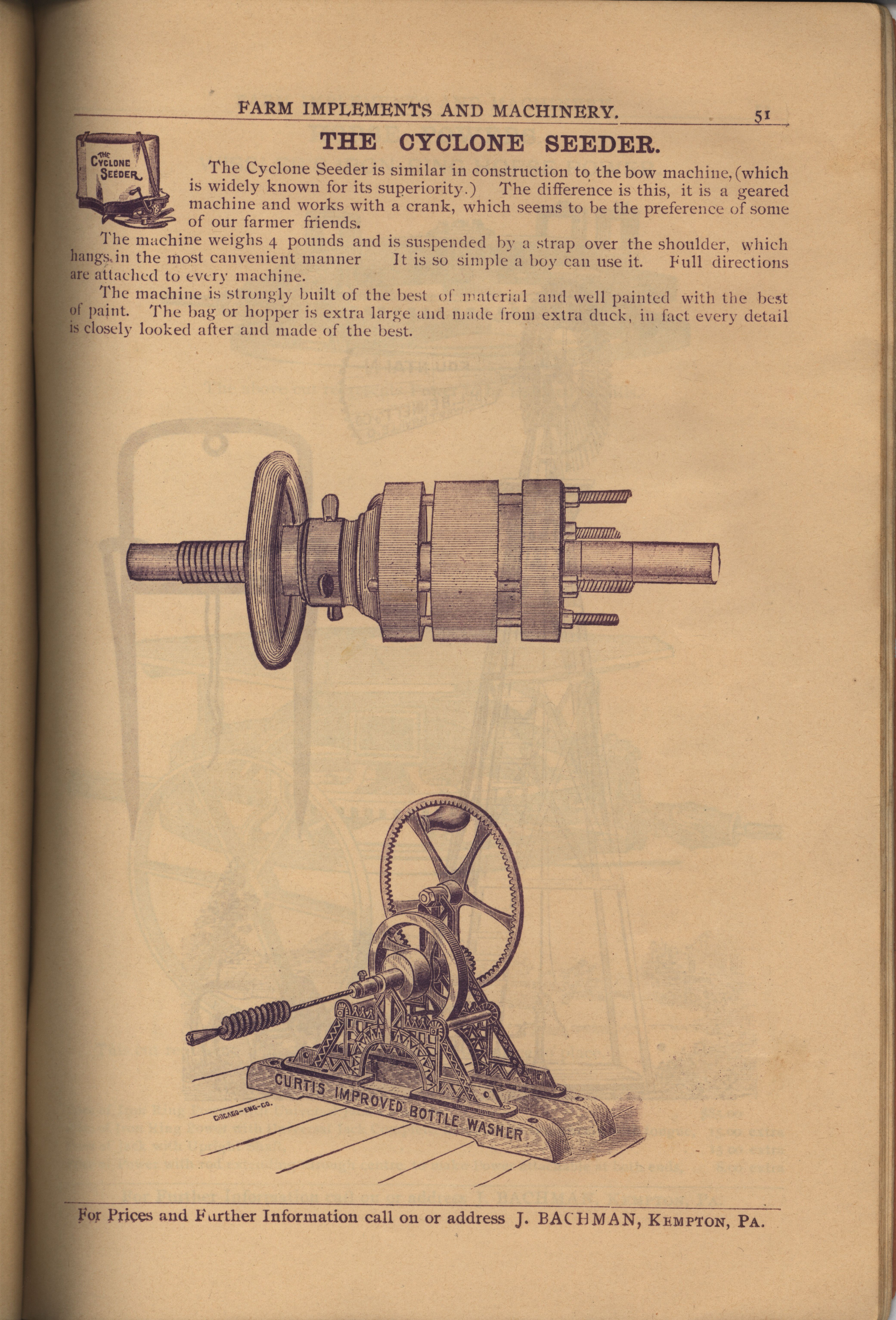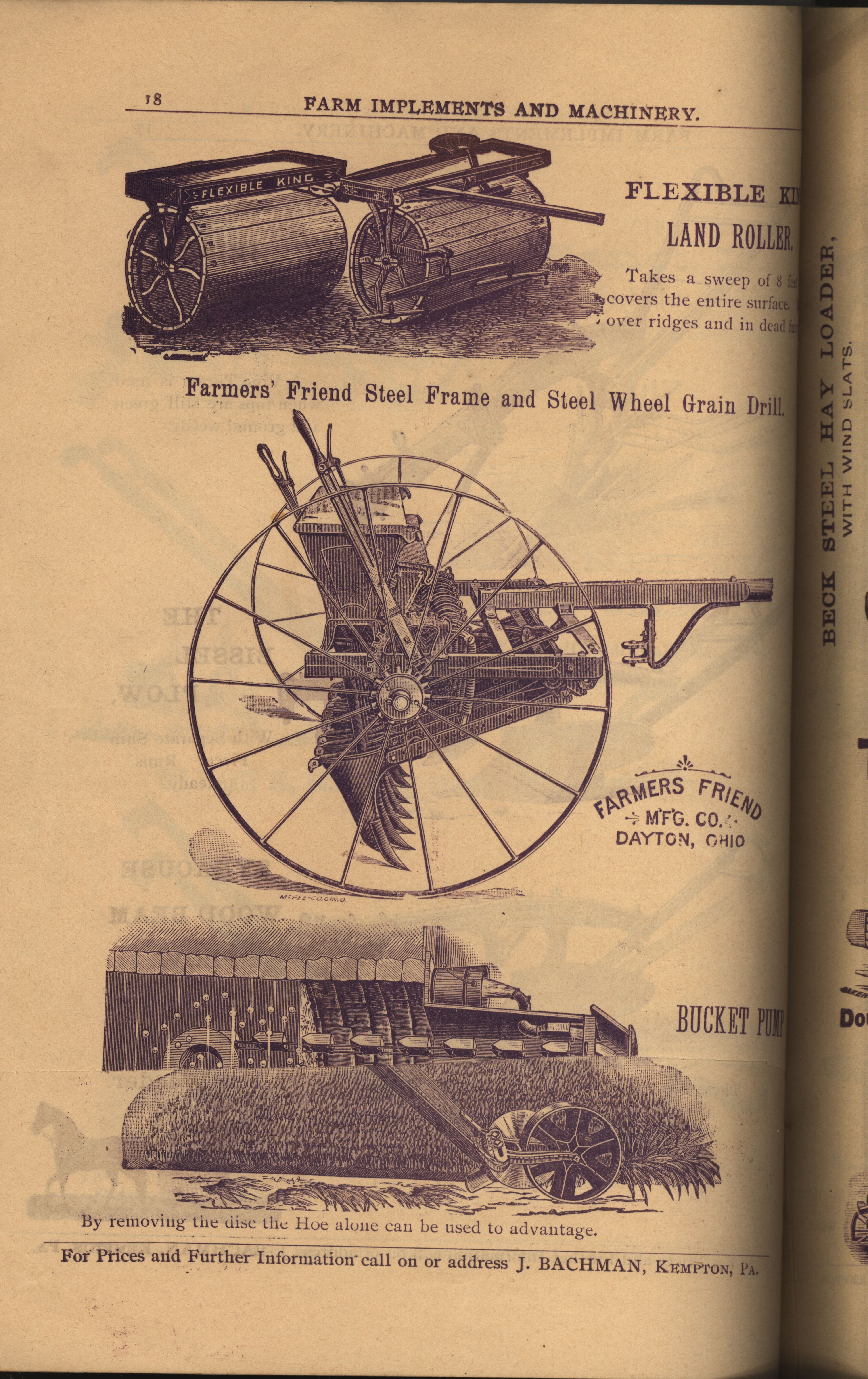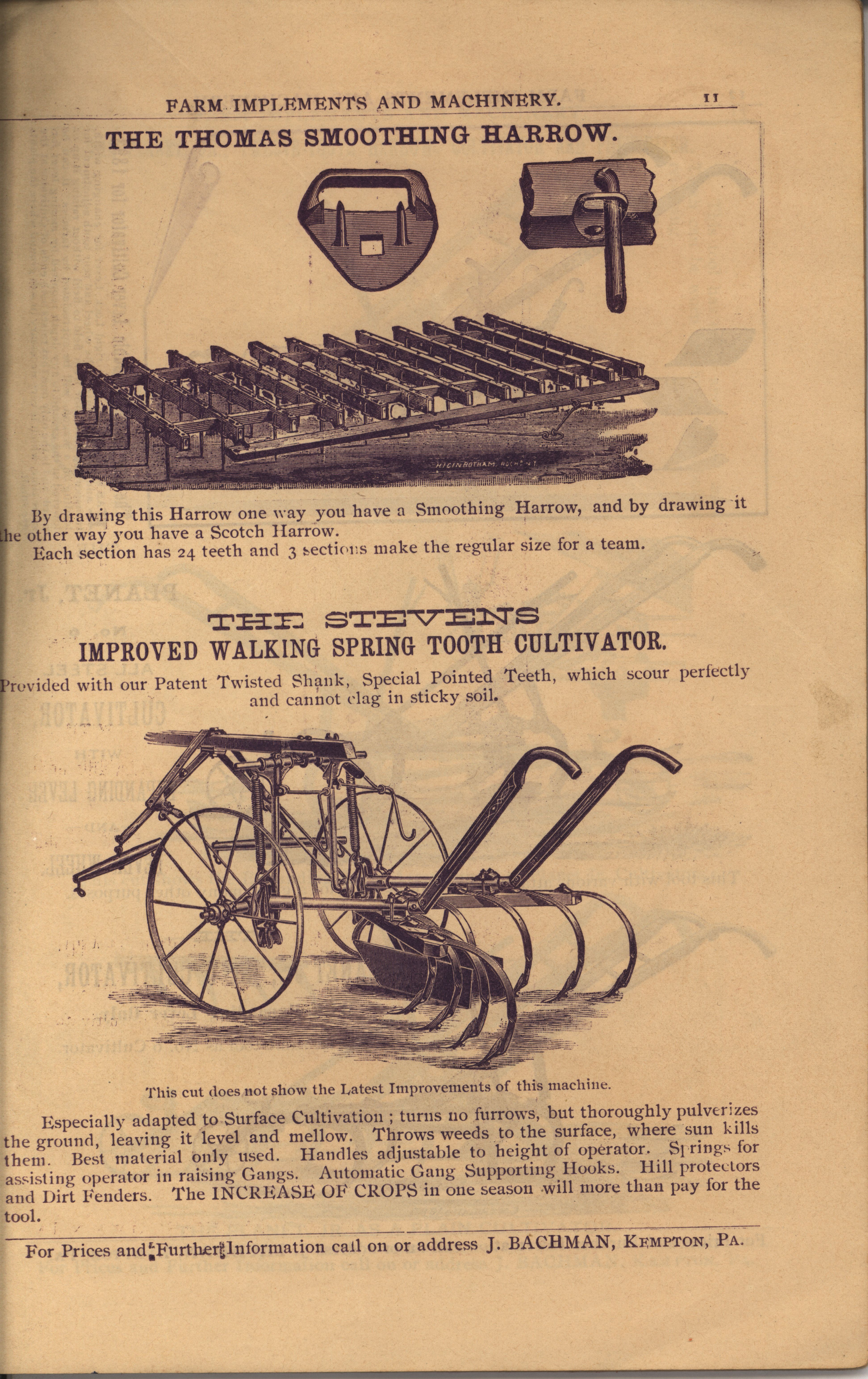 - "Illustrated catalogue No. 2 of agricultural machinery and supplies, for sale by J. Bachman", Agricultural Machinery Literature Collection, Iowa State University Library Digital Collections