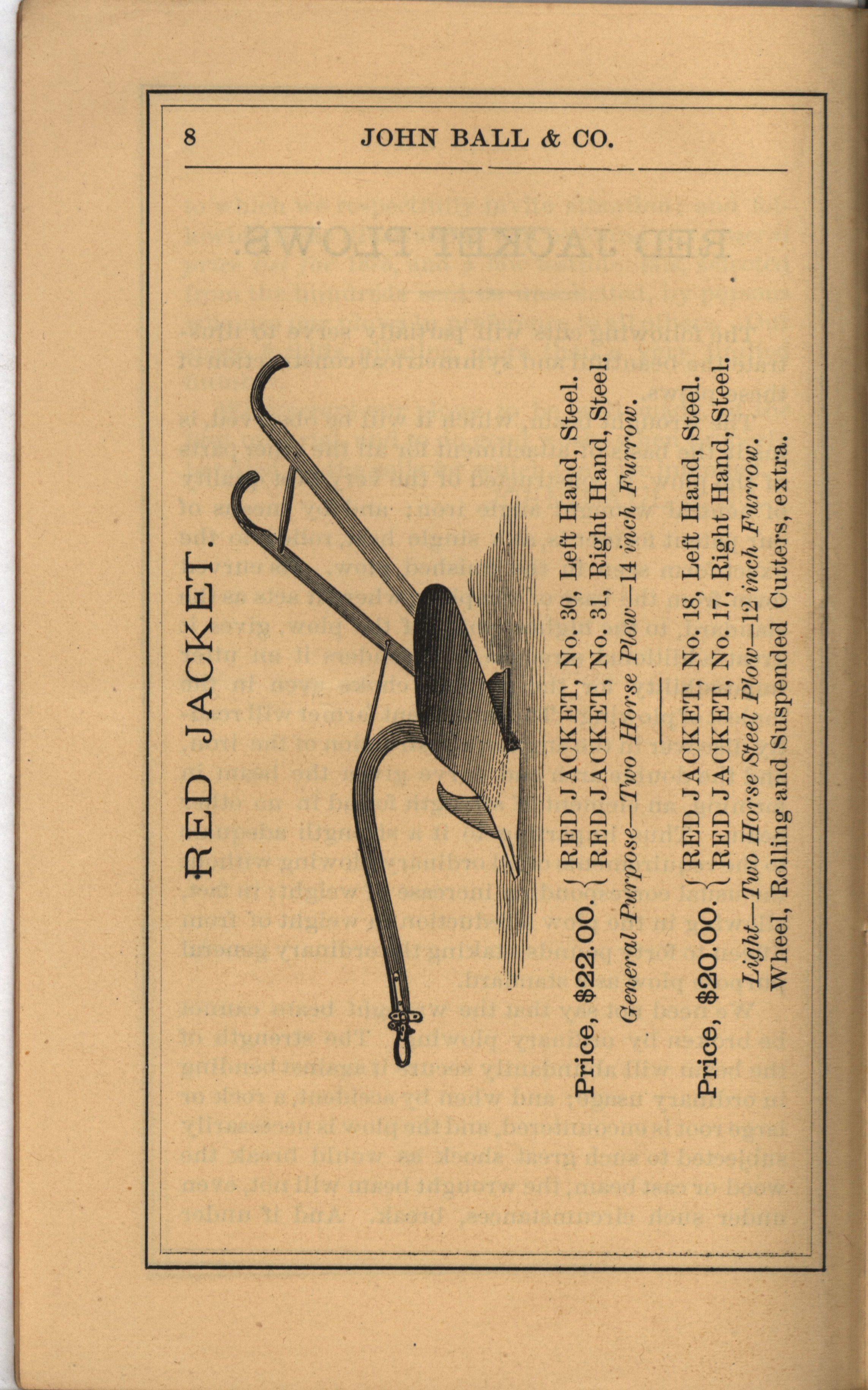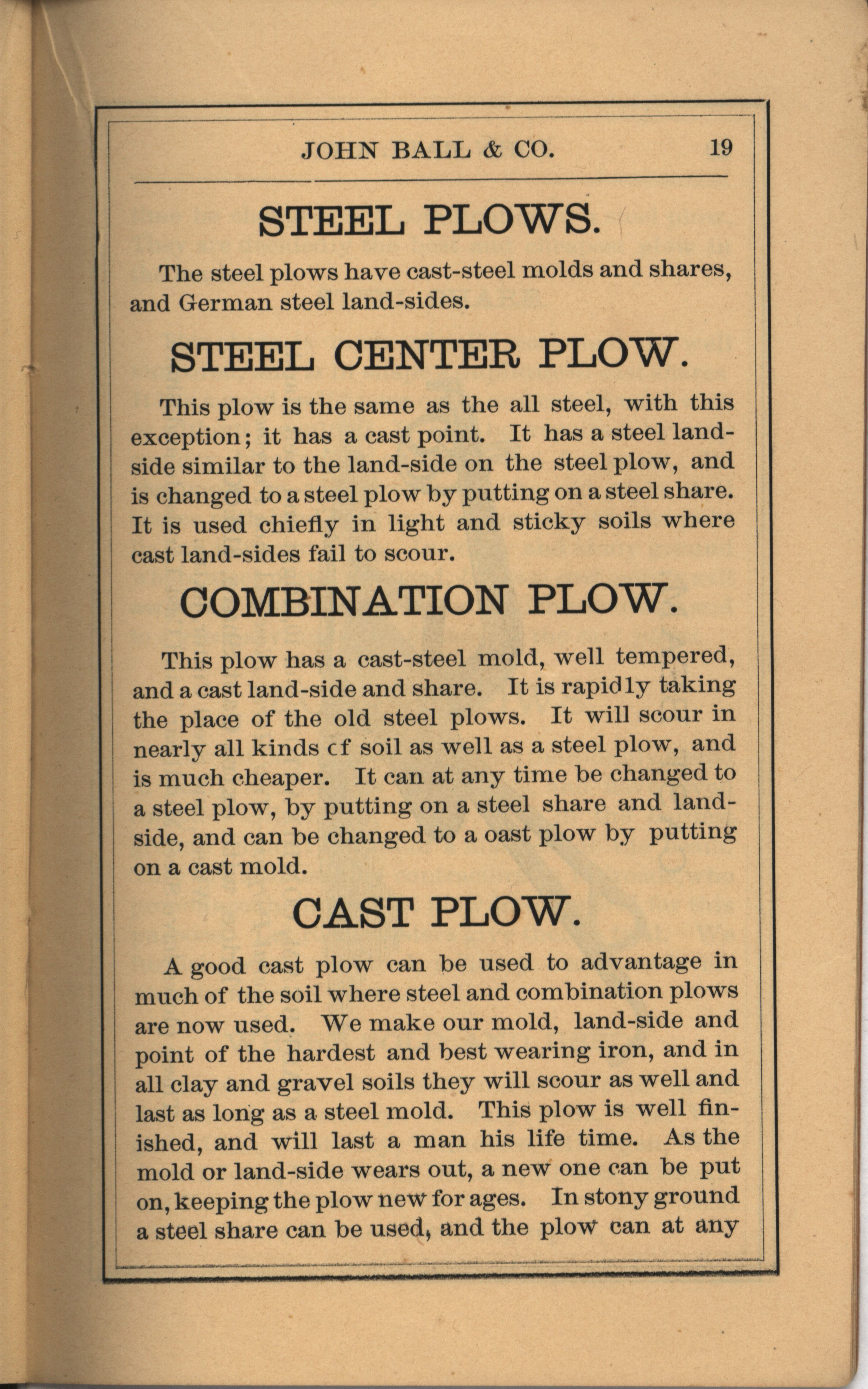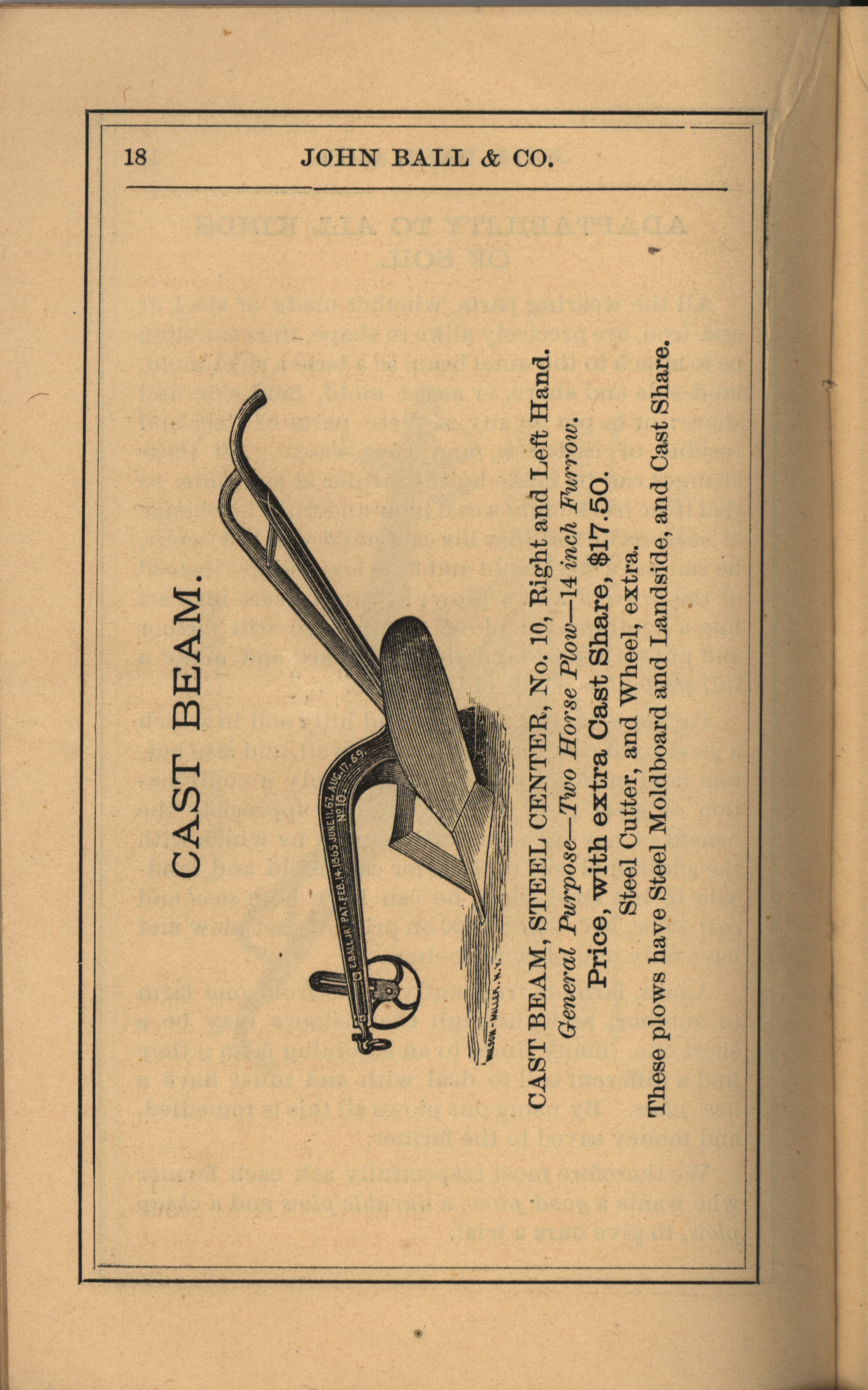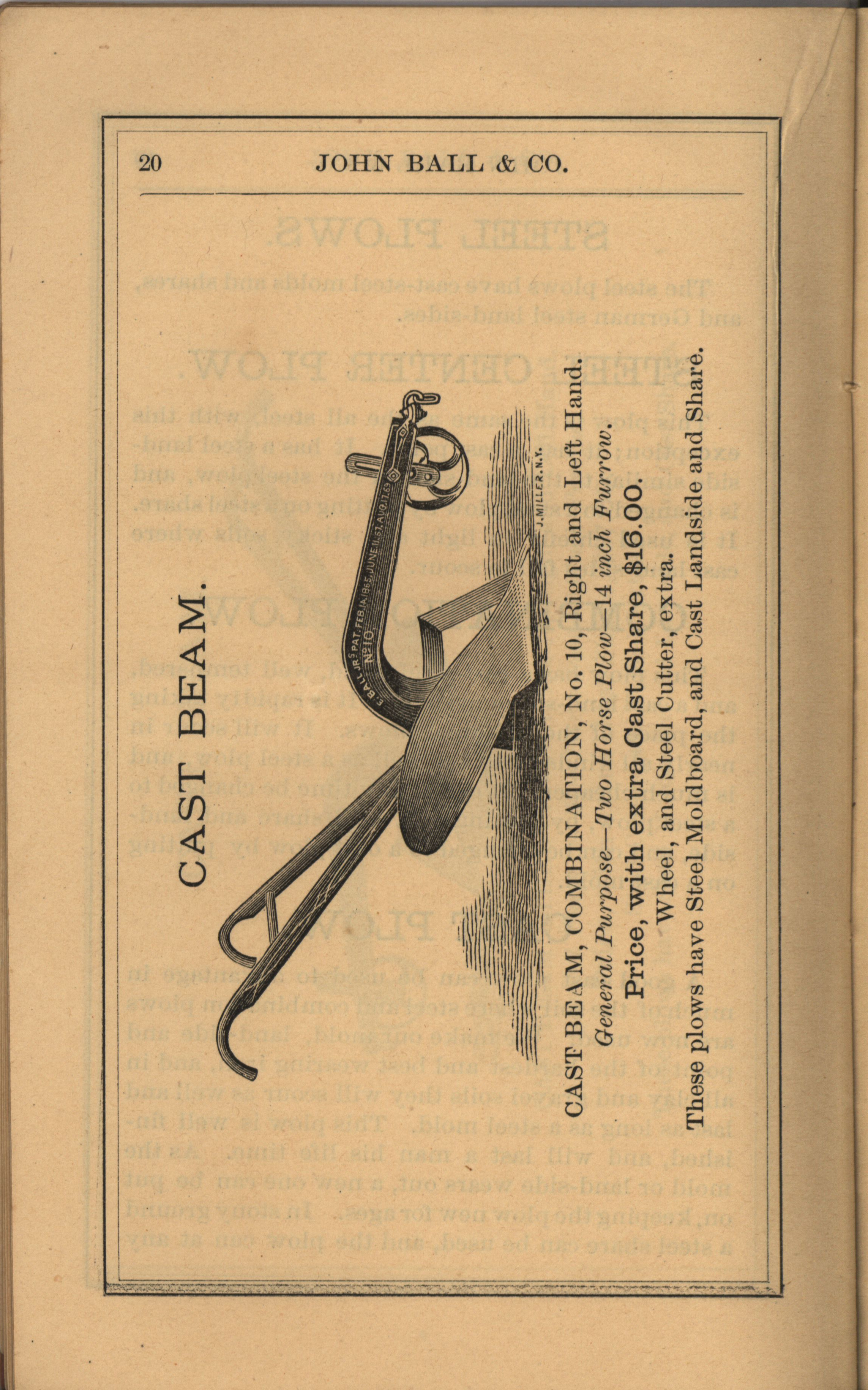 - Catalog describing the plow products offered by John Ball and Company for the 1875 season, including illustrations.