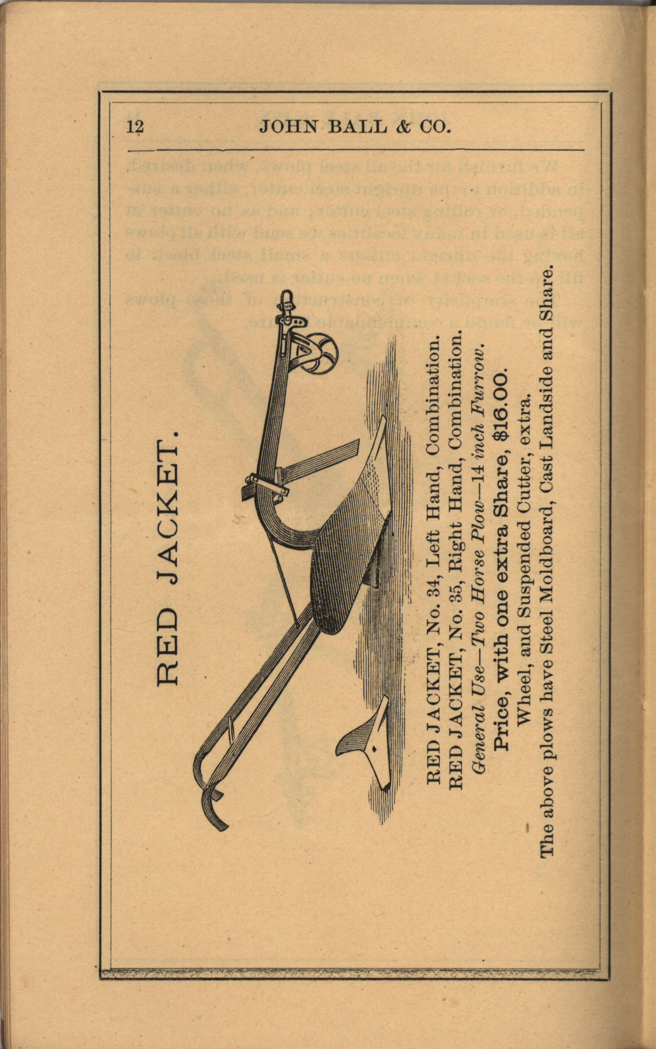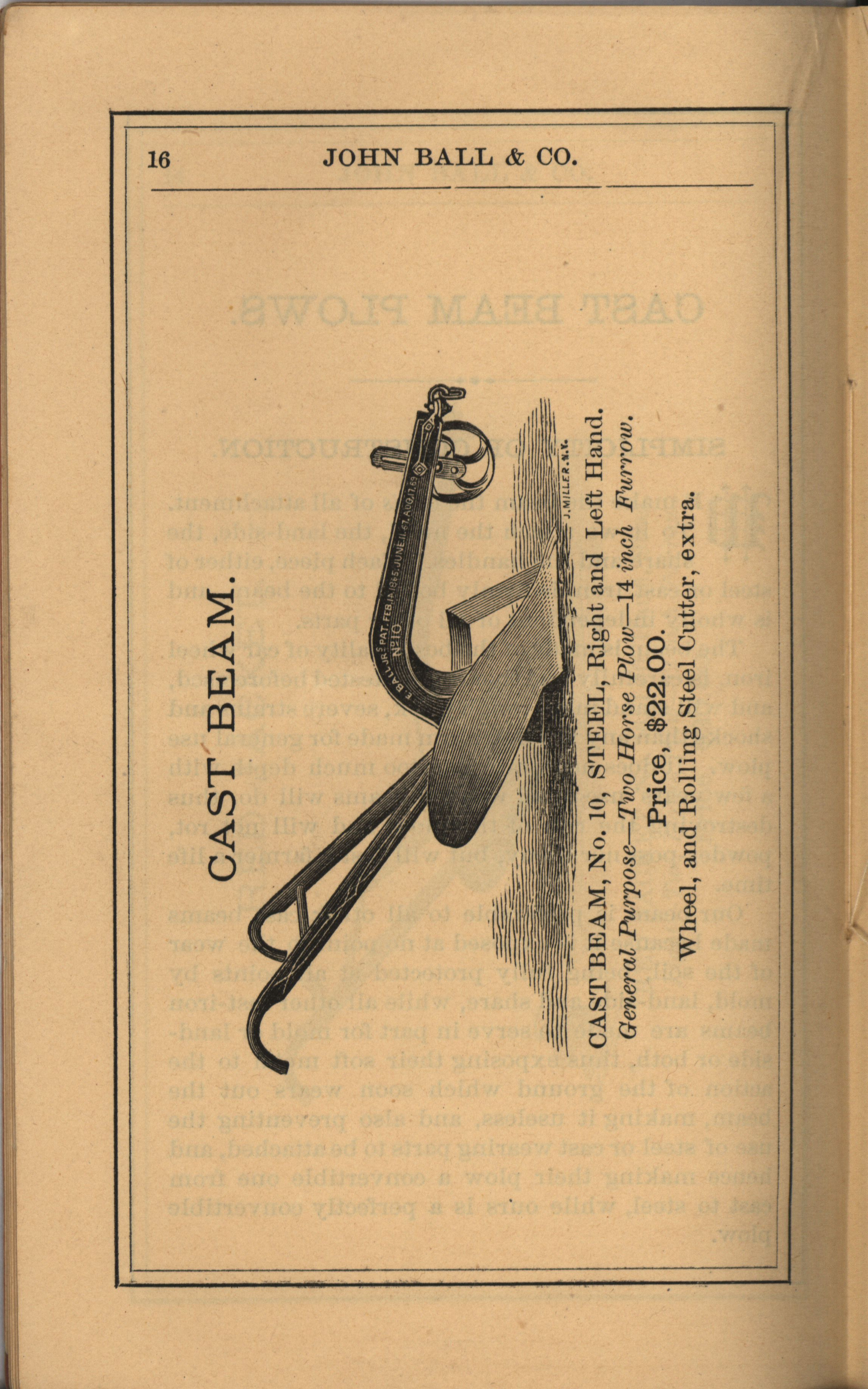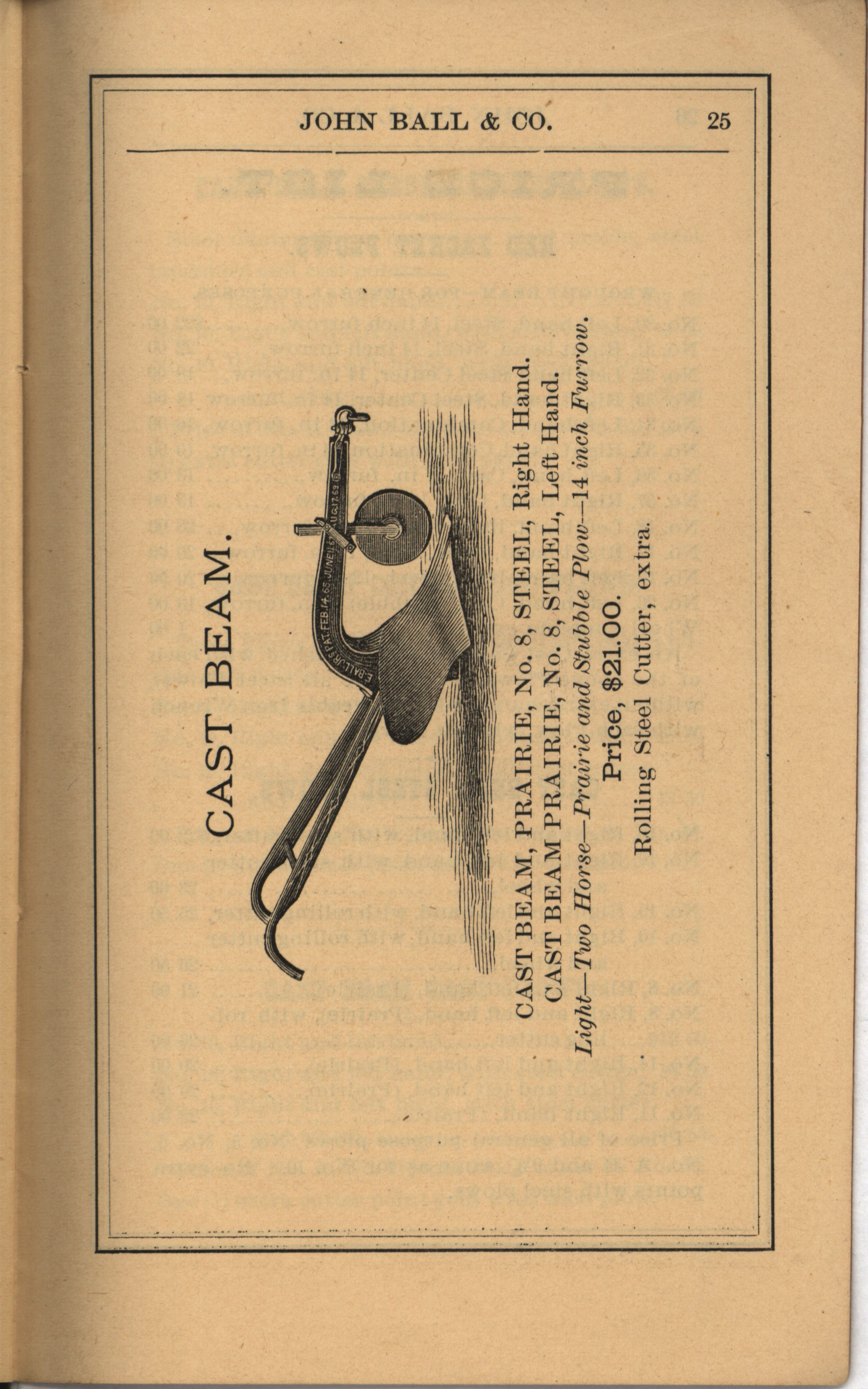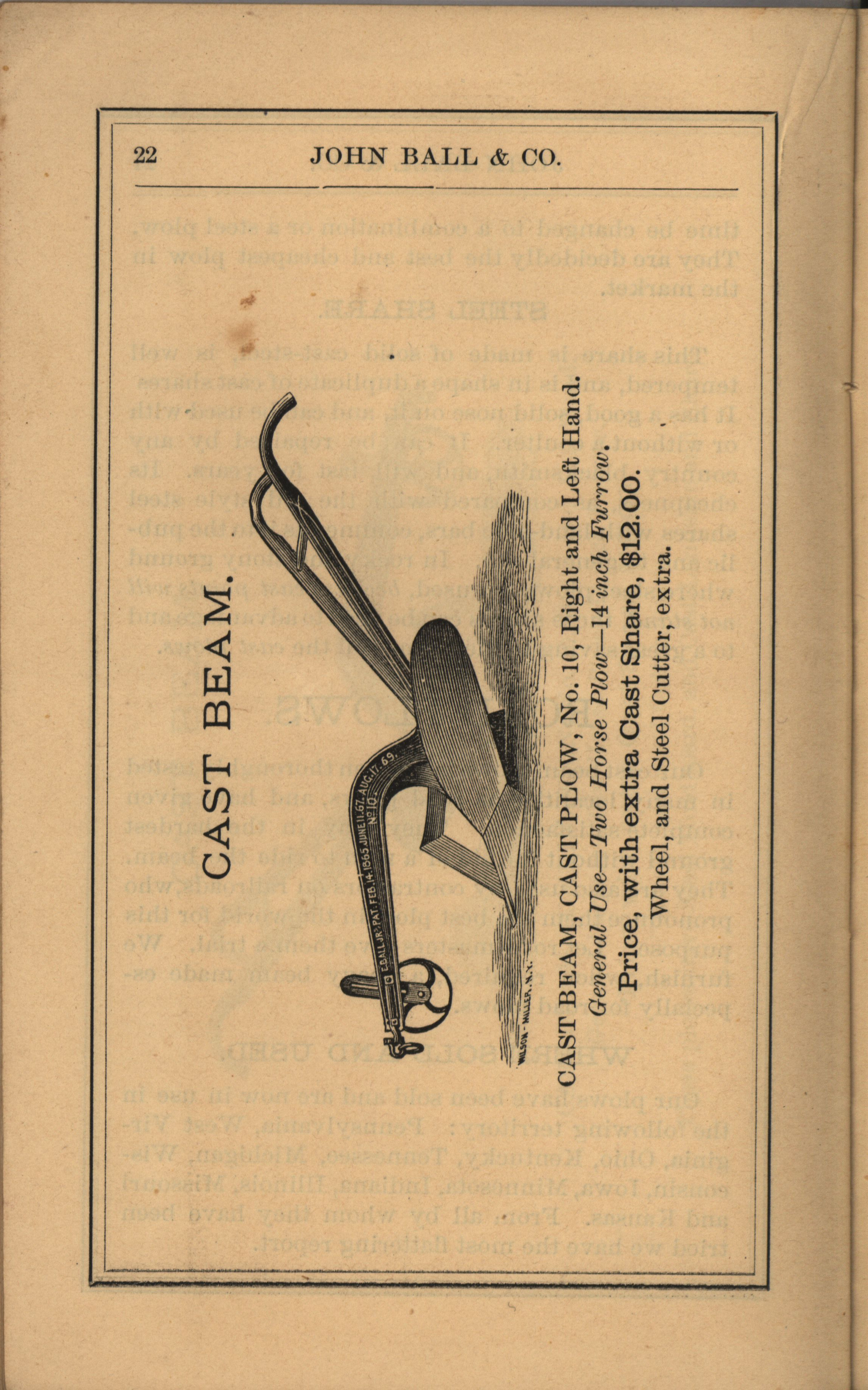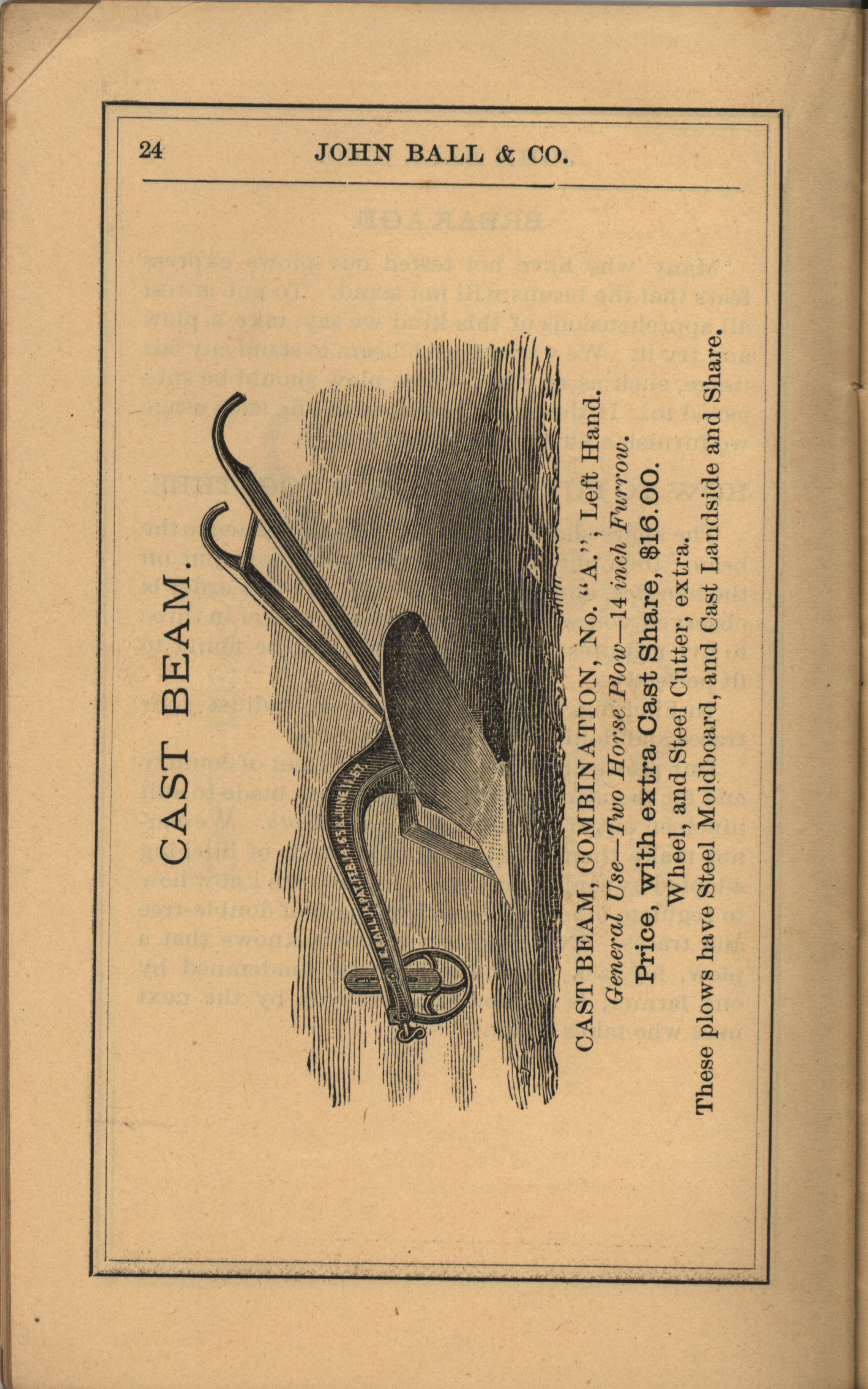 - Catalog describing the plow products offered by John Ball and Company for the 1875 season, including illustrations.