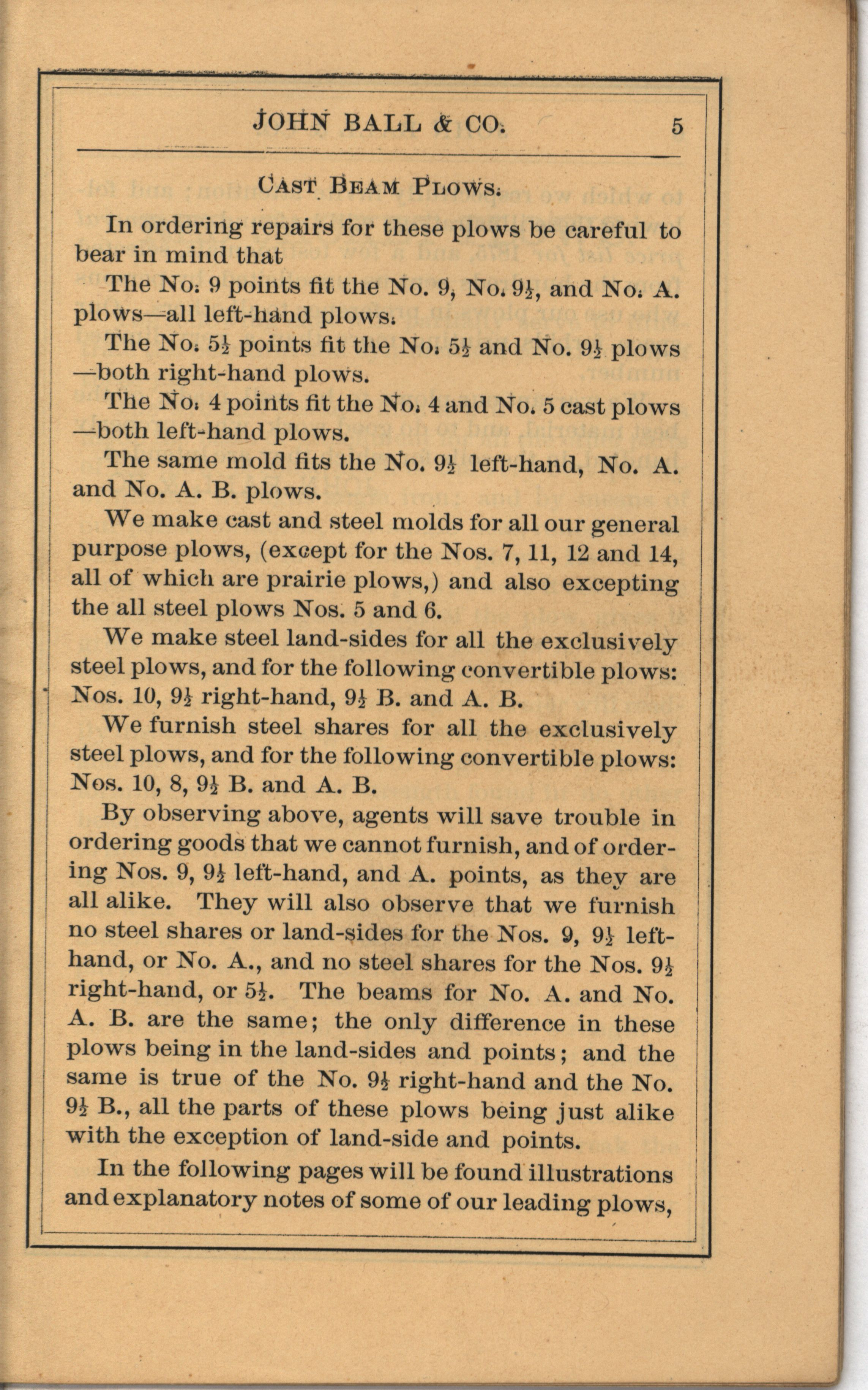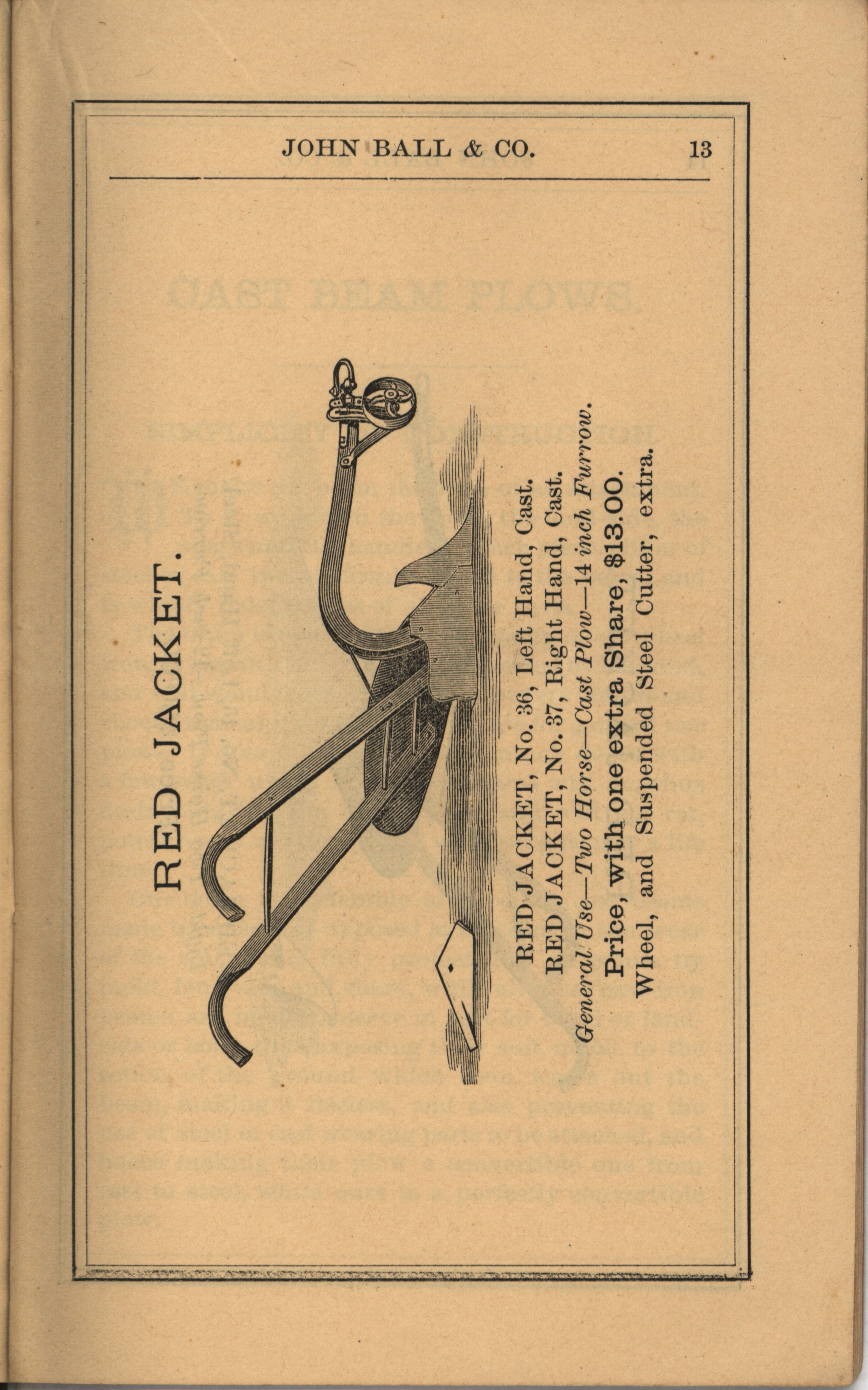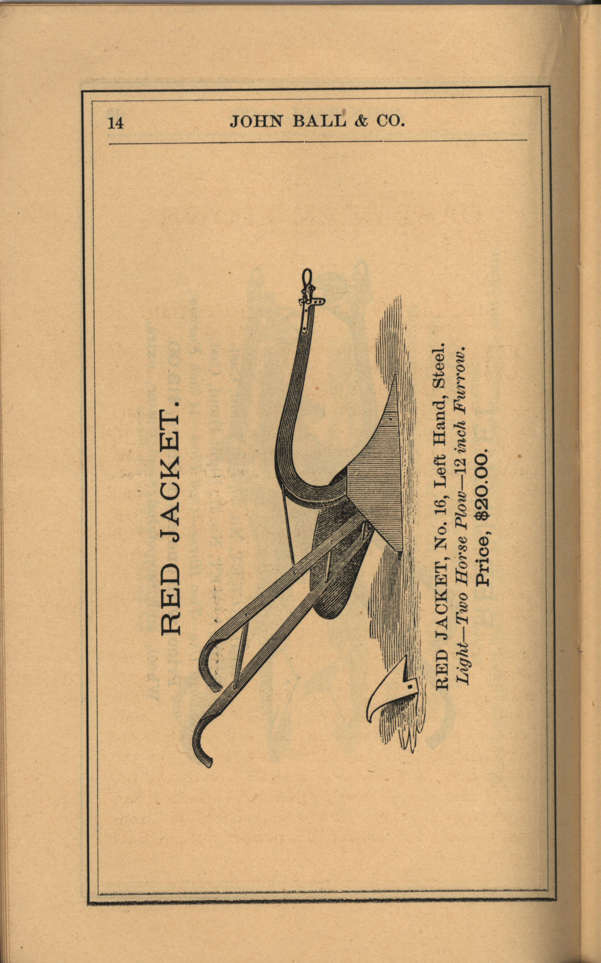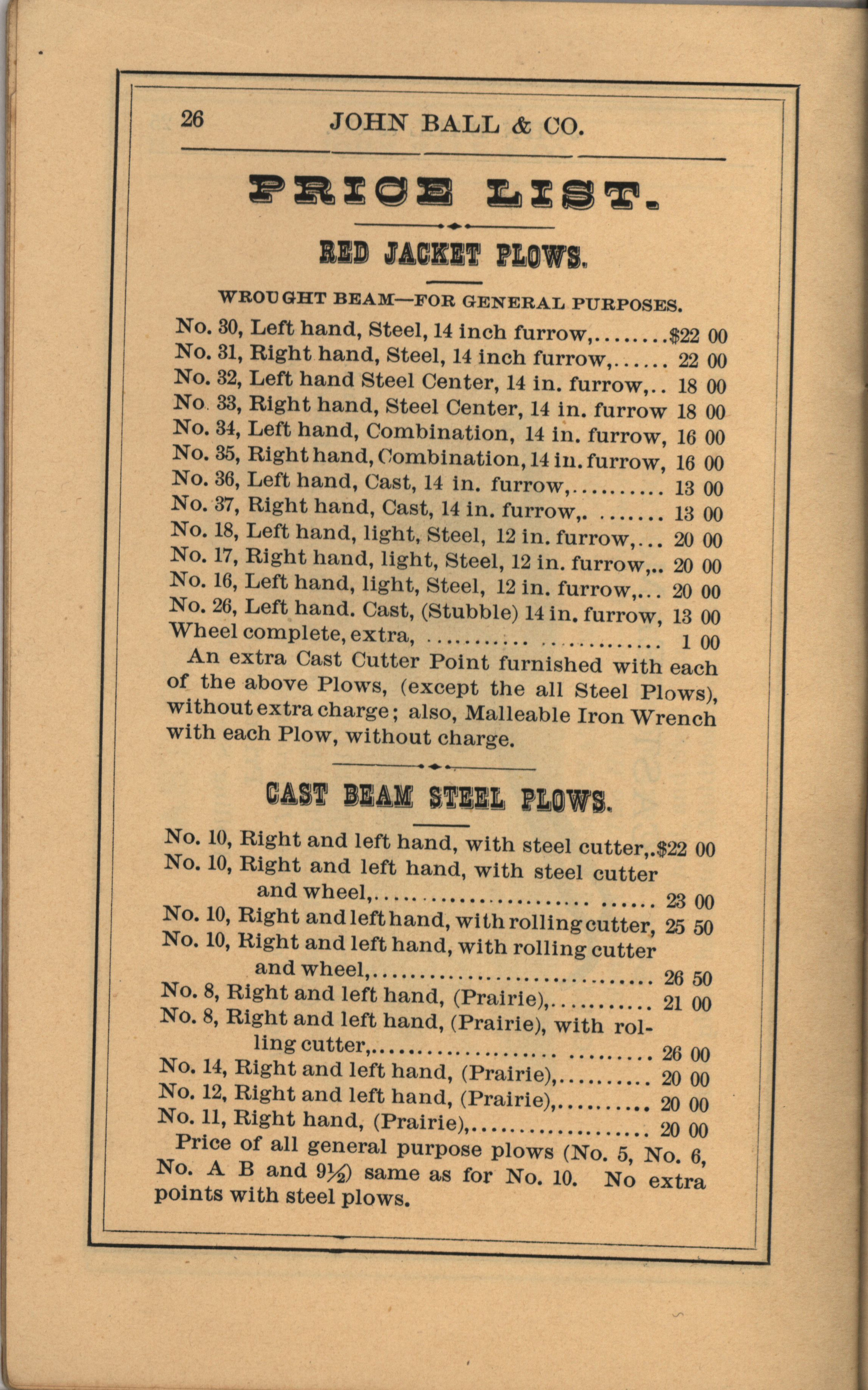 - Catalog describing the plow products offered by John Ball and Company for the 1875 season, including illustrations.