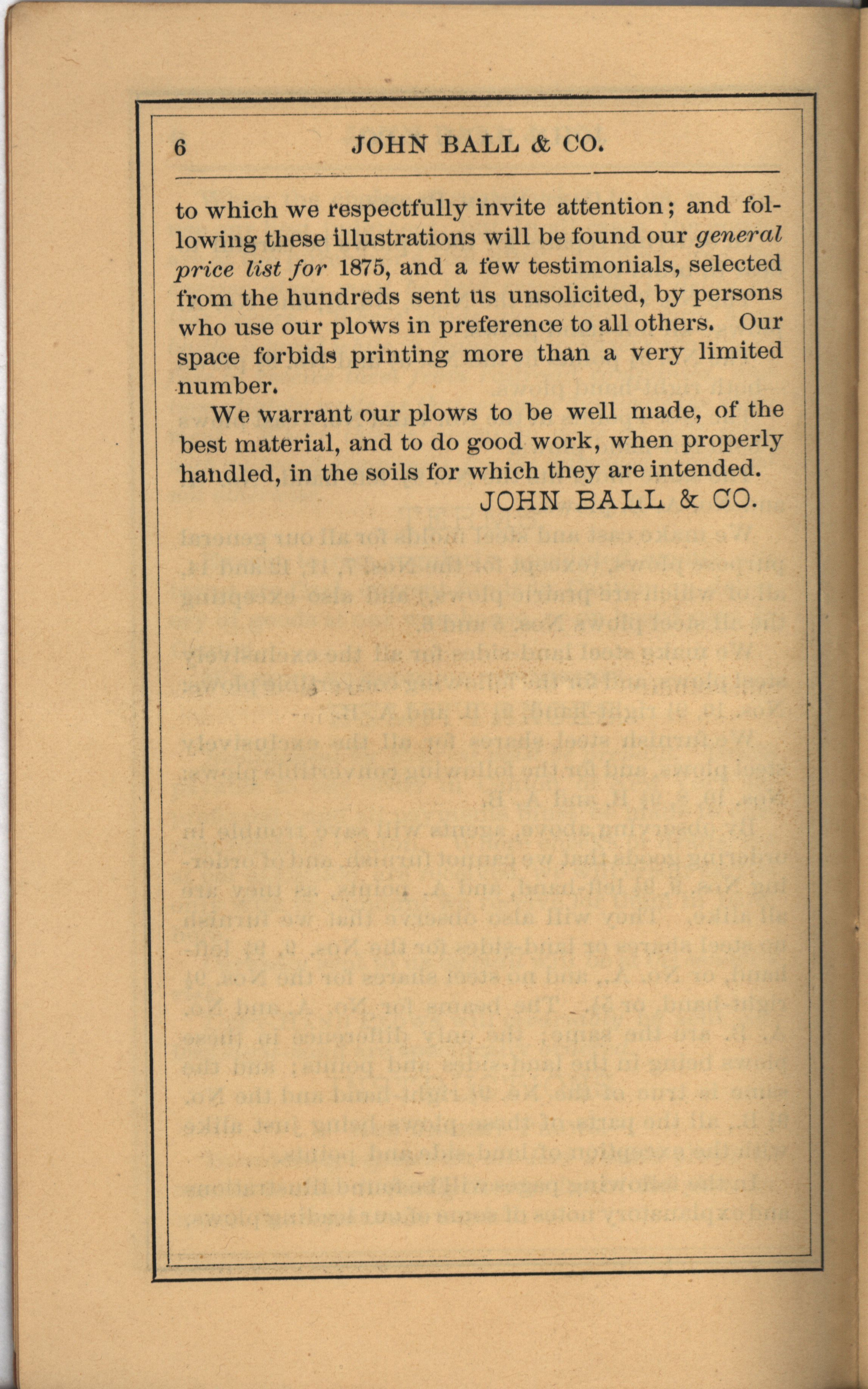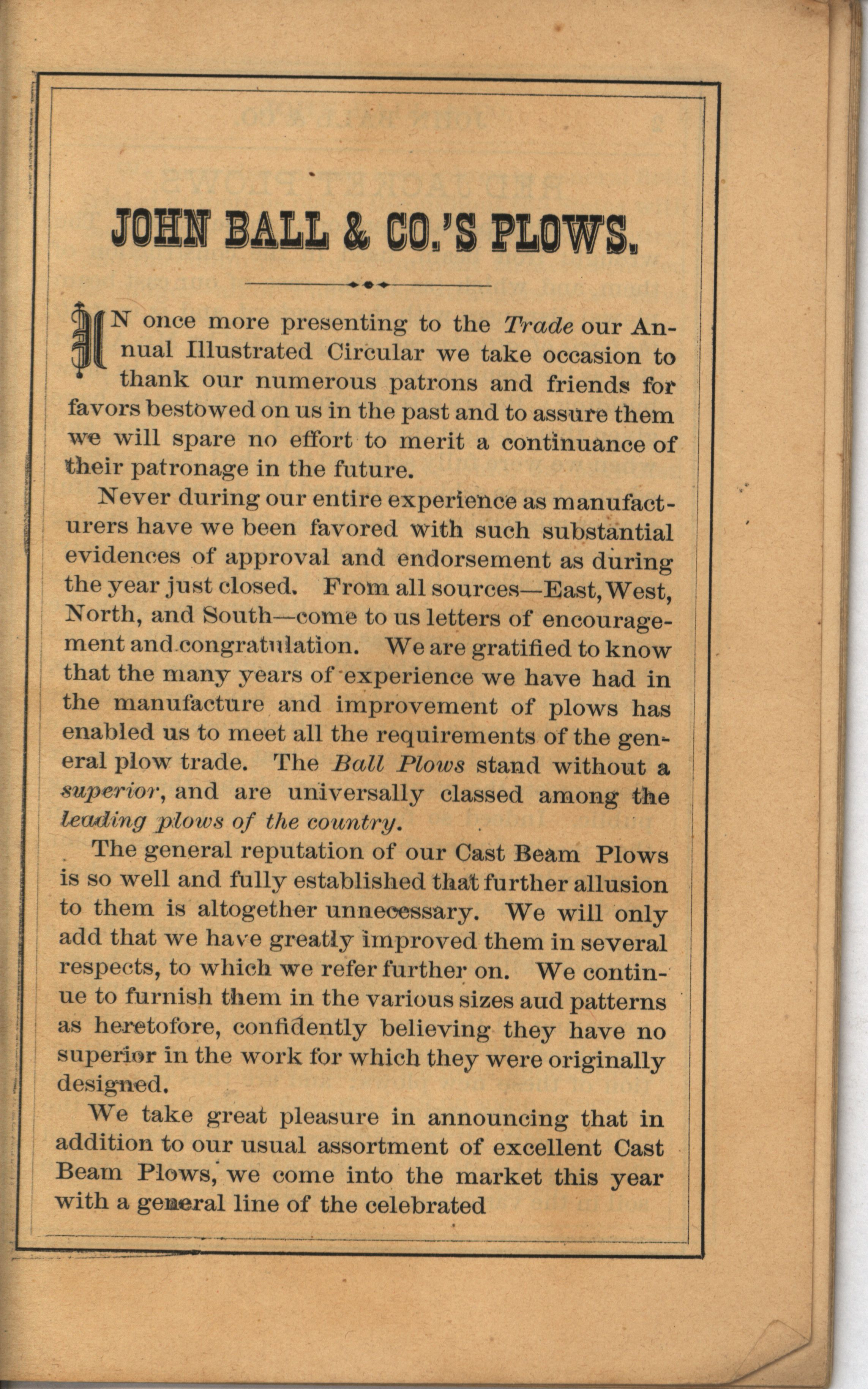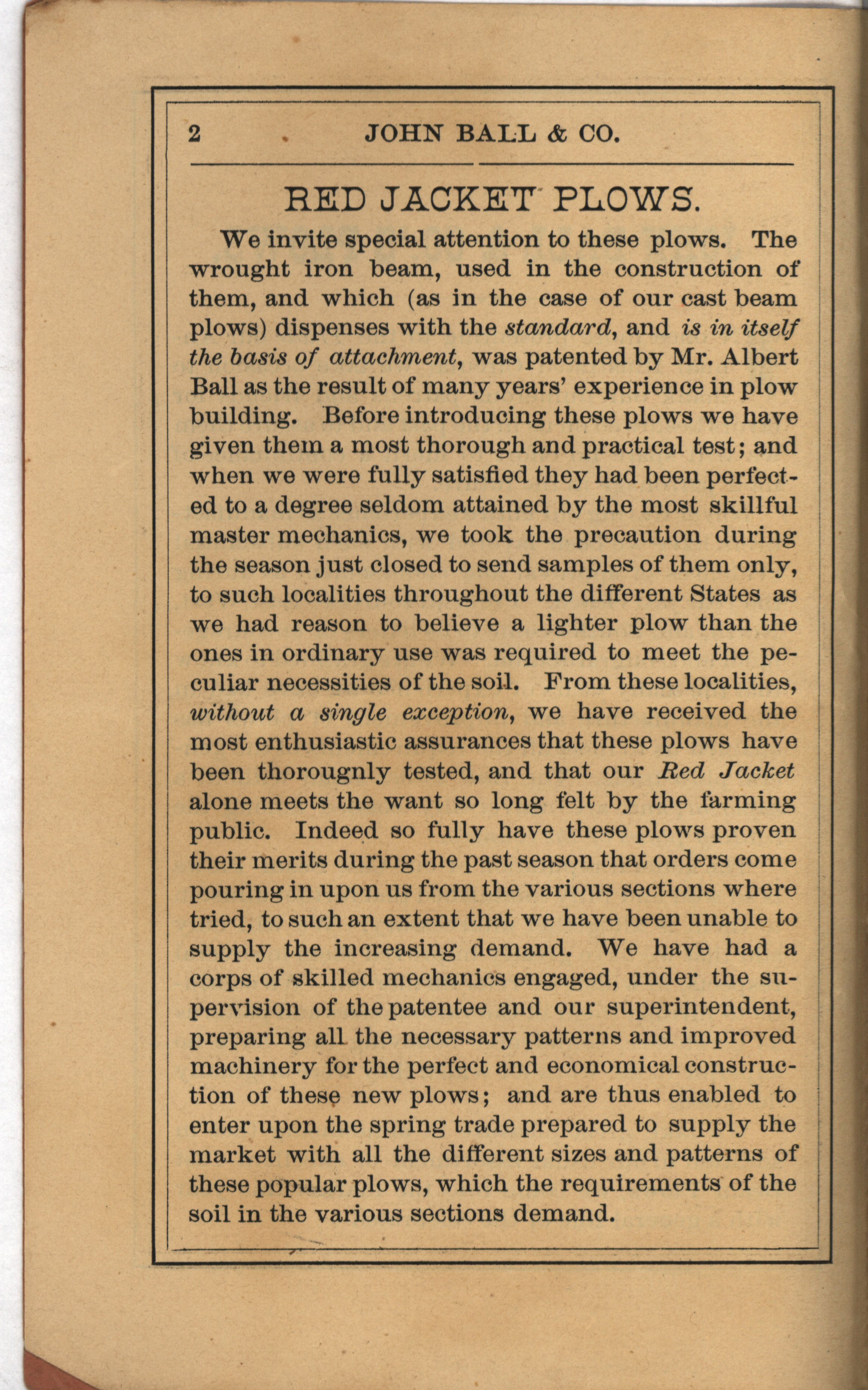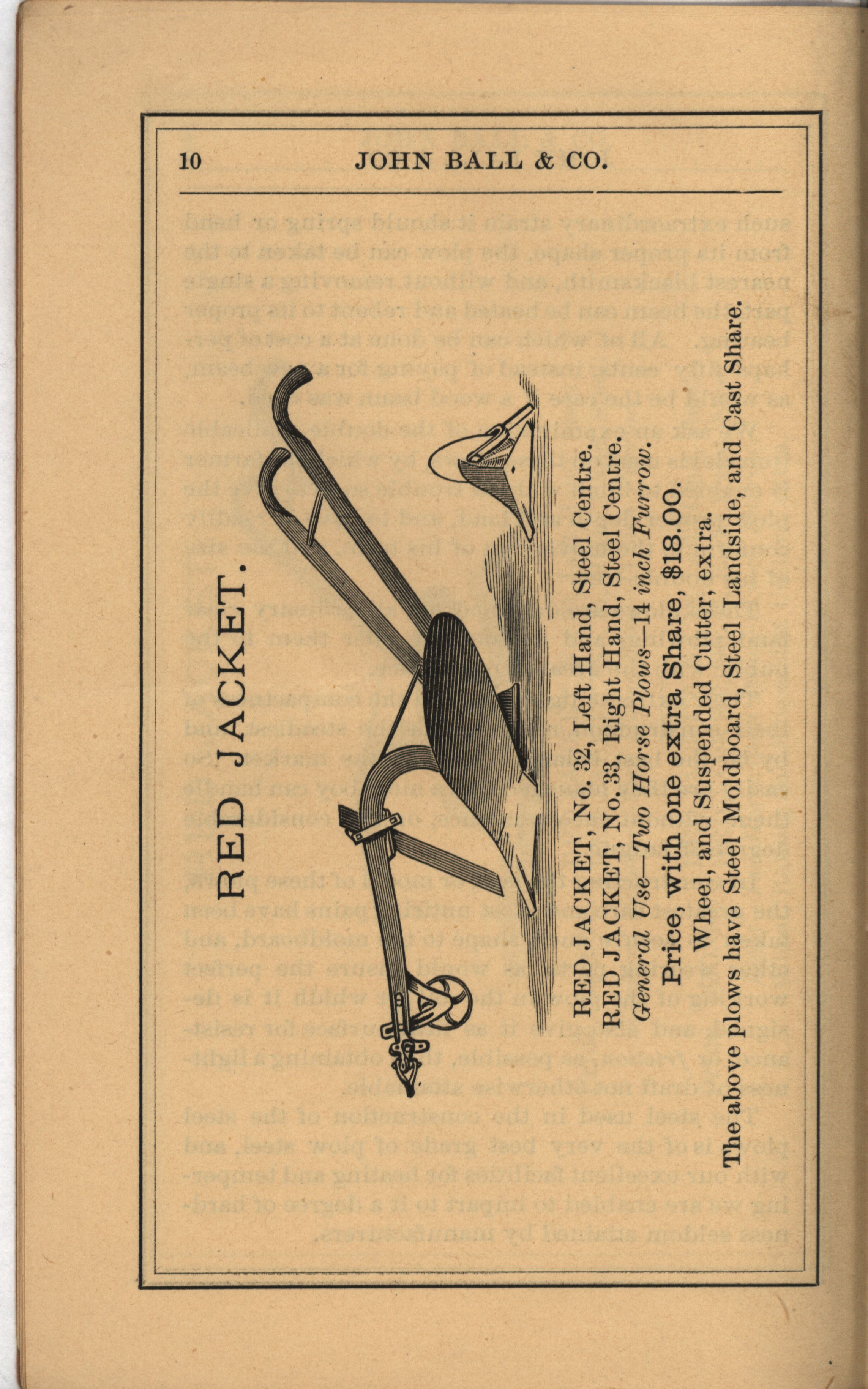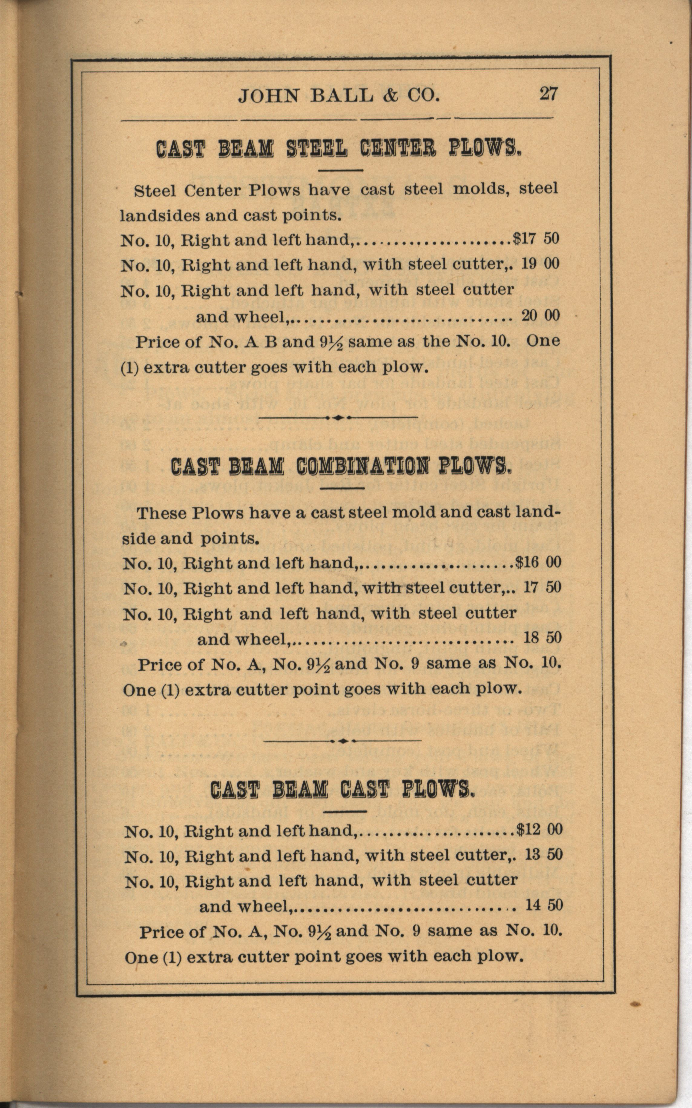 - Catalog describing the plow products offered by John Ball and Company for the 1875 season, including illustrations.