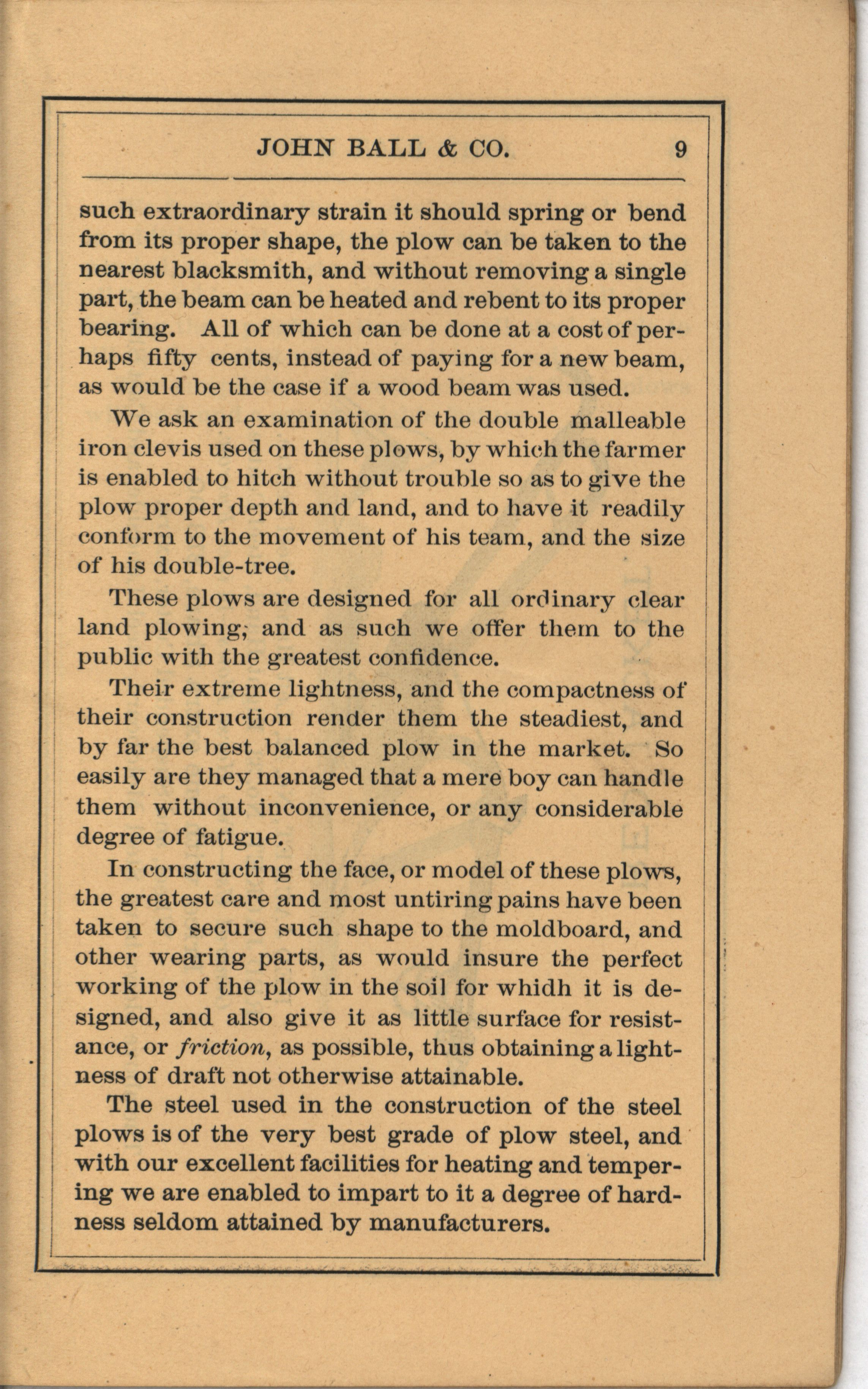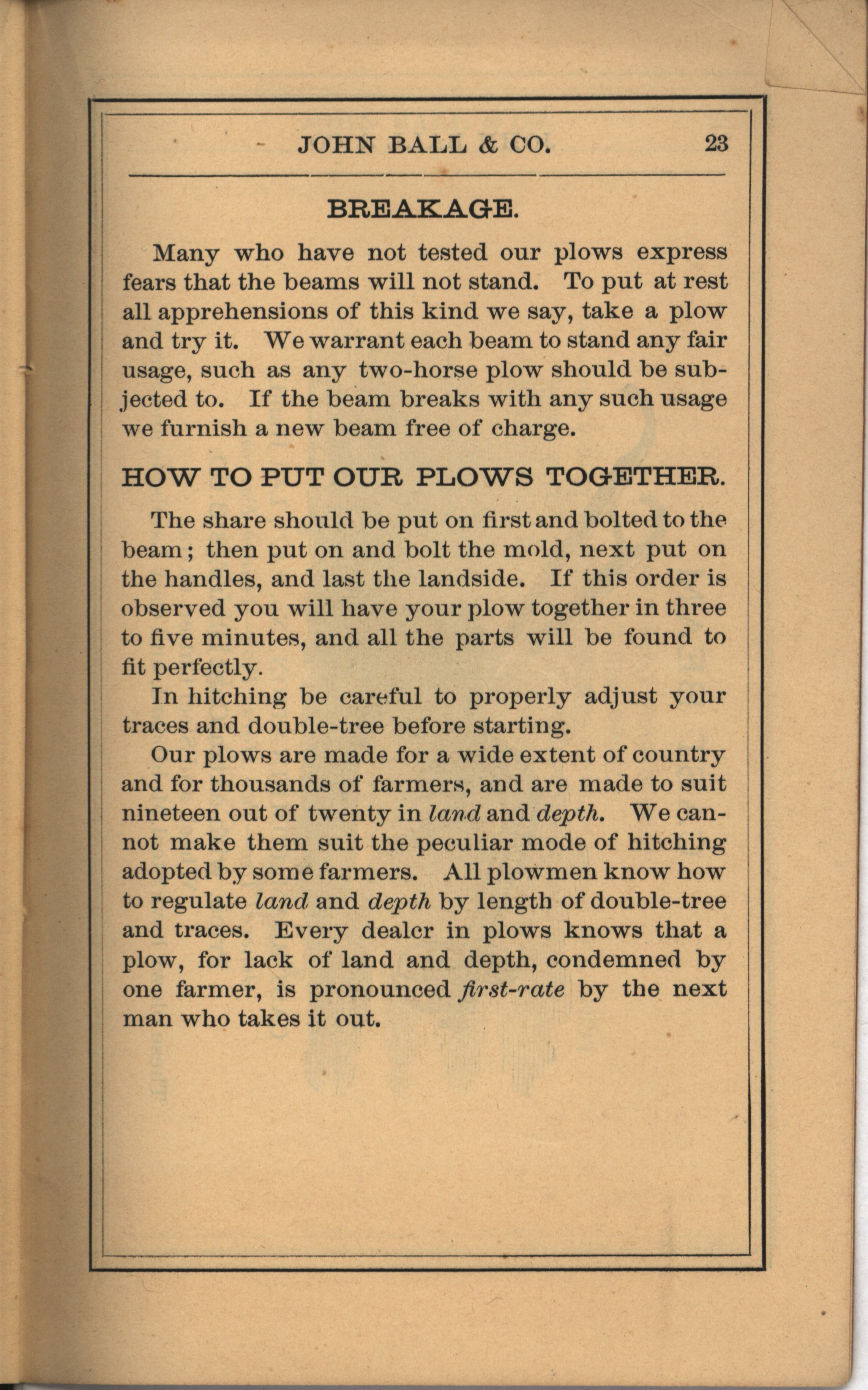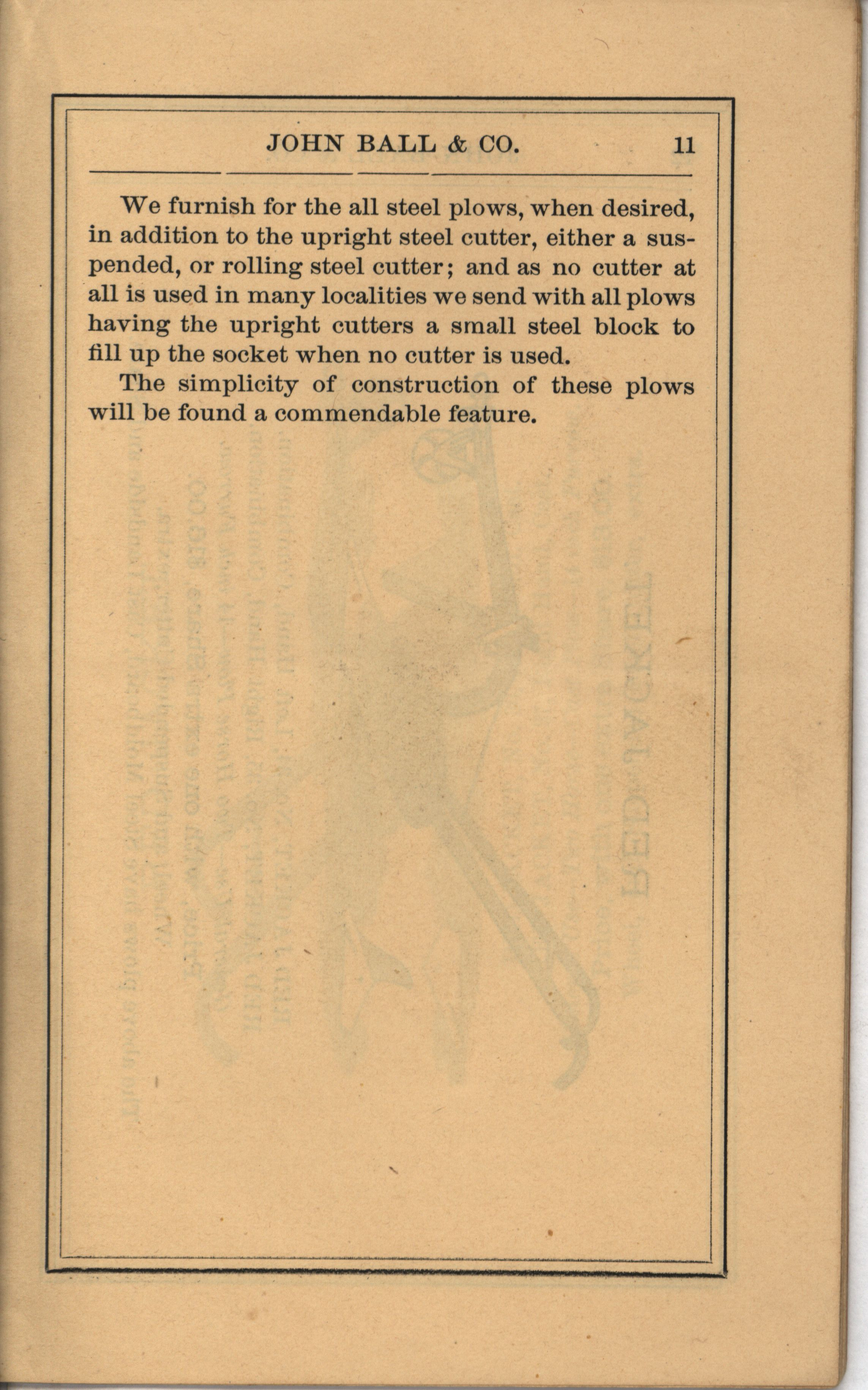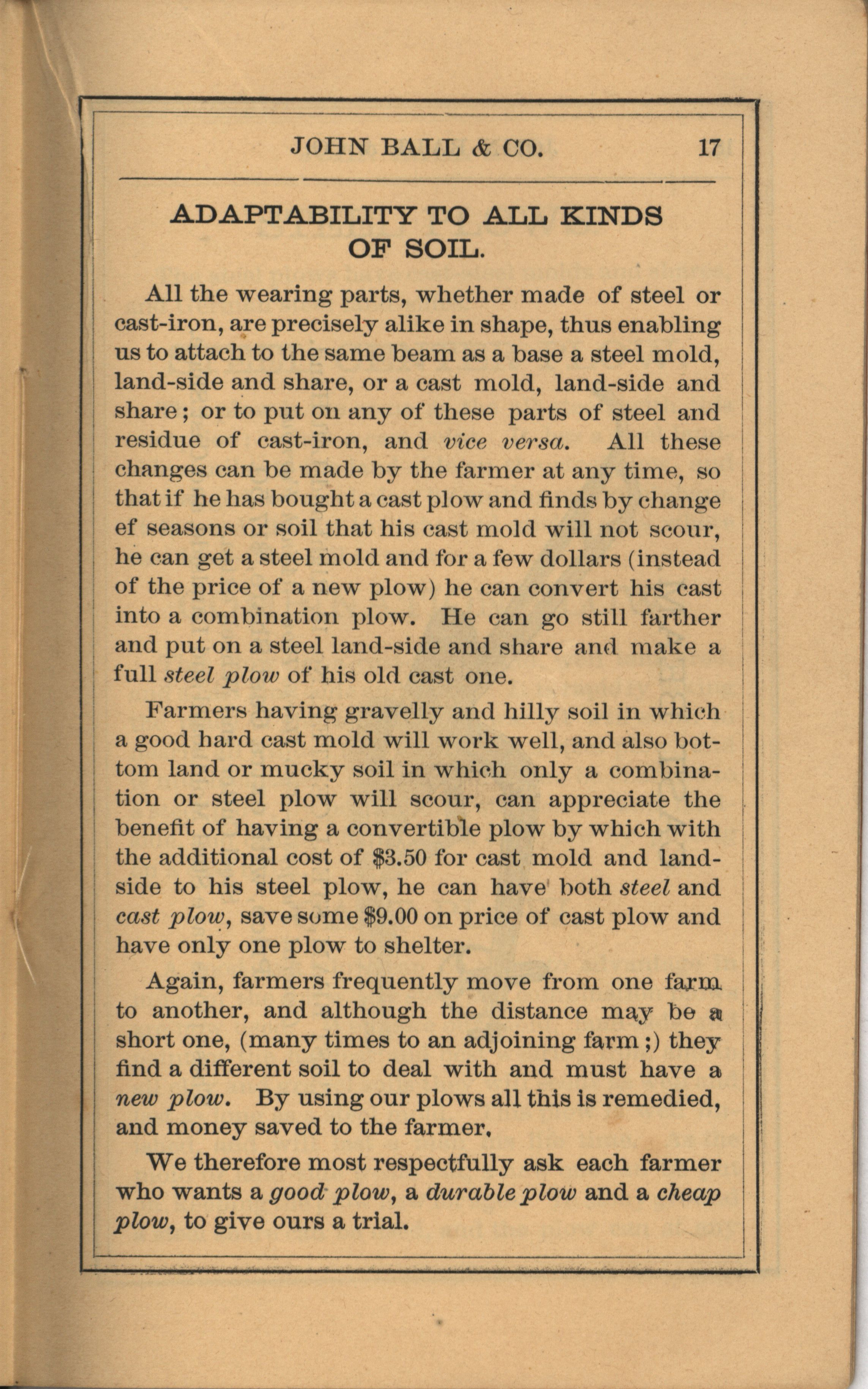 - Catalog describing the plow products offered by John Ball and Company for the 1875 season, including illustrations.