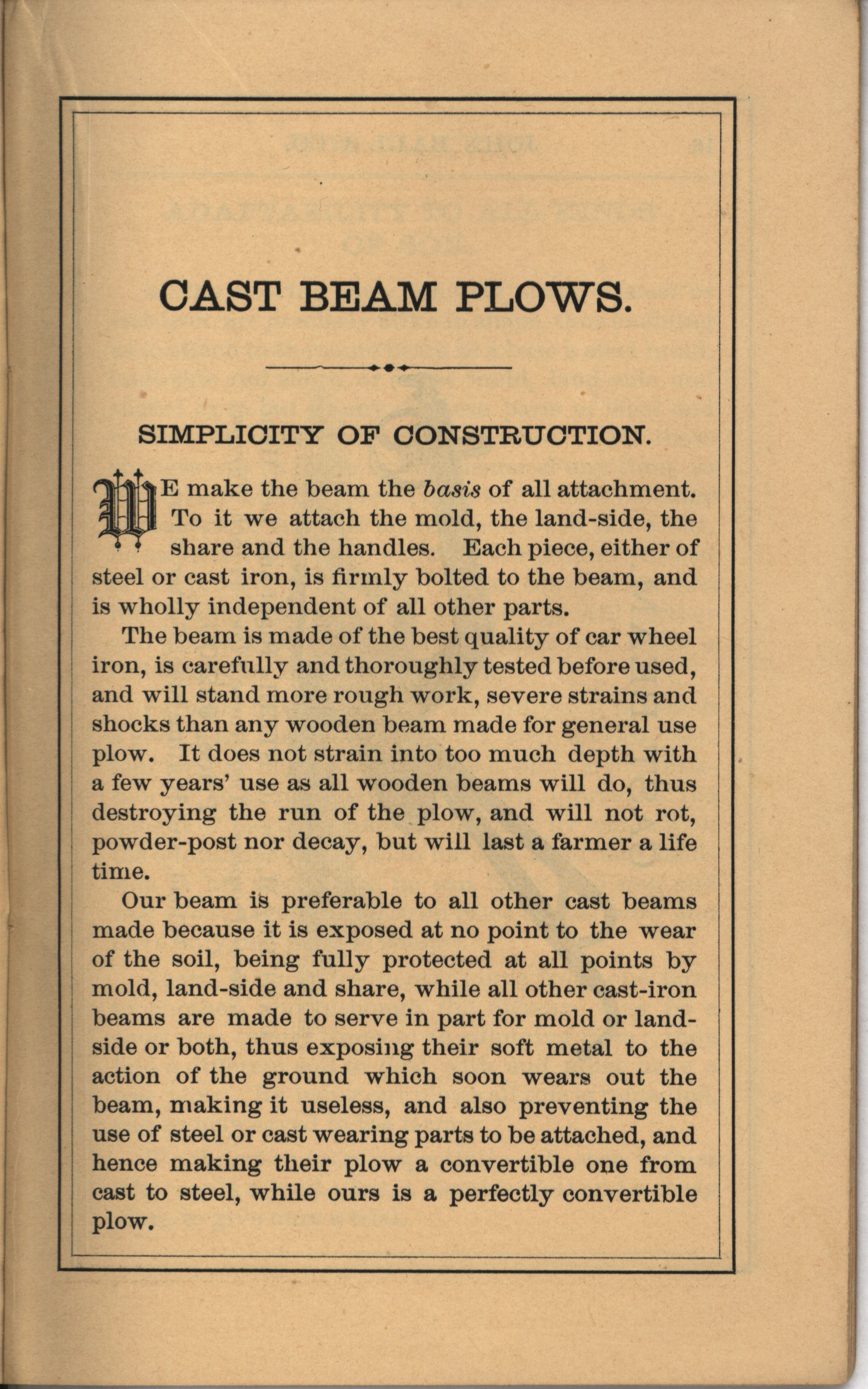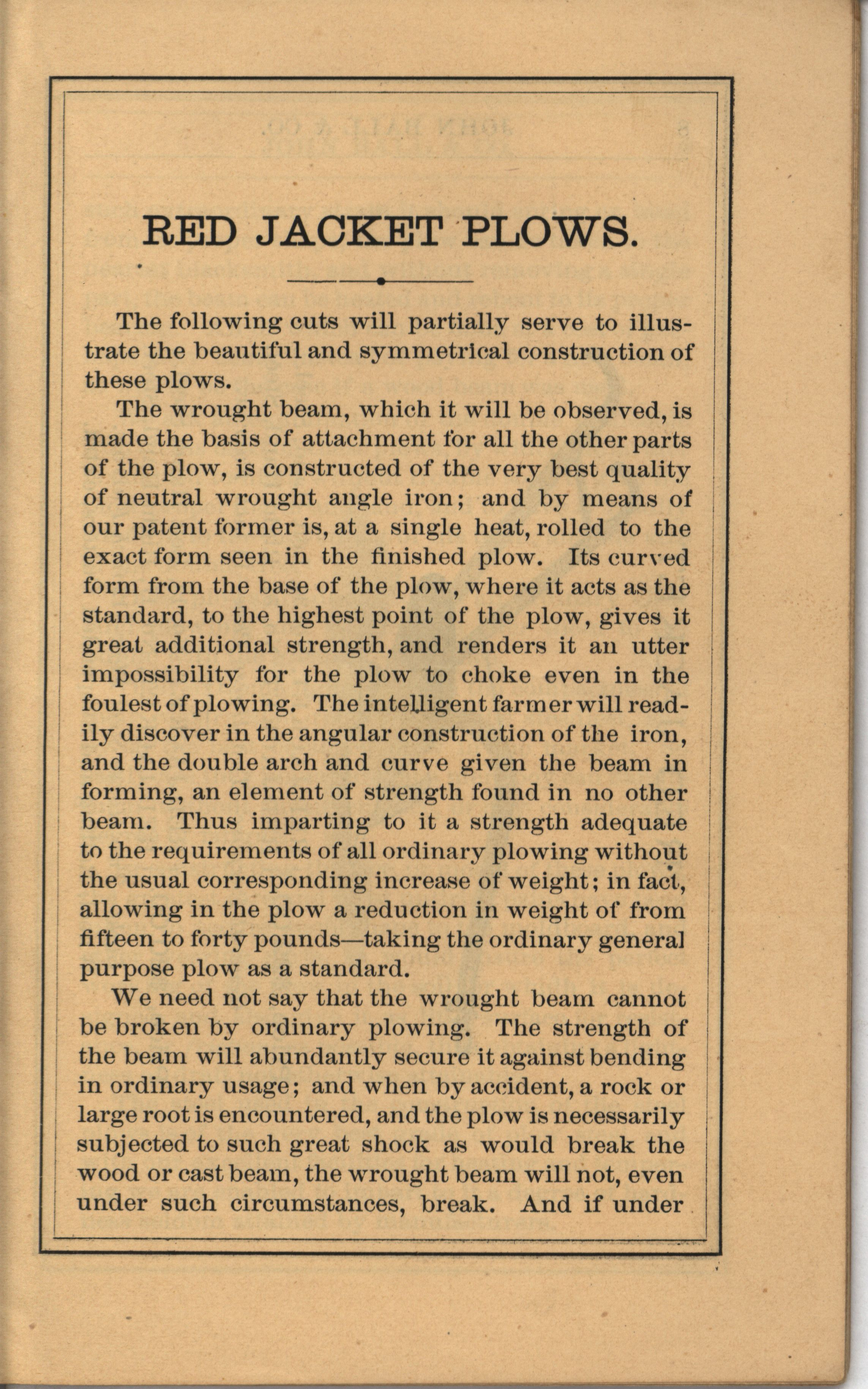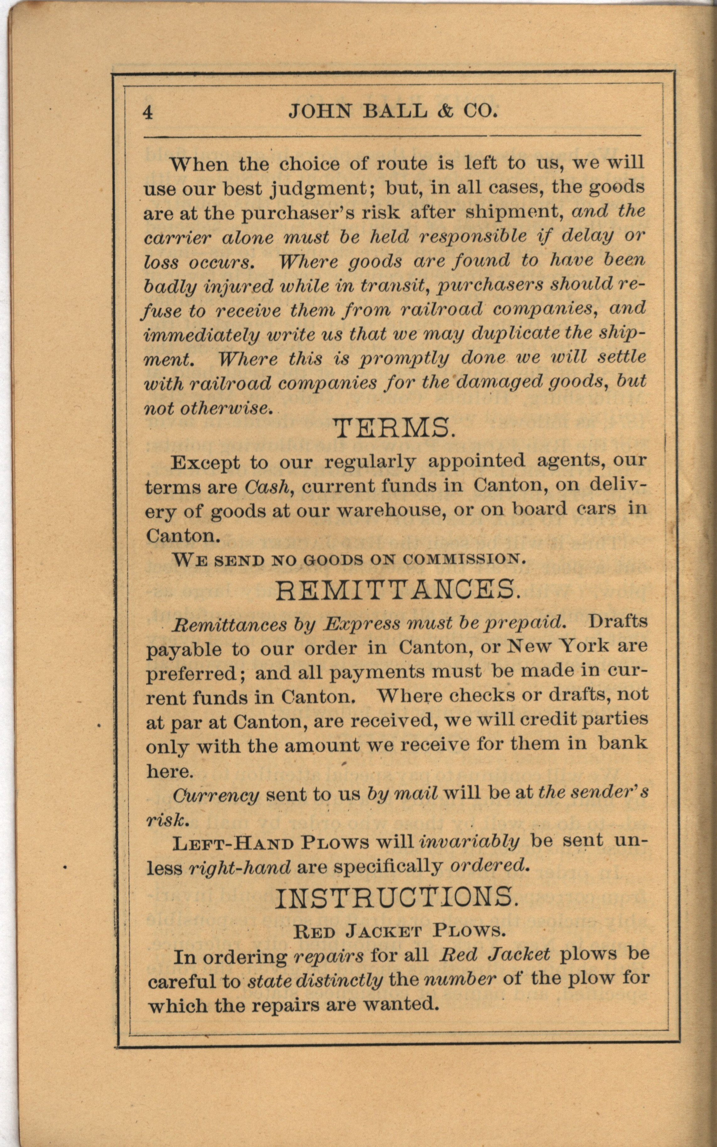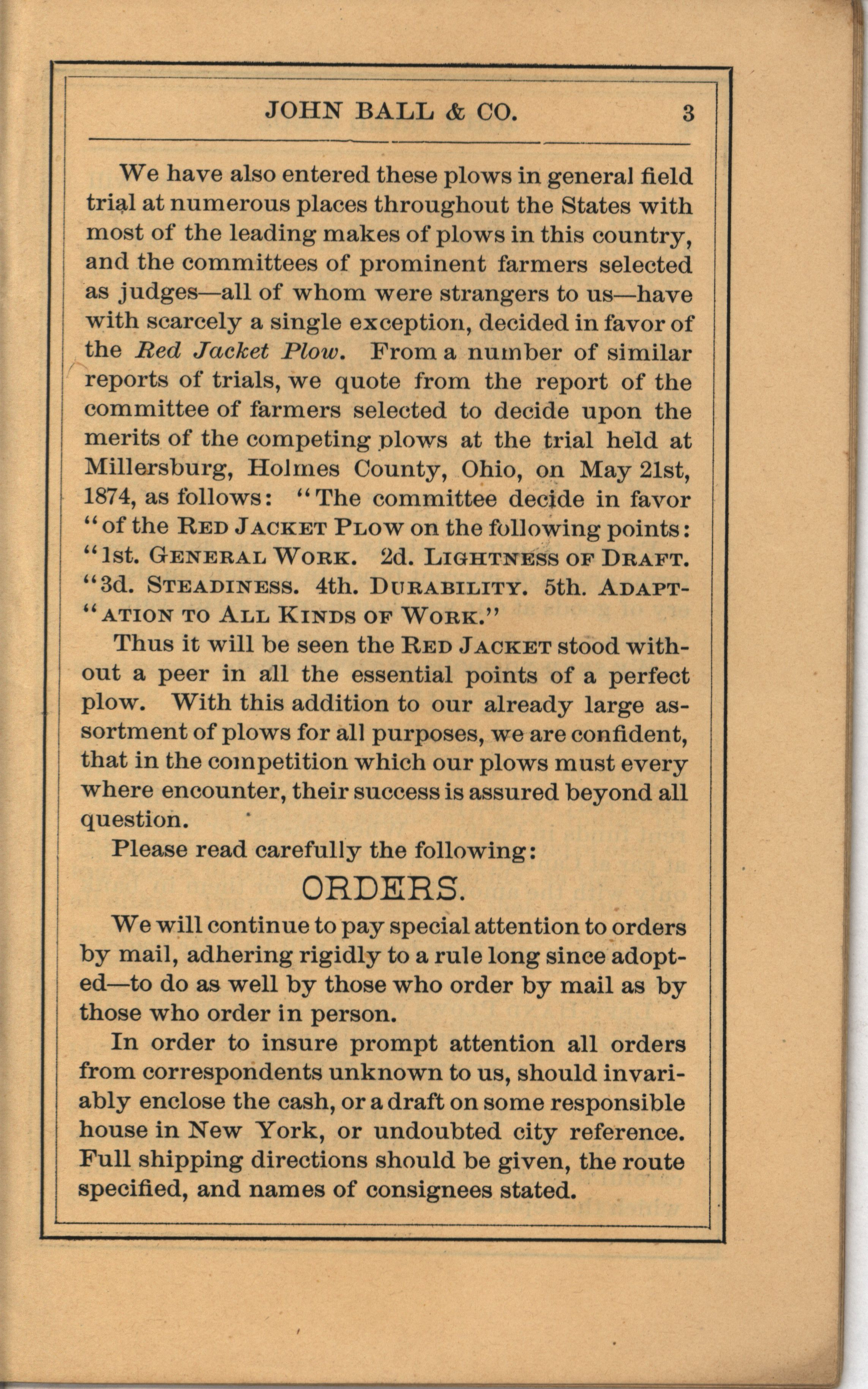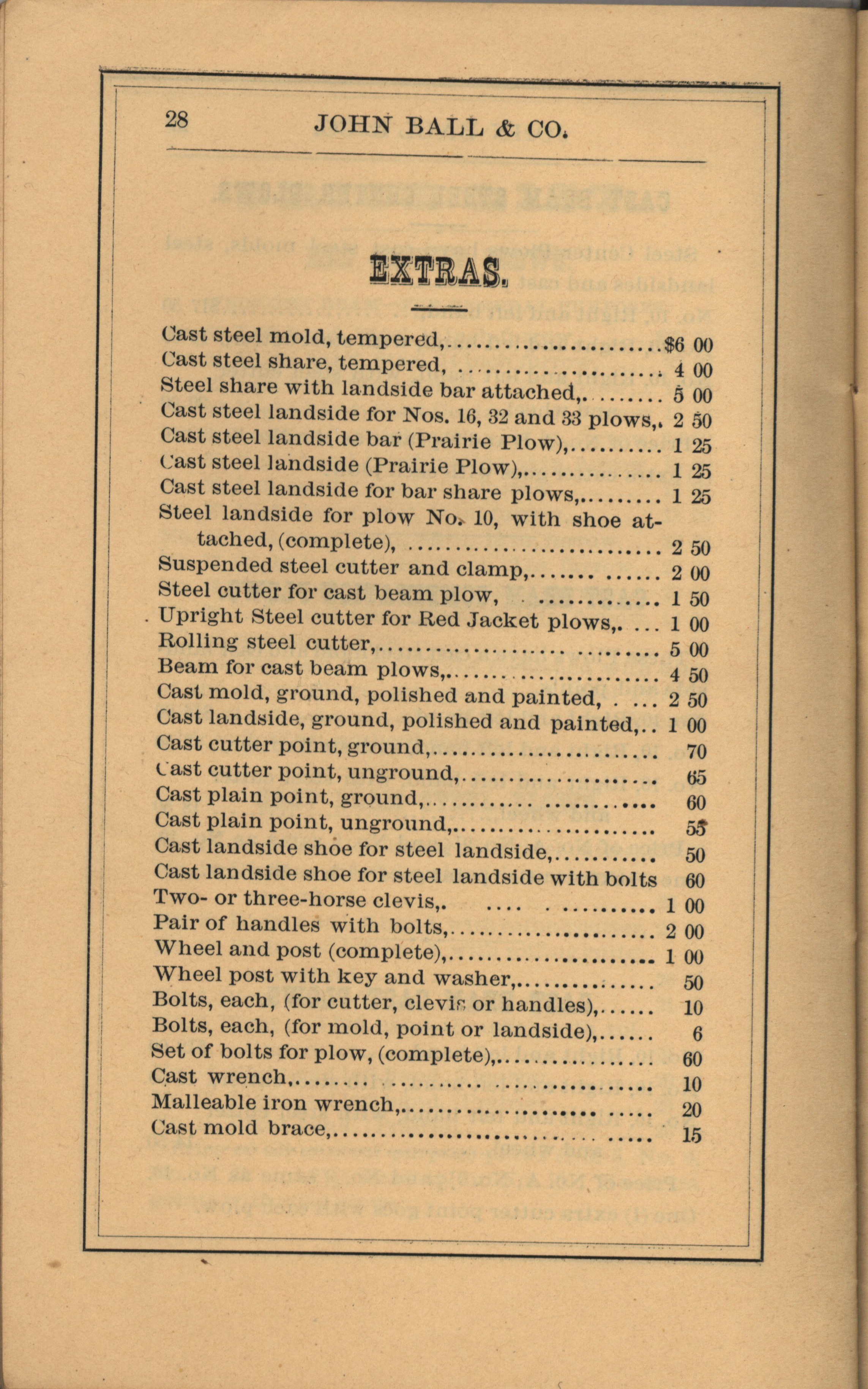 - Catalog describing the plow products offered by John Ball and Company for the 1875 season, including illustrations.