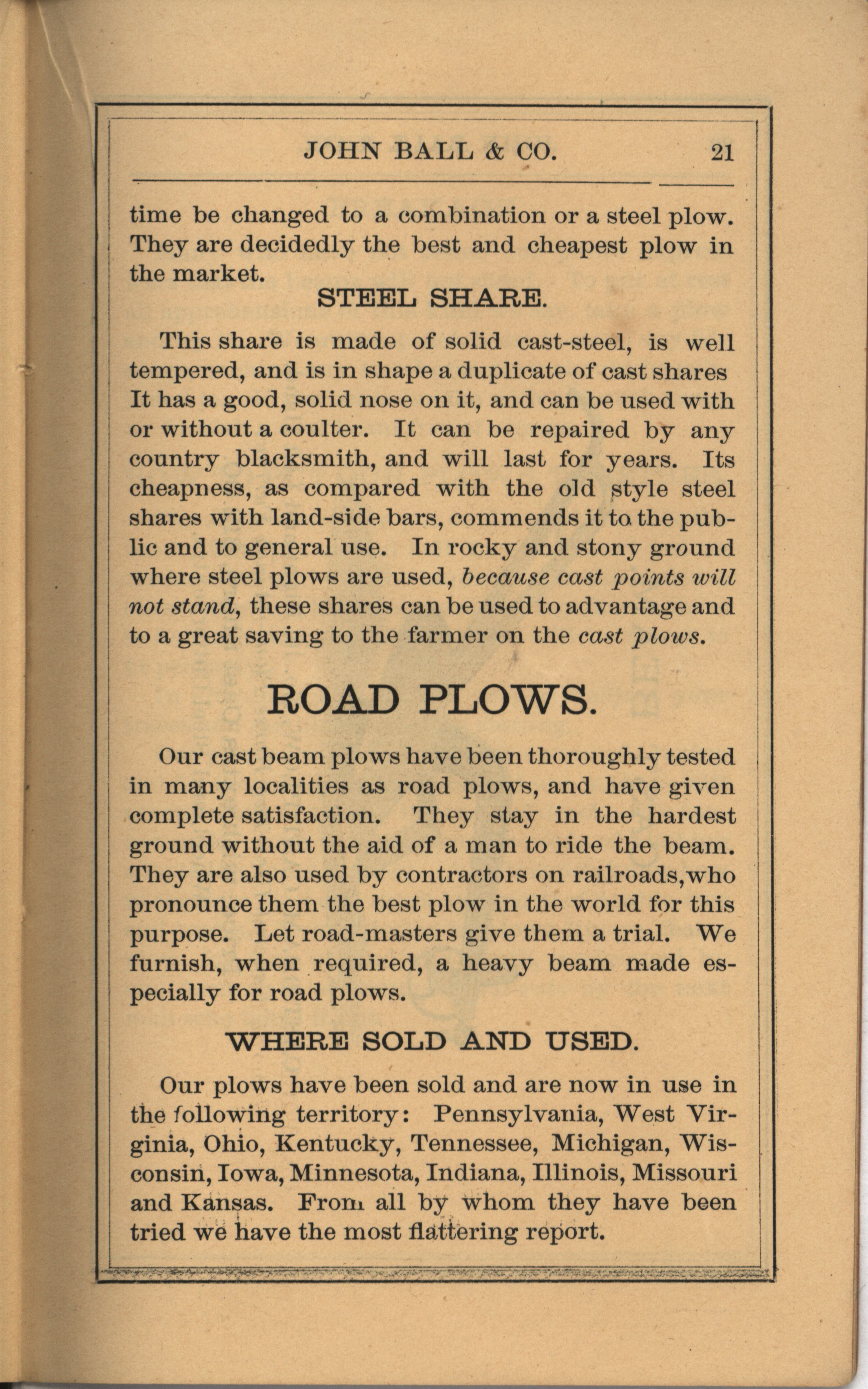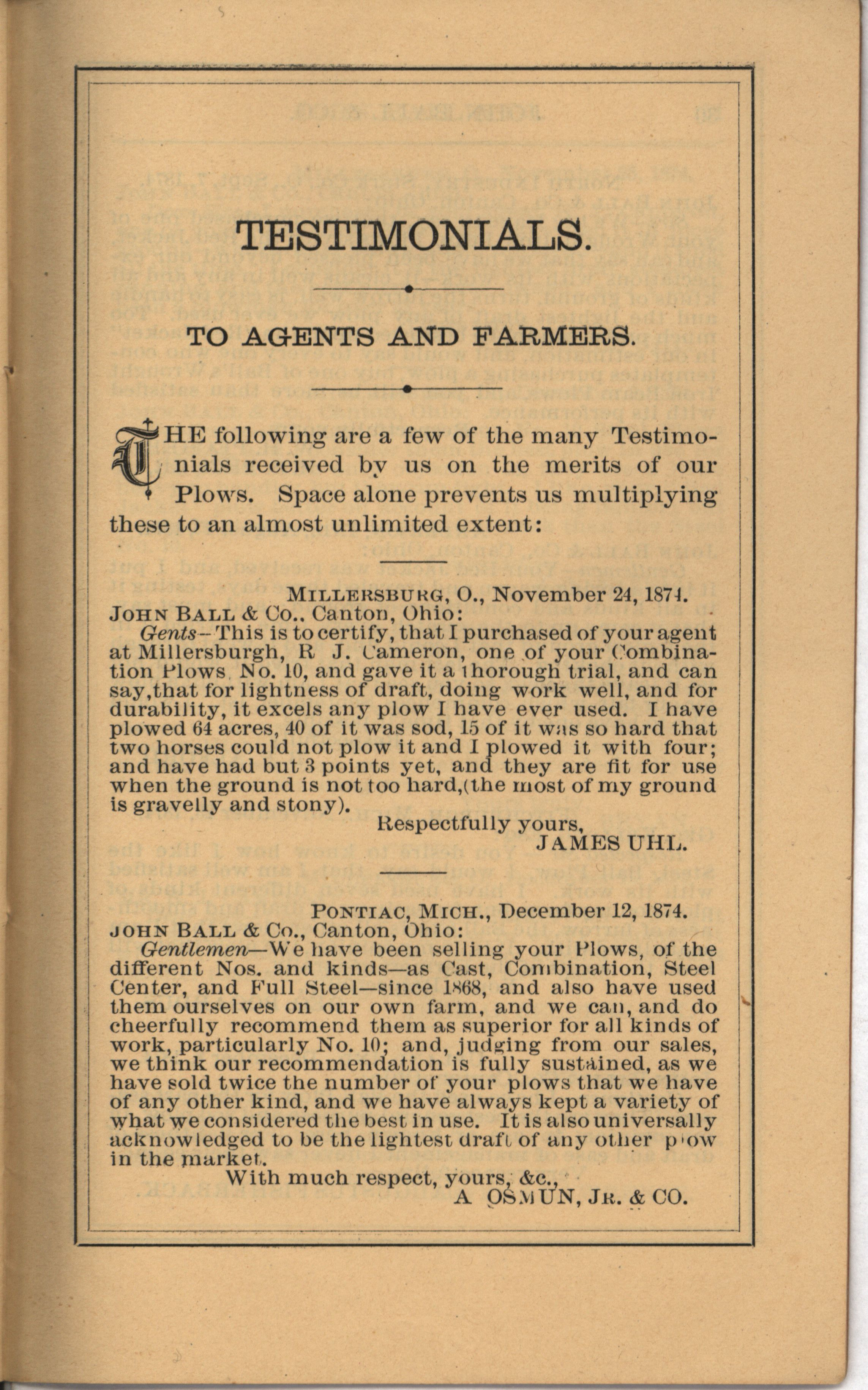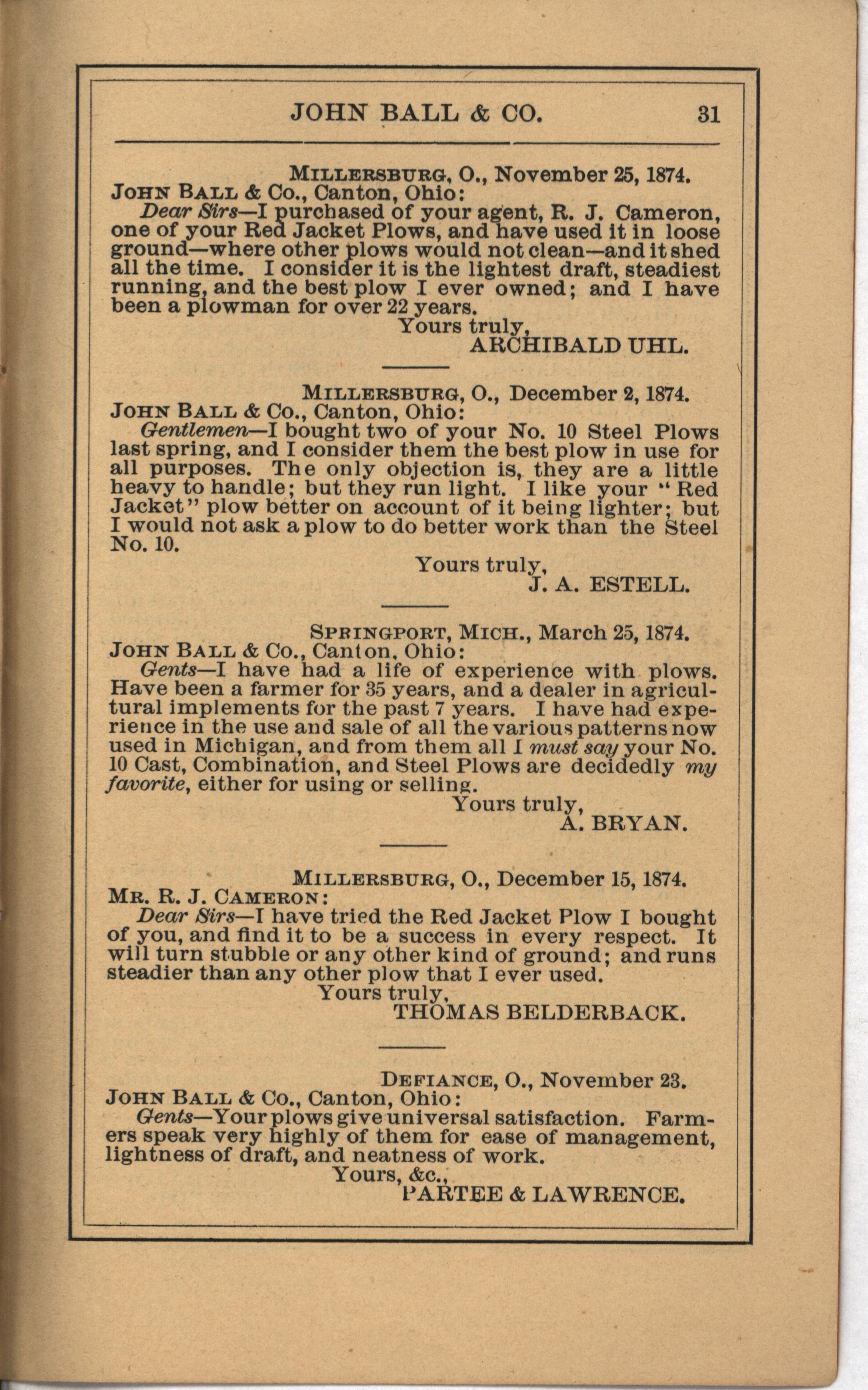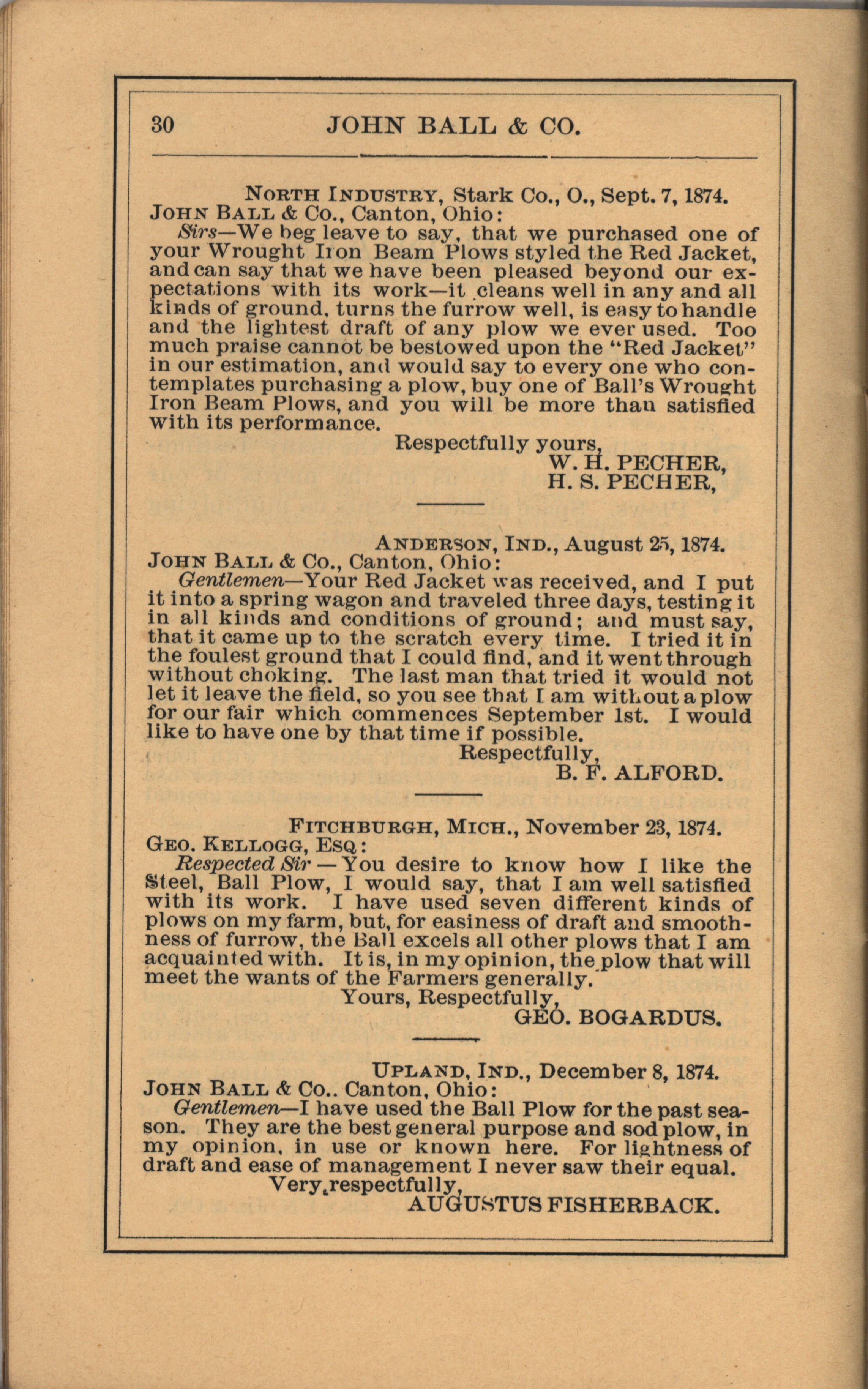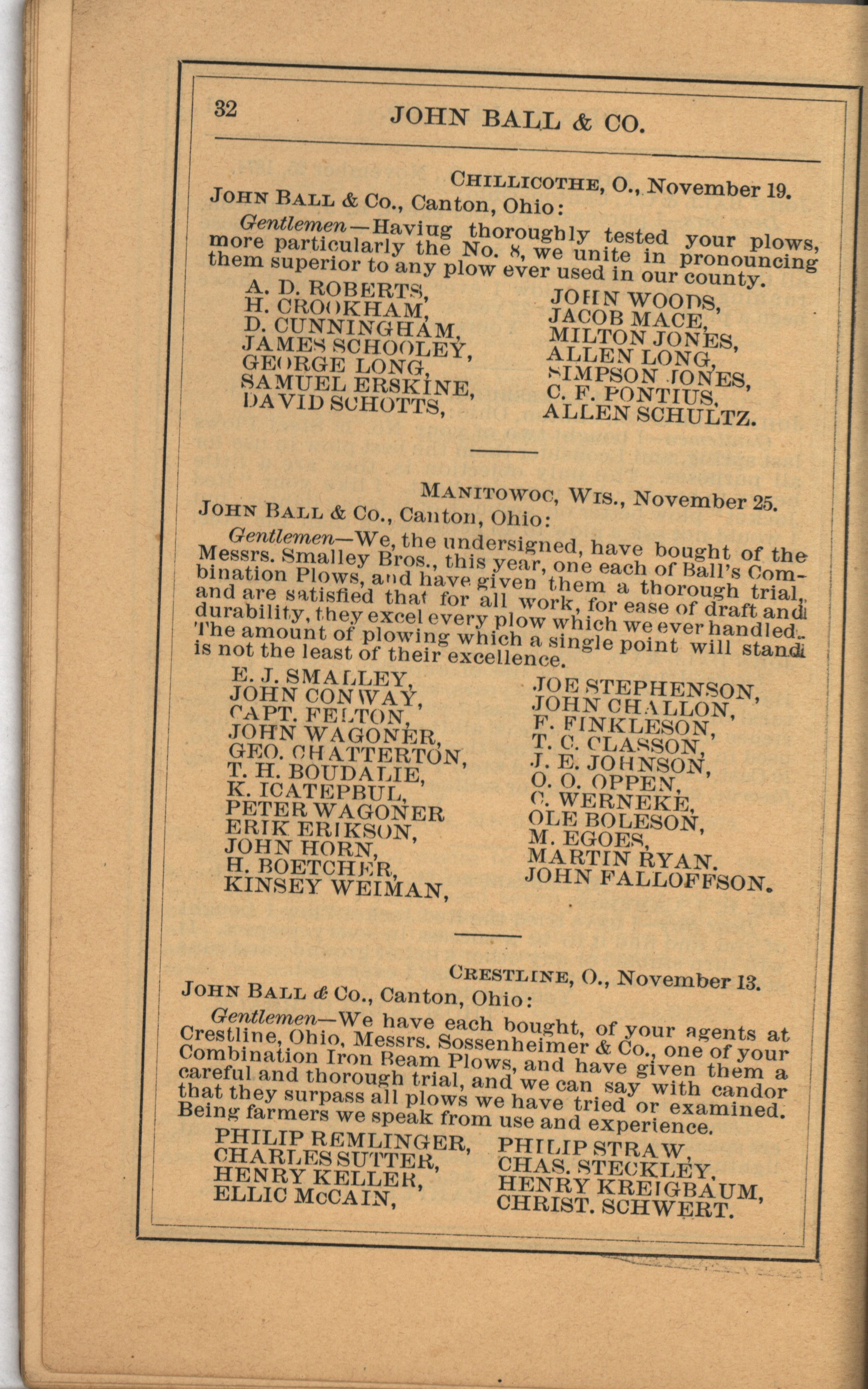 - "Ball's Patent Steel, Cast and Combination Plows 1875 catalog", Agricultural Machinery Literature Collection, Iowa State University Library Digital Collections