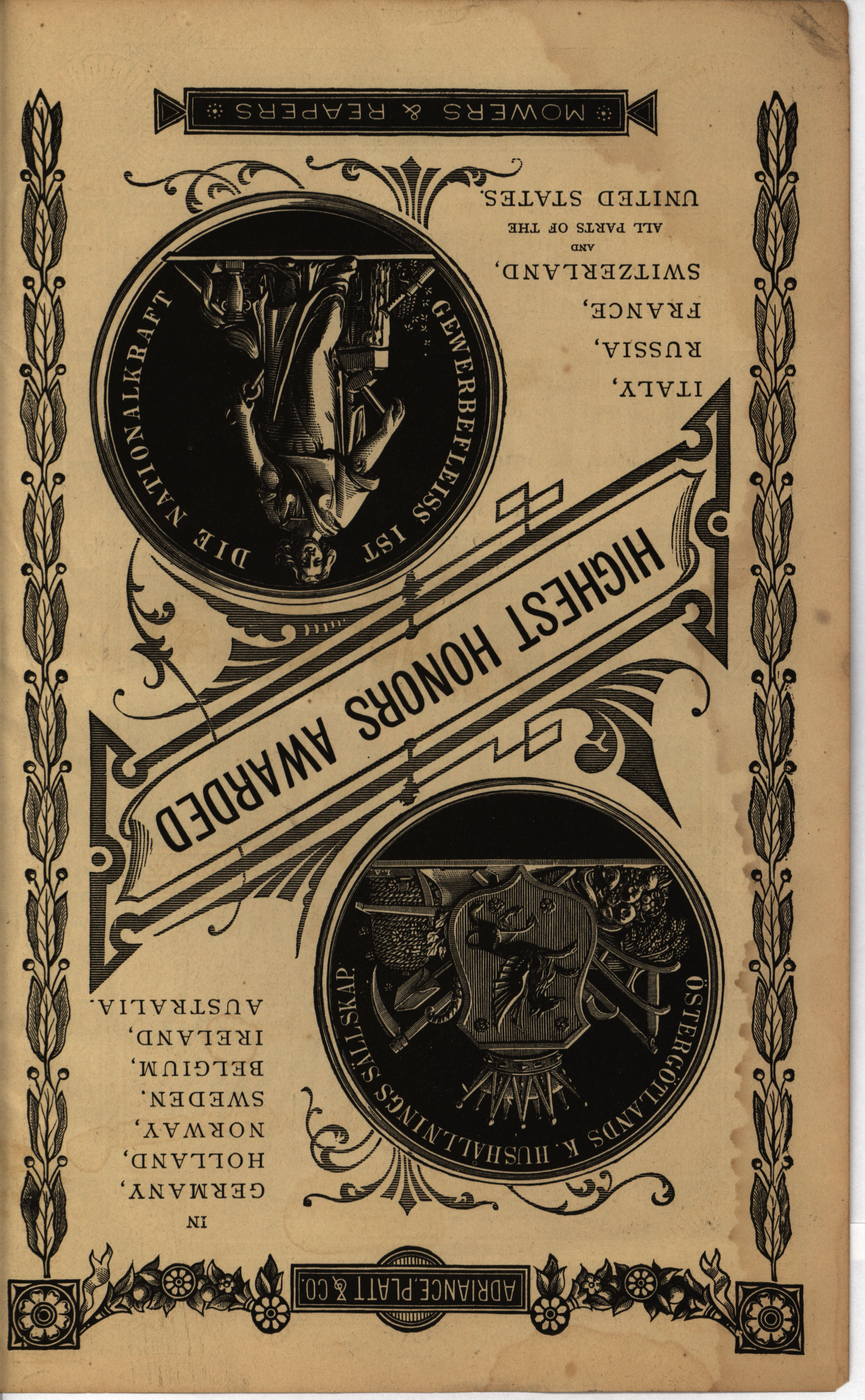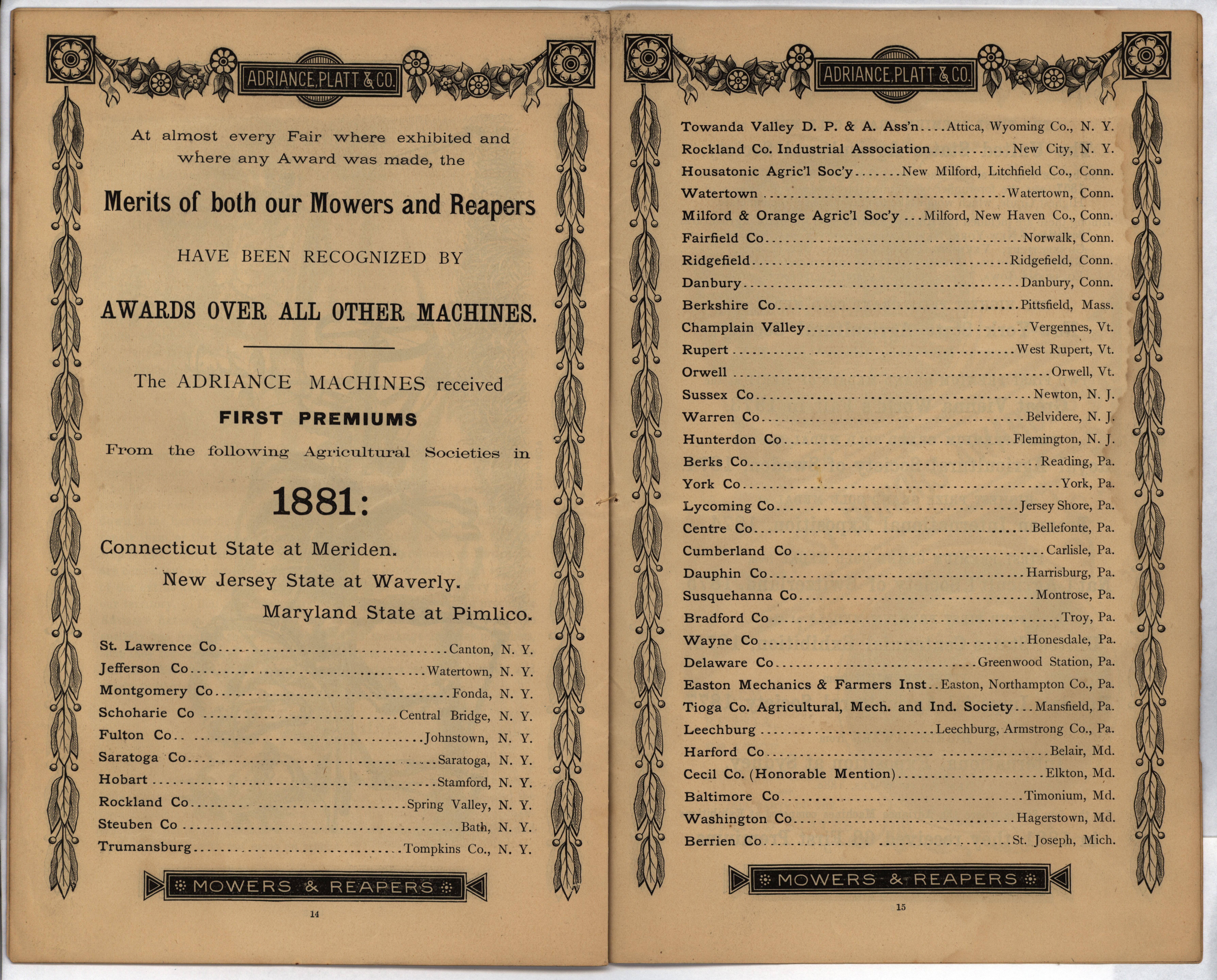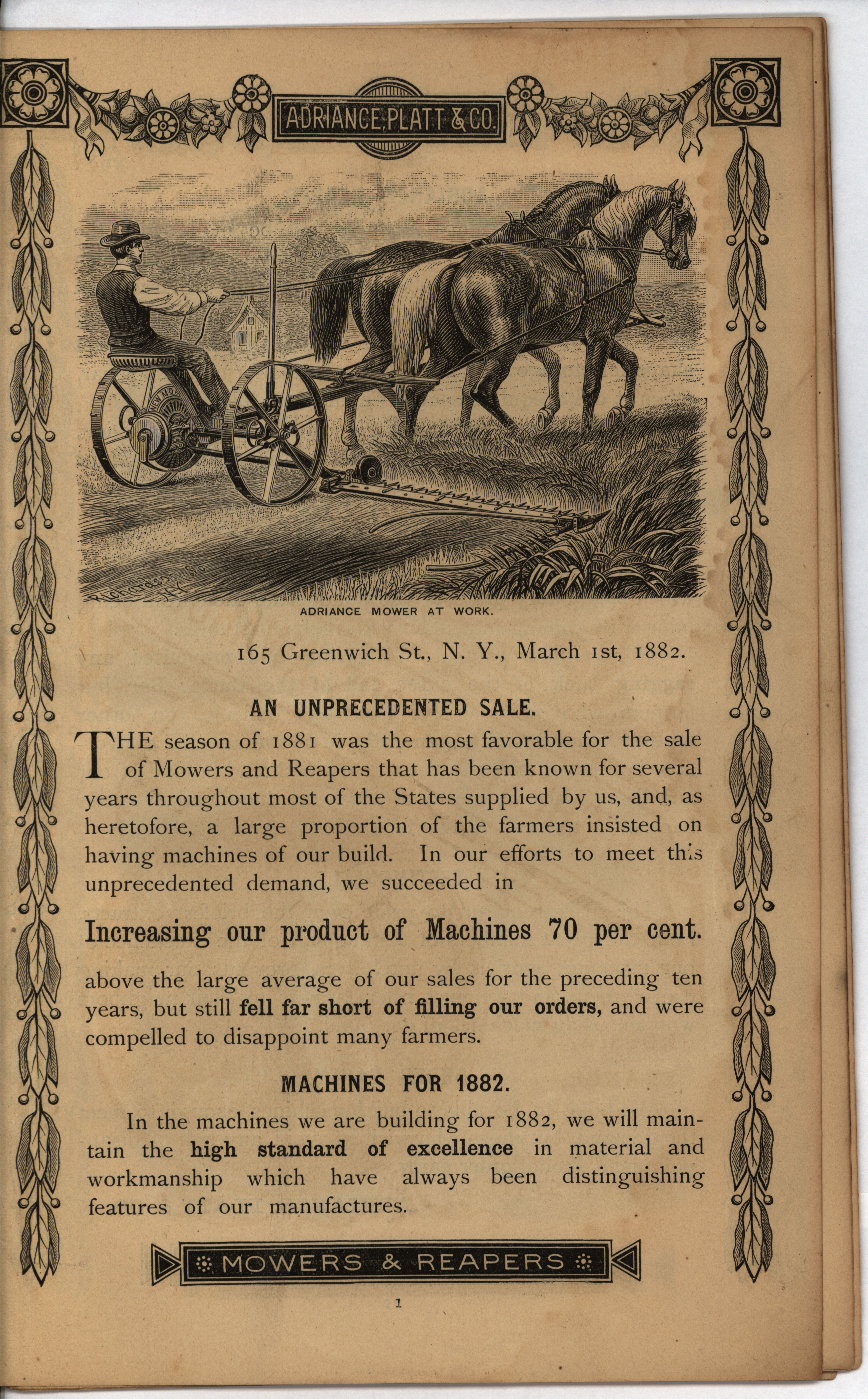 - A catalog detailing the products offered by Adriance, Platt and Company, including the Adriance mower and Adriance Reaper. Includes illustrations.