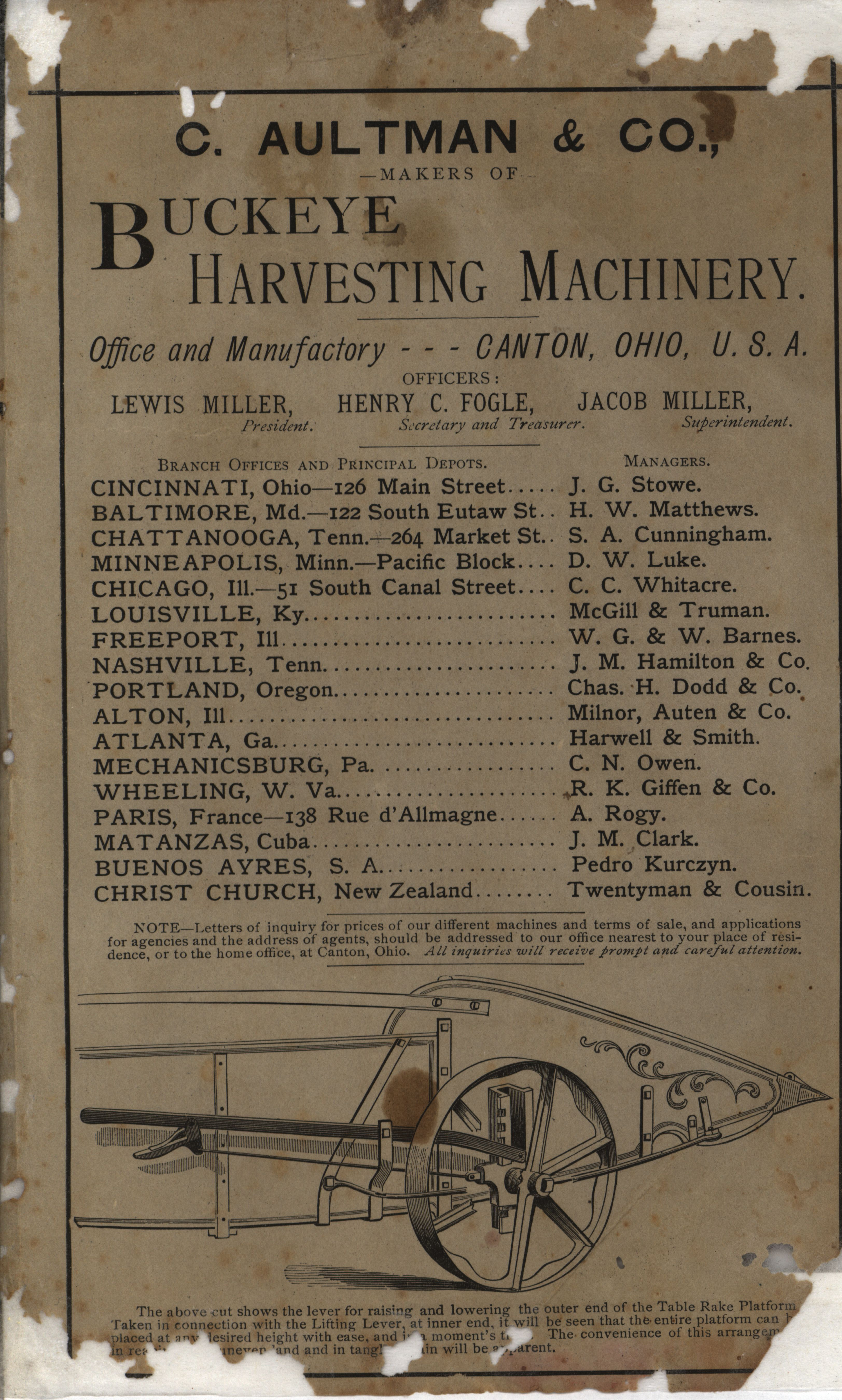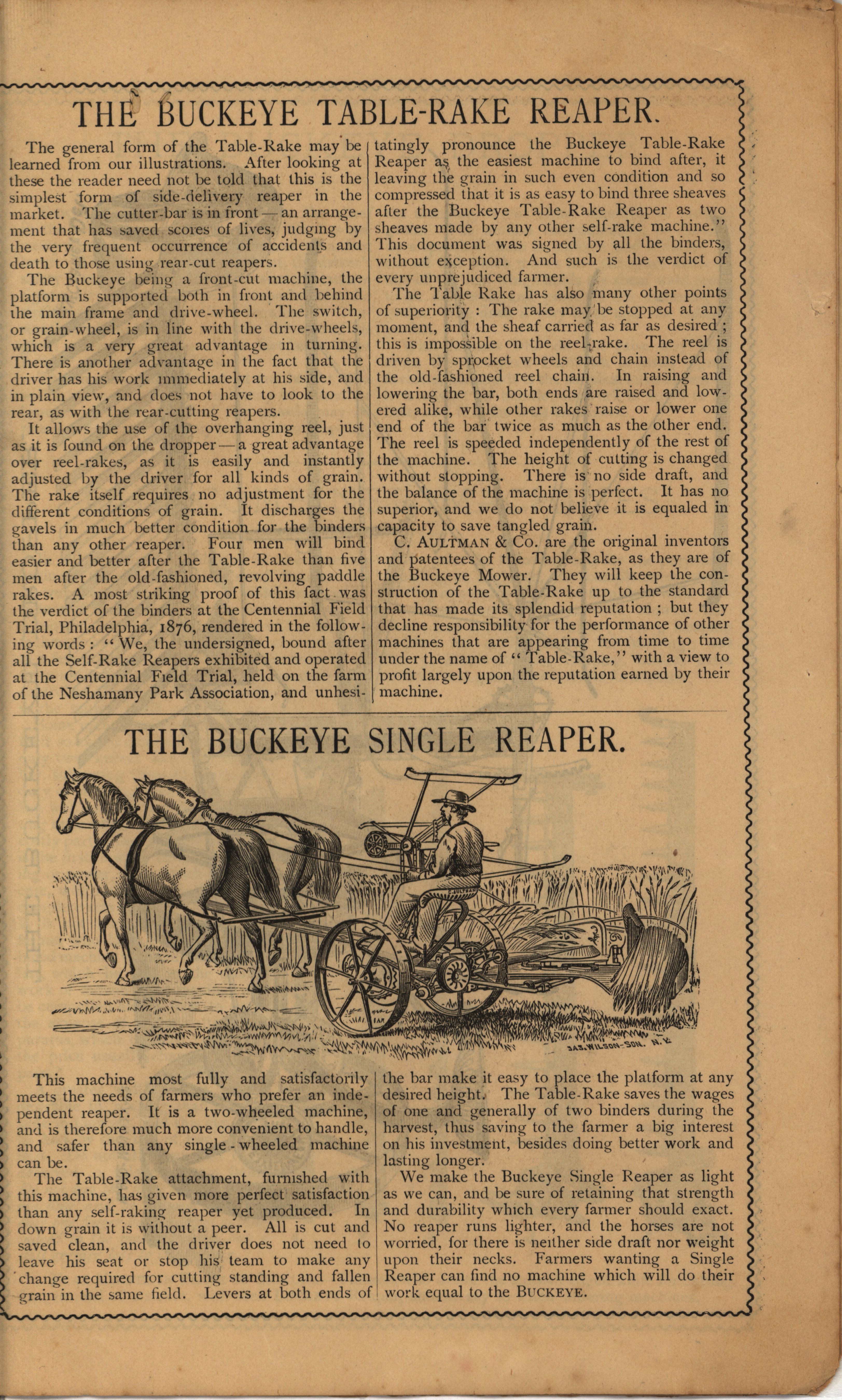 - Catalog from C. Aultman and Company describing the Buckeye agricultural product line, including illustrations.