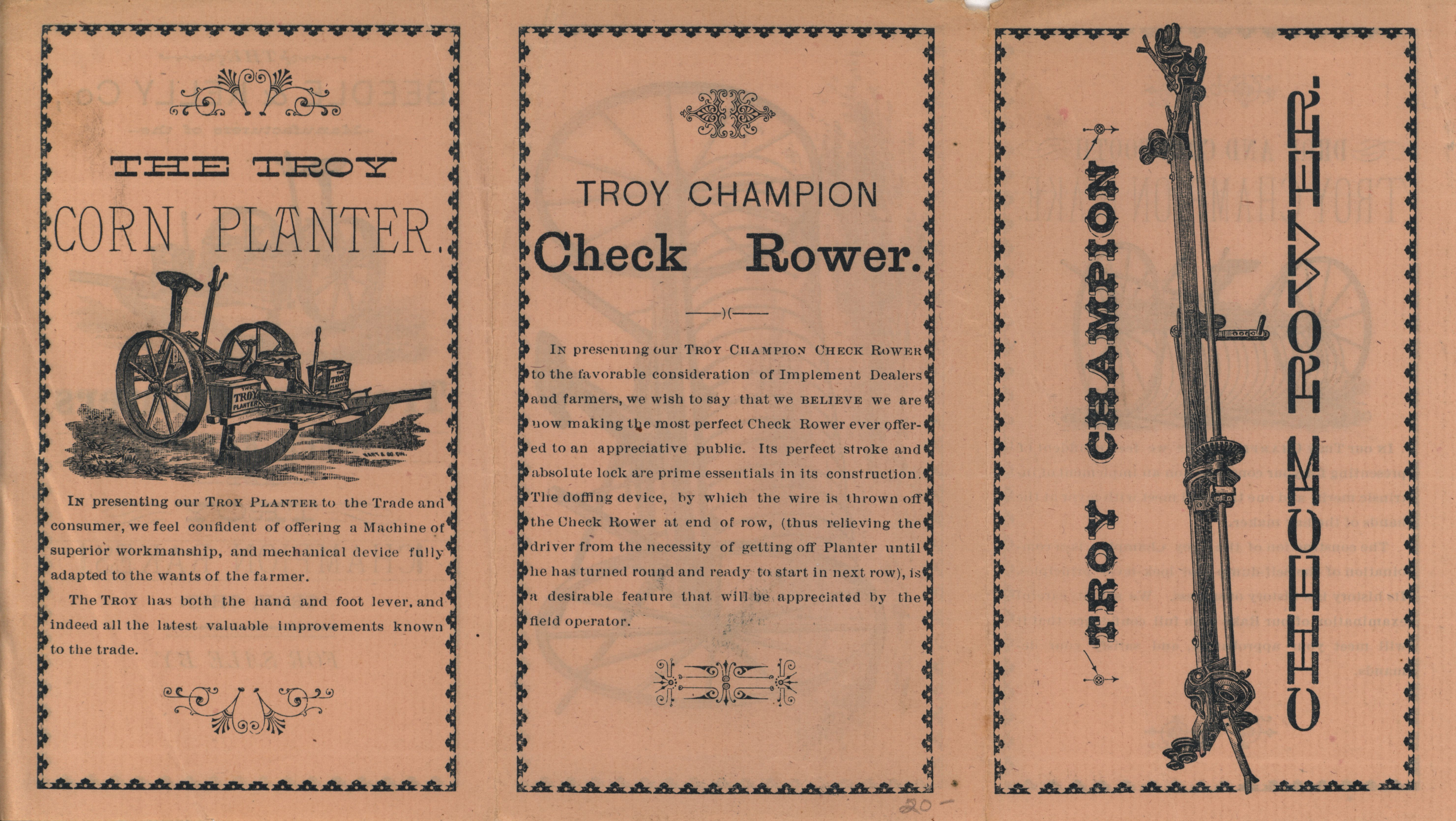 - Illustrated catalog describing the Troy corn planters, check rowers and champion rakes offered by the Beedle and Kelly Company.