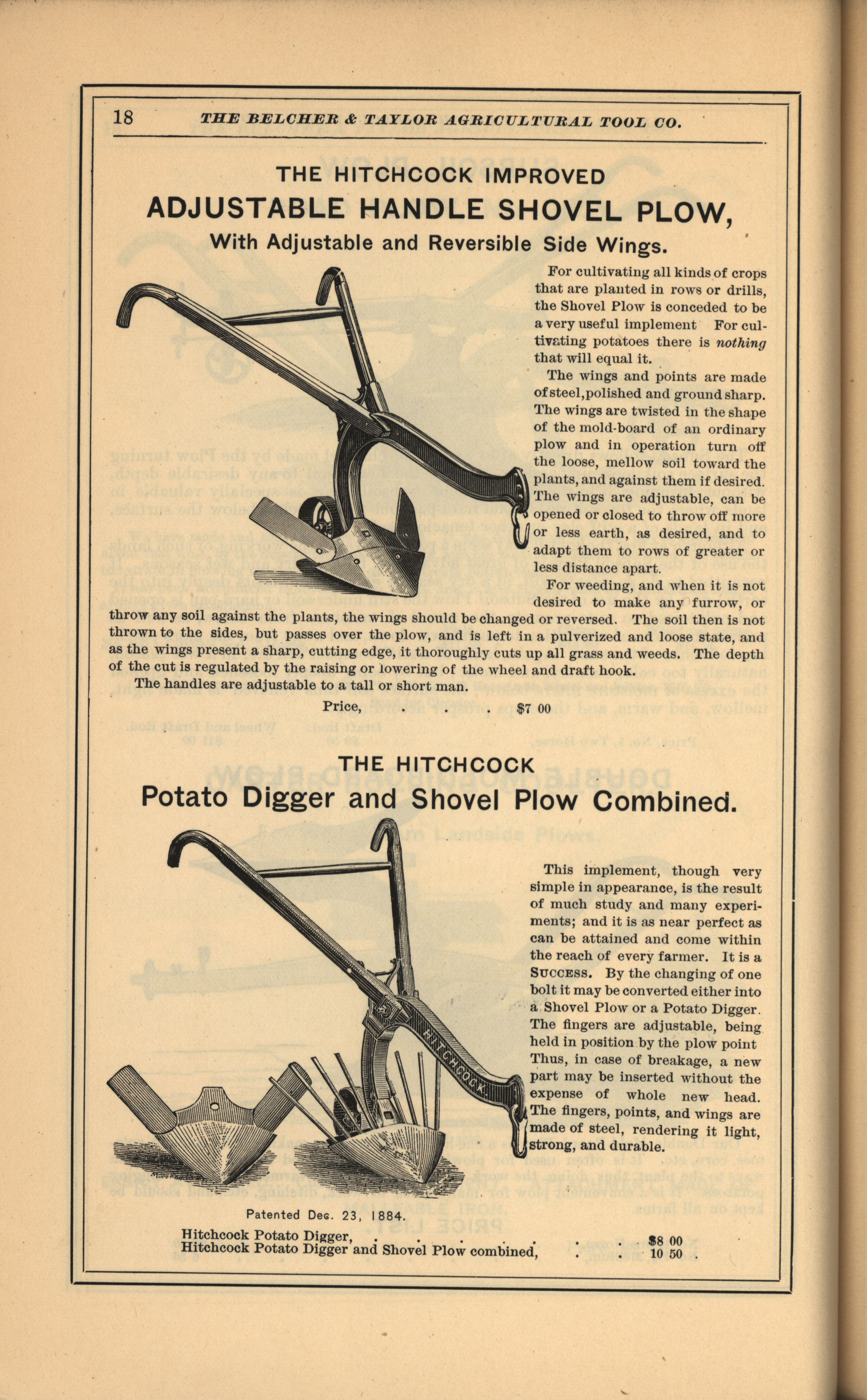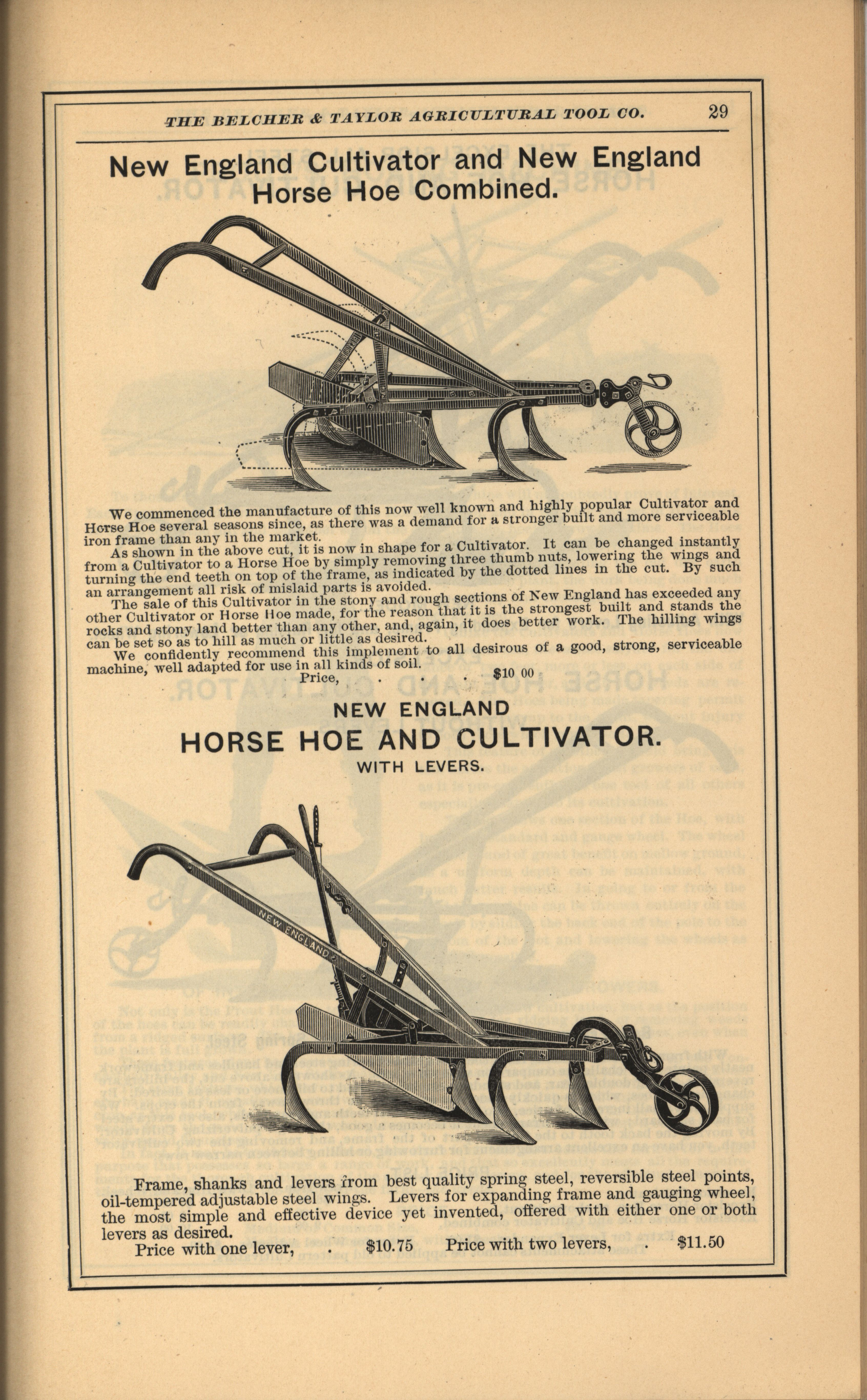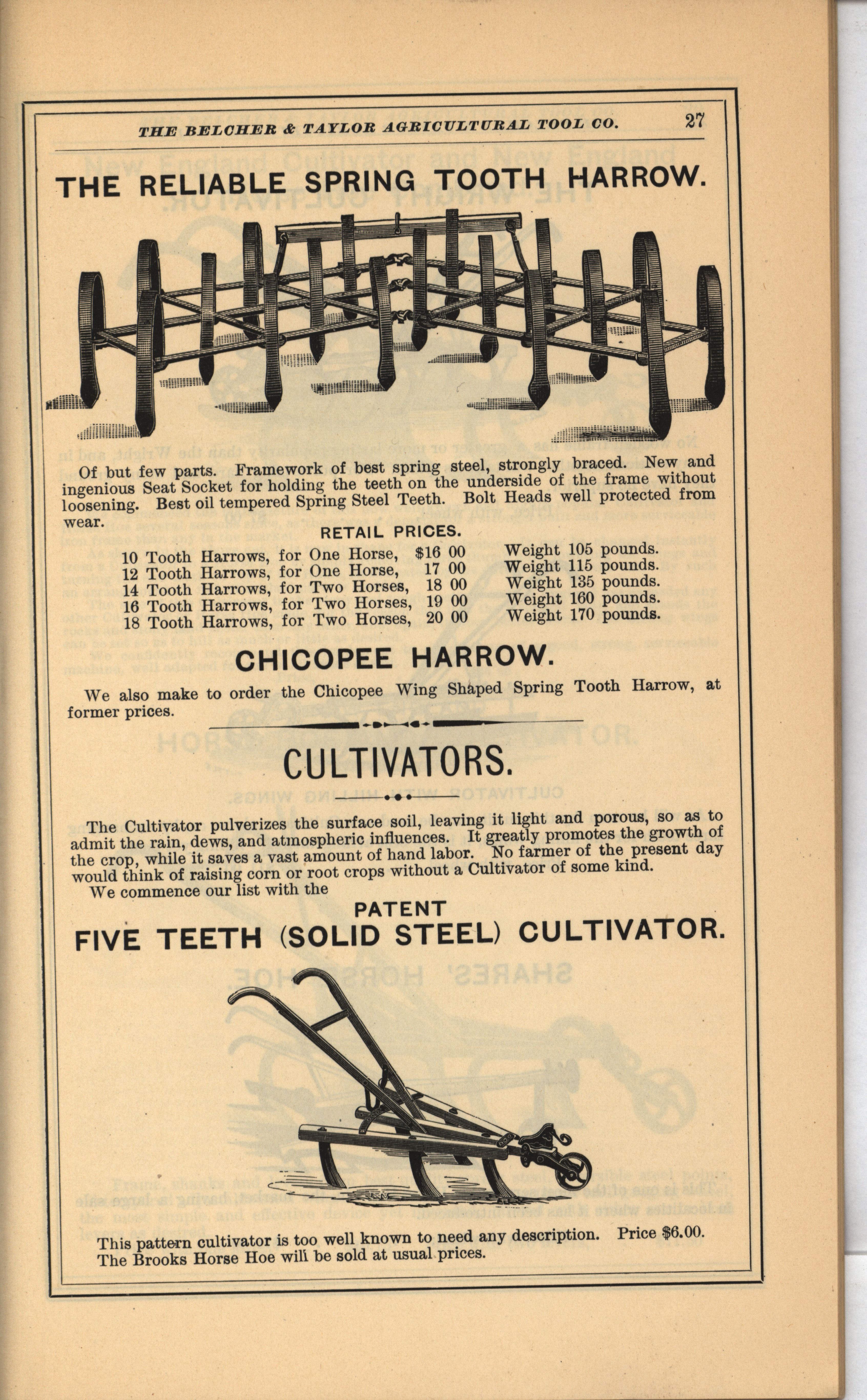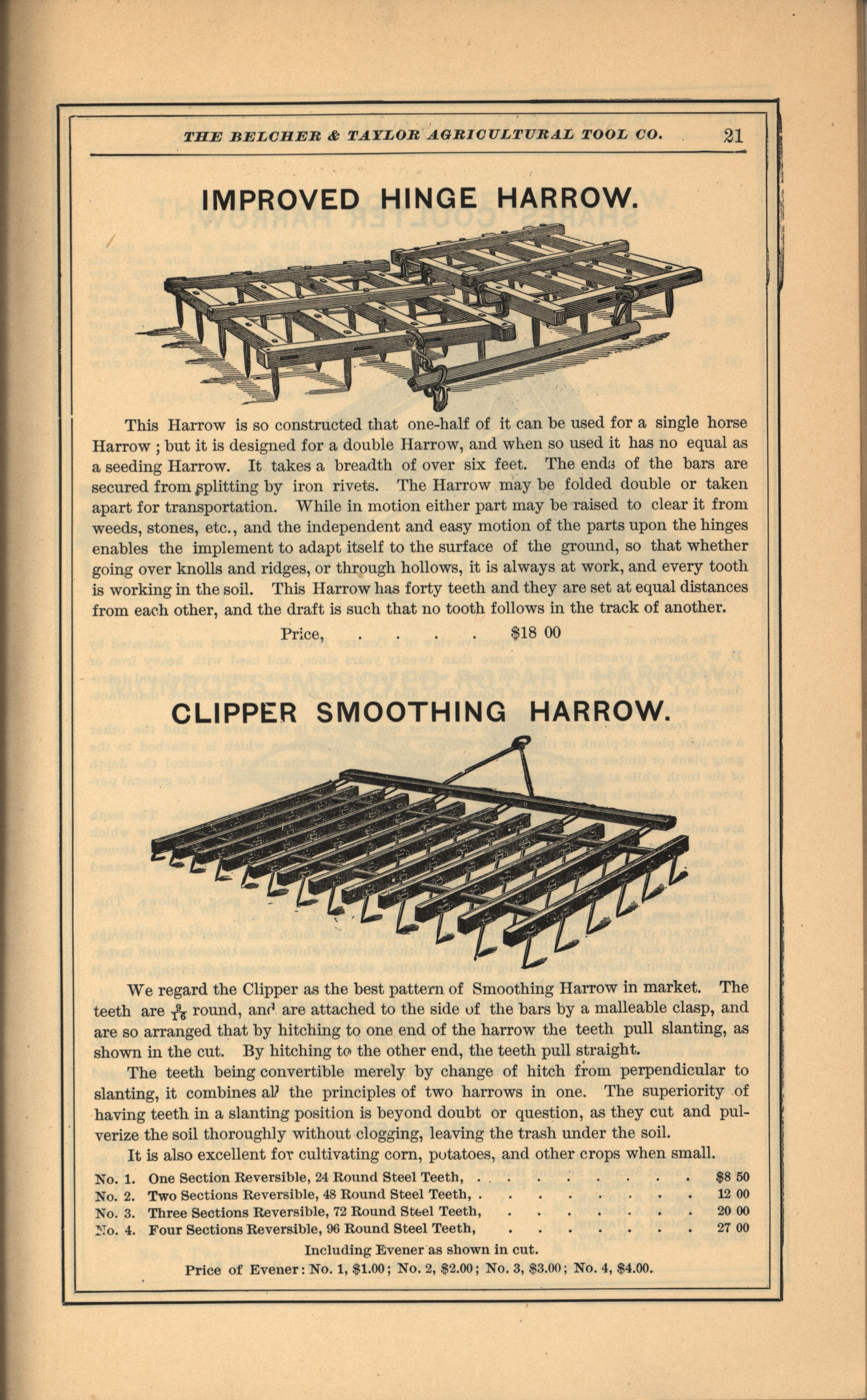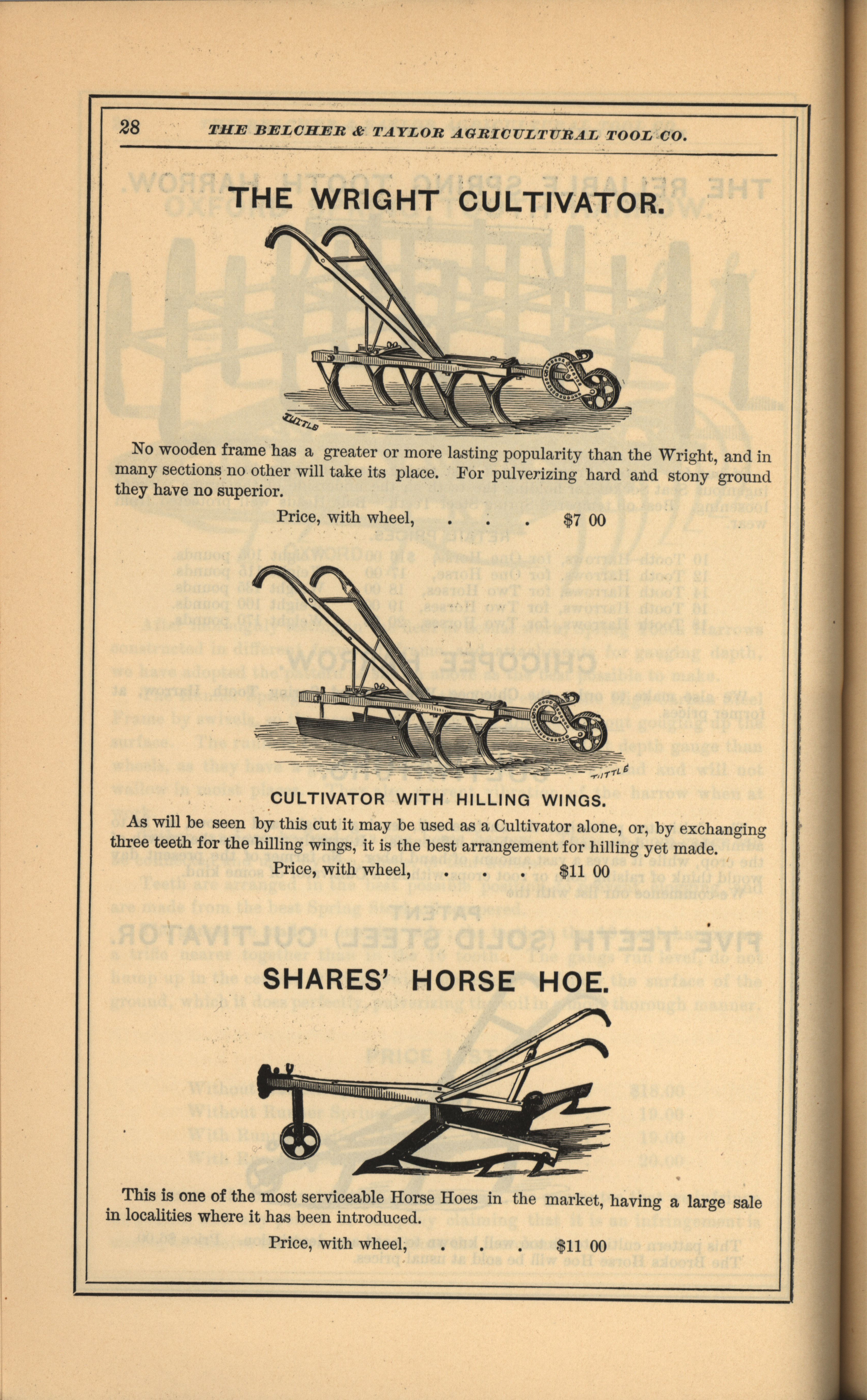 - Catalog describing agricultural products offered by the Belcher and Taylor Agricultural Tool Company, includes illustrations.