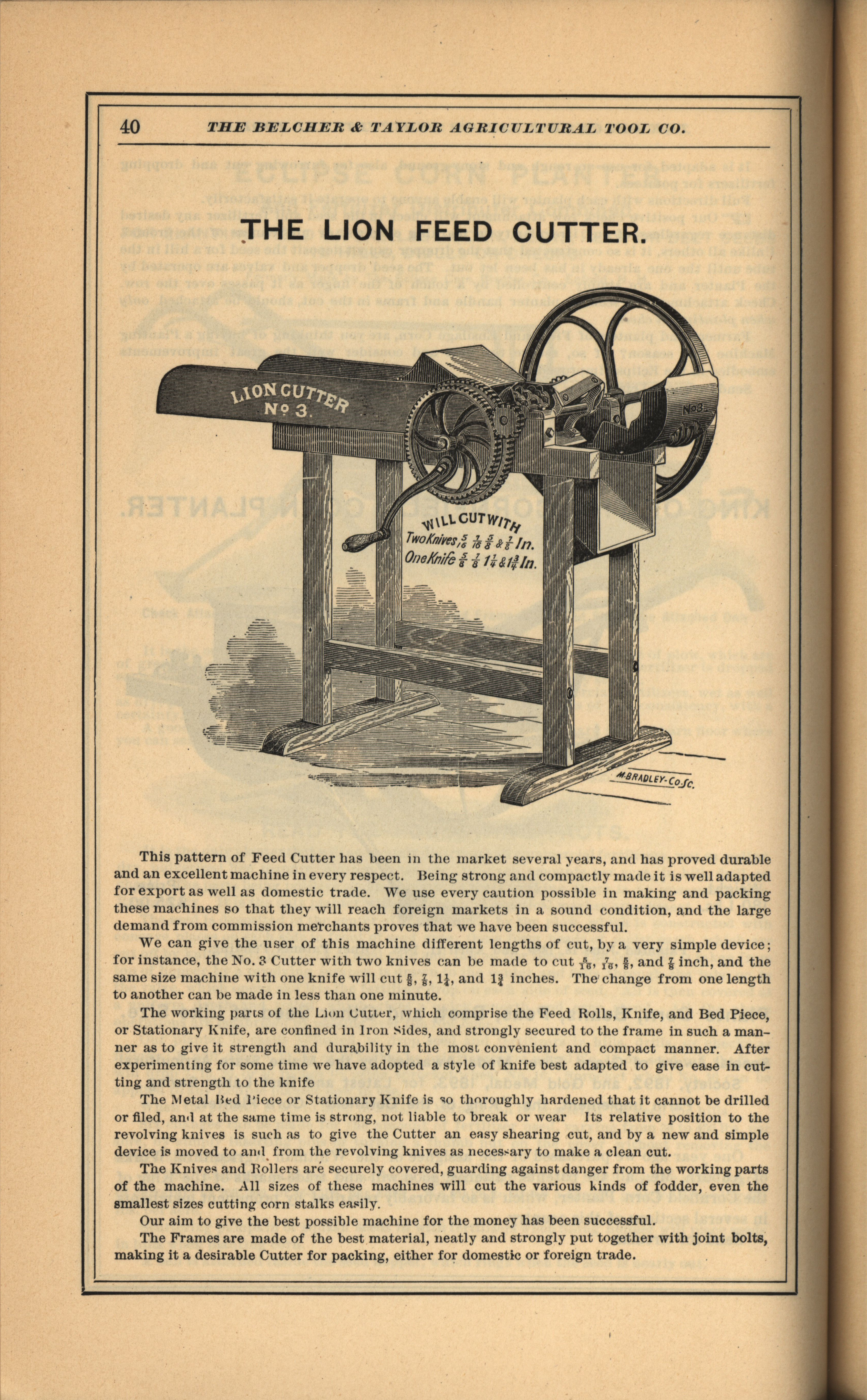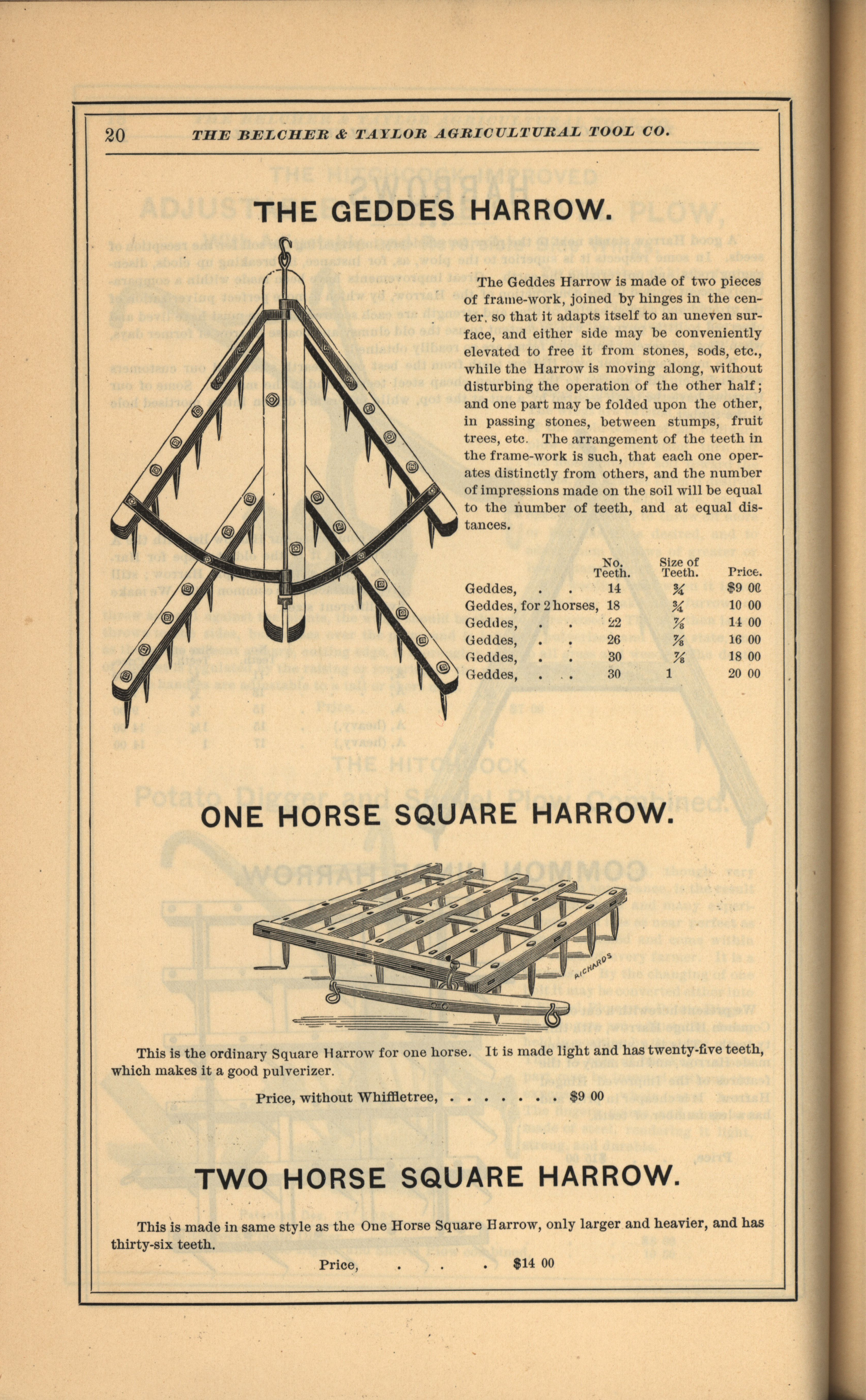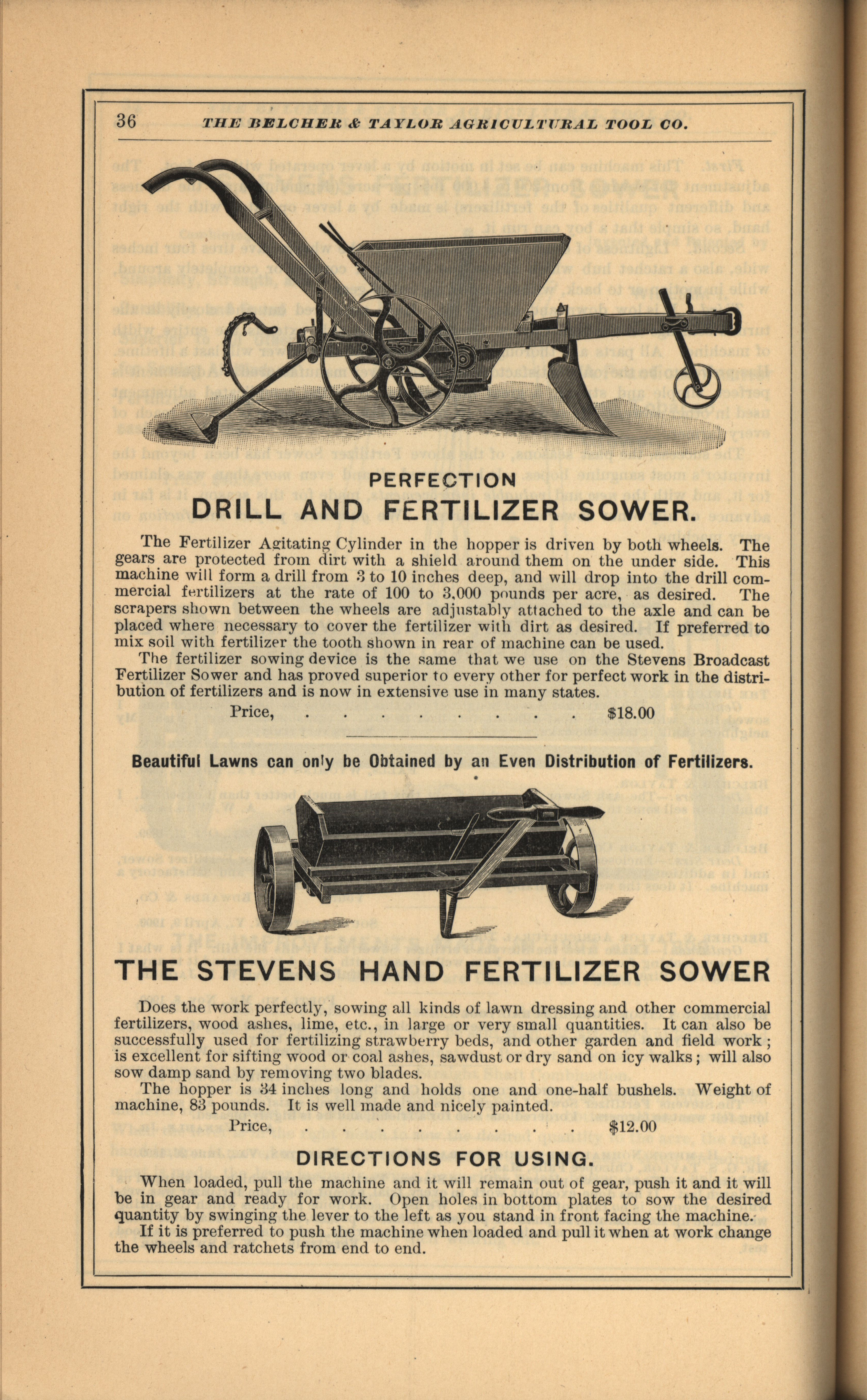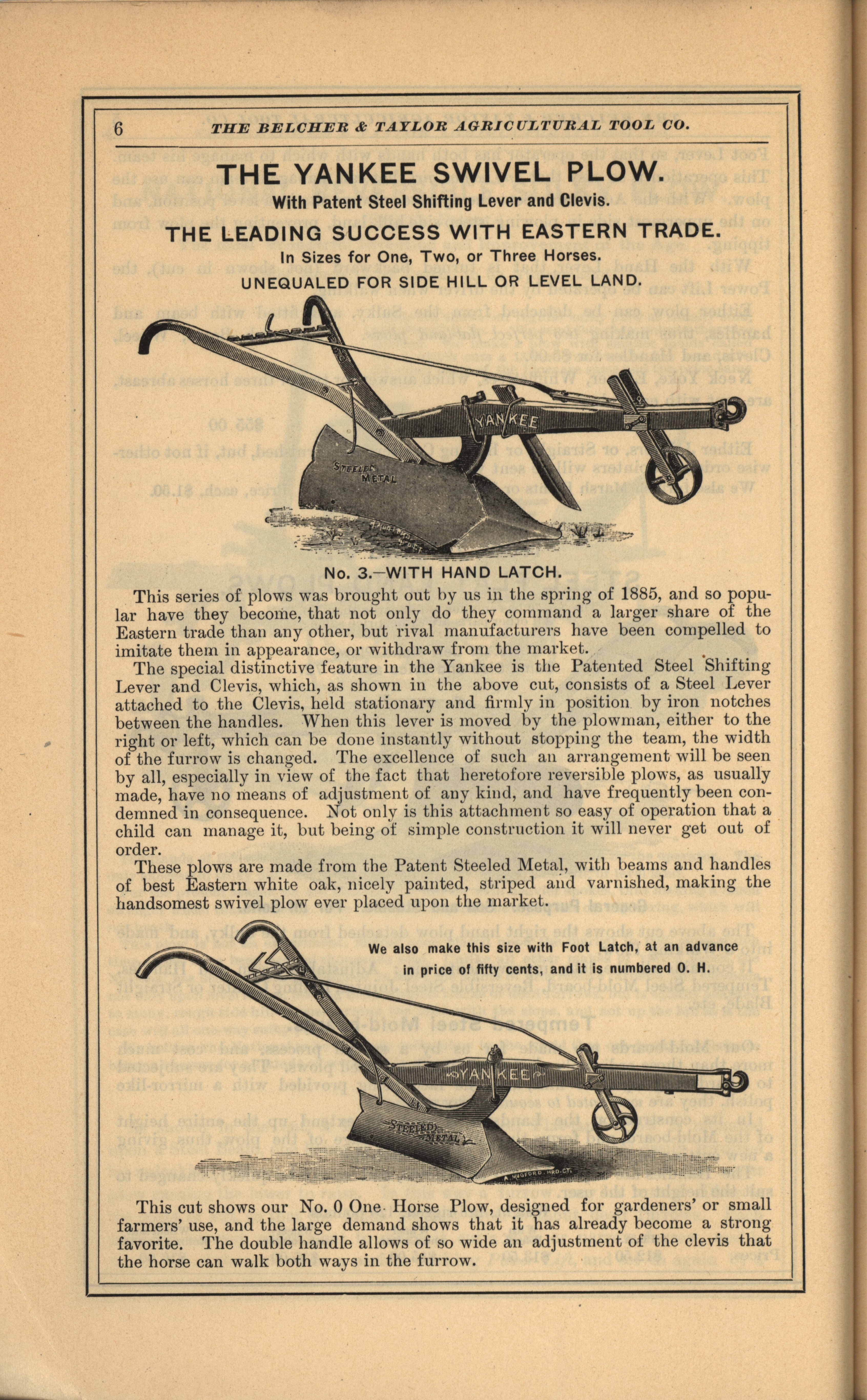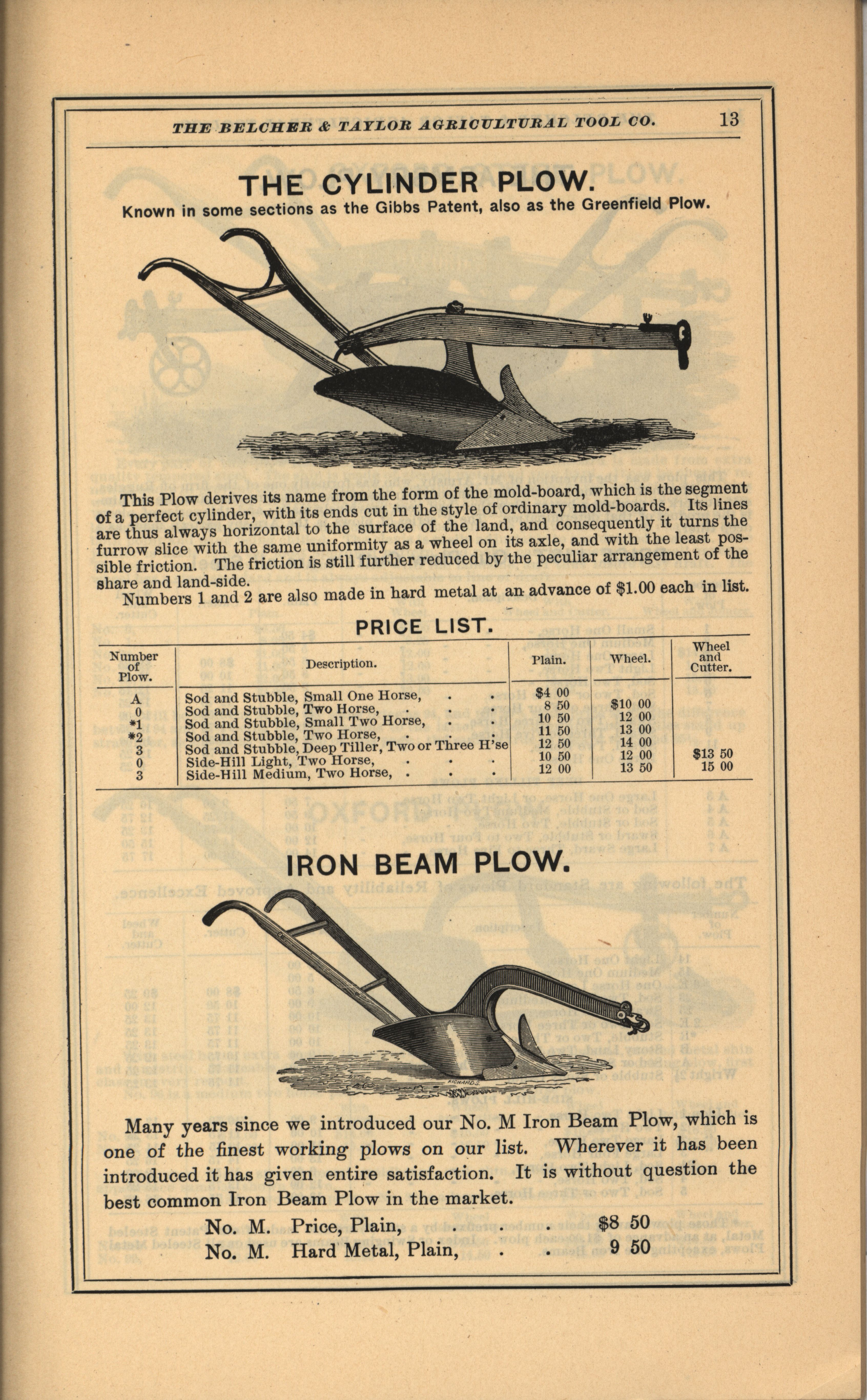 - Catalog describing agricultural products offered by the Belcher and Taylor Agricultural Tool Company, includes illustrations.