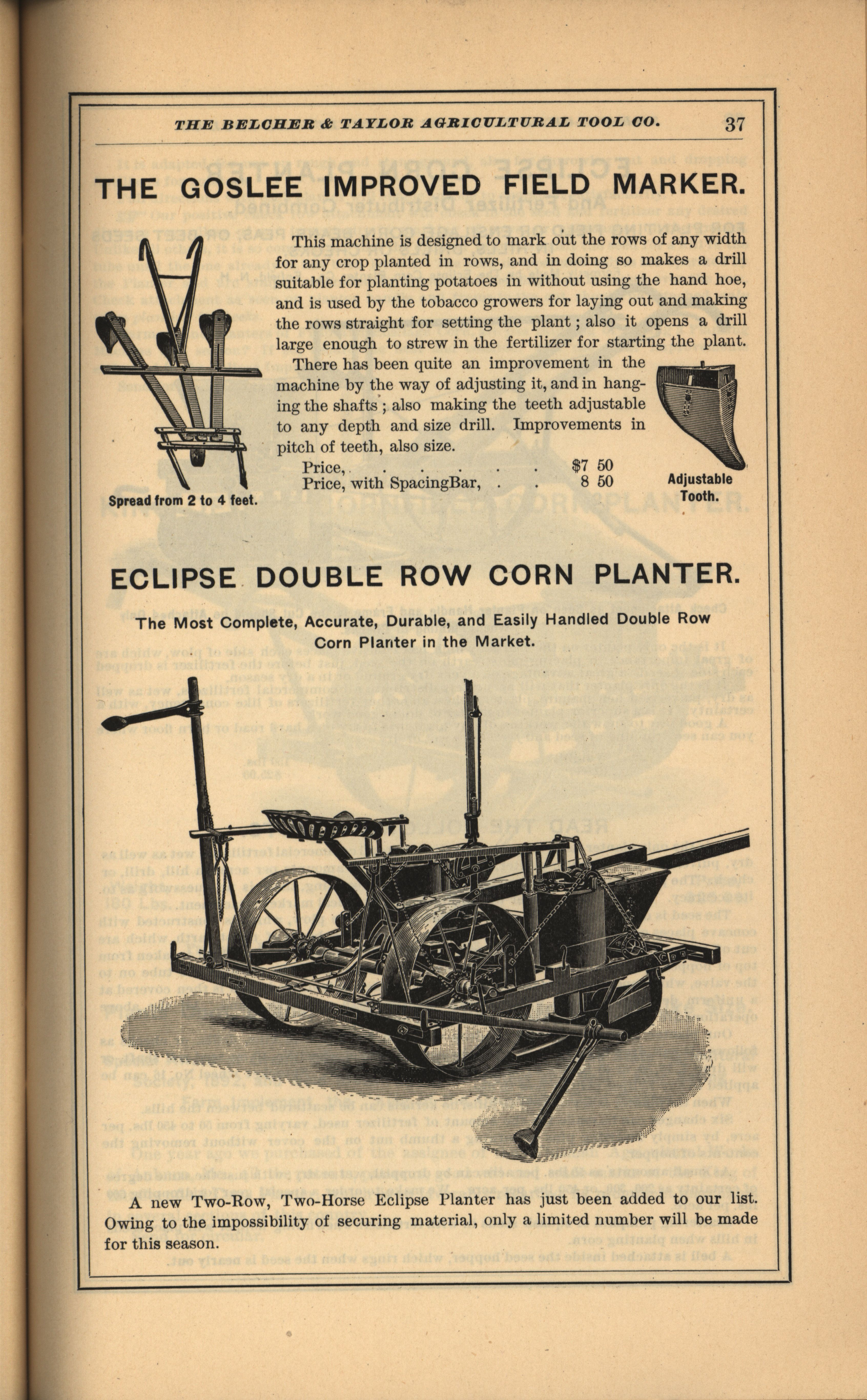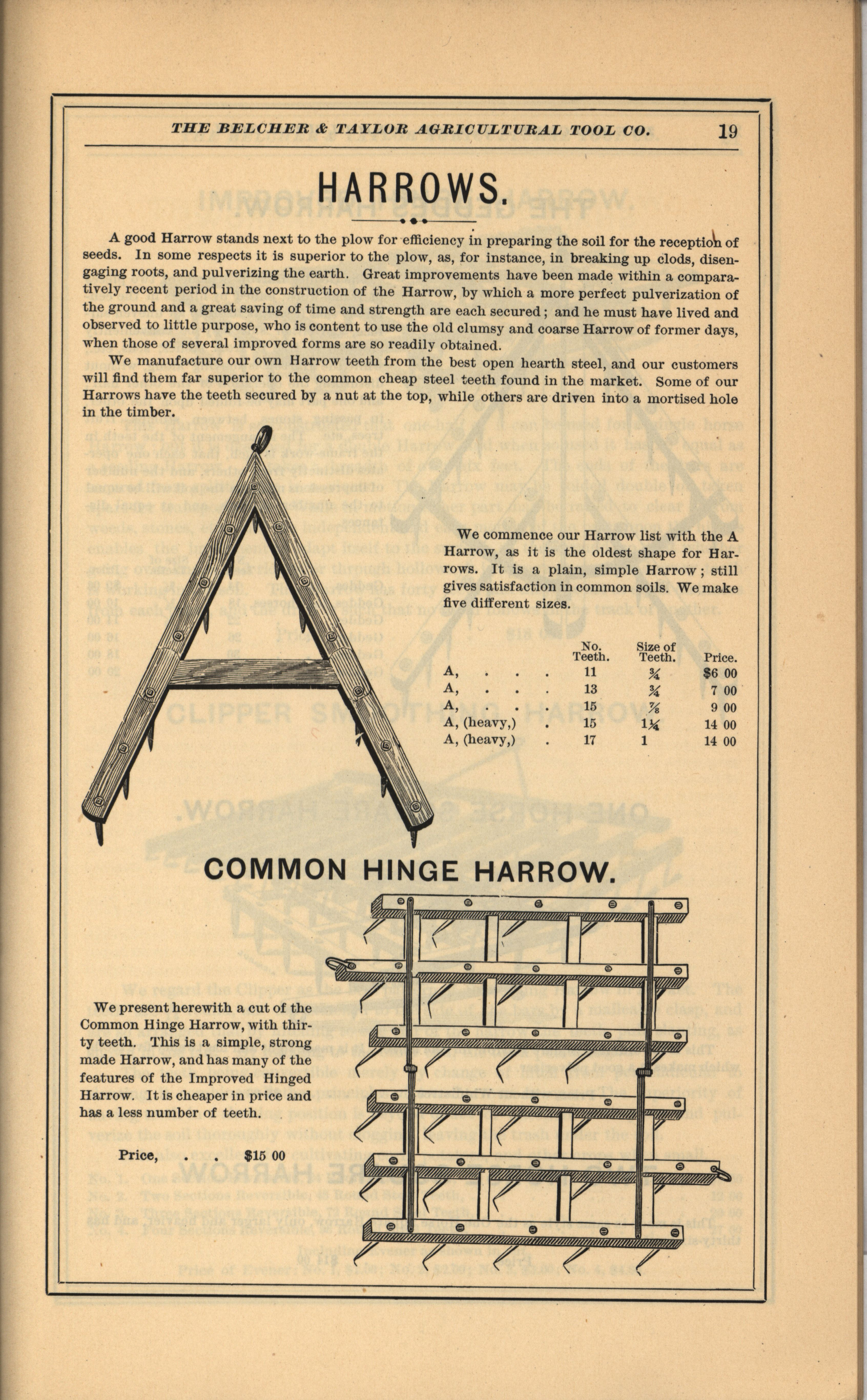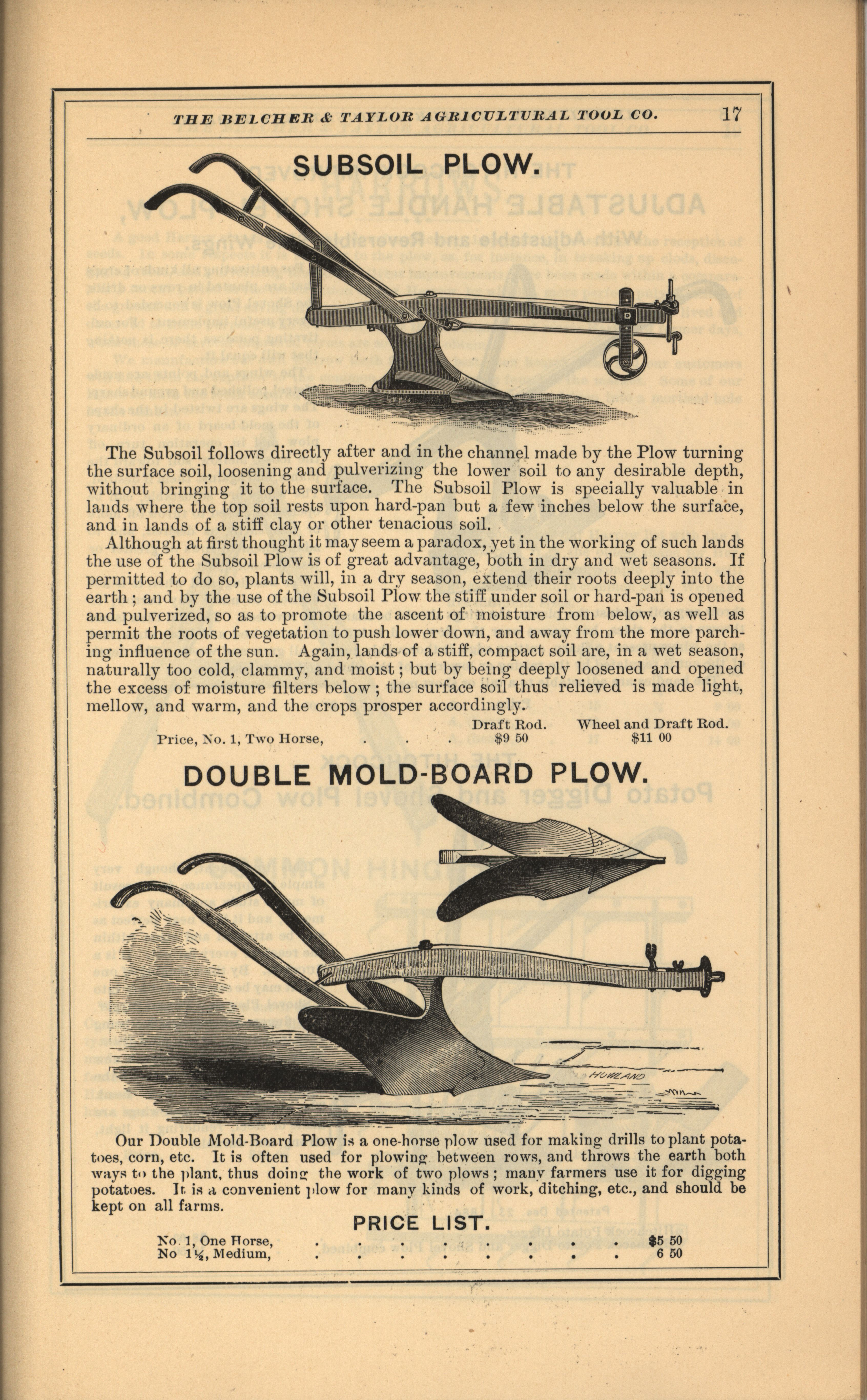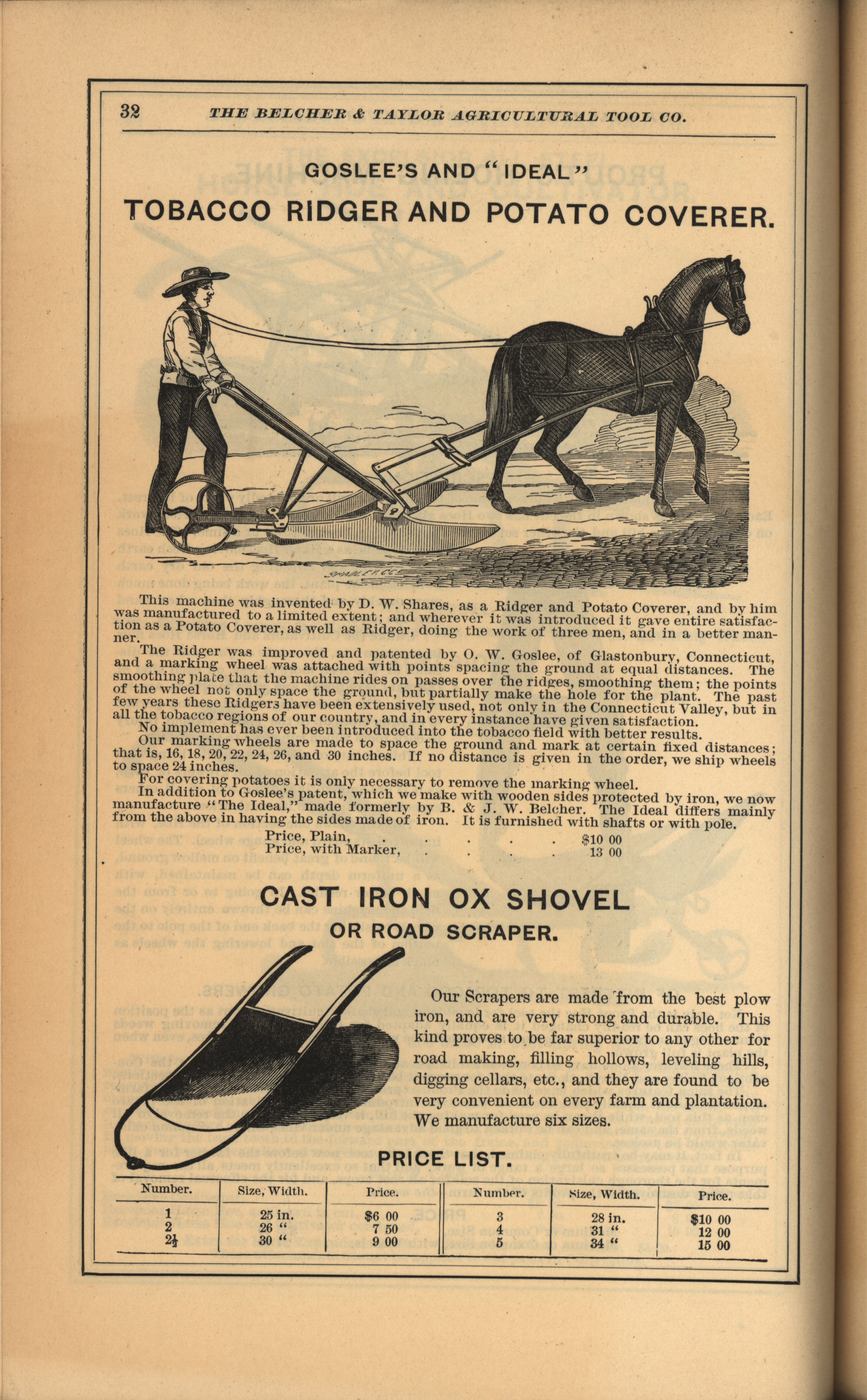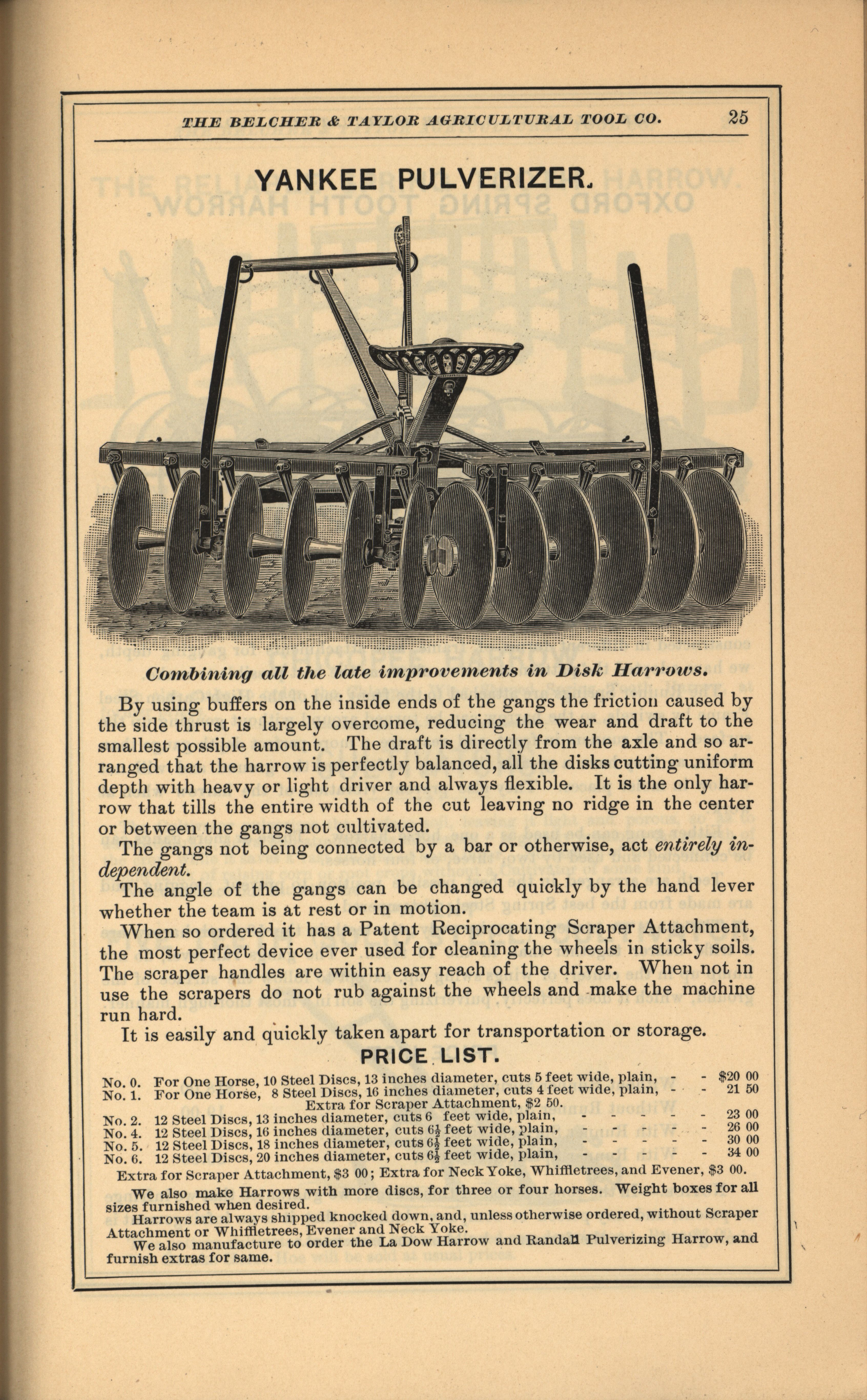 - Catalog describing agricultural products offered by the Belcher and Taylor Agricultural Tool Company, includes illustrations.